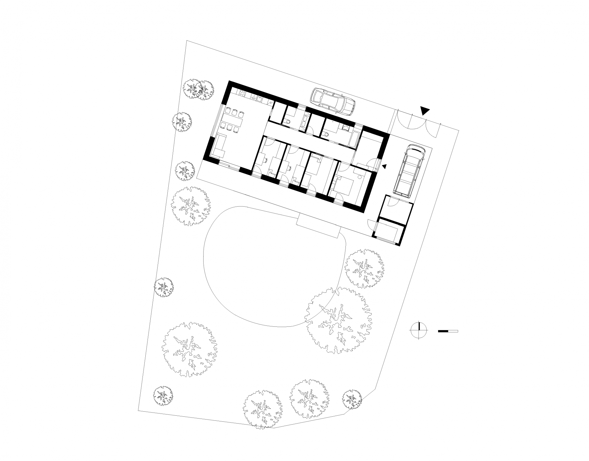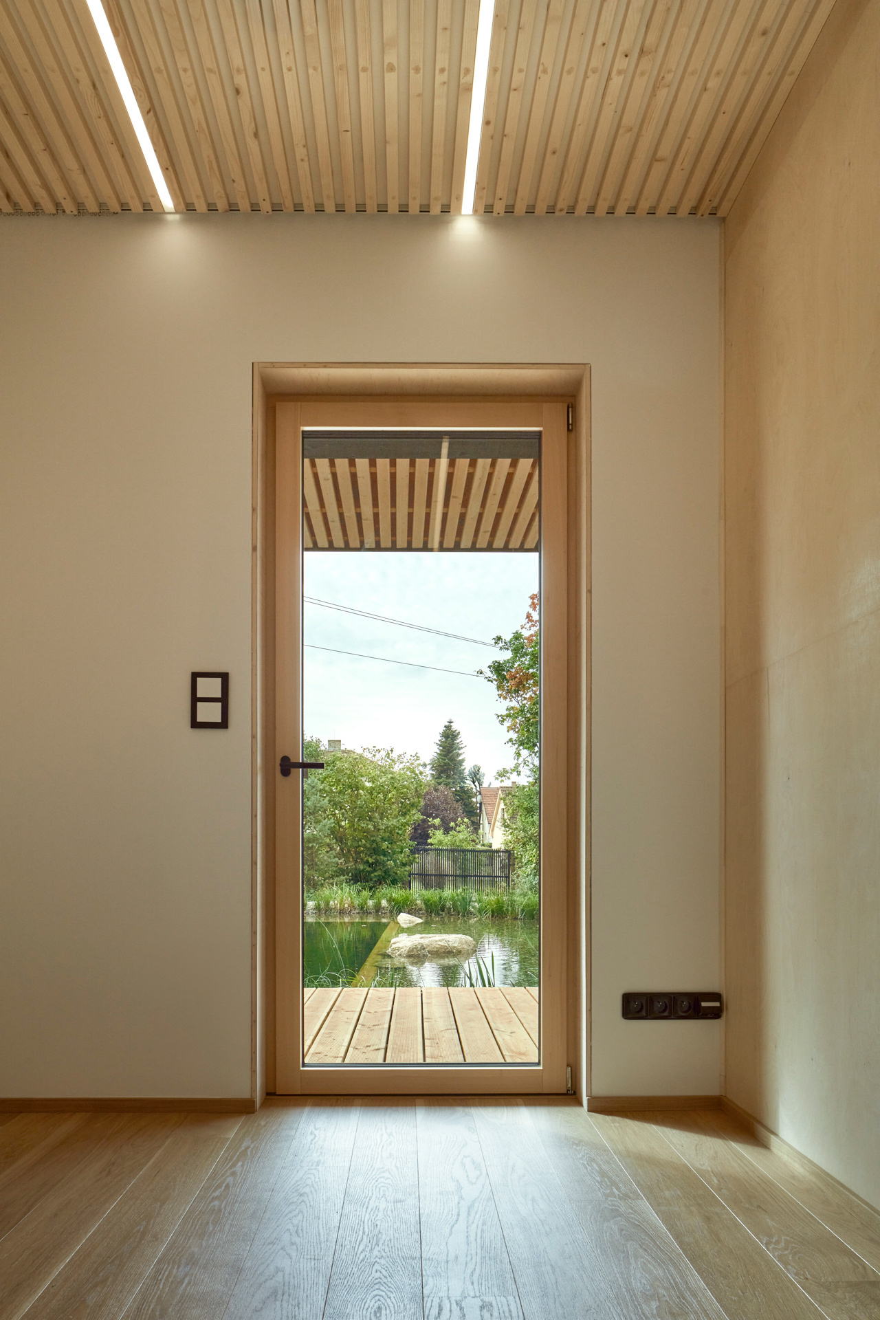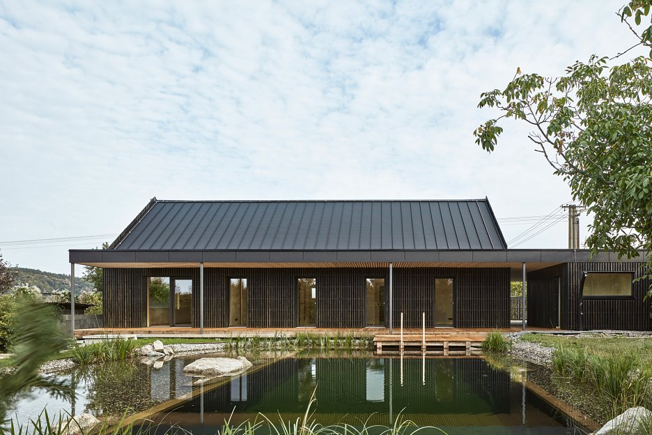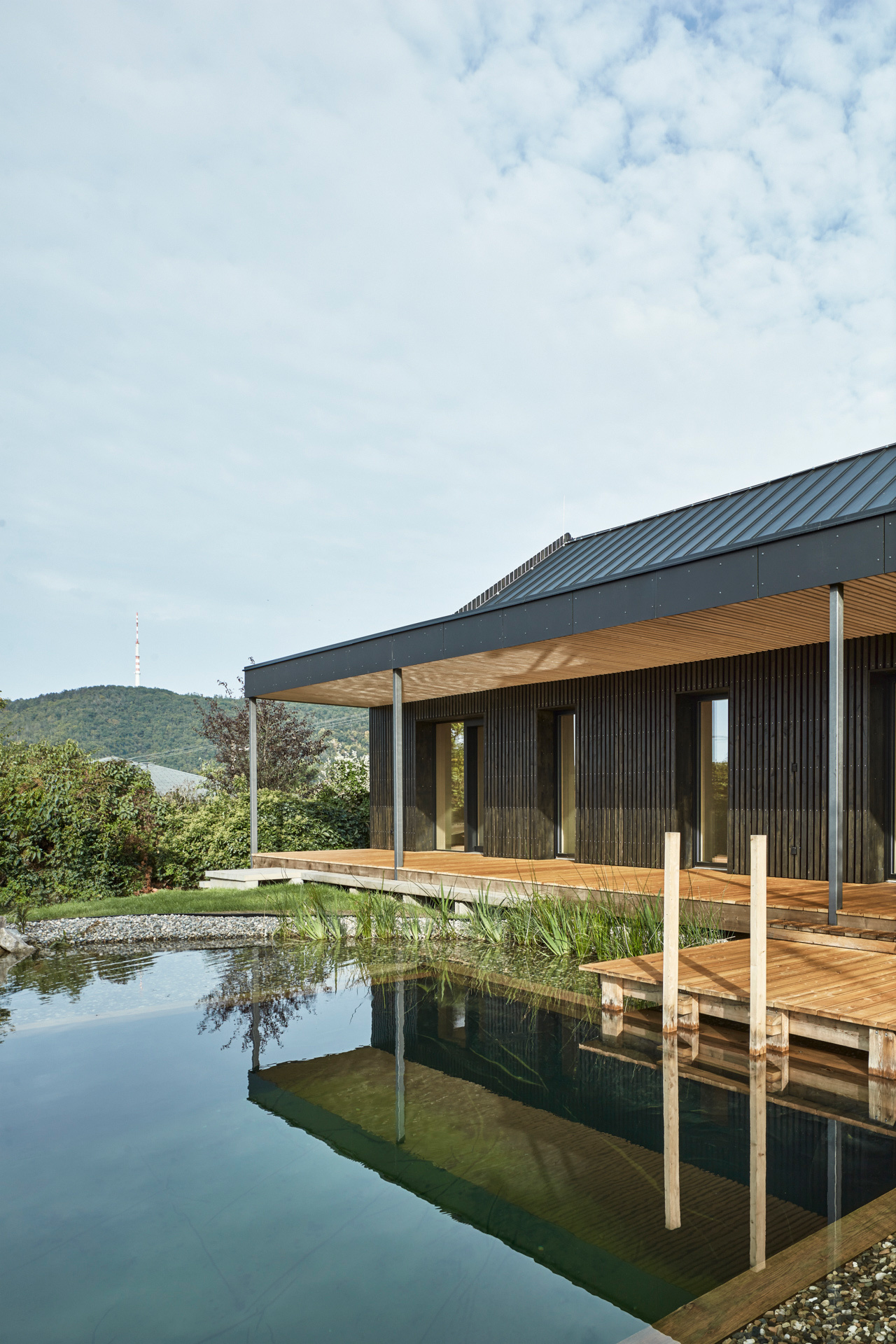 V roku 2020 oslovil investor pražský ateliér 0,5 Studio a firmu Chytrý dům s požiadavkou na návrh jednoduchého bezbariérového drevodomu s dispozíciou 5 + kk. Novostavba stojí na okraji zástavby v stredočeskej obci Vrané nad Vltavou. “Cílem návrhu bylo, aby dom zapadl do okolí, zároveň se od něj do určité míry distancoval a vytvořil na zahradě skrytou oázou, ve které se ukrývá přírodní koupací jezírko,” vysvetľujú autori.