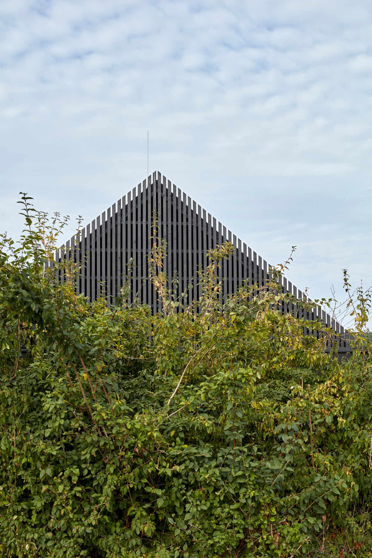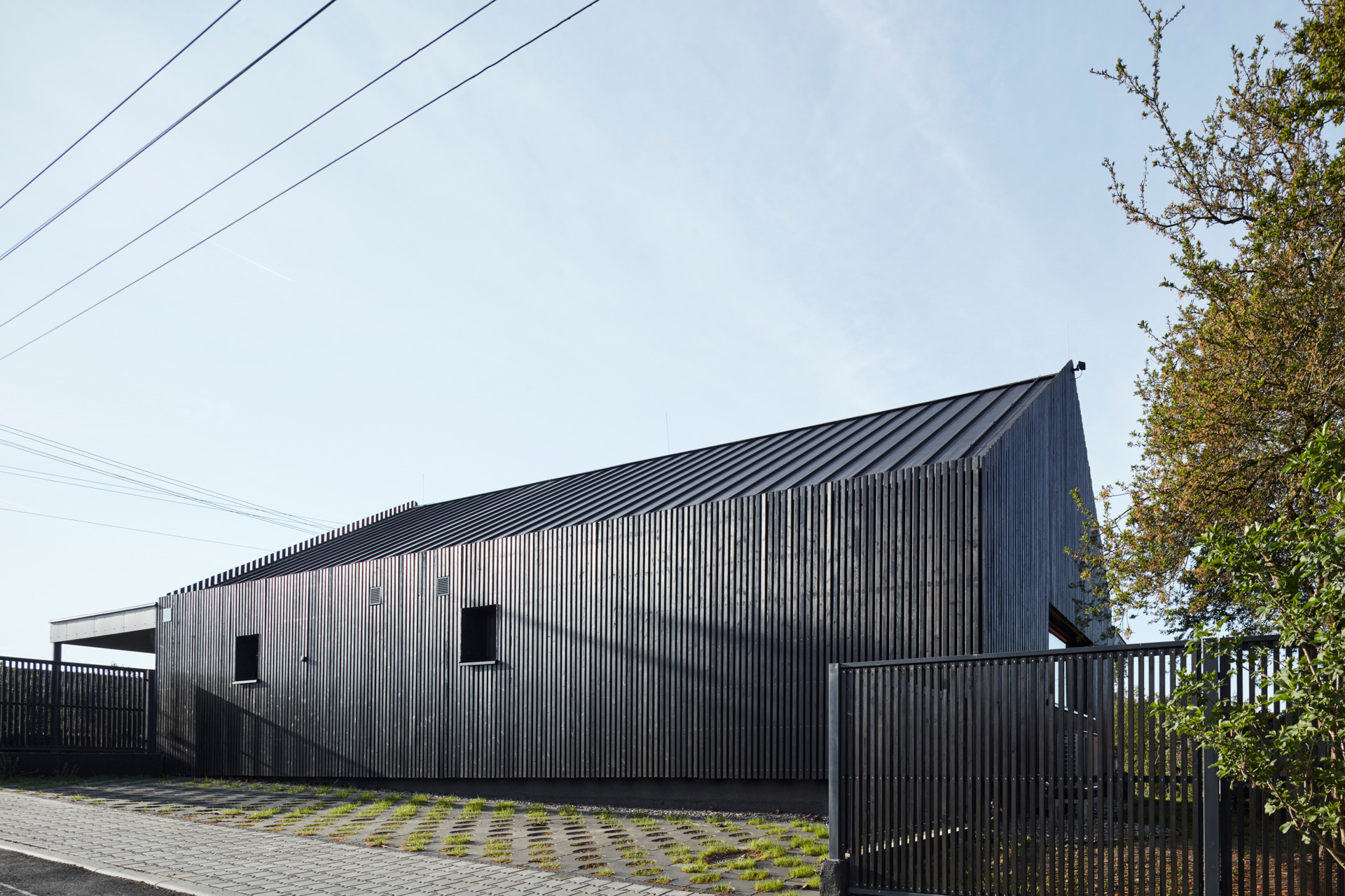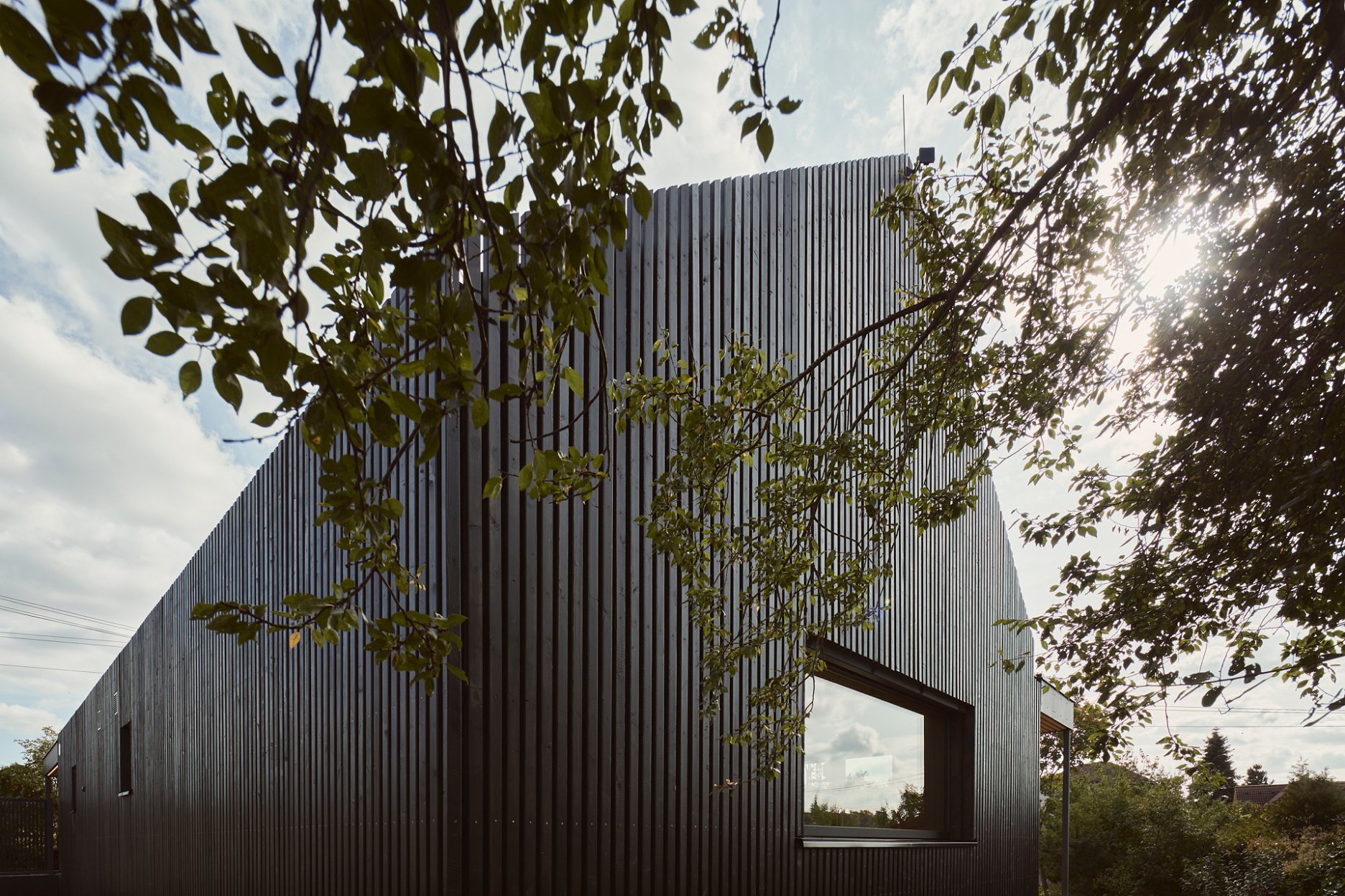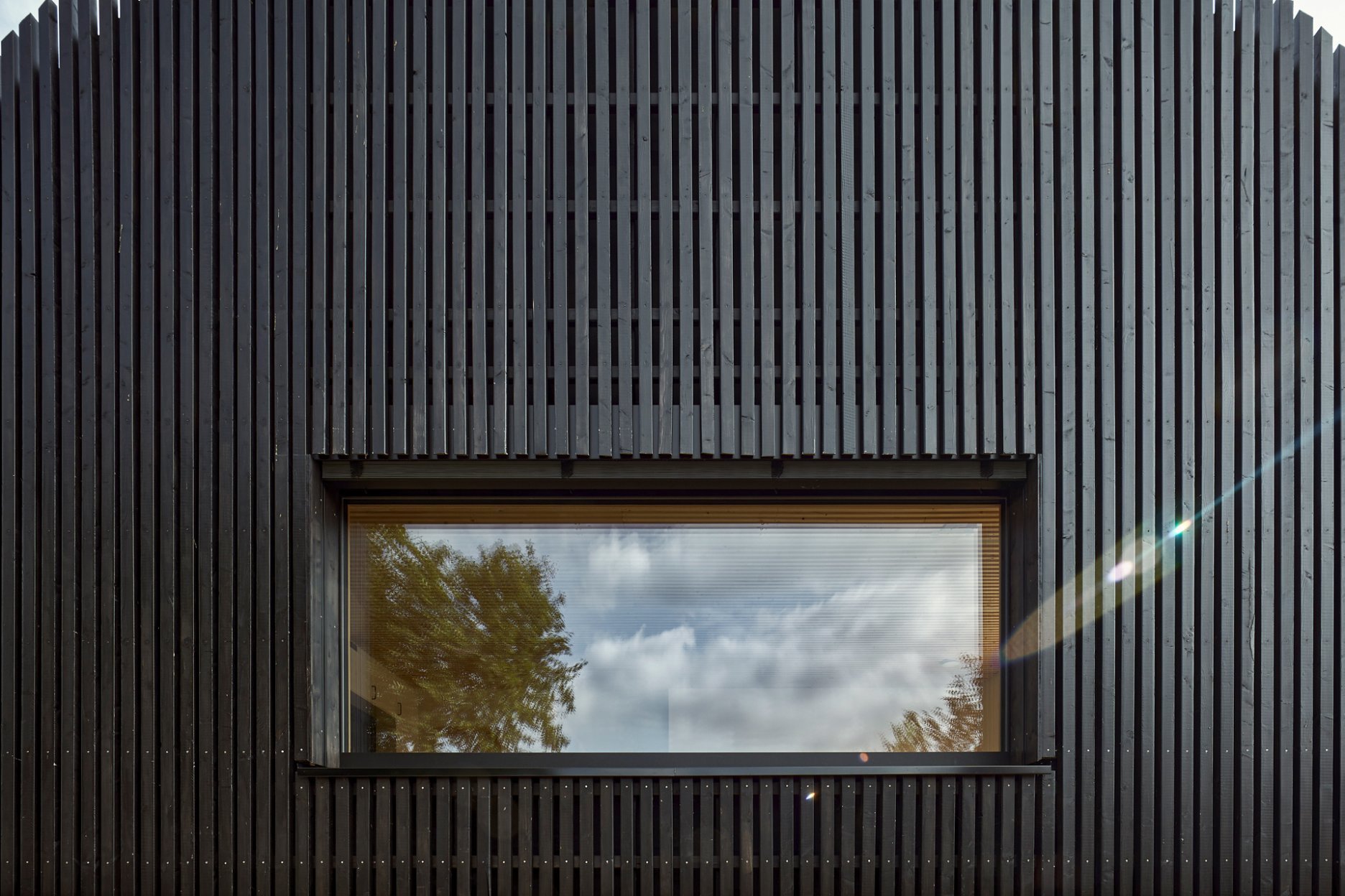 Fasádu rytmizuje predsadený obklad s tmavým náterom. Raster latovania vytvára spojnicu medzi exteriérom a kontrastným svetlým interiérom.