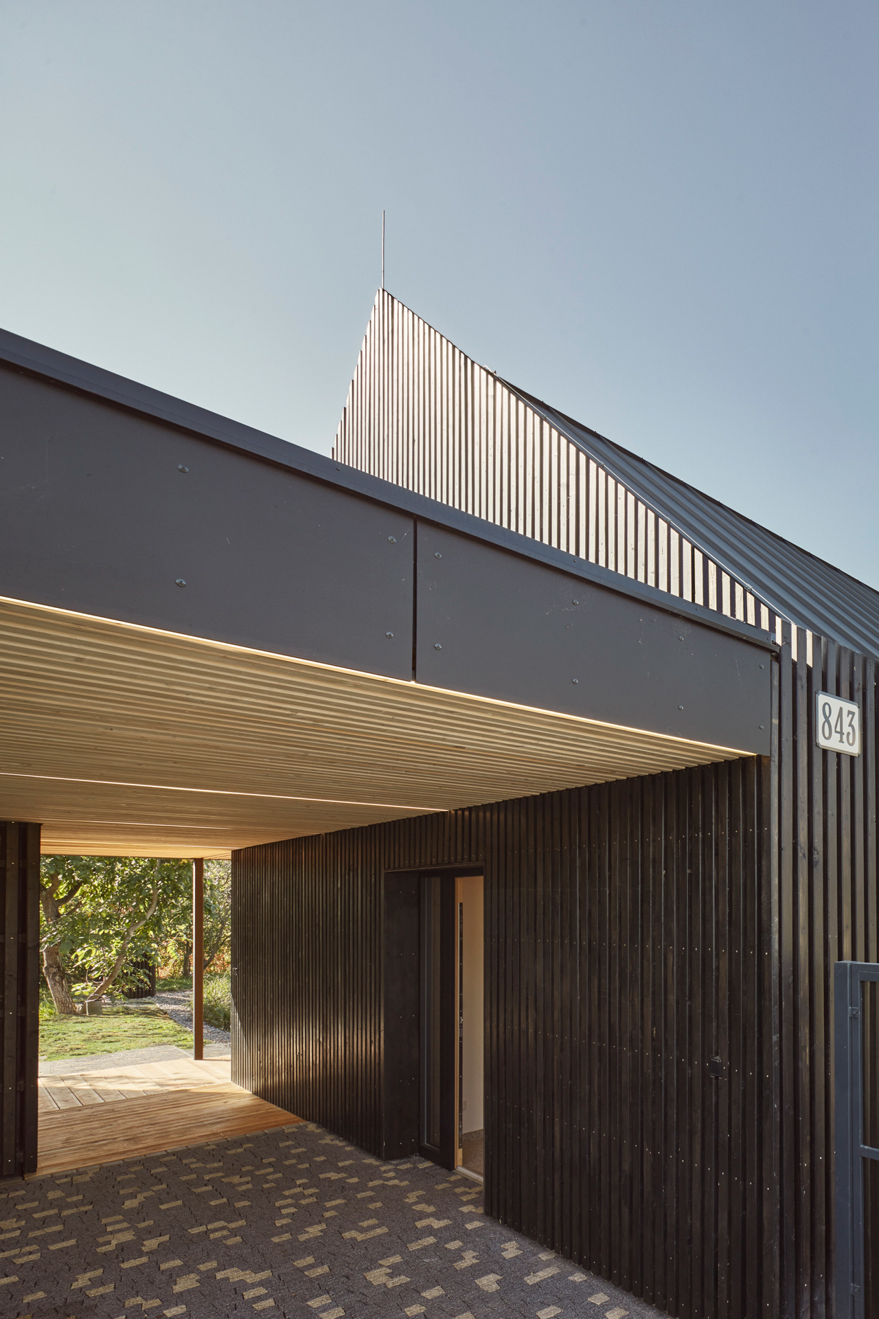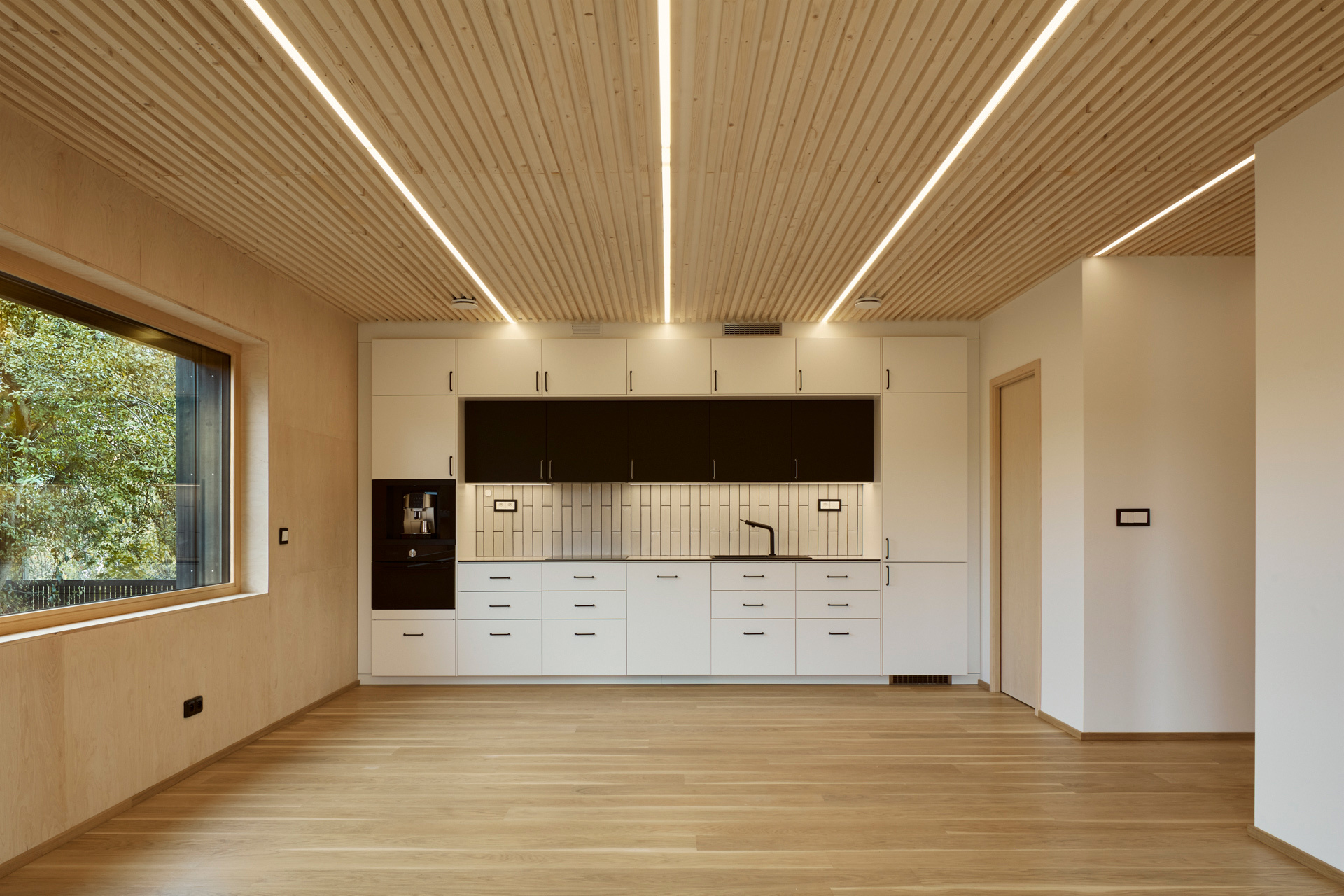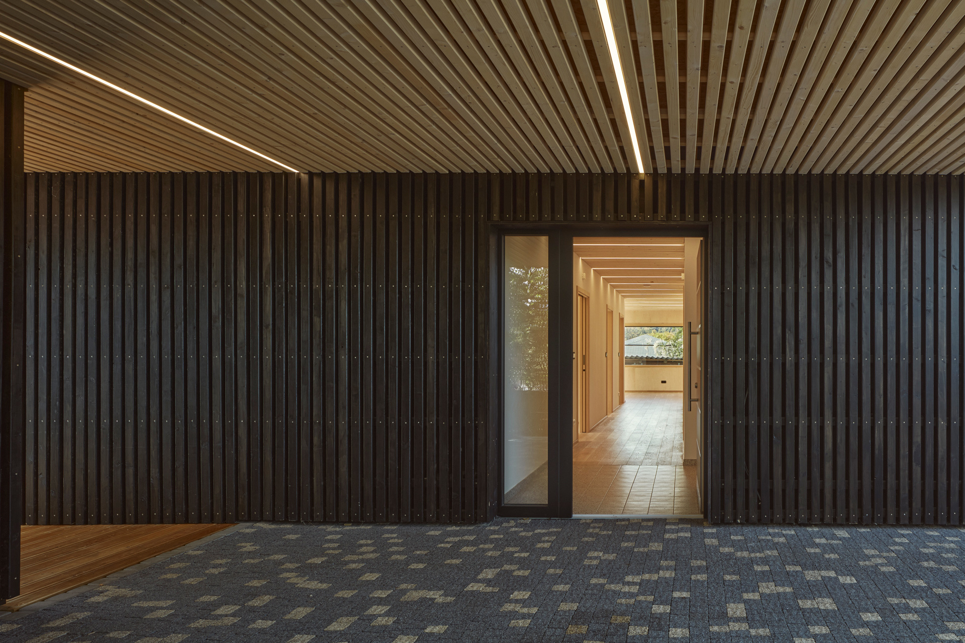 Fasádu rytmizuje predsadený obklad s tmavým náterom. Raster latovania vytvára spojnicu medzi exteriérom a kontrastným svetlým interiérom.