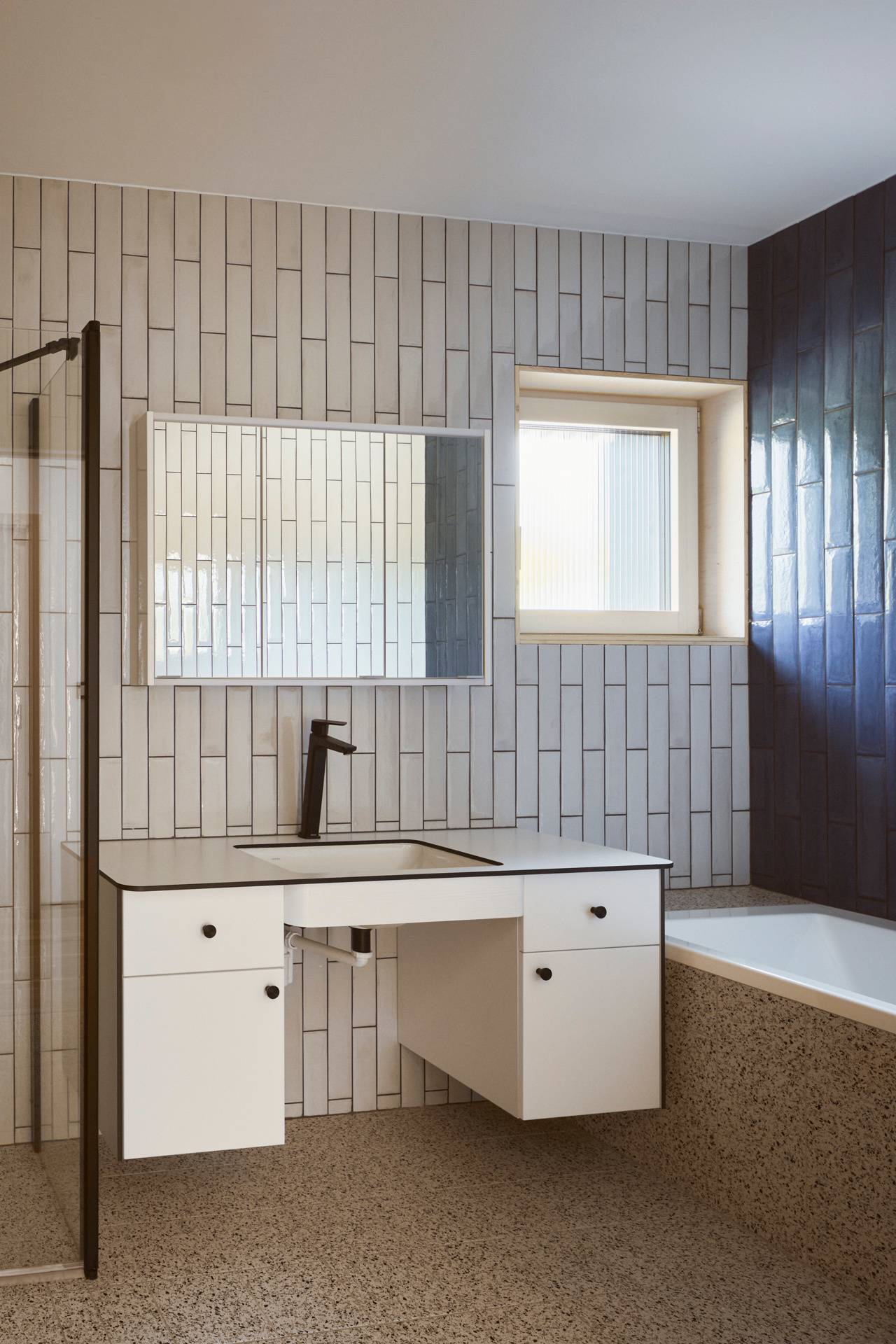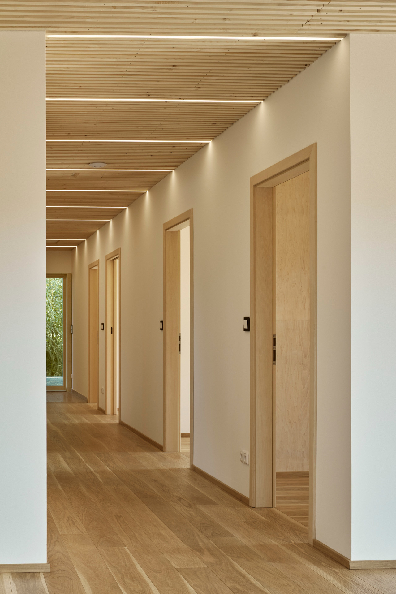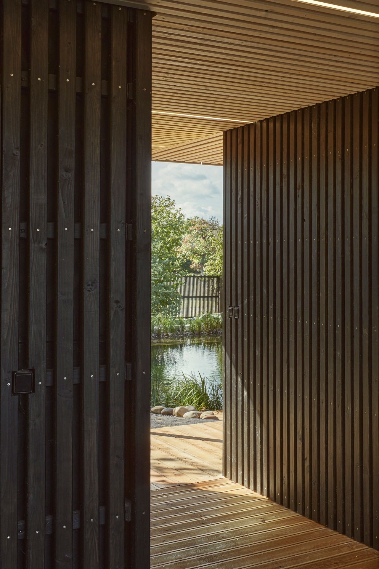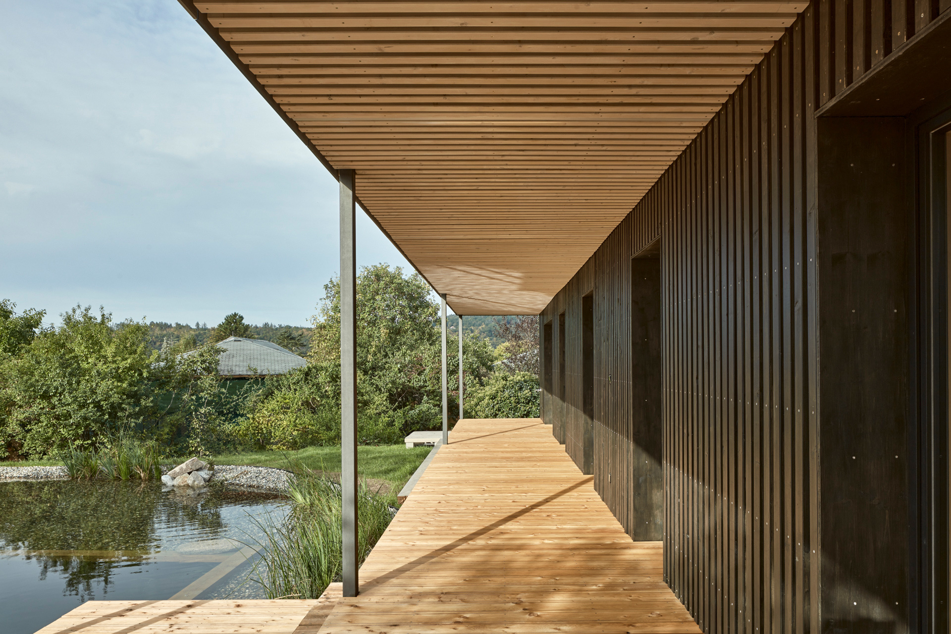 Fasádu rytmizuje predsadený obklad s tmavým náterom. Raster latovania vytvára spojnicu medzi exteriérom a kontrastným svetlým interiérom.