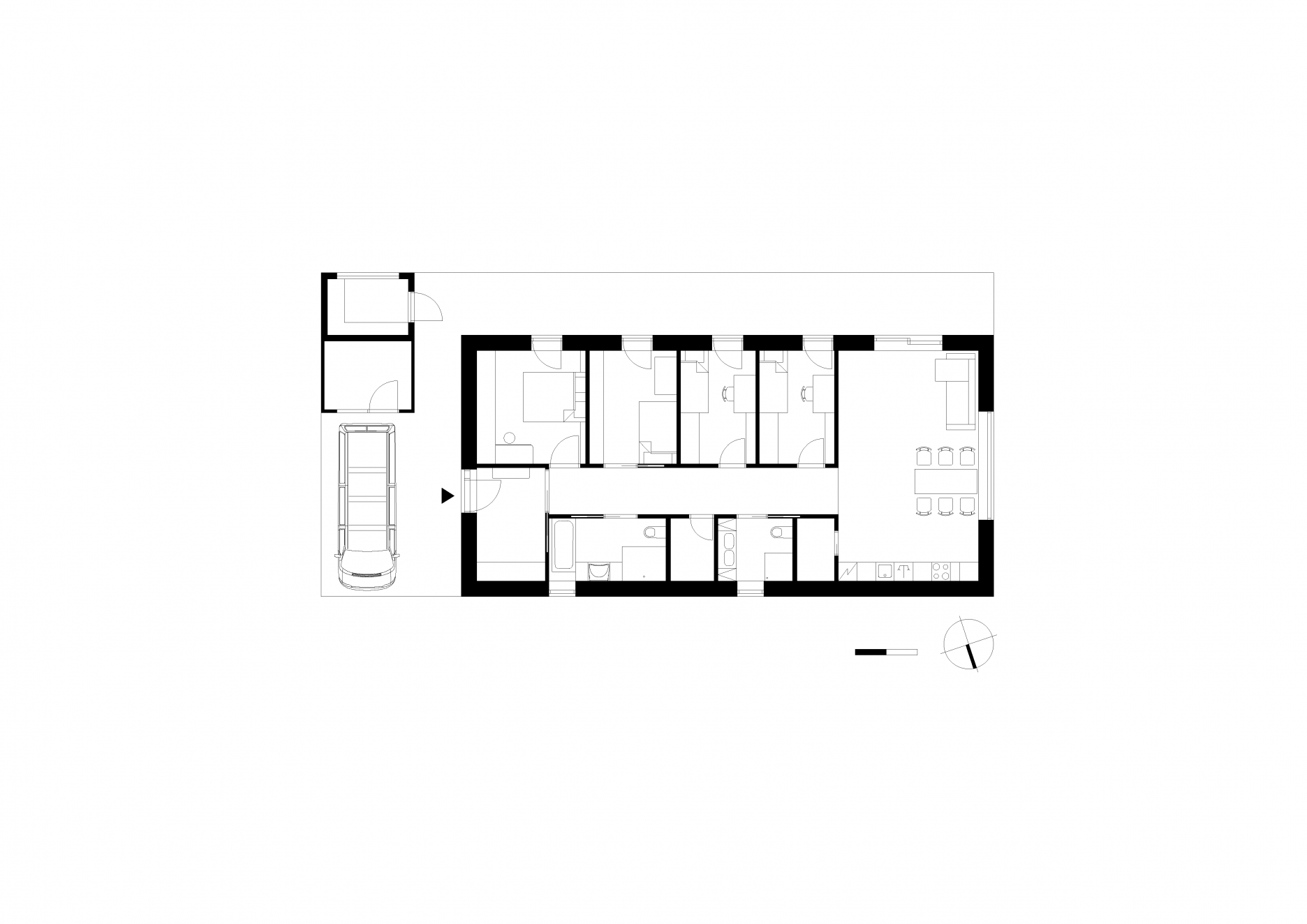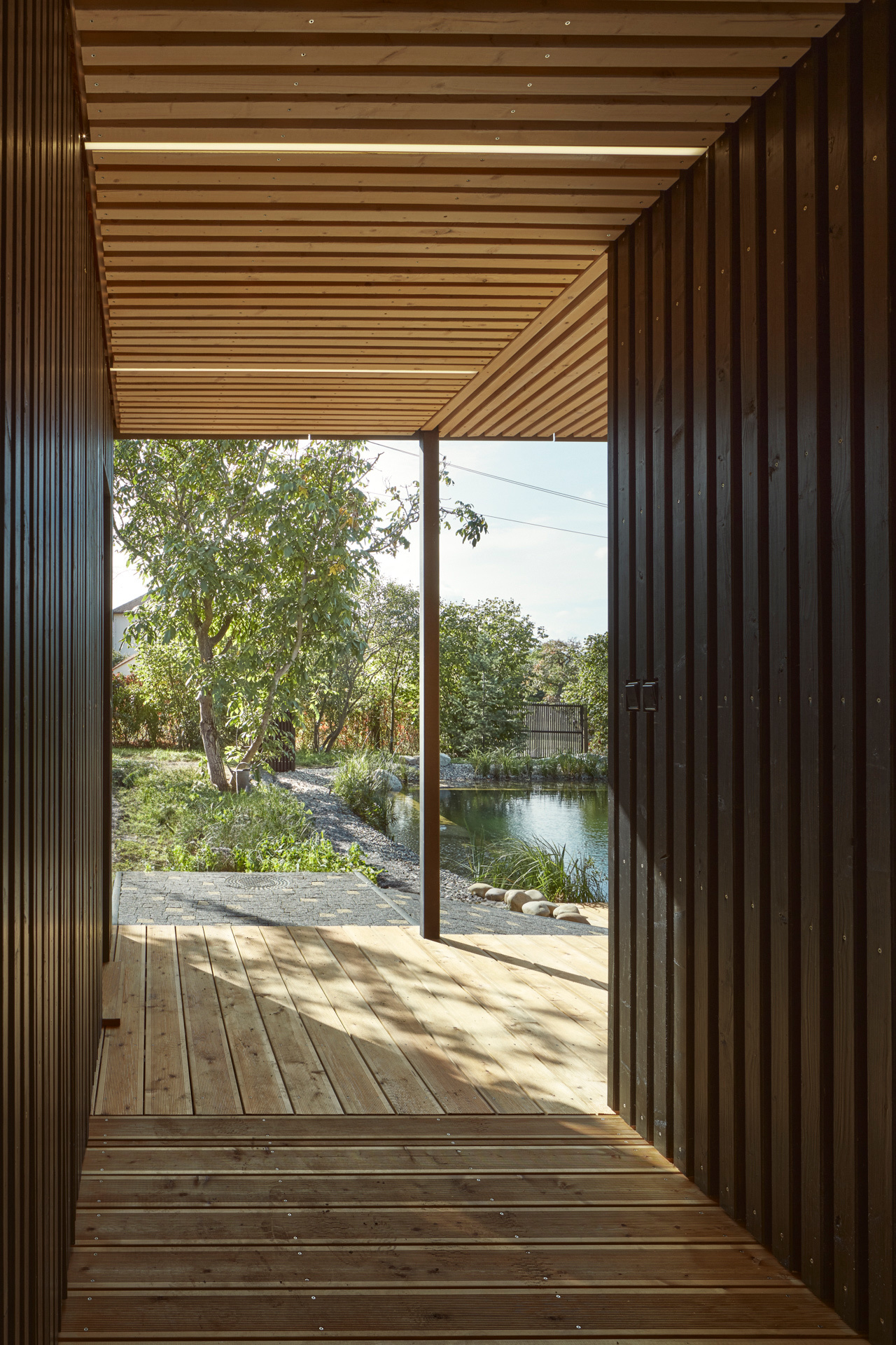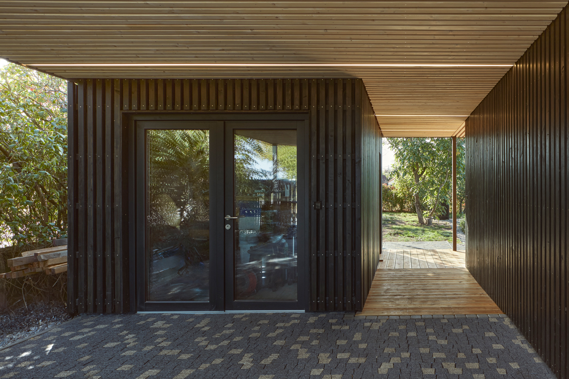 Líniu domu dopĺňa výrazná horizontála prístrešku. Na kryté parkovacie miesto a vstup nadväzuje sklad so saunou a predovšetkým ochodza, orientovaná do záhrady. Priestor v letných mesiacoch funguje ako prirodzené rozšírenie obytných miestností.