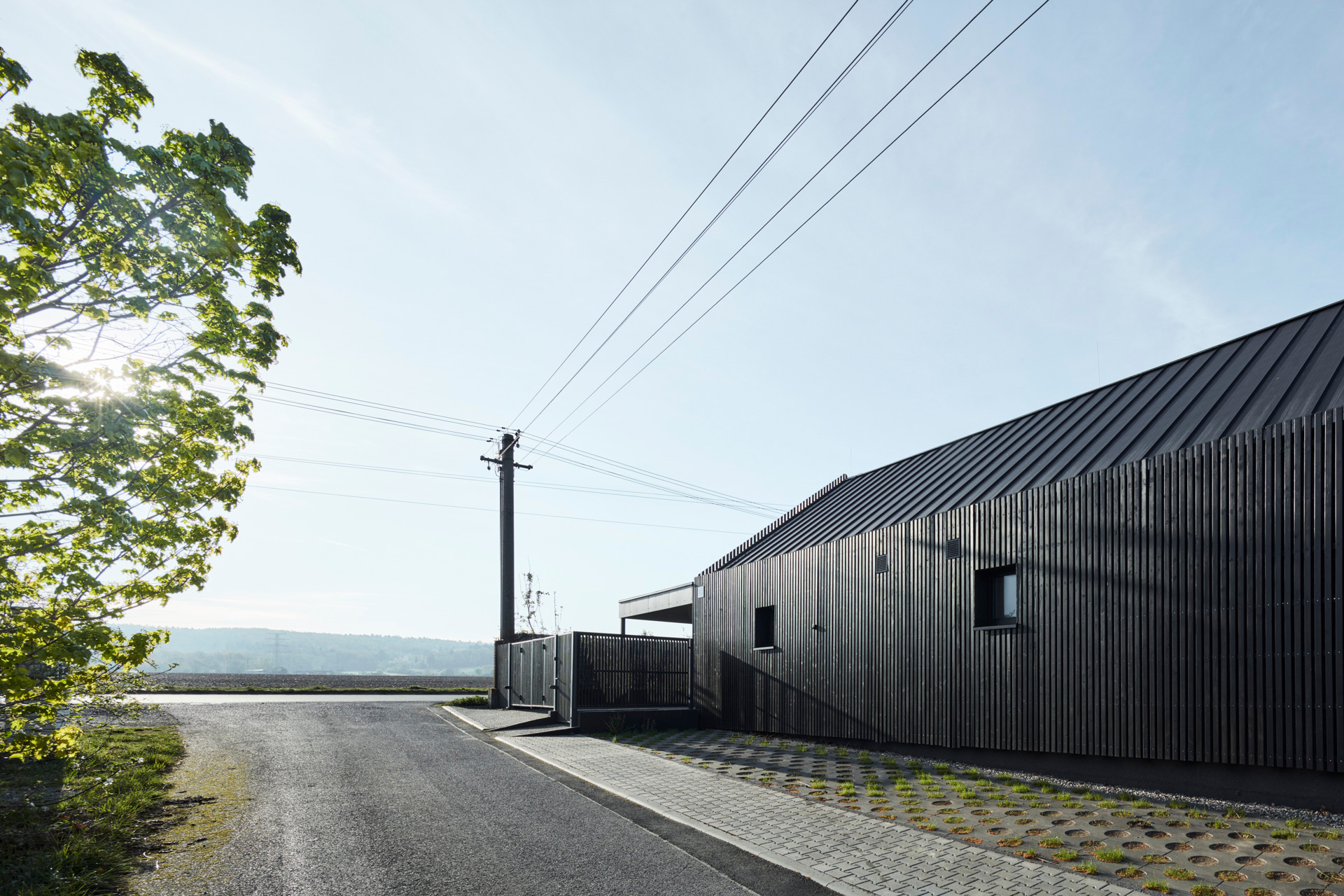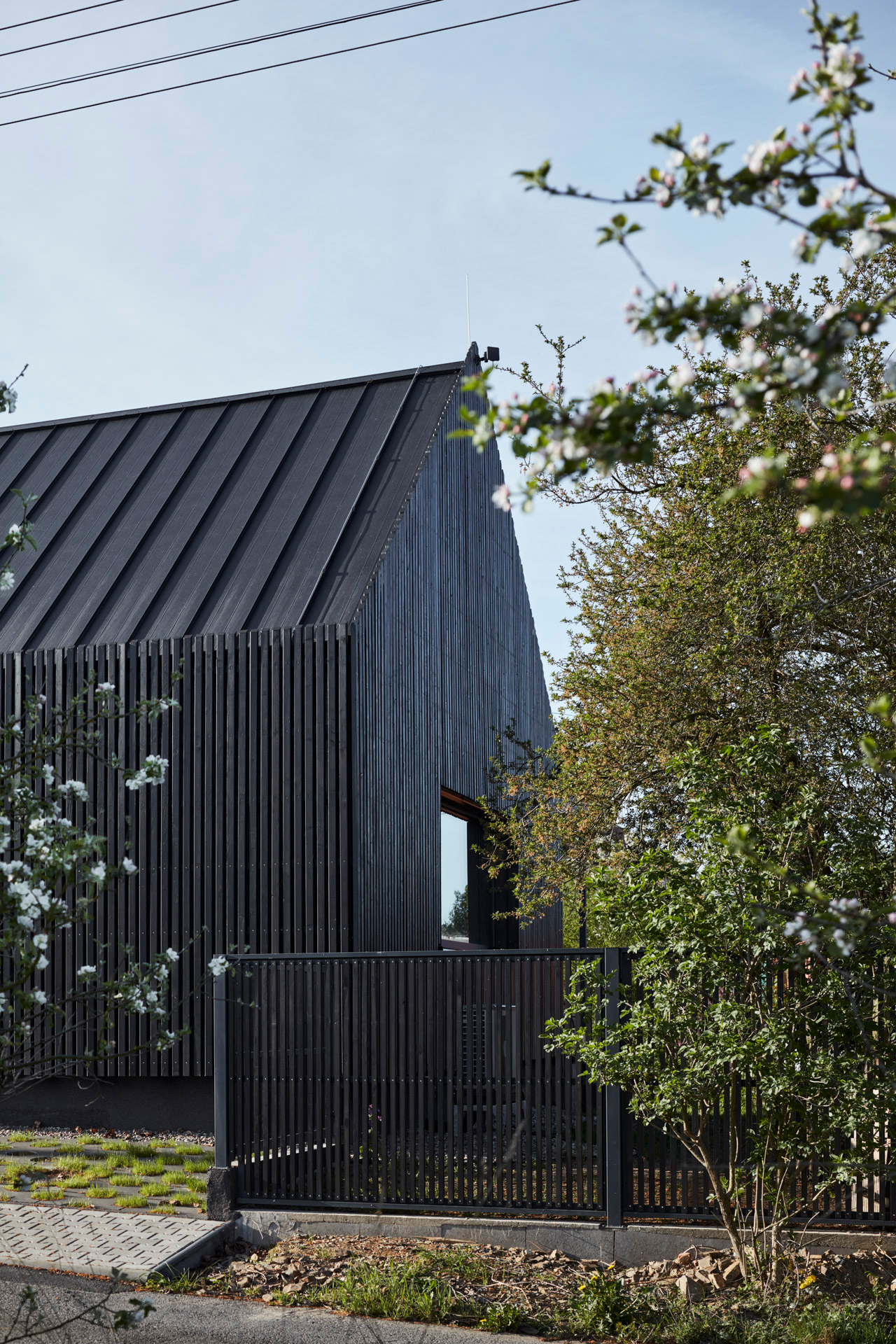 Pražskí architekti navrhli dom s klasickou sedlovou strechou. Kompaktnú hmotu sceľuje tmavý obklad fasády, ktorý prispieva k začleneniu objektu do prírodného prostredia. Dom ustupuje od uličnej čiary na šírku parkovania. Jeho fasáda tak priamo tvorí hranicu medzi ulicou a záhradou. Podobne, ako pôvodná zástavba v obci.