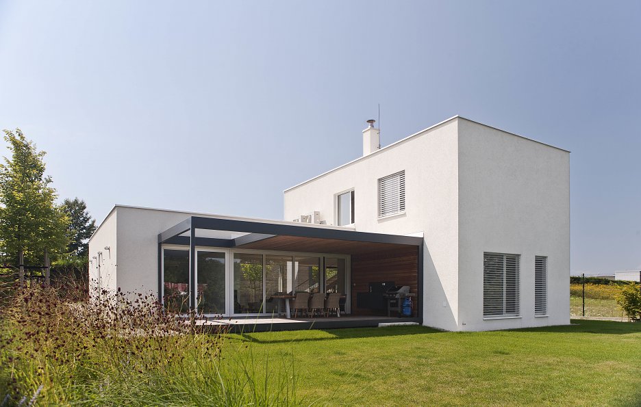 Tvar, členenie a orientácia objektu sú podriadené jednotlivým funkciám, ich vzťahom k pozemku, svetovým stranám a jednotlivým výhľadom. V juhozápadnej časti napojenej na komunikáciu sa nachádza prístrešok pre autá a garáž pre motocykle. Na prestrešenie je napojená pozdĺžna hmota, v ktorej sa nachádzajú vstupné priestory, technické zázemie a športovo-relaxačná časť. Na tieto priestory nadväzuje denná časť domu, ktorá je priečne presvetlená. Z juhozápadnej strany je priestor preslnený a zo severovýchodnej strany je orientovaný výhľad na terasu, pozemok a okolitú krajinu. Na prízemí sa nachádza aj nočná časť rodičov orientovaná do záhrady. Na poschodí sú detské izby so zázemím. Ich juhovýchodná orientácia a presklenie zabezpečuje dostatok prirodzeného svetla. Orientácia súčasne eliminuje nepriaznivé tepelné zisky v letných mesiacoch. Pracujeme s minimálnymi výrazovými prostriedkami. Dominuje biela fasáda, doplnená o drevené prvky vedľajších funkčných celkov.