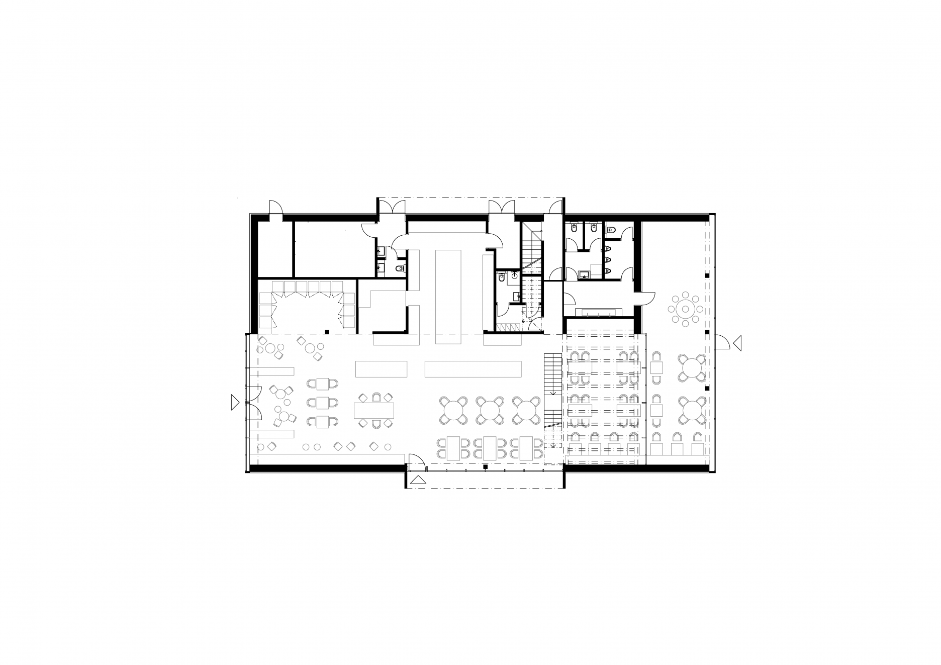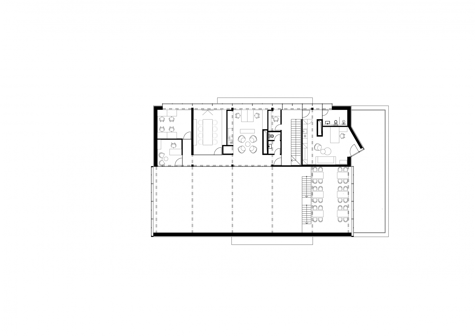 Protiľahlý ortogonálny blok zastrešuje otvorené priestory reštaurácie na prevýšenom prízemí a administratívu, ktorá zaberá časť poschodia. Živý svet gastra otvára do okolia rozsiahle presklenie na úrovni partra. Konštrukčná podstata je aj v tomto prípade rovnaká. Novú vrstvu v podobe zariadenia interiéru však do návrhu cakov + partners vniesol ateliér winwin architects. Nosný prvok riešenia tvorí otvorená kuchyňa, ktorá je dôležitou vizuálnou súčasťou gastrozážitku.