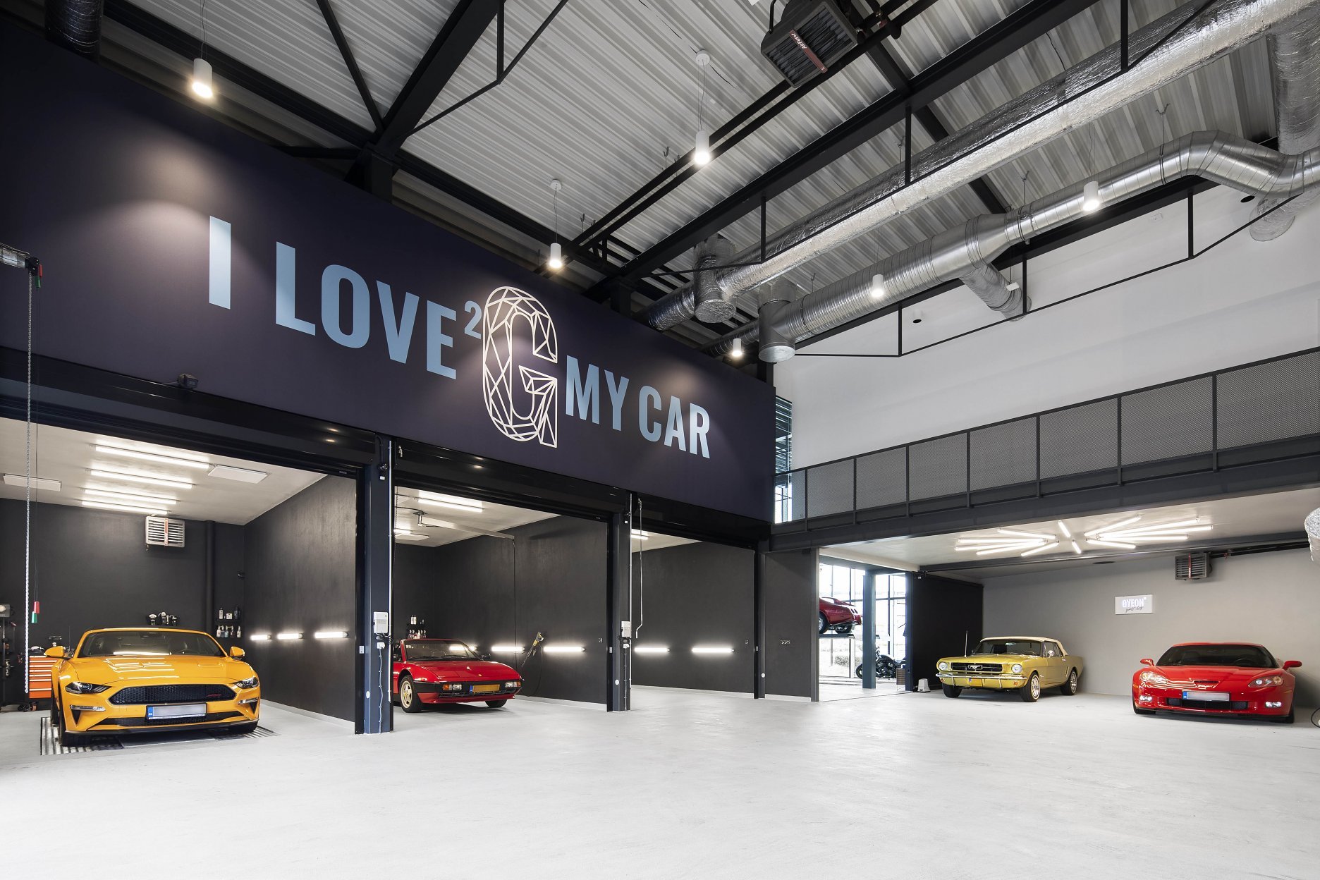 O tom, že “autá” a gastronómia sú vášňou investorov nie je pochýb. Časť určená na detailing automobilov neskrýva svoj technický charakter “prerastenej garáže”. Architekti priznávajú odhalenú oceľovú konštrukciu, technológiu zdvihákov a pracovných boxov. Všetko bez pozlátka. Najdôležitejšími objektmi sú štvorkoleskové a dvojkolesové stroje. Okrem tých, na ktorých sa práve pracuje, tu nájdeme zaujímavé kúsky z automobilovej histórie. Sny si treba predsa plniť… Do otvoreného priestoru garáže nazerá z poschodia kancelária, slúžiaca ako zázemie pre zákazníkov.