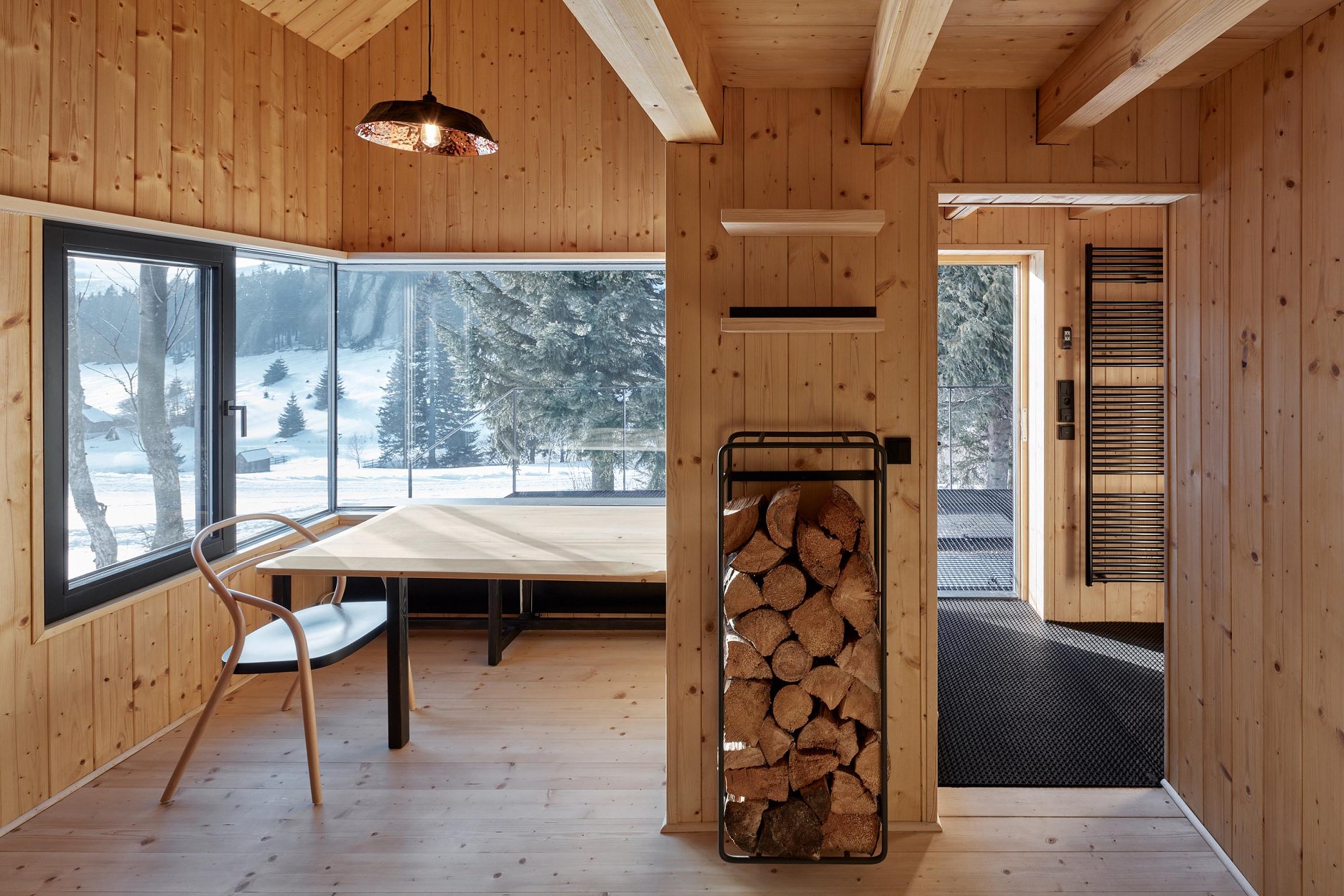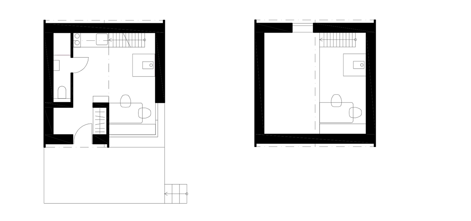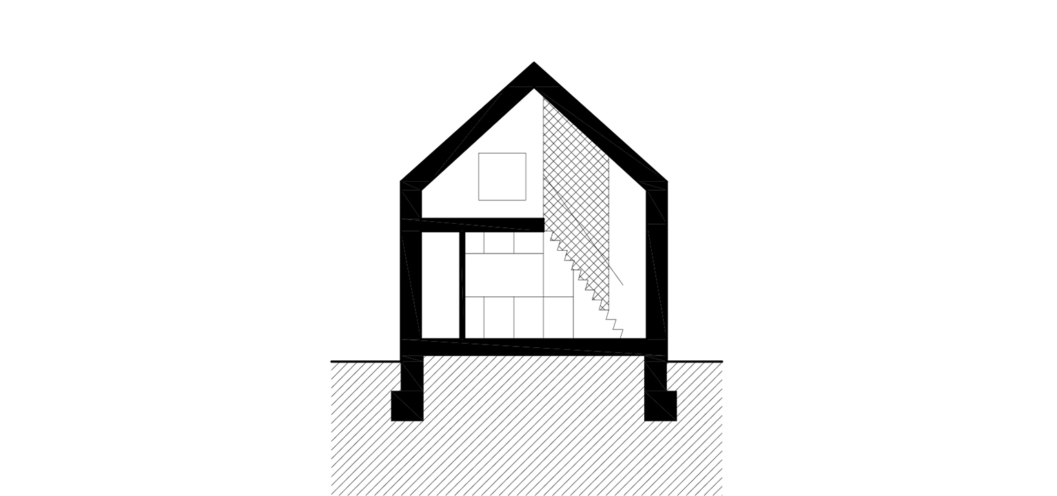 K drevostavbe s rozmermi približne 5,3 x 5,6 m patrí rozsiahla oceľová terasa 5,3 x 2,5 m. Dispozične je domček rozdelený na vstupné zádverie, obytnú miestnosť s kuchynským kútom a kúpeľňu s WC. V rámci obytnej miestnosti je nad zádverím a kúpeľňou navrhnutý priestor na spanie, ktorý je prístupný cez schodisko z obývačky. Hlavný obytný priestor je otvorený až po hrebeň krovu. Priestor na spanie je oddelený ochrannou sieťou.
