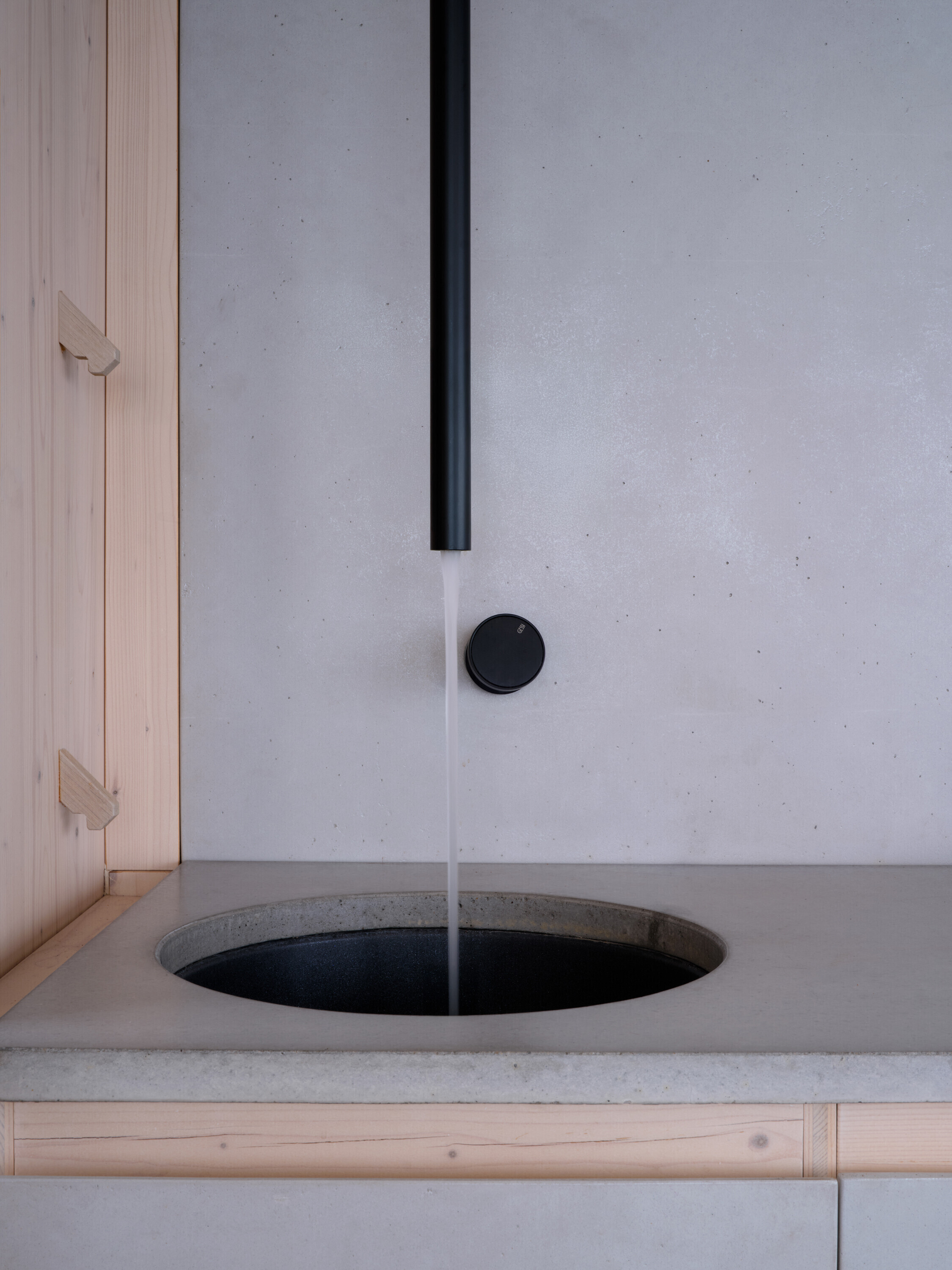 Za chrbtom hlavného pobytového priestoru je situovaná kompaktná kuchynská linka a za ňou kúpeľňa so sprchou. Betónové umývadlo, osadené priamo v okne, smeruje pohľad do lesa.
