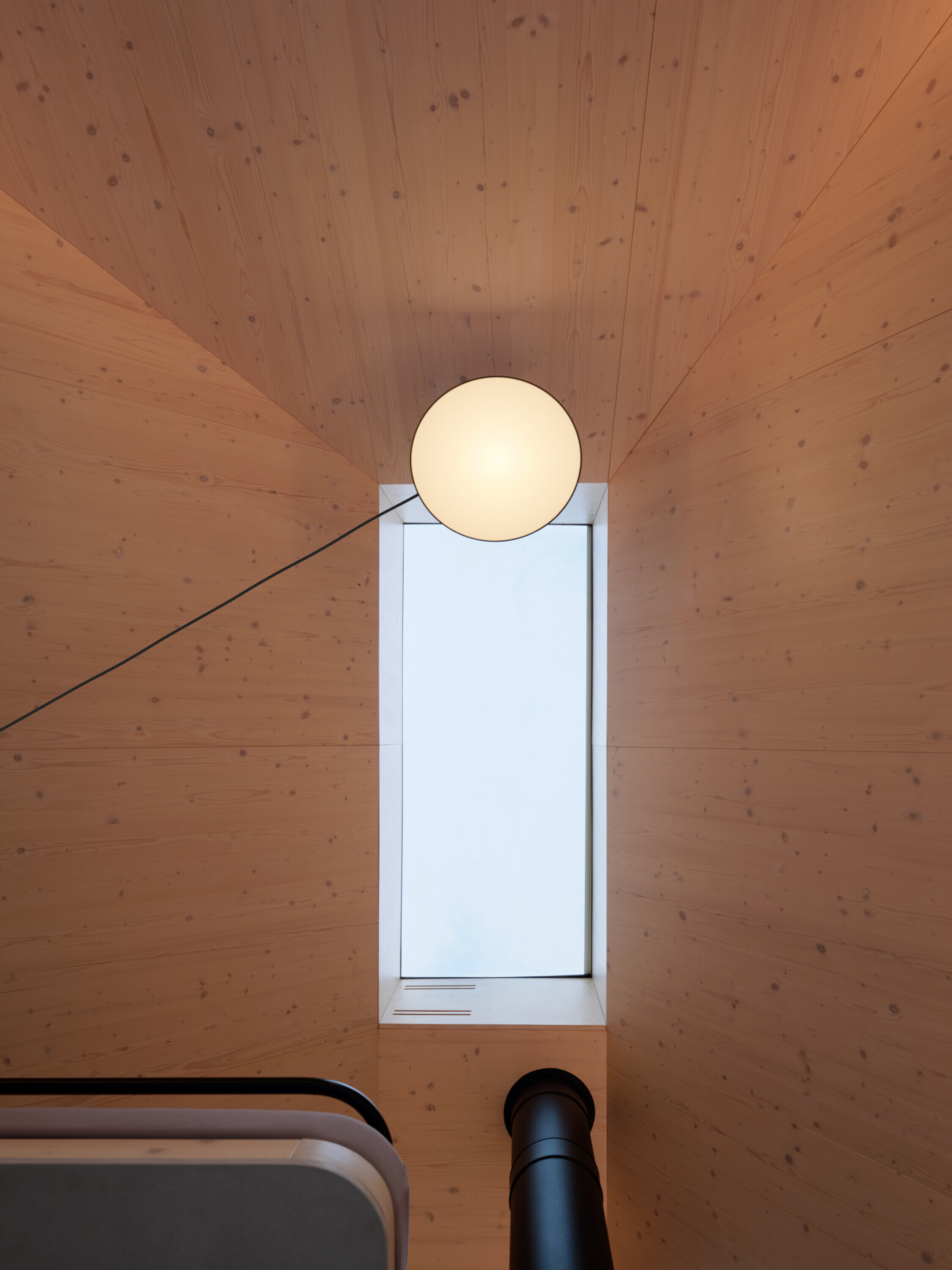 Večer nastáva transformácia. V interiéri visí lampa, ktorej kábel siaha až z podkrovia. Po potiahnutí sa lampa začne dvíhať a odhalí priestor na spanie, ktorý počas dňa ostáva skrytý. Absencia pevného schodiska umožňuje, aby podkrovie nebolo vizuálne prítomné. Schodisko je zasunuté v skrini a pôsobí ako regál, objaví sa až v prípade potreby. Strešná rovina uzatvára podkrovie do intímneho priestoru. Nad hlavou ostáva len stropný svetlík, určený na pozorovanie hviezd.