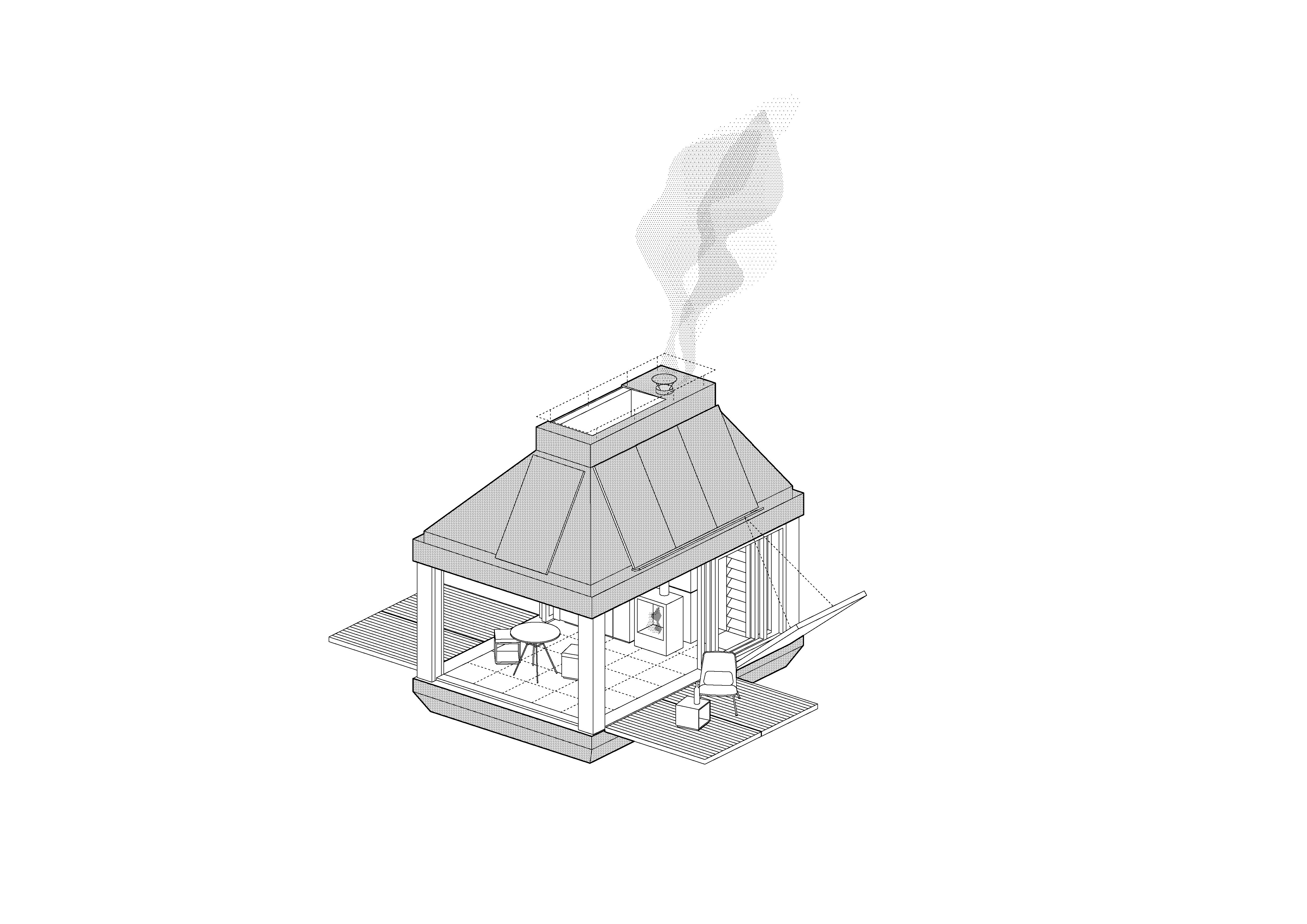 Dve strany domčeka je možné otvoriť prostredníctvom sklopných terás, ktoré po vyklopení odhalia posuvné sklenené steny. Predsadené tienenie rovnako skrýva celoplošné zasklenie čelnej steny. Interiér v otvorenom stave rozširujú spomínané terasy na oboch stranách a úžitková plocha sa opticky aj funkčne násobí.