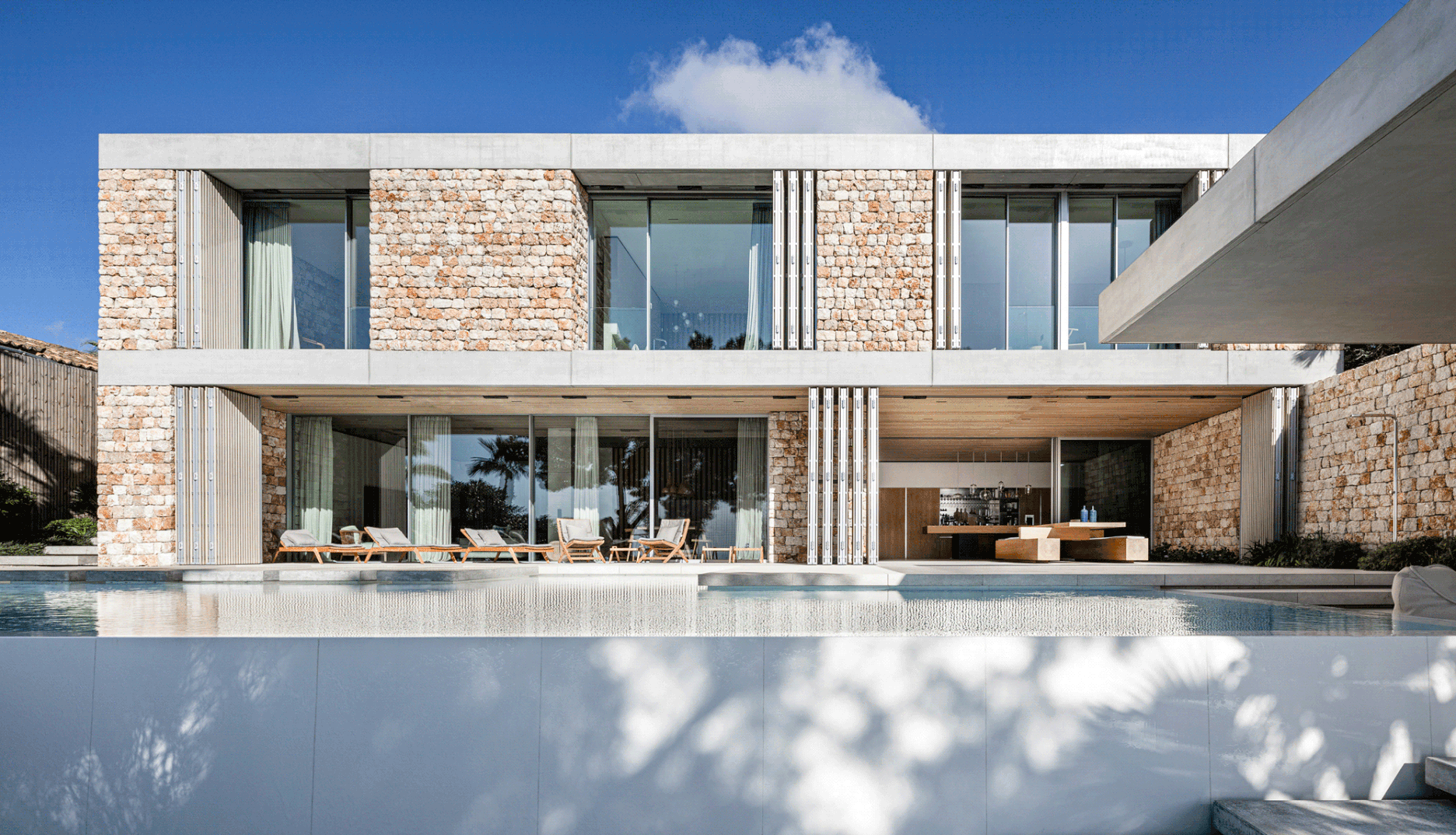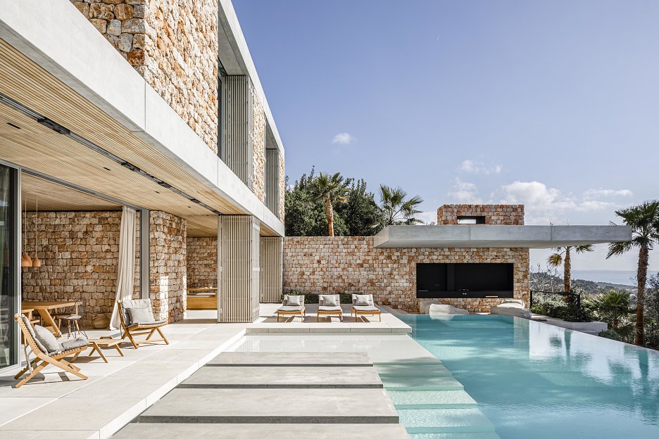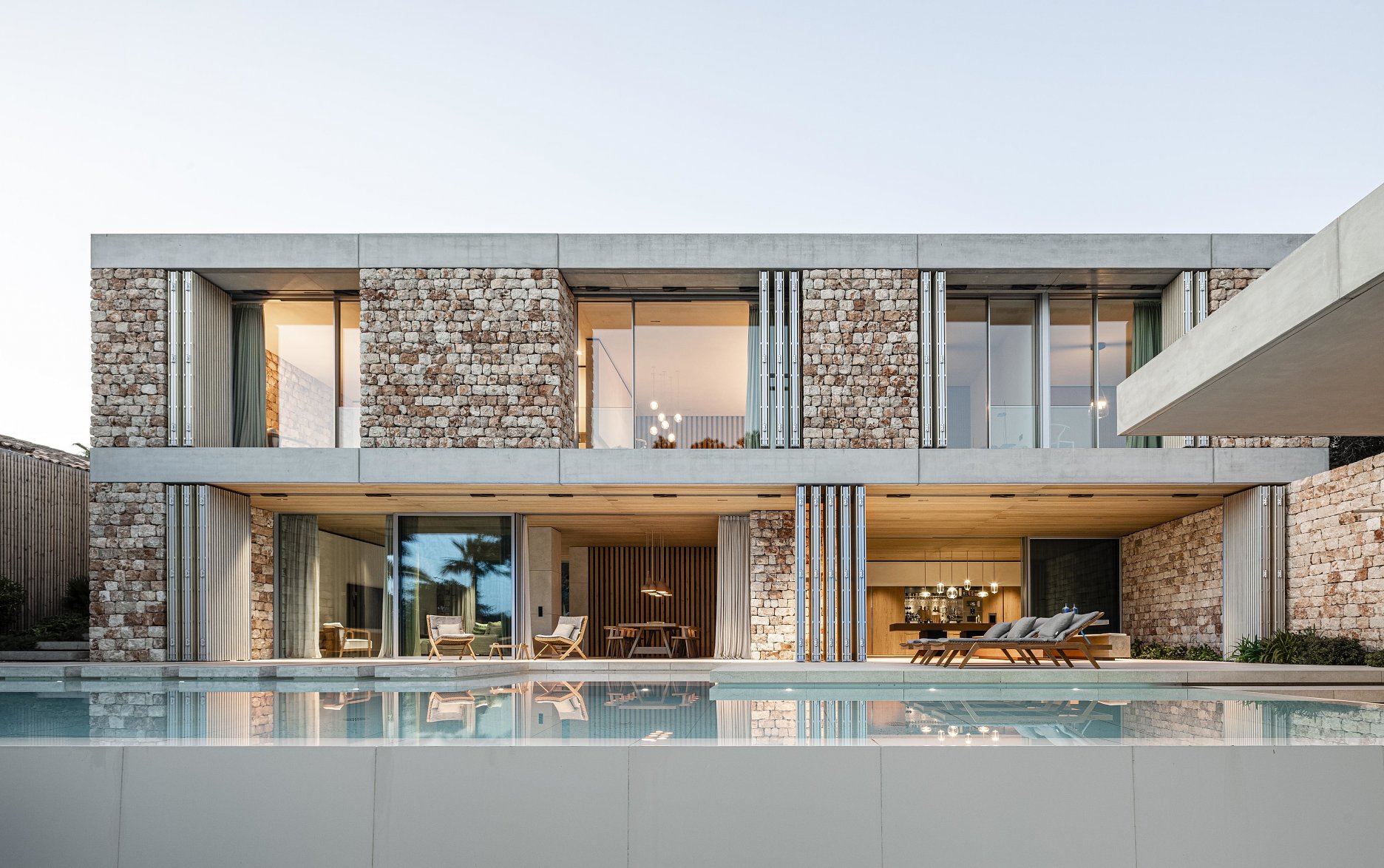 Malorka je napriek mantre o bašte masového turizmu predovšetkým nádherná prírodná krajina popretkávaná kamennými mestečkami. Boli sme očarení pôvodnými domami a svetelnou scénou ich interiérov, tienených charakteristickými okenicami. Chceli sme navrhnúť dom, ktorý by takúto atmosféru prerozprával. Vilu v súčasnom tvarosloví, ale s nádychom lokálnych stredomorských atmosfér. Využívame tradičné prvky miestnej architektúry, v synergii s energetickým konceptom, založeným na prirodzenej akumulačnej schopnosti masívnych stien. Kamenná fasáda, zhotovená technológiou nasucho ukladaných kamenných blokov, má na Malorke dlhú tradíciu a od roku 2018 je zapísaná ako súčasť kultúrneho dedičstva UNESCO.