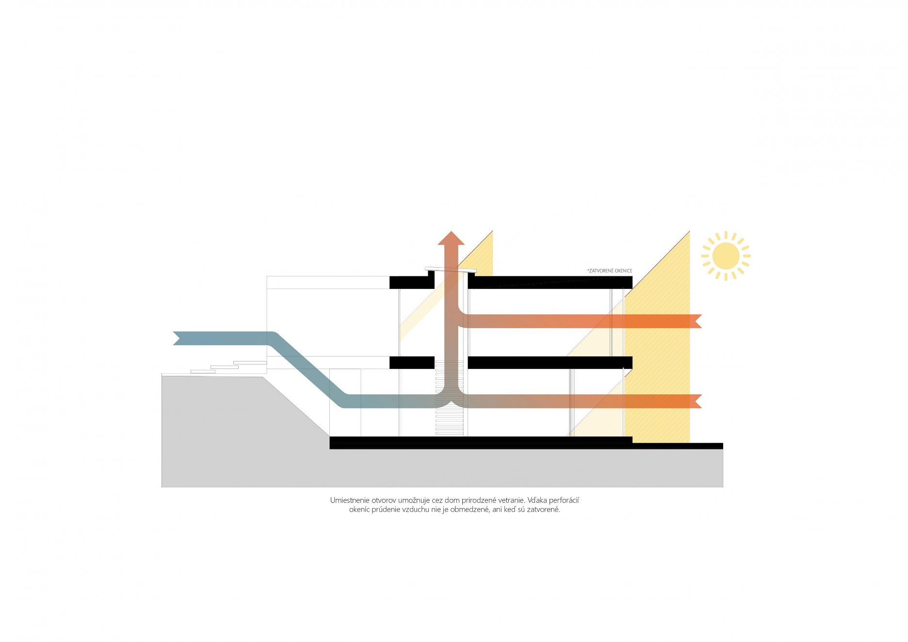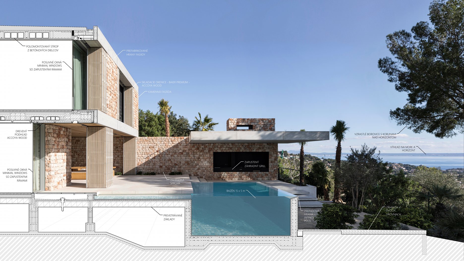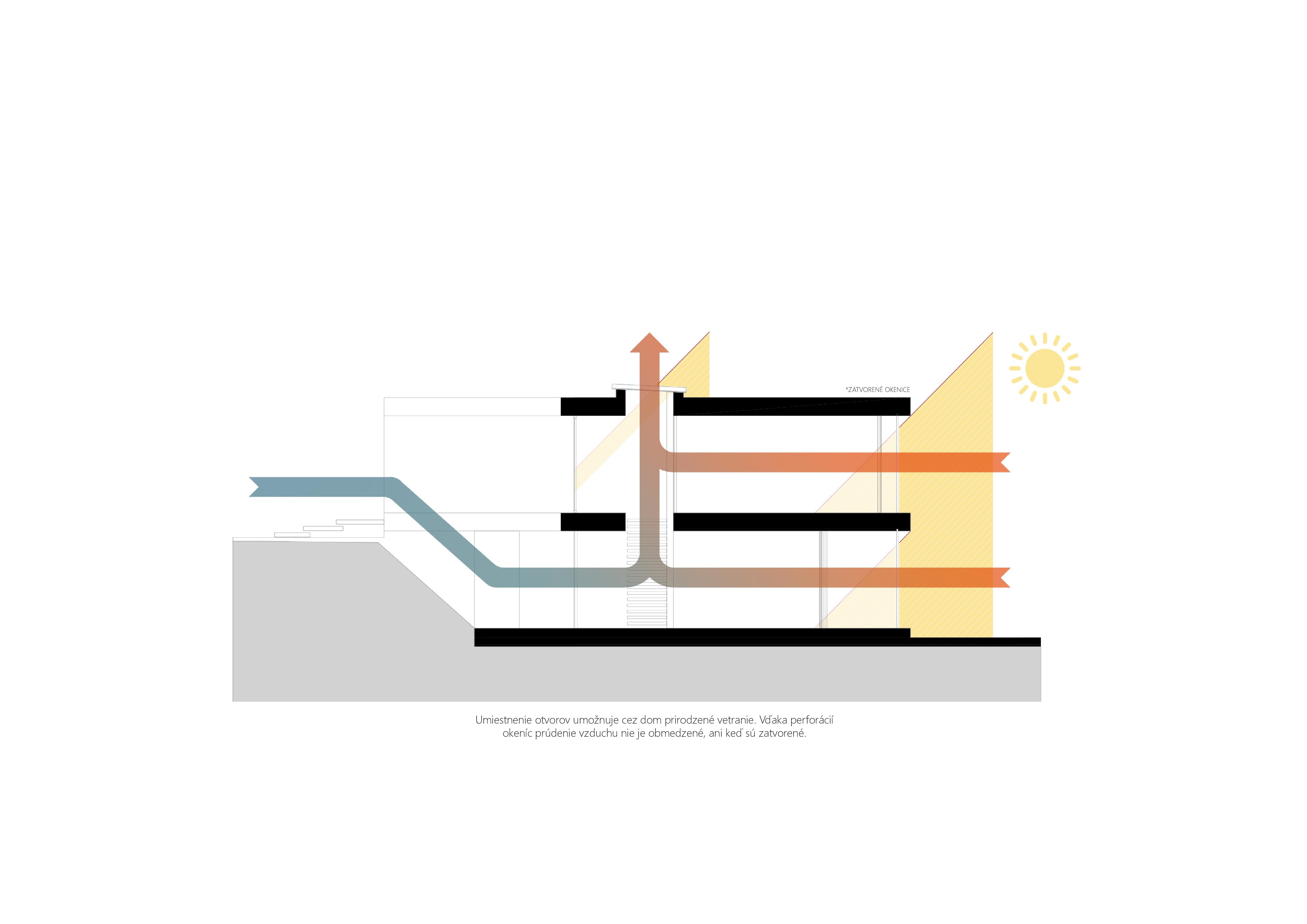 Masívne pôsobenie kamennej fasády prerušujú štíhle dosky podlaží z prefabrikovaných betónových dielcov. Hlboké okenné perforácie vo fasáde zabraňujú prehrievaniu interiéru v letných mesiach. Miestny motív okeníc sme reinterpretovali do veľkoplošných posuvno-sklopných panelov s ľahkým dreveným rastrom, ktoré vytvárajú nárazníkovú zónu s prirodzeným prúdením vzduchu medzi interiérom a exteriérom. Zároveň vytvárajú tú pravú stredomorskú atmosféru hry svetla a tieňa. Prirodzené vetranie domu umožňuje komínový efekt, prostredníctvom veľkého svetlíka umiestneného nad schodiskom v strede domu.