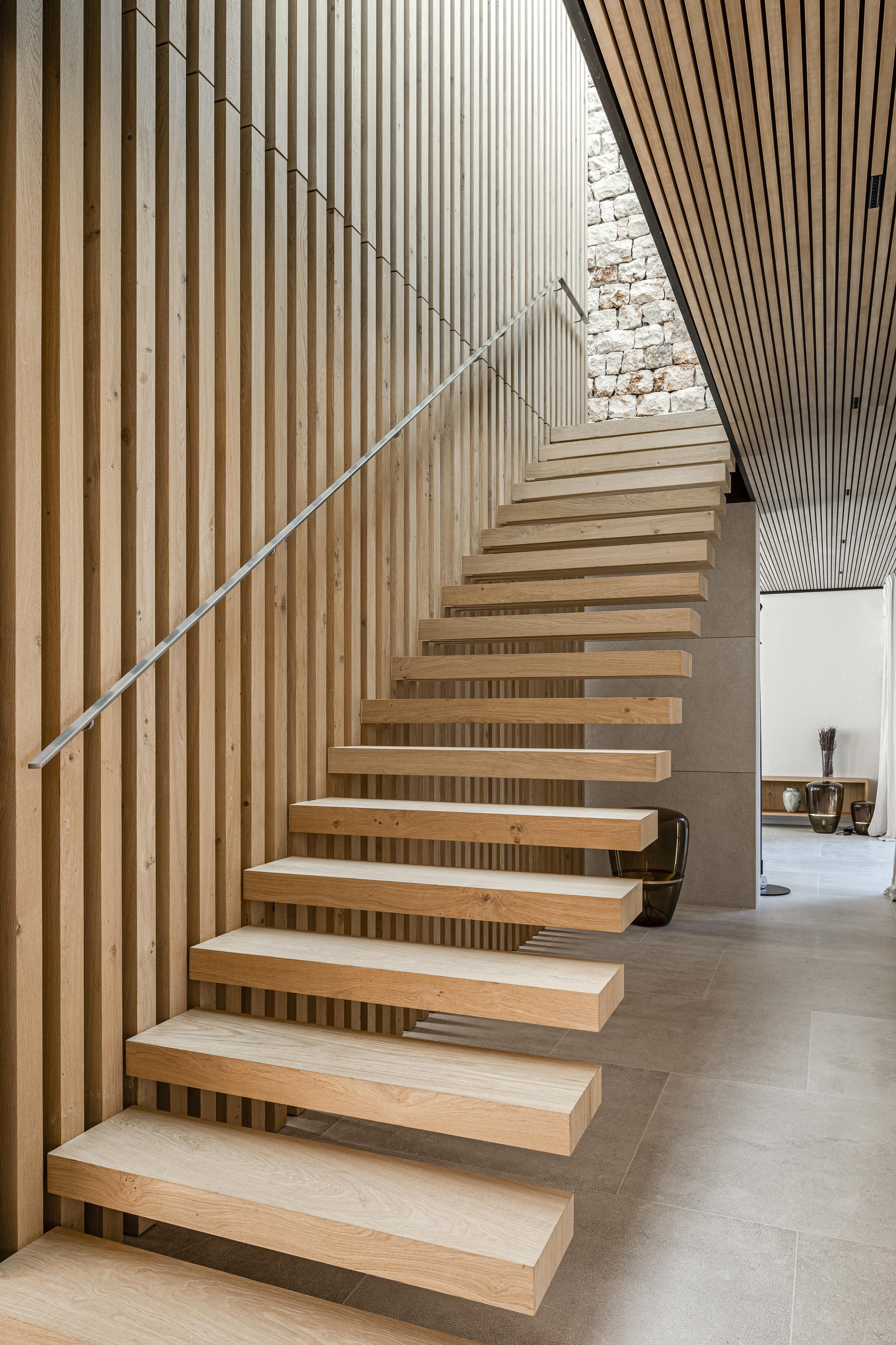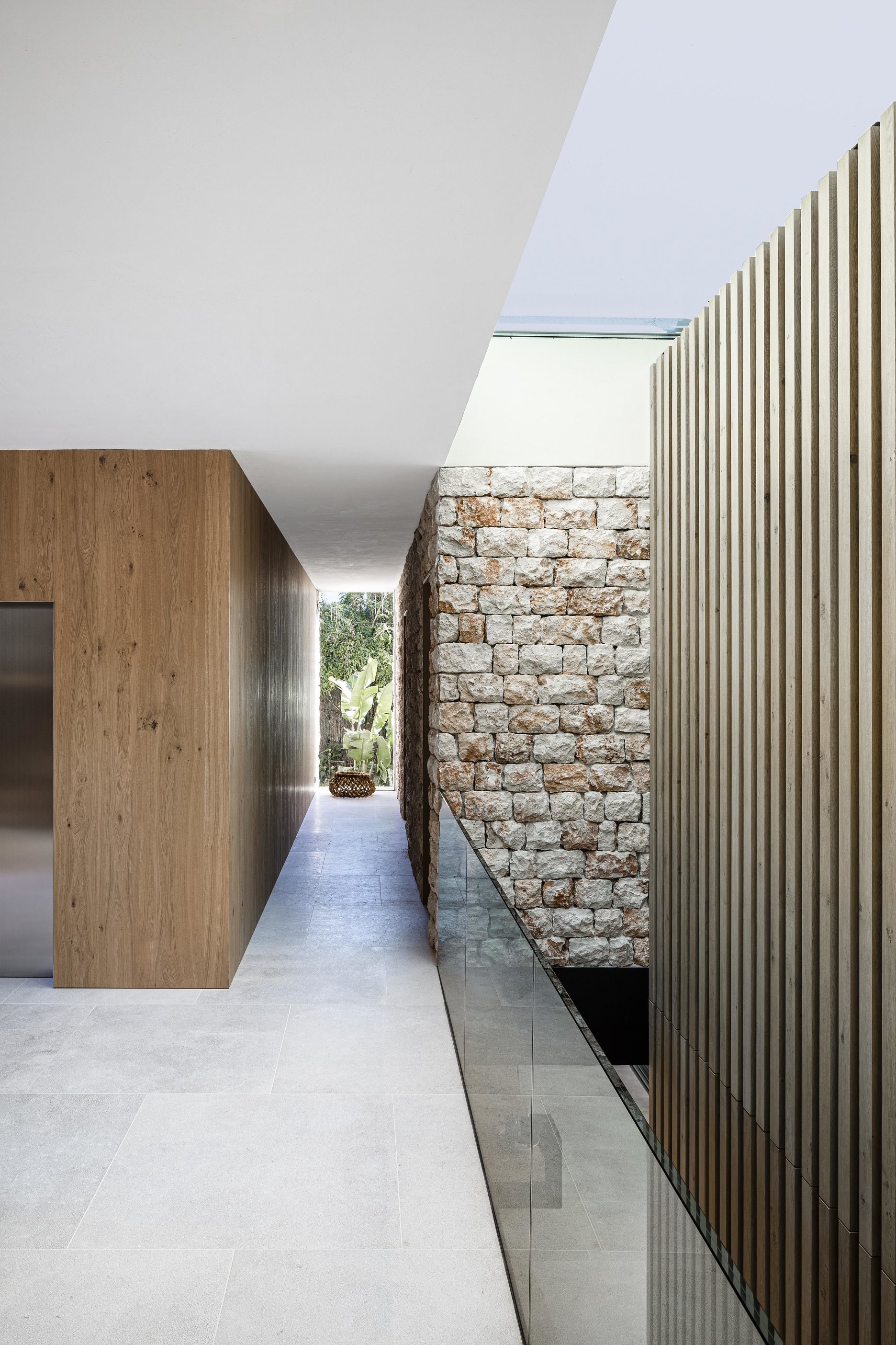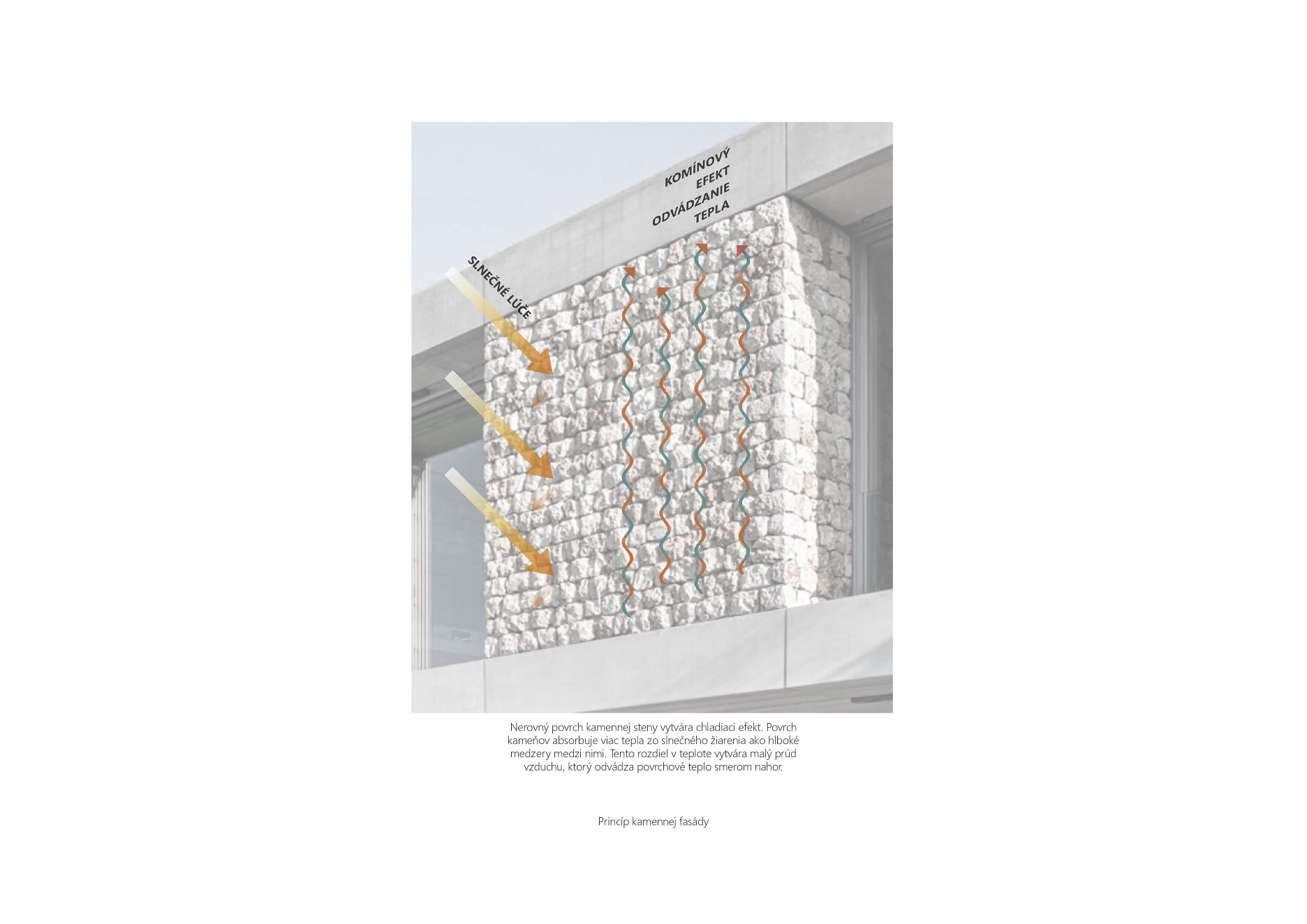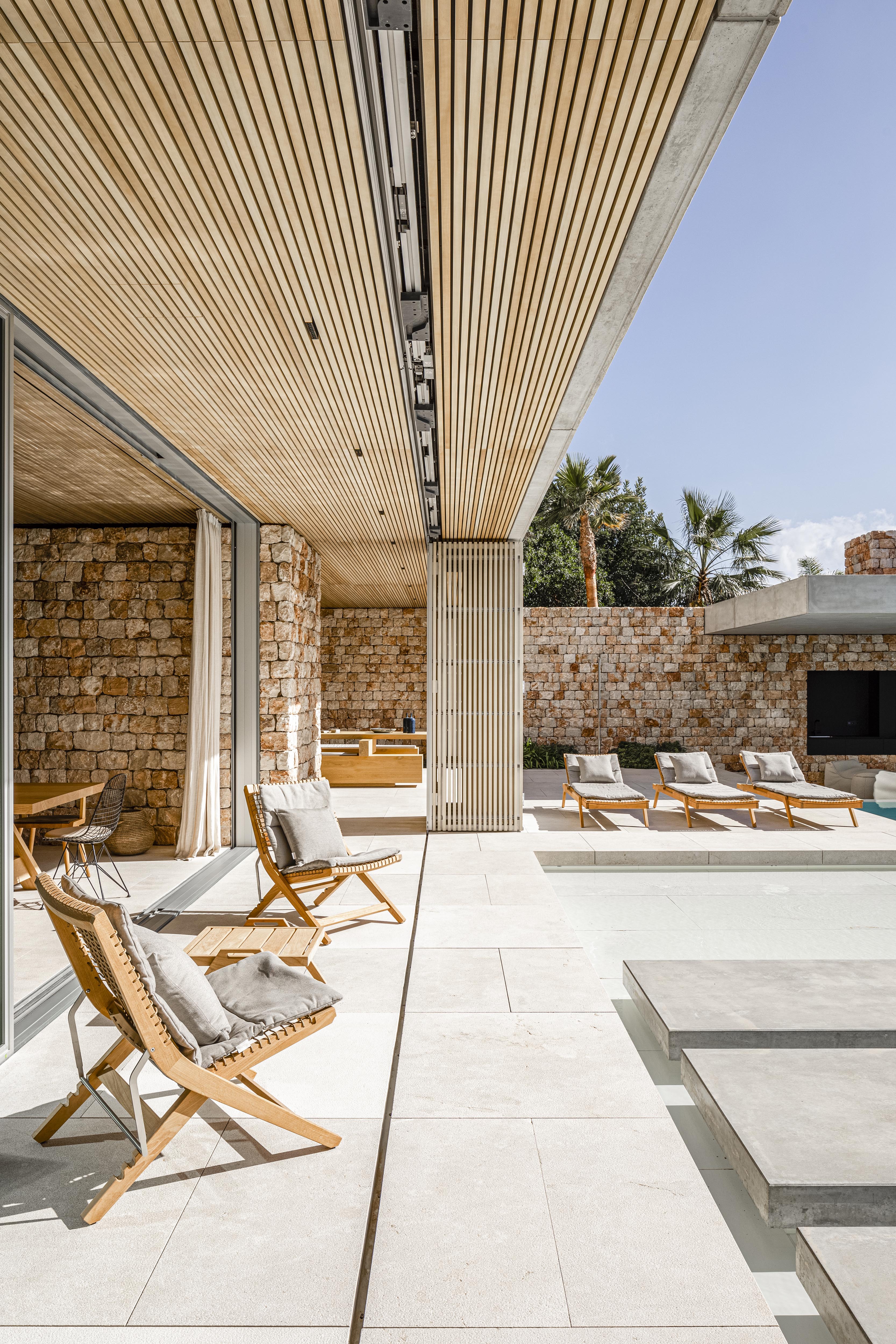 Masívne pôsobenie kamennej fasády prerušujú štíhle dosky podlaží z prefabrikovaných betónových dielcov. Hlboké okenné perforácie vo fasáde zabraňujú prehrievaniu interiéru v letných mesiach. Miestny motív okeníc sme reinterpretovali do veľkoplošných posuvno-sklopných panelov s ľahkým dreveným rastrom, ktoré vytvárajú nárazníkovú zónu s prirodzeným prúdením vzduchu medzi interiérom a exteriérom. Zároveň vytvárajú tú pravú stredomorskú atmosféru hry svetla a tieňa. Prirodzené vetranie domu umožňuje komínový efekt, prostredníctvom veľkého svetlíka umiestneného nad schodiskom v strede domu.