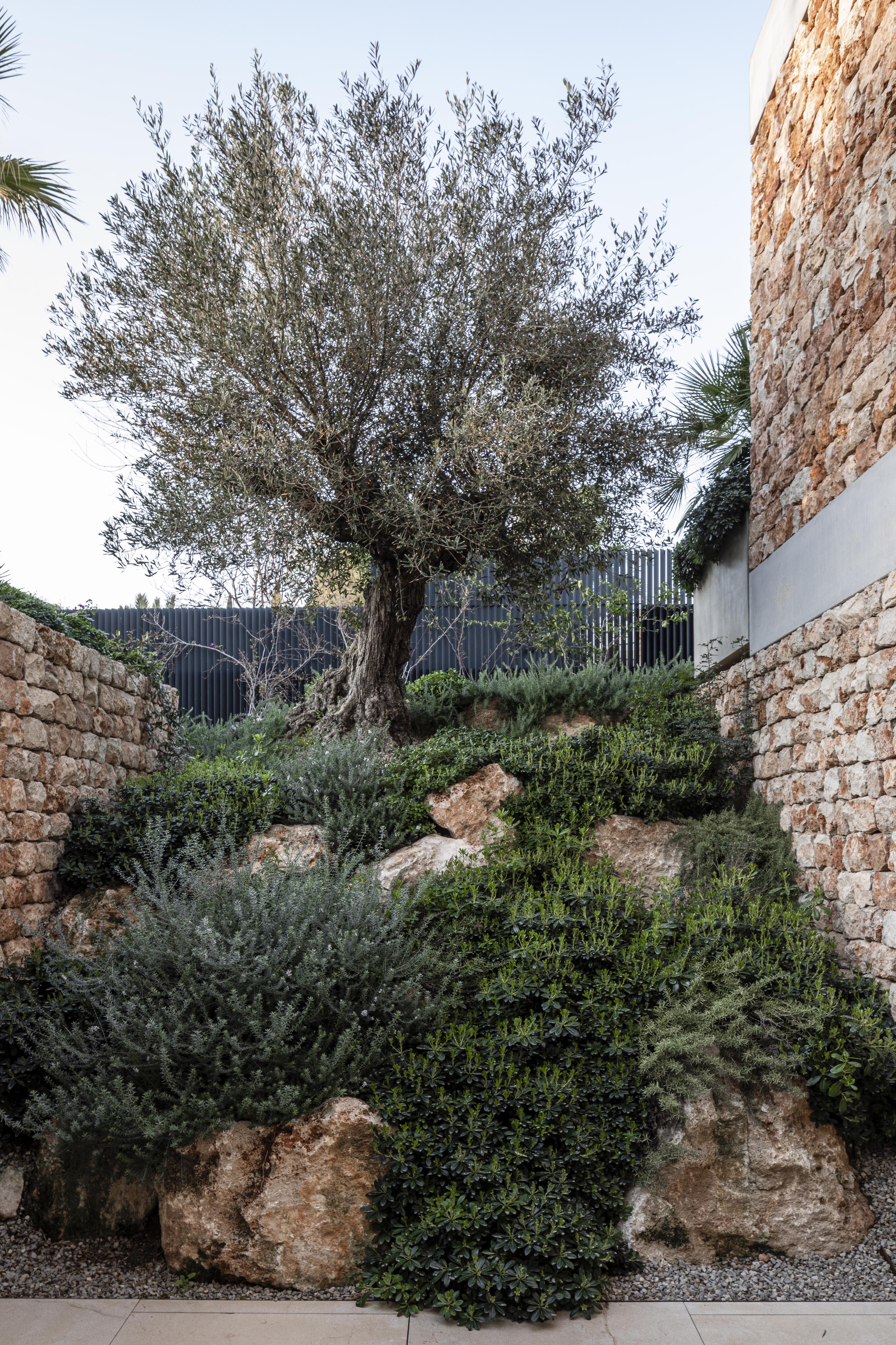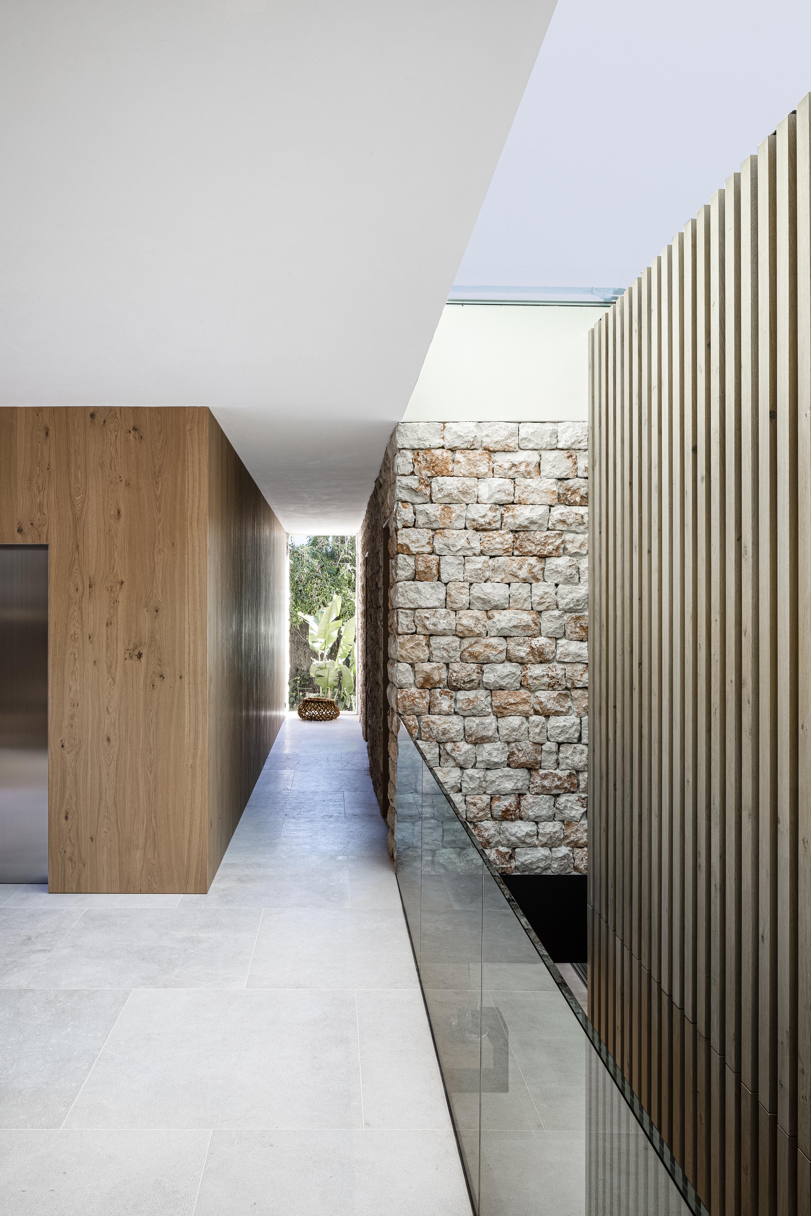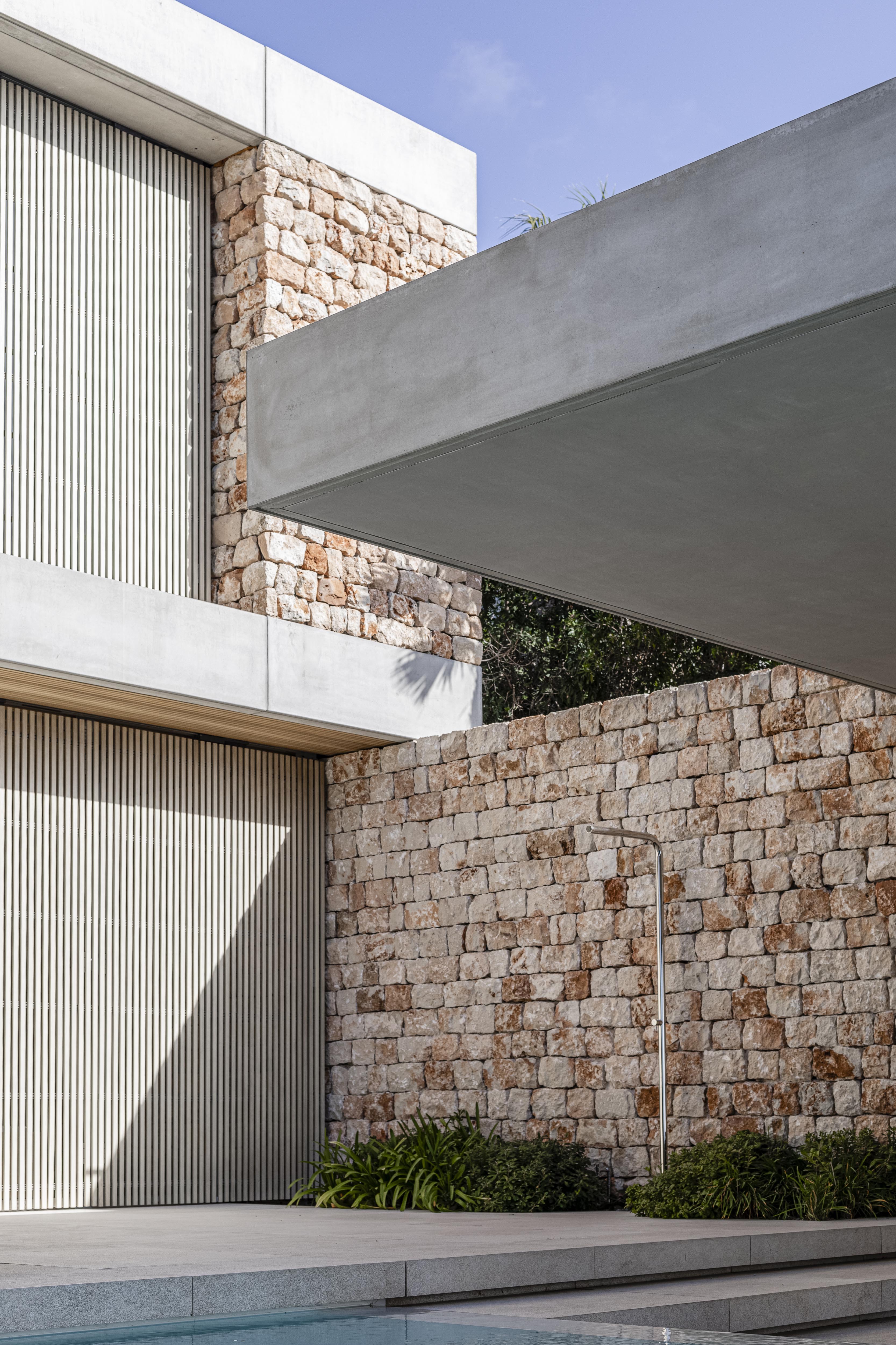 Po roku hľadania sa nám podarilo nájsť pozemok v obľúbenej vilovej štvrti so štyrmi vzrastlými borovicami, do ktorých sa náš klient okamžitě zamiloval. V súlade s prísnymi miestnymi regulatívmi sme navrhli kompaktný dom, osadený do strmého terénu. “Vyhryznutie” z objemu, v mieste pátia na severnej strane domu, umožňuje priečne prevetranie a presvetlenie spodného obytného podlažia. Od začiatku bol pre nás dôležitý aj energetický koncept návrhu. Chceli sme minimalizovať obdobie, počas ktorého je nutné priestor domu klimatizovať. Navrhli sme preto sendvičovú fasádu s masívnym kamenným obkladom na jej povrchu. Vysoká tepelná zotrvačnosť konštrukcií pozitívne prispieva k celkovej energetickej bilancii domu. To platí pre chladenie, ale aj naopak, pre kúrenie. Použitie miestneho lomového kameňa je zároveň odkazom na malorskú vernakulárnu architektúru. Po celom ostrove nájdete takýto kameň na pôvodných domoch, alebo na obyčajných múrikoch pozdĺž ciest. "Pedra en sec" - alebo technológia nasucho ukladaných kamenných stien má na Malorke tradíciu, ktorá siaha až do prehistorických čias.