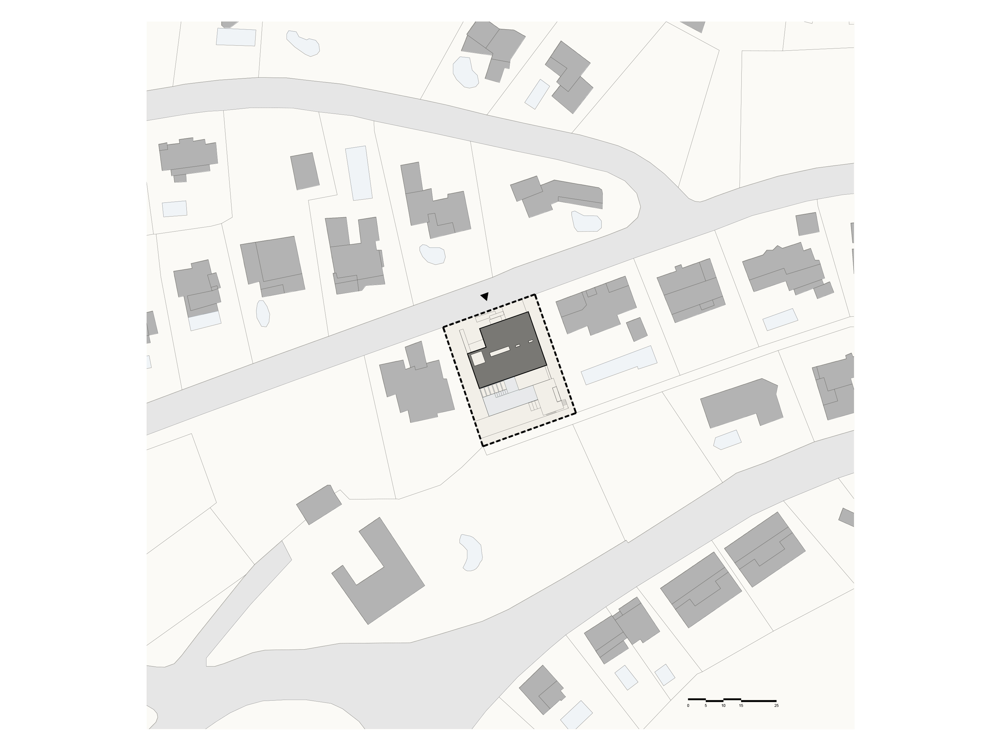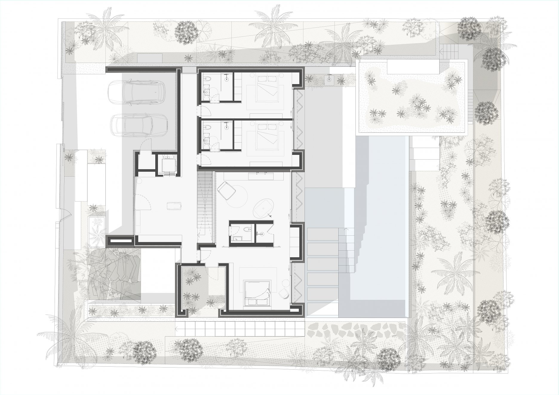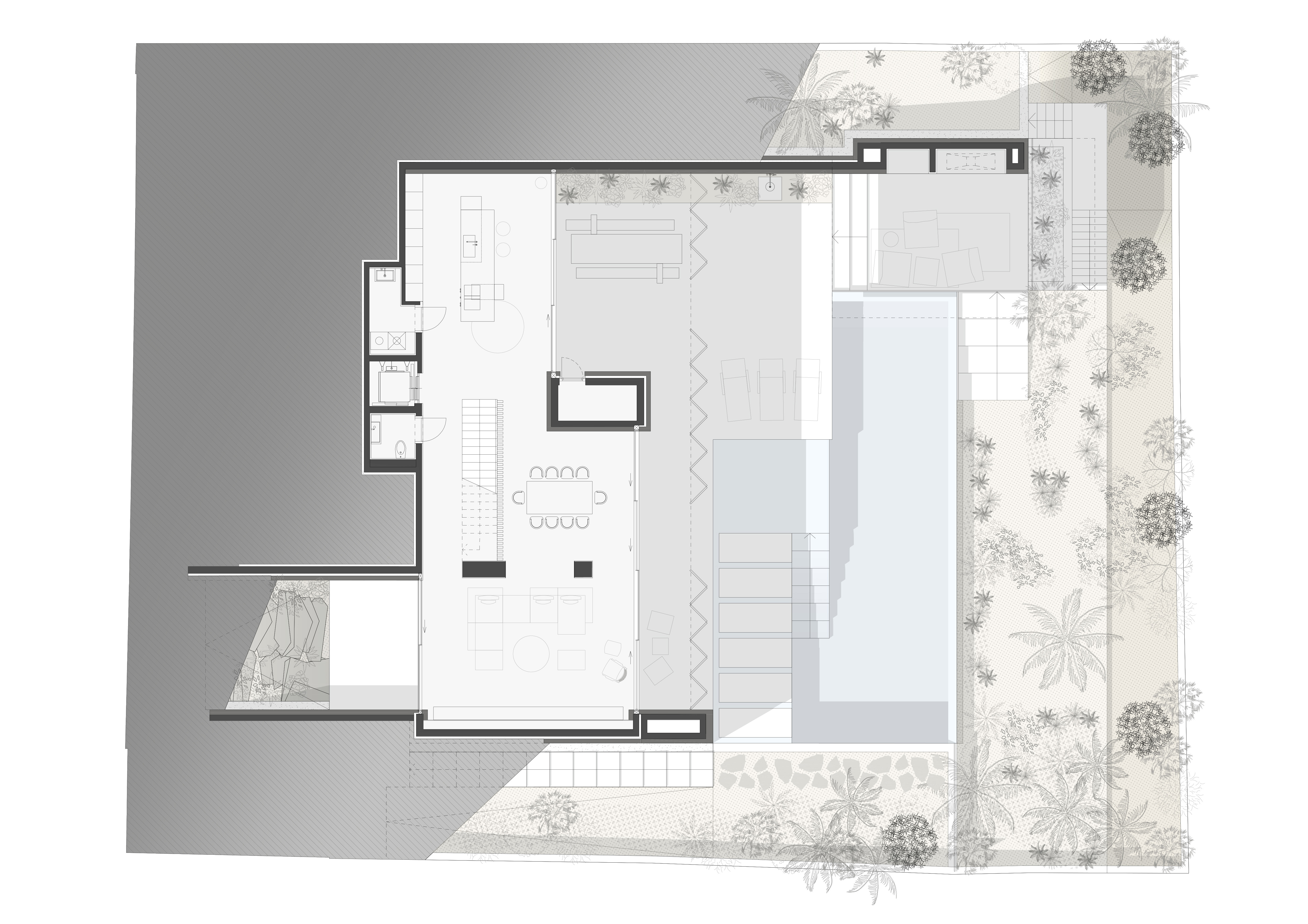 Po roku hľadania sa nám podarilo nájsť pozemok v obľúbenej vilovej štvrti so štyrmi vzrastlými borovicami, do ktorých sa náš klient okamžitě zamiloval. V súlade s prísnymi miestnymi regulatívmi sme navrhli kompaktný dom, osadený do strmého terénu. “Vyhryznutie” z objemu, v mieste pátia na severnej strane domu, umožňuje priečne prevetranie a presvetlenie spodného obytného podlažia. Od začiatku bol pre nás dôležitý aj energetický koncept návrhu. Chceli sme minimalizovať obdobie, počas ktorého je nutné priestor domu klimatizovať. Navrhli sme preto sendvičovú fasádu s masívnym kamenným obkladom na jej povrchu. Vysoká tepelná zotrvačnosť konštrukcií pozitívne prispieva k celkovej energetickej bilancii domu. To platí pre chladenie, ale aj naopak, pre kúrenie. Použitie miestneho lomového kameňa je zároveň odkazom na malorskú vernakulárnu architektúru. Po celom ostrove nájdete takýto kameň na pôvodných domoch, alebo na obyčajných múrikoch pozdĺž ciest. "Pedra en sec" - alebo technológia nasucho ukladaných kamenných stien má na Malorke tradíciu, ktorá siaha až do prehistorických čias.