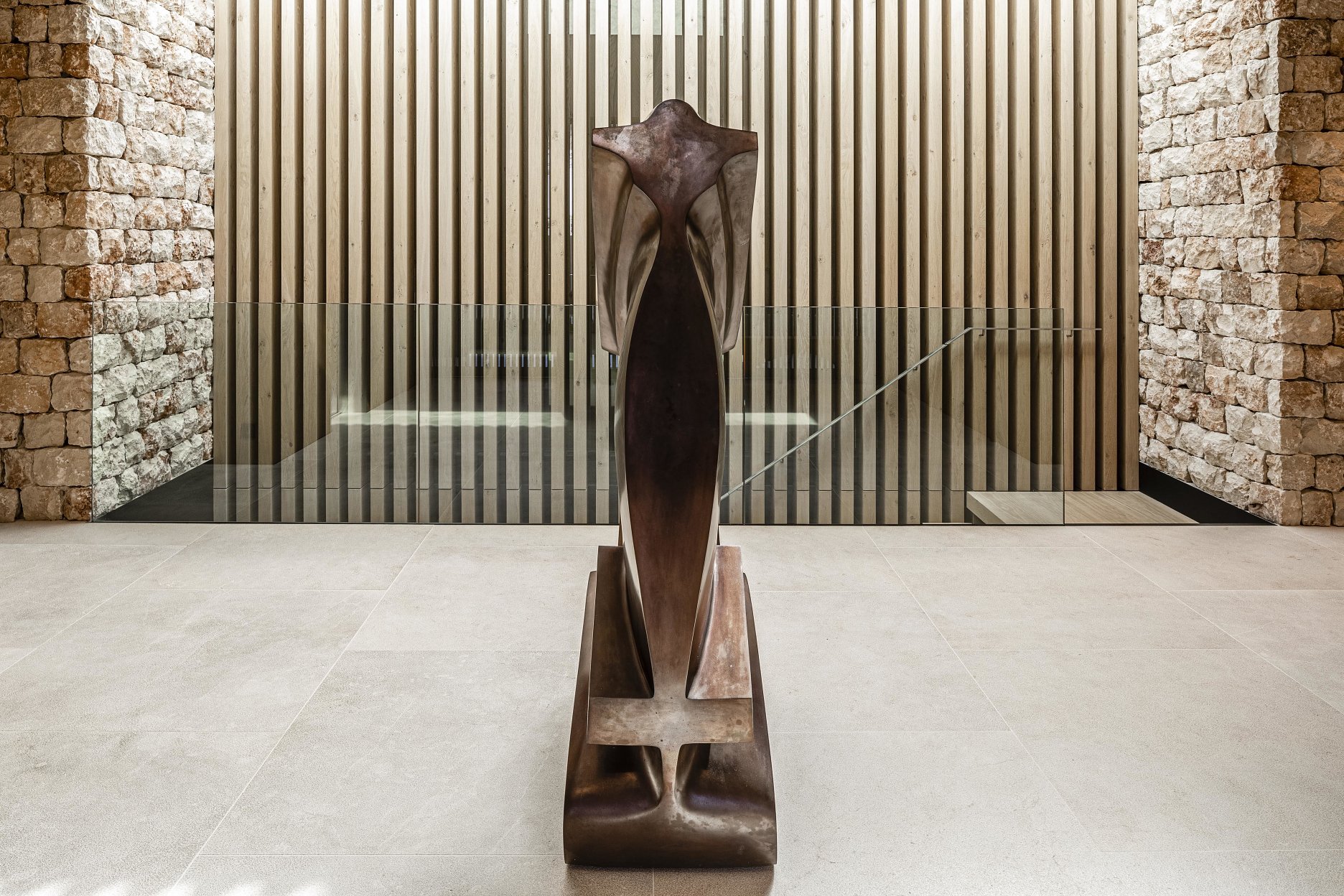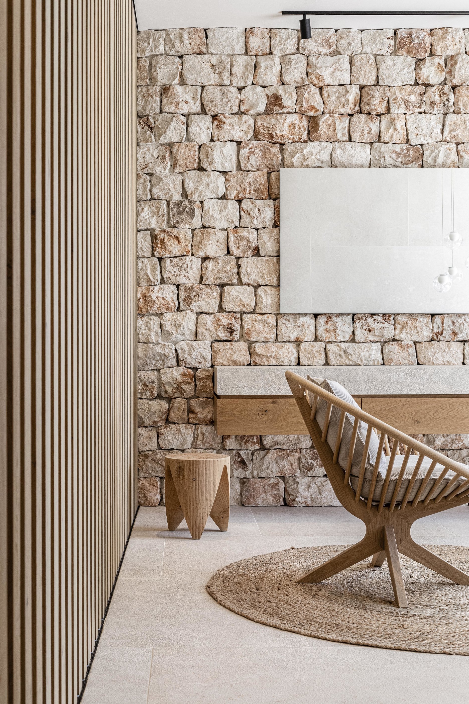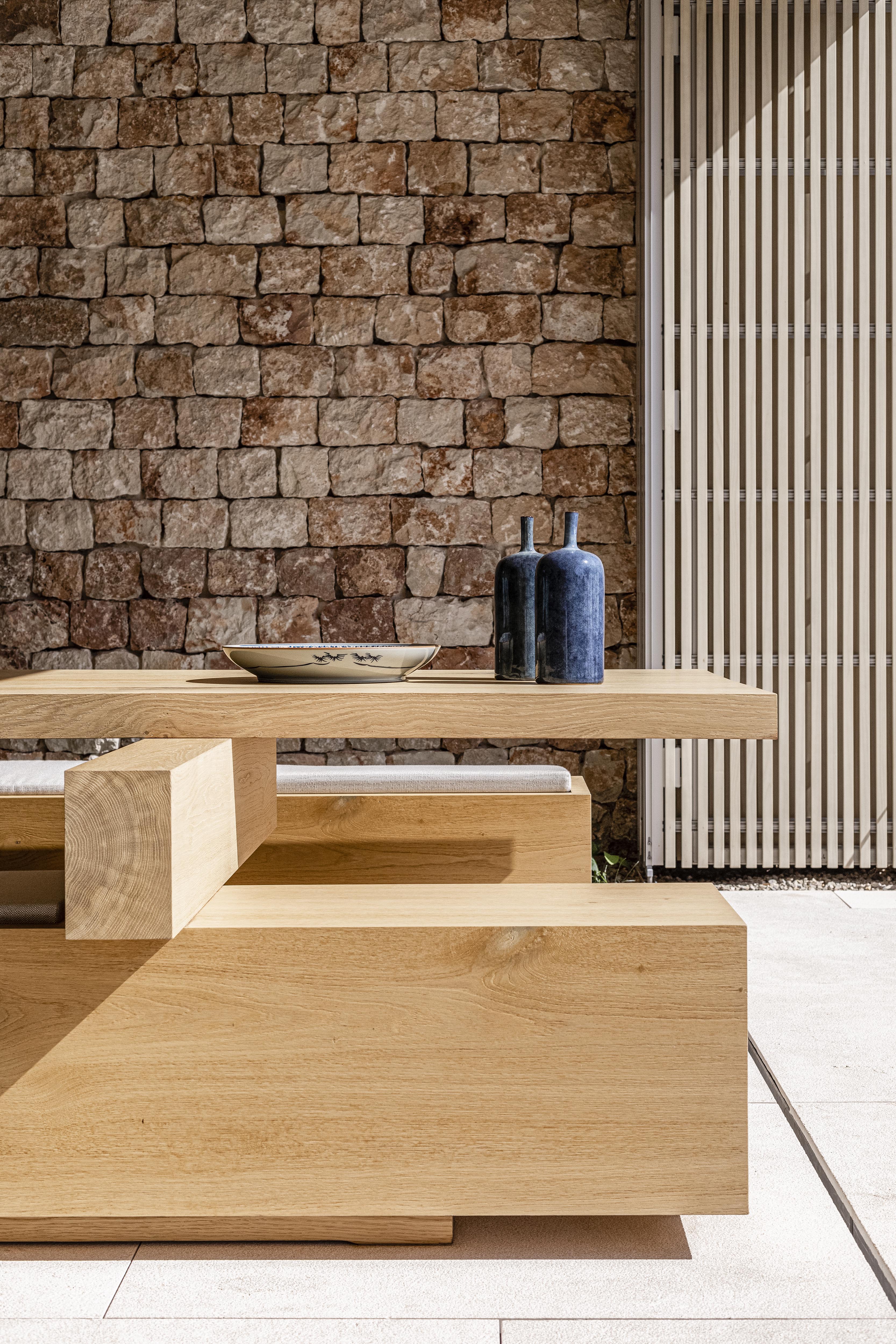 Interiér je zámerne ladený striedmo a necháva vyniknúť na mieru vyrobený mobiliár. Pri lampách nad jedálenským stolom sme neodolali remeselným zručnostiam slovenských keramikov. Všade prítomná intarzia kamennej fasády a tradičná vápenná omietka “Estuco de cal” dotvára autentickú atmosféru miestneho koloritu.