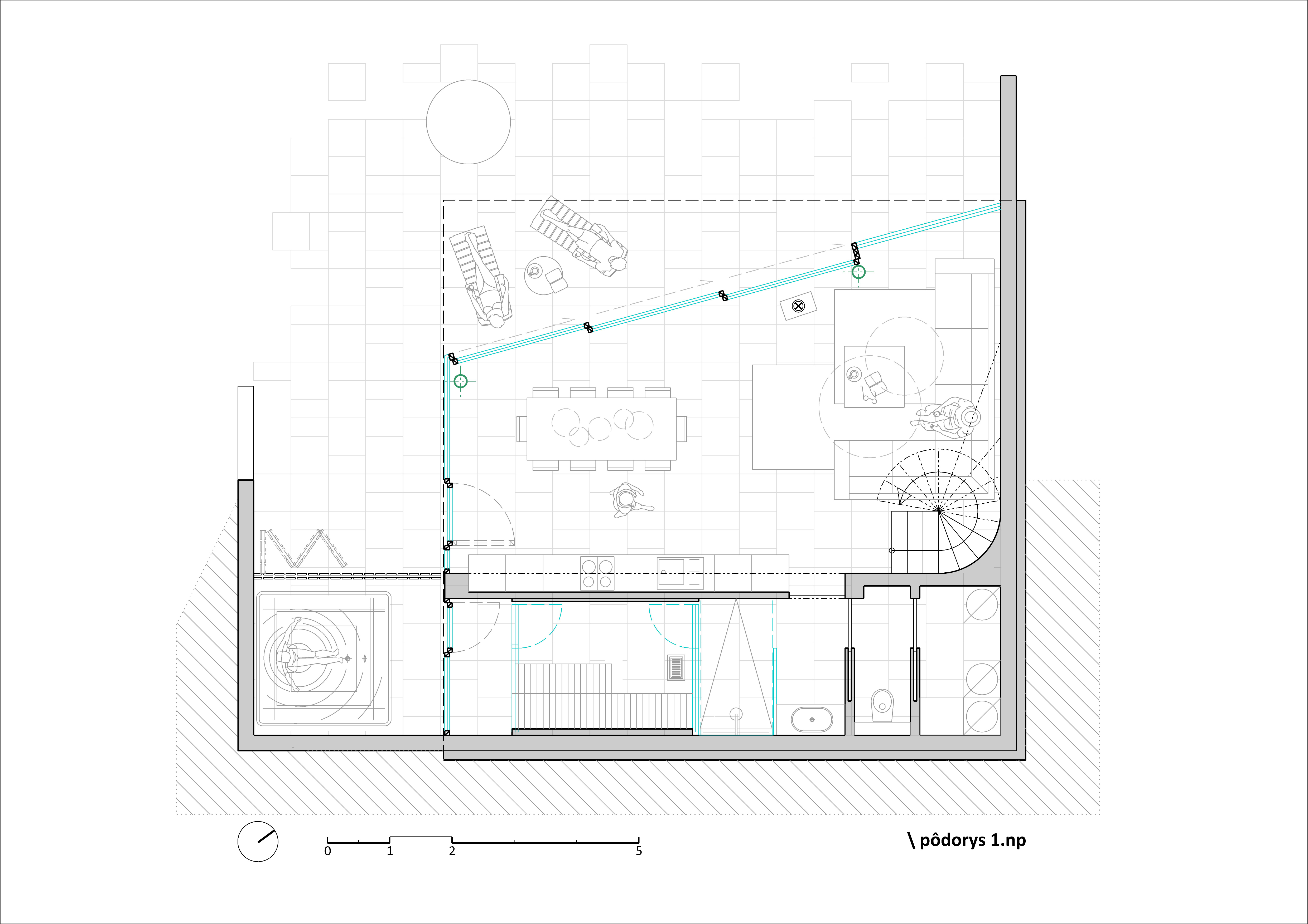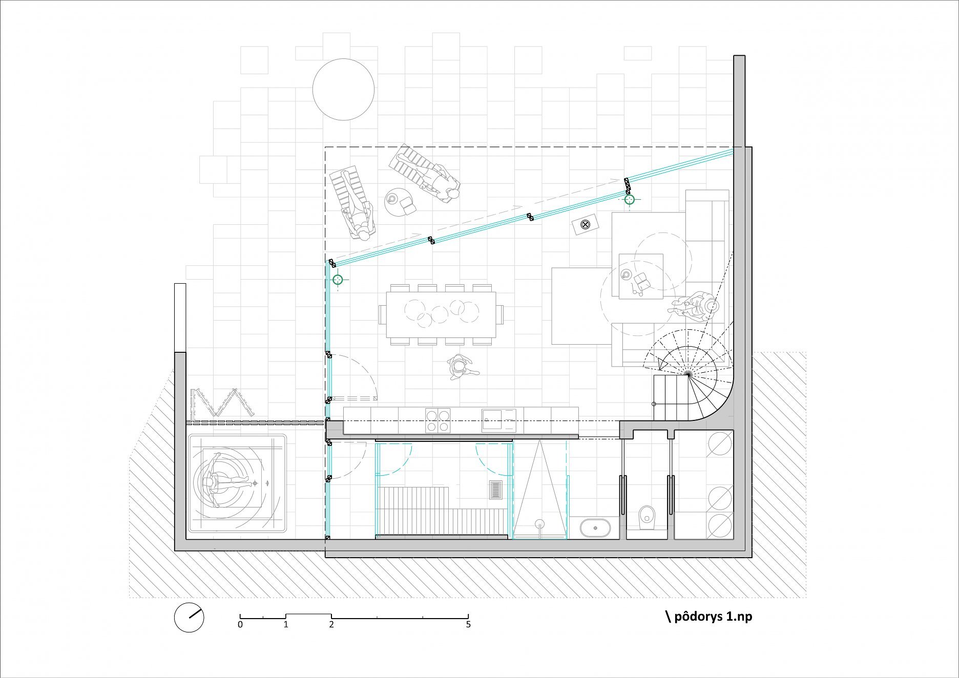 Dispozične je 1. NP prístupné priamo z juhozápadnej strany. Tvorí ho centrálna pobytová hala s kuchyňou, na ktorú nadväzuje zázemie v juhovýchodnej časti objektu. Zázemie pozostáva z technickej miestnosti, kúpeľne, toalety a wellnessovej časti s priamym výstupom na uzavretý dvorček s vírivkou. Z haly vedie schodisko spájajúce jednotlivé podlažia.