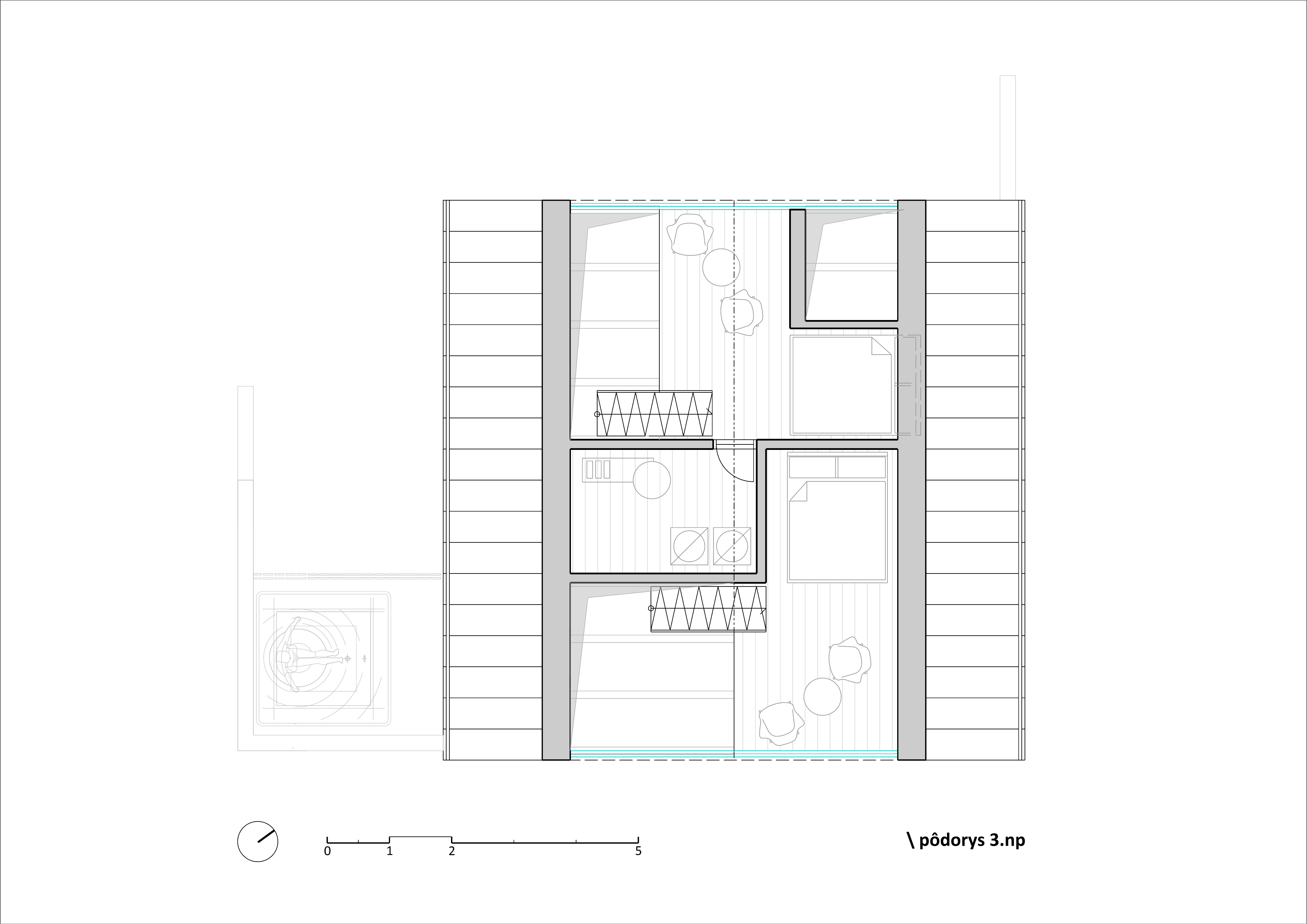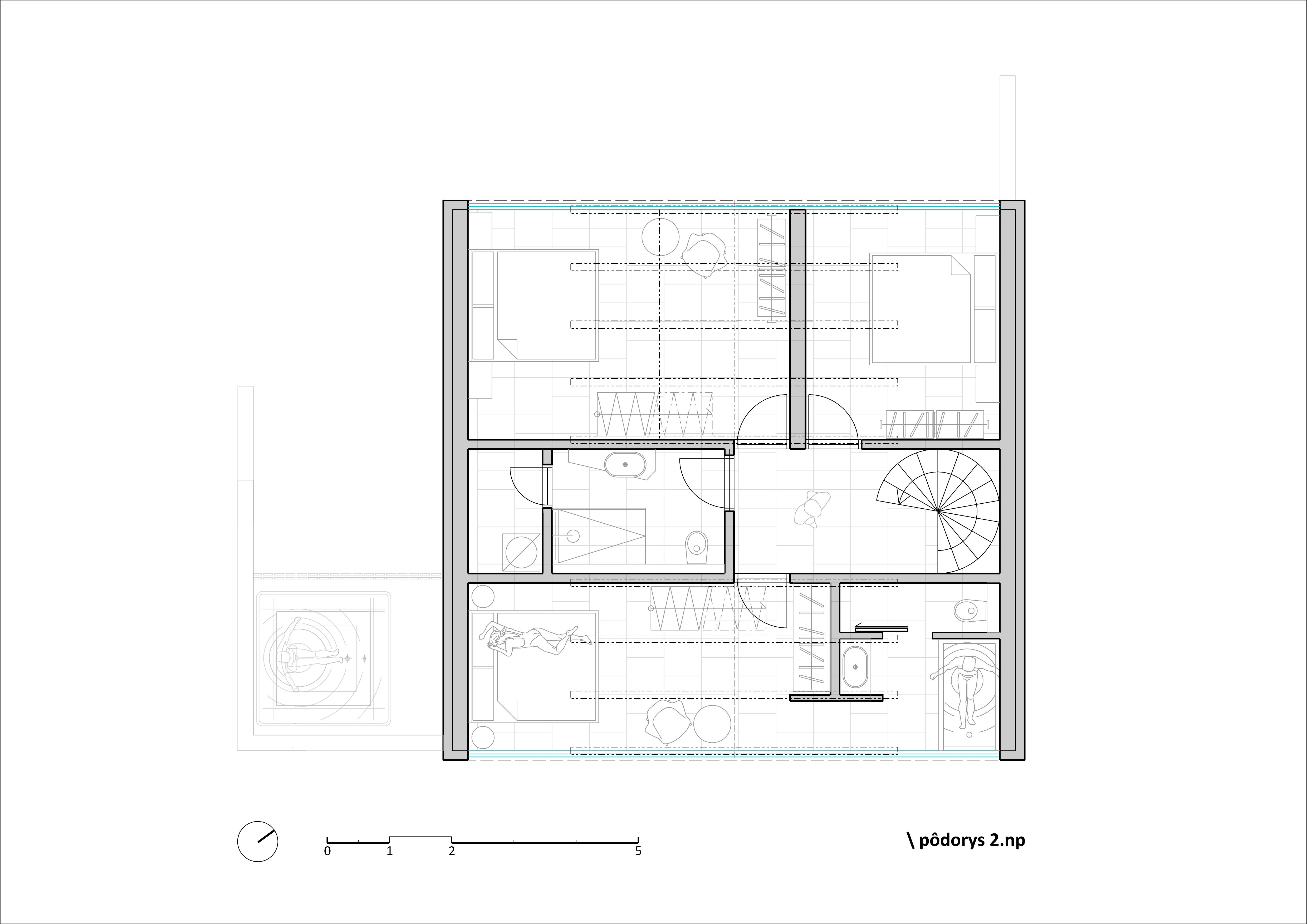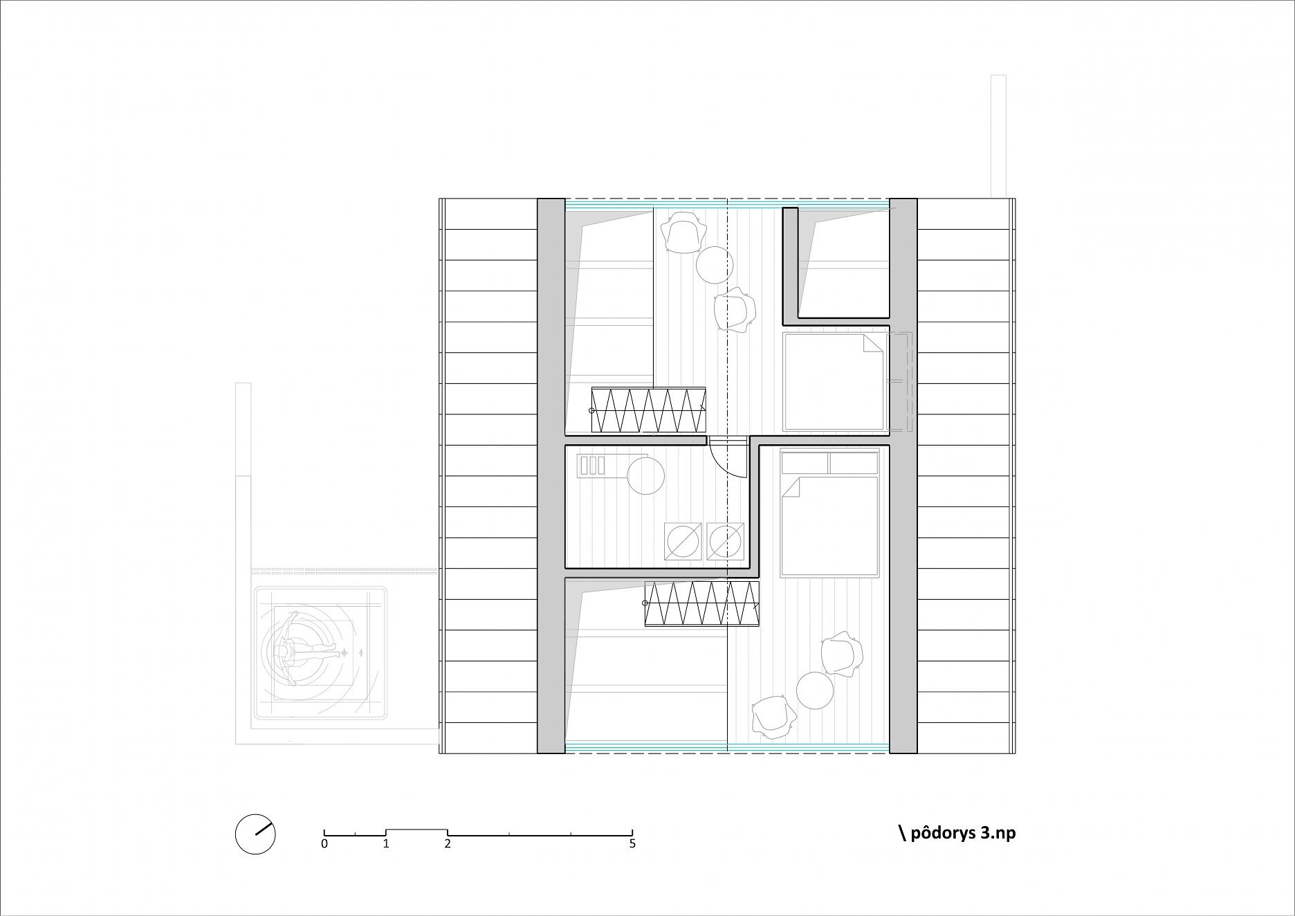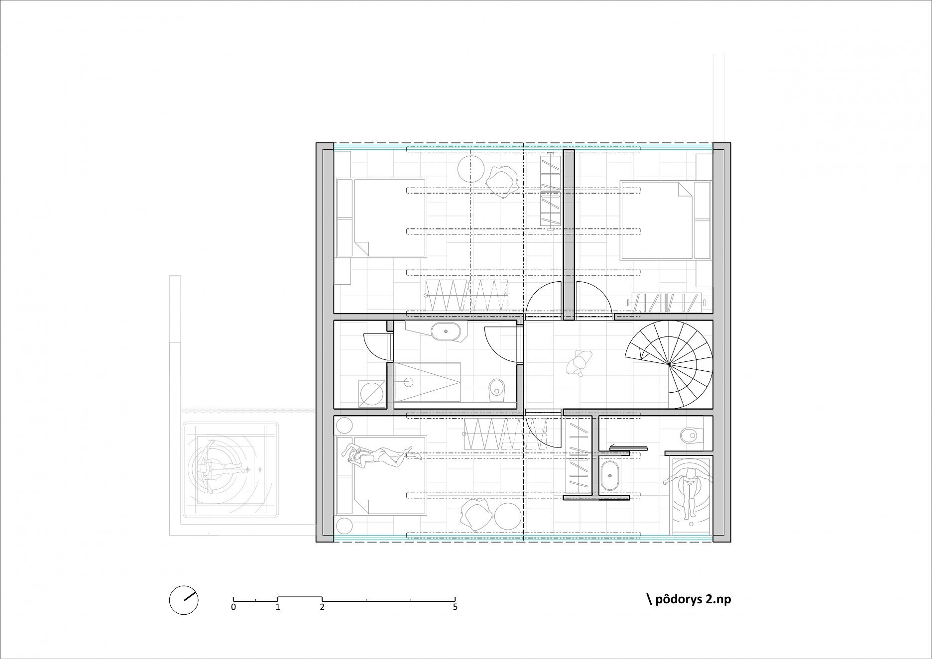 Na 2. NP (podkroví) ústi centrálne schodisko do chodby, z ktorej sú prístupné tri samostatné spálne a kúpeľňa. Spálňa na juhovýchodnej strane je riešená ako apartmán so samostatným hygienickým zázemím. Časť spální má aj vyvýšený priestor – galériu prístupnú rebríkovým schodiskom priamo z príslušnej izby.
