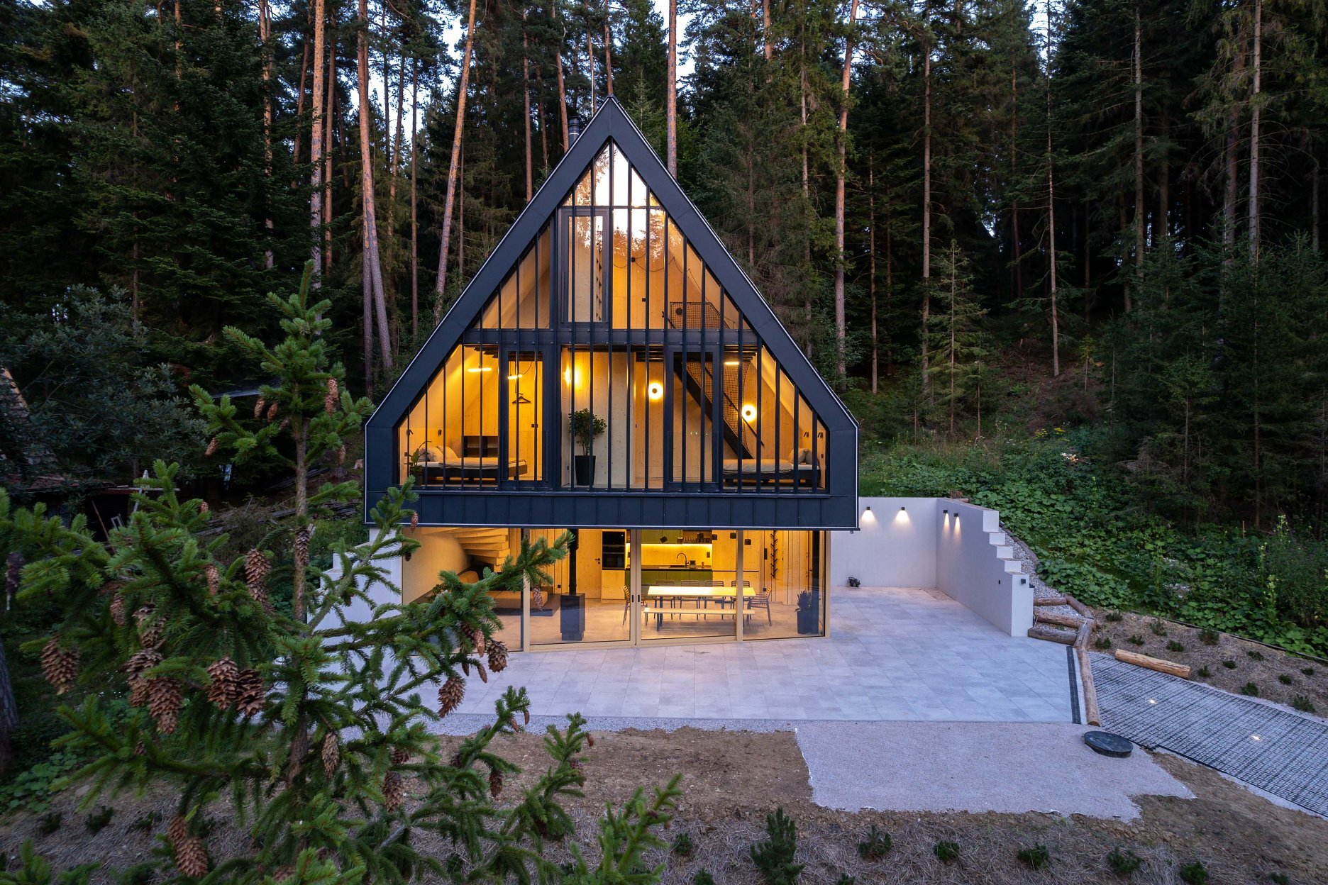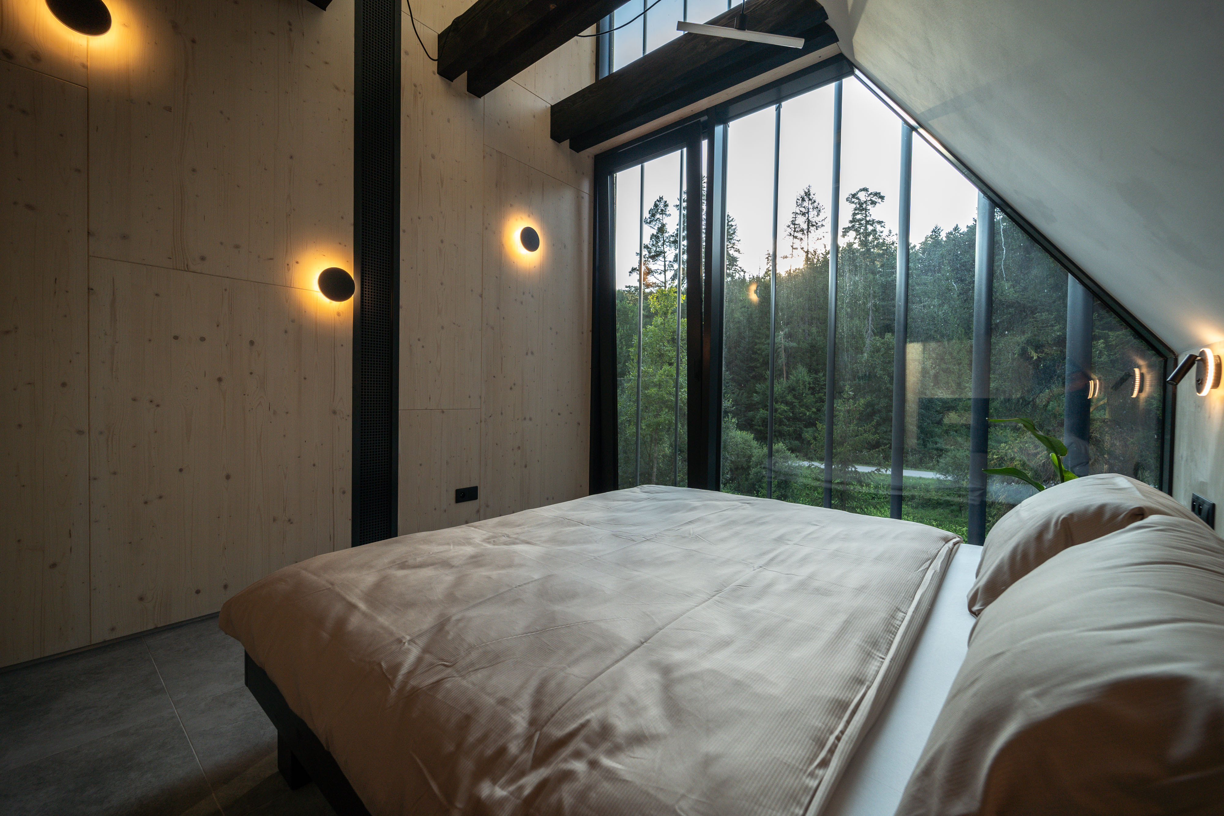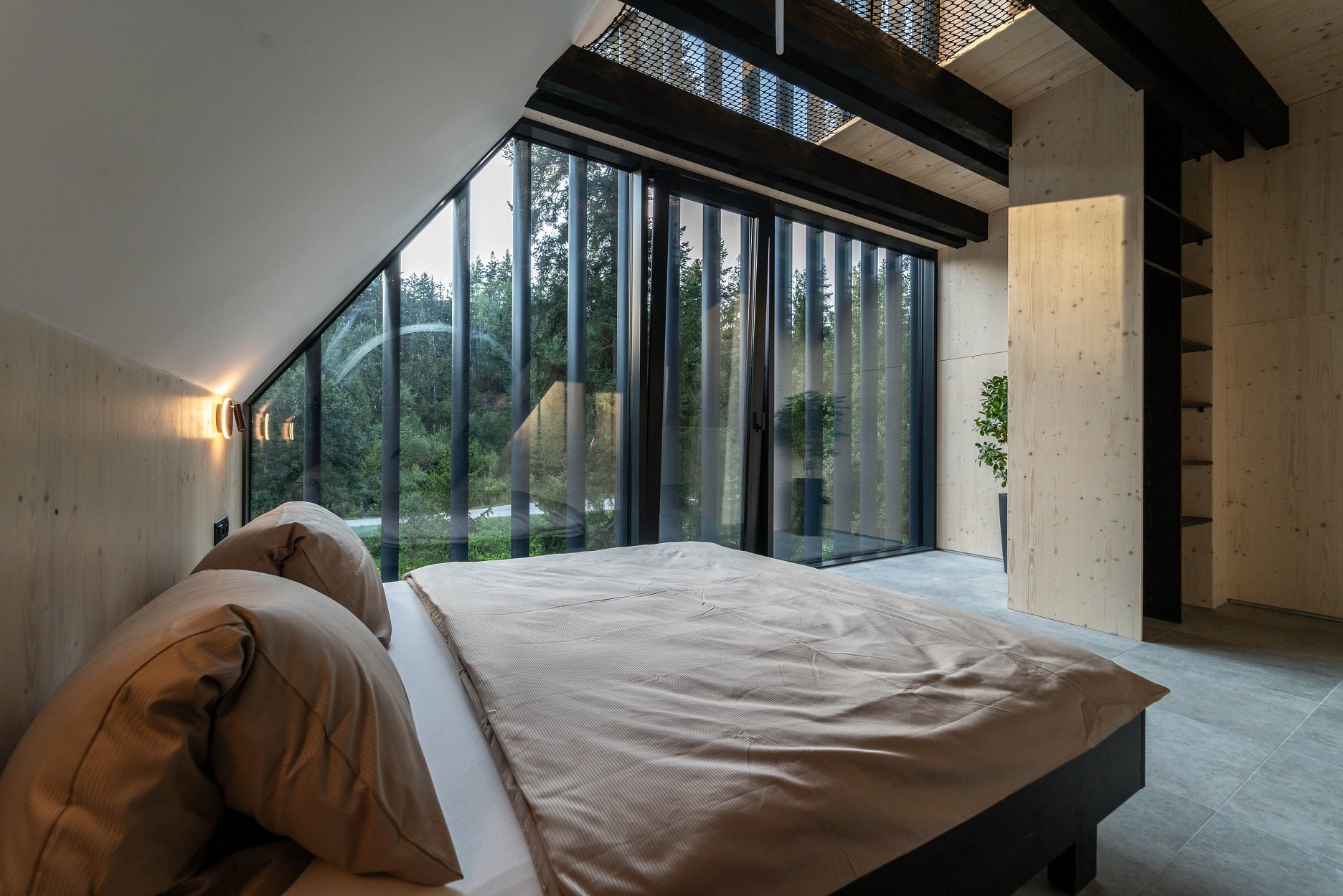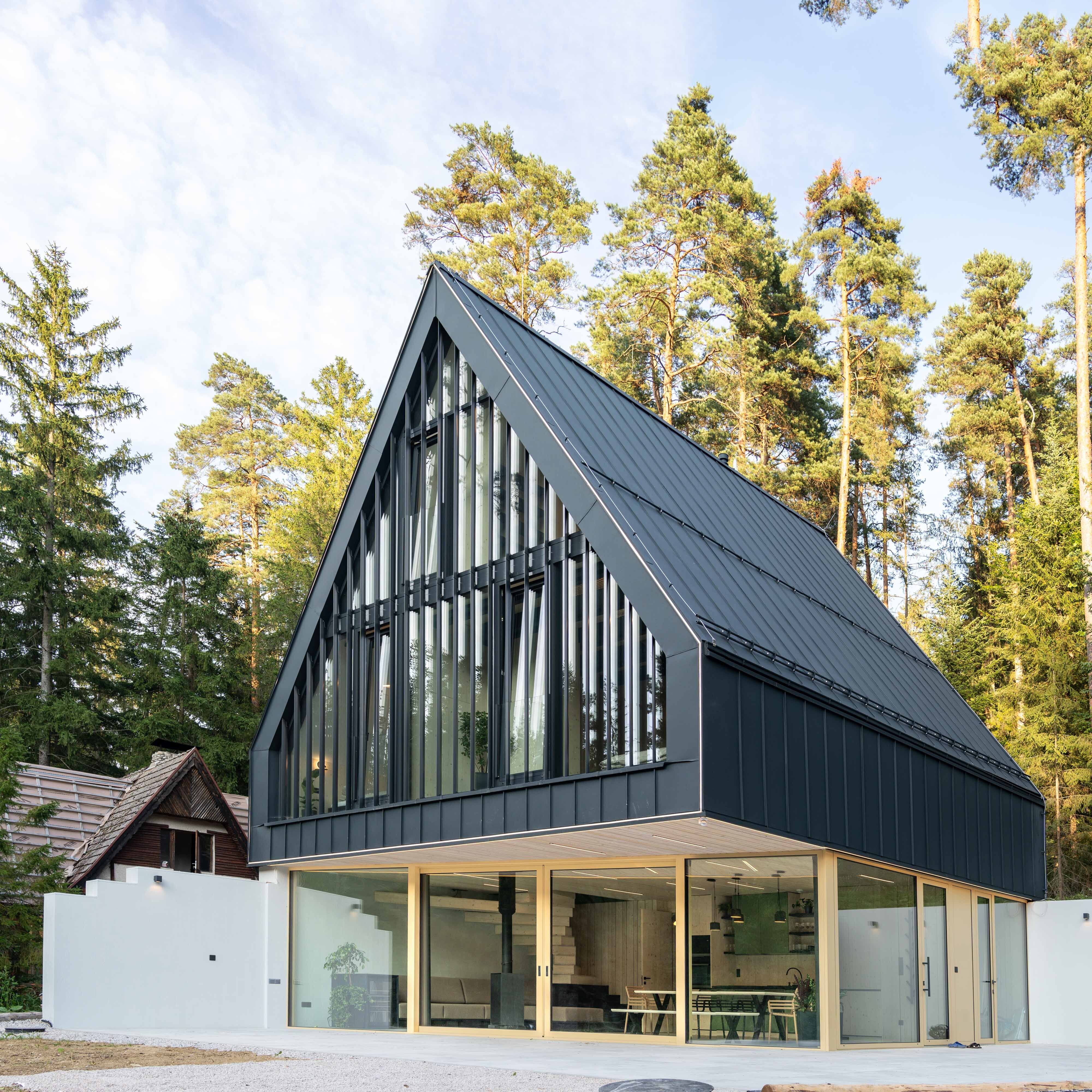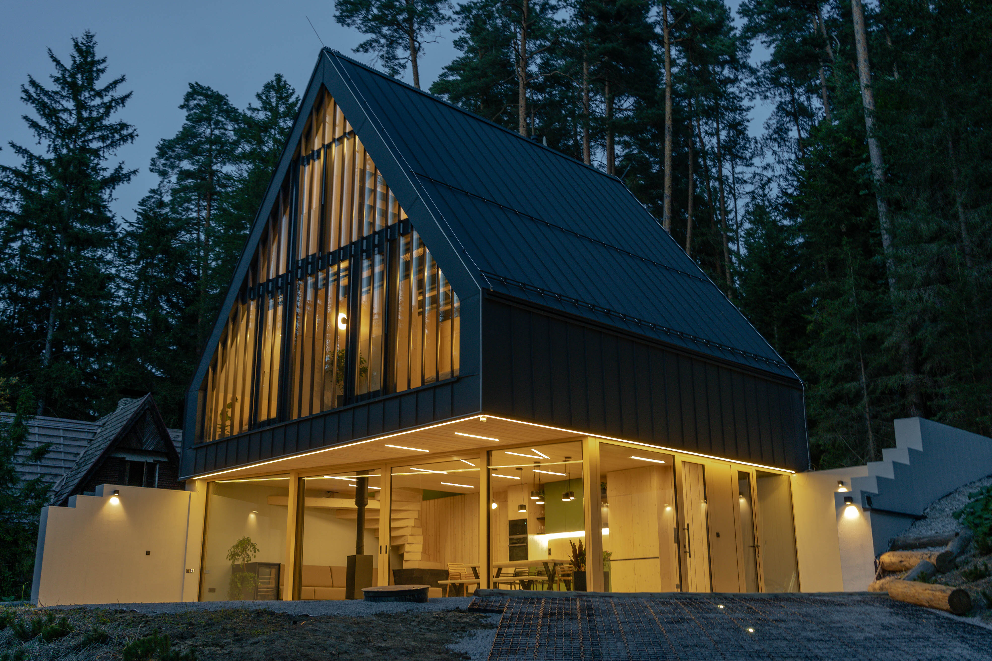 Rekreačná chata z dielne ateliéru LENarchitekti nahrádza pôvodný objekt na rovnakej parcele. Štvorcový pôdorys 10 × 10 m so sedlovou strechou ukrýva tri spálne, dennú halu s kuchyňou a wellness zónu; objekt je čiastočne zapustený do svahu a doplnený opornými múrmi. Murovaná konštrukcia s plechovou krytinou a celopresklenými štítmi spája osvedčené technológie s moderným výrazom.