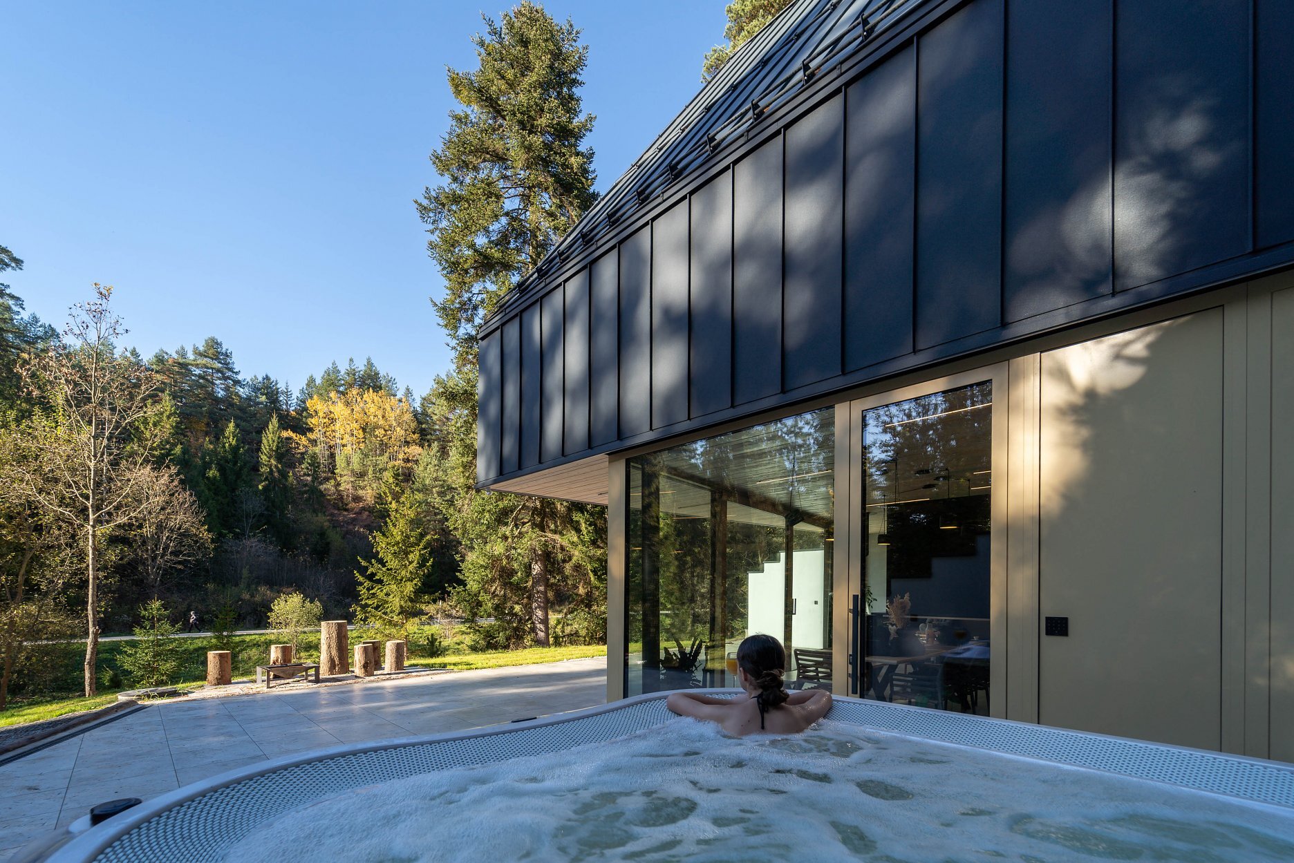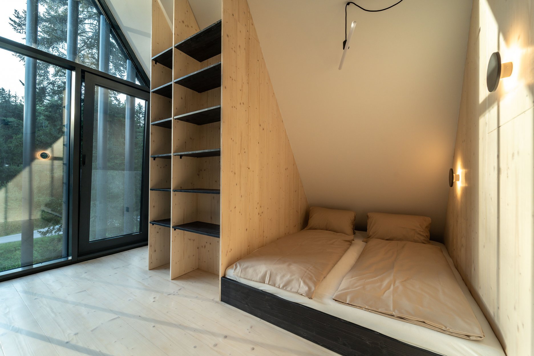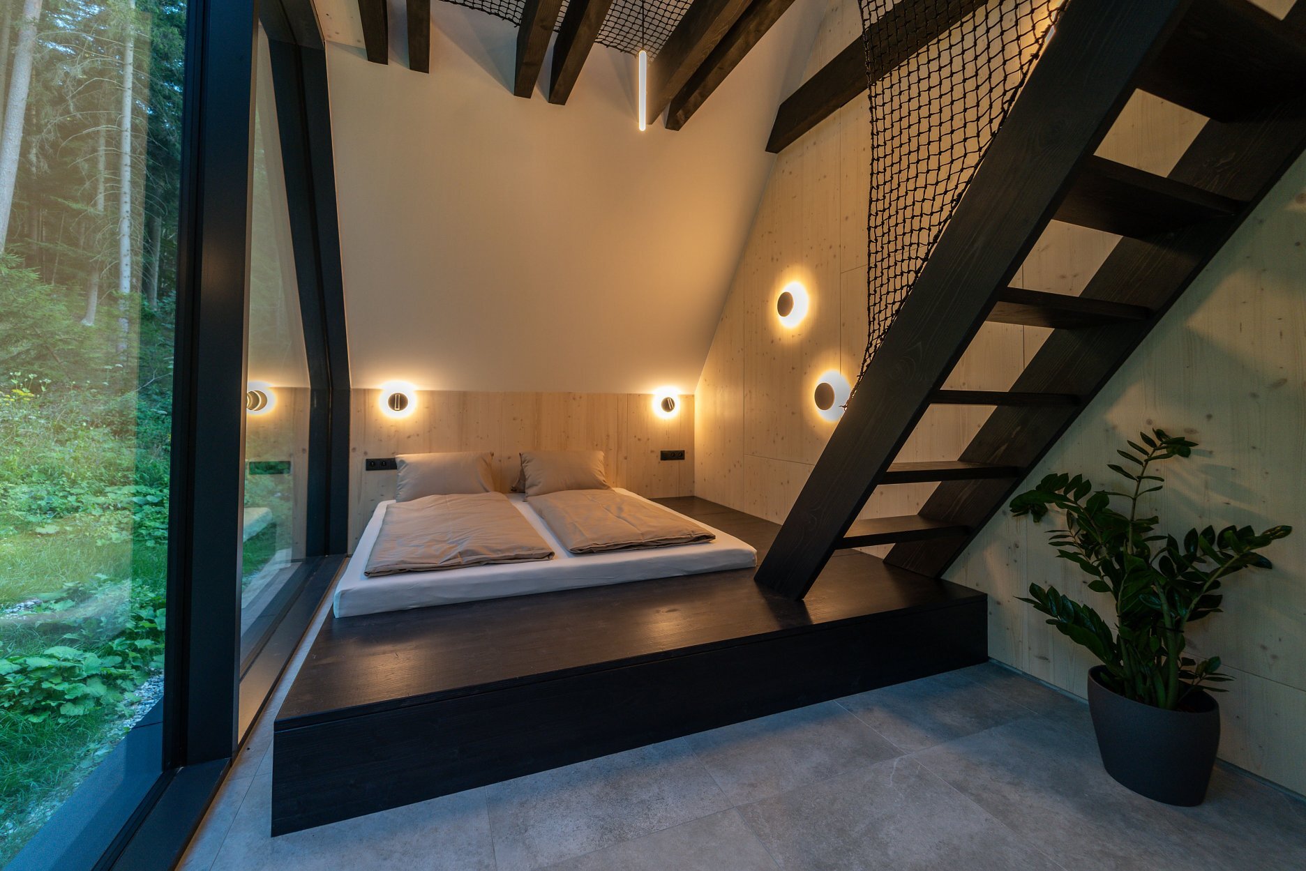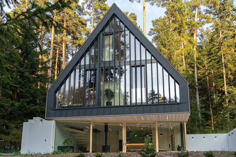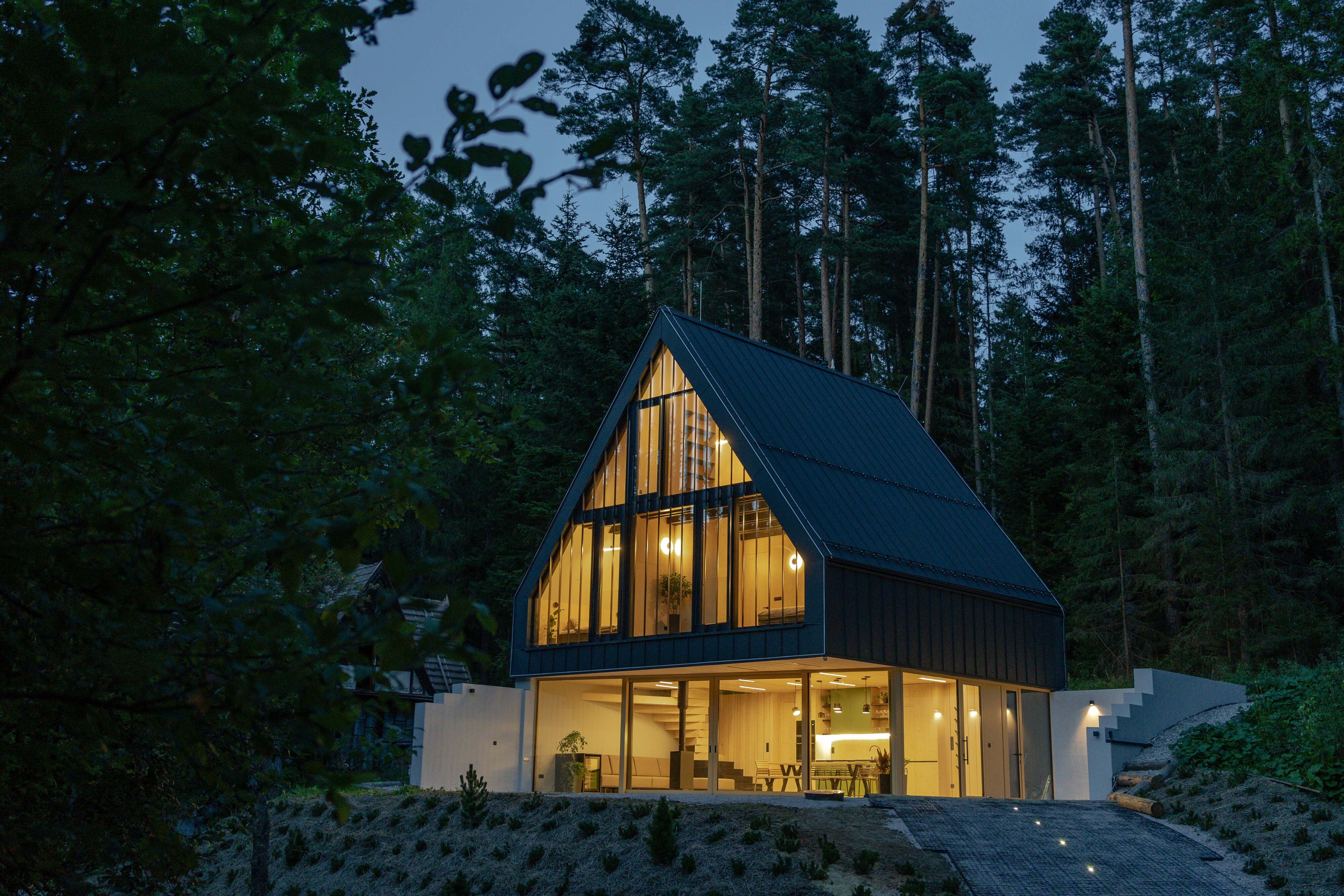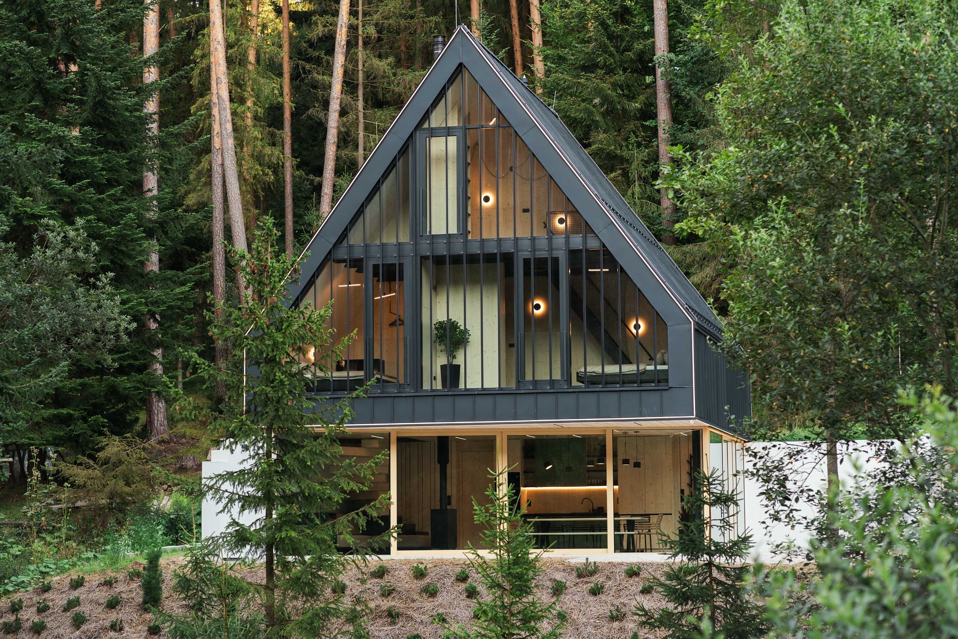 Rekreačná chata z dielne ateliéru LENarchitekti nahrádza pôvodný objekt na rovnakej parcele. Štvorcový pôdorys 10 × 10 m so sedlovou strechou ukrýva tri spálne, dennú halu s kuchyňou a wellness zónu; objekt je čiastočne zapustený do svahu a doplnený opornými múrmi. Murovaná konštrukcia s plechovou krytinou a celopresklenými štítmi spája osvedčené technológie s moderným výrazom.
