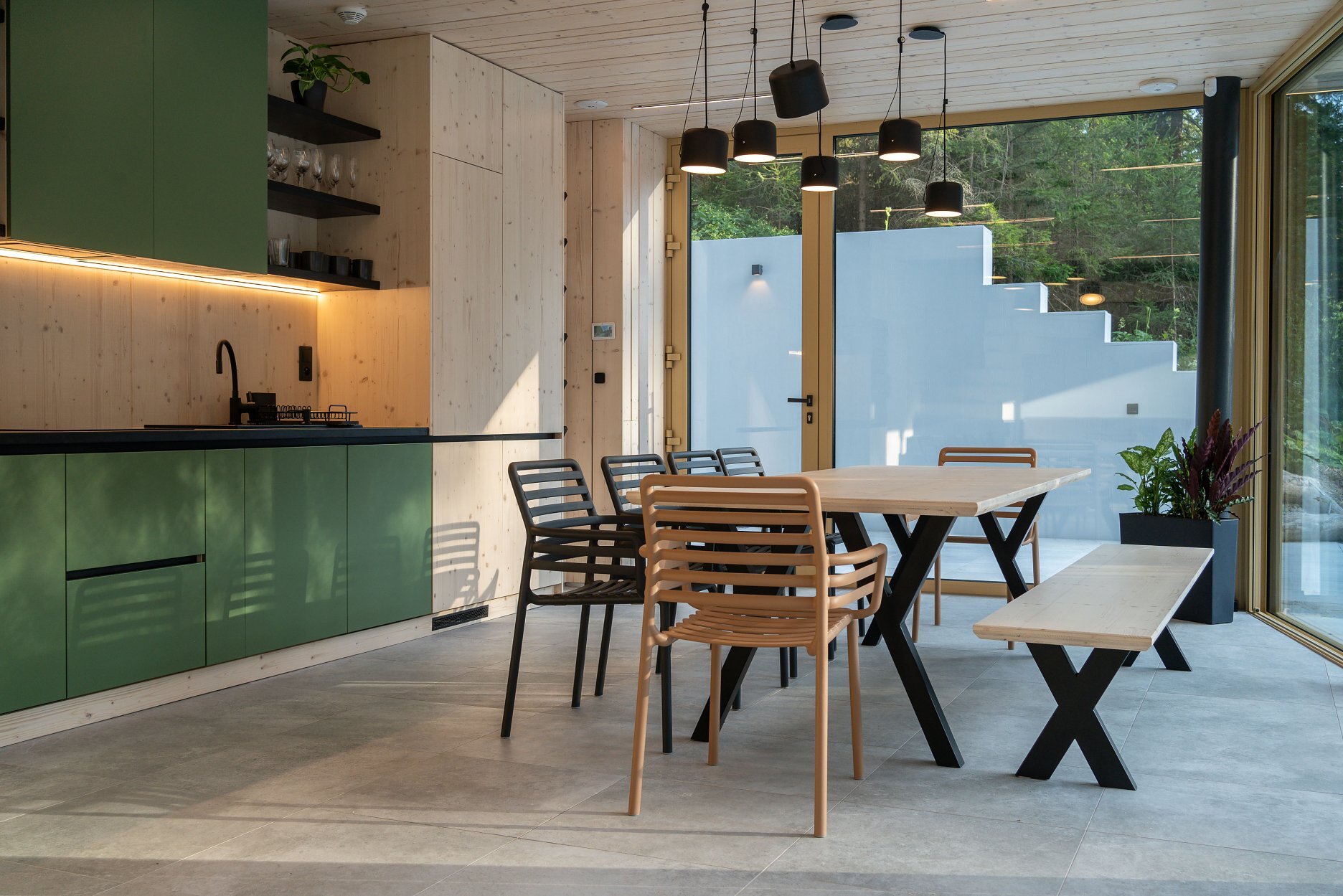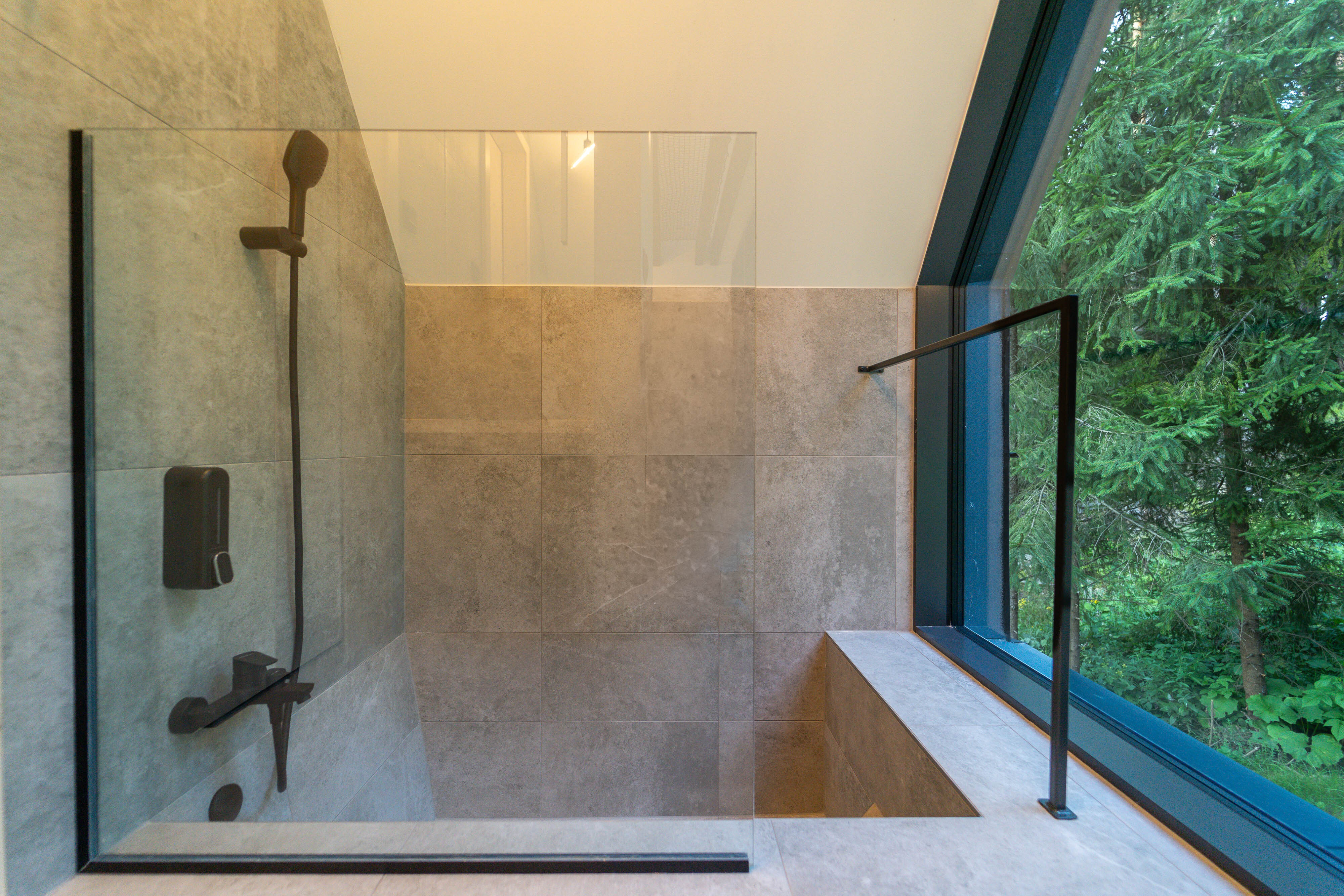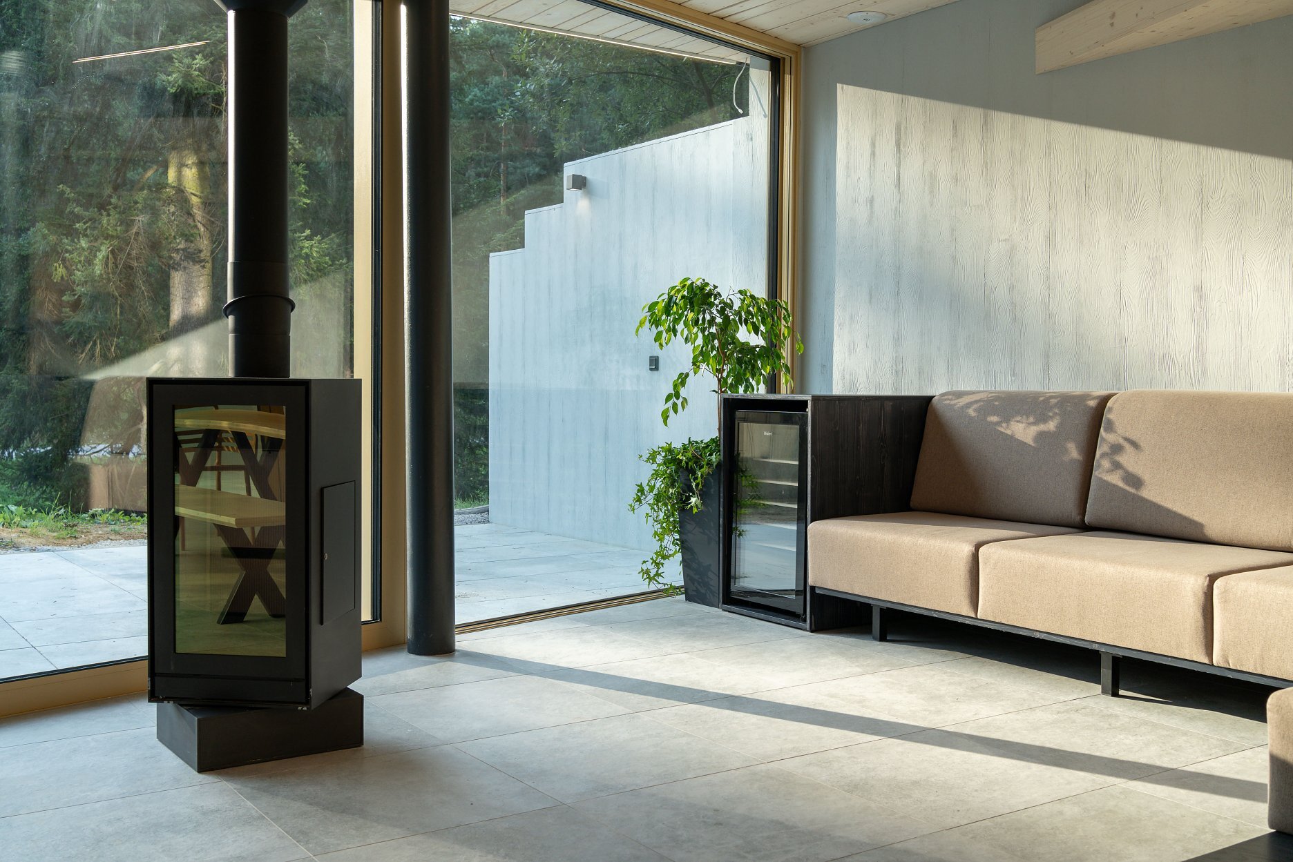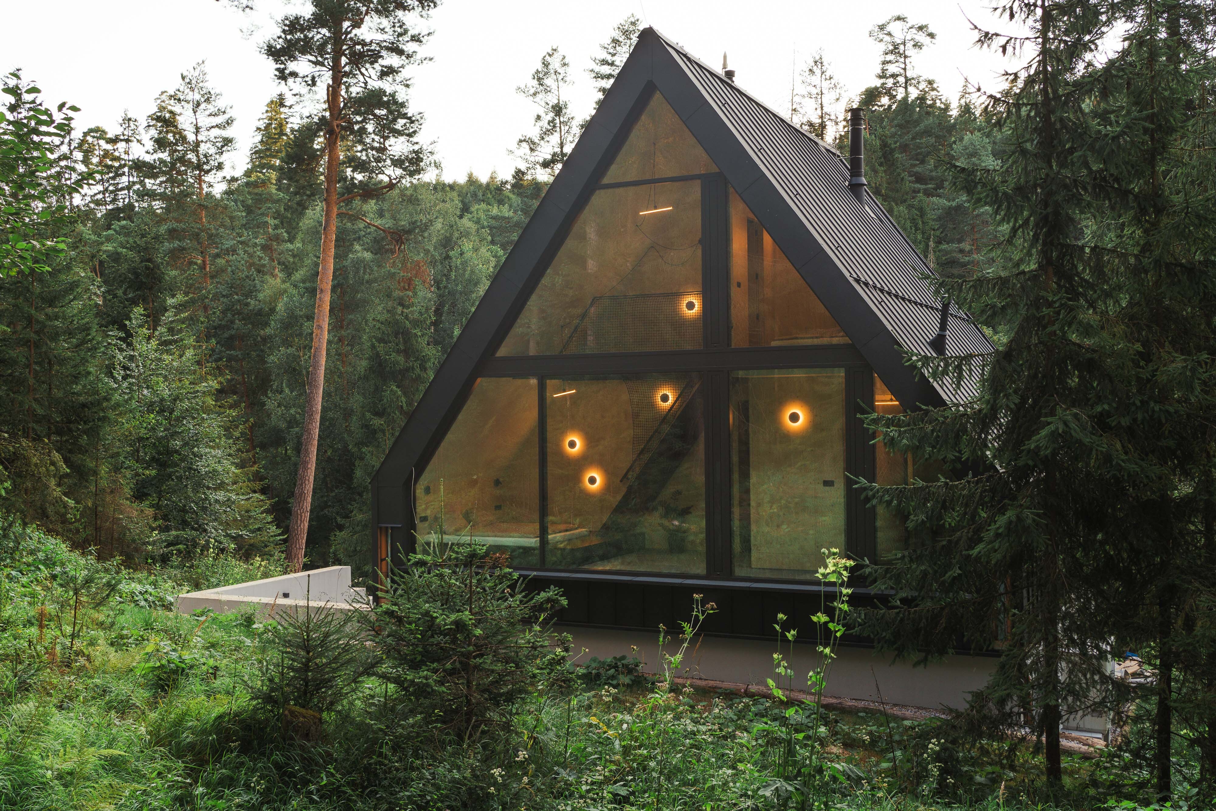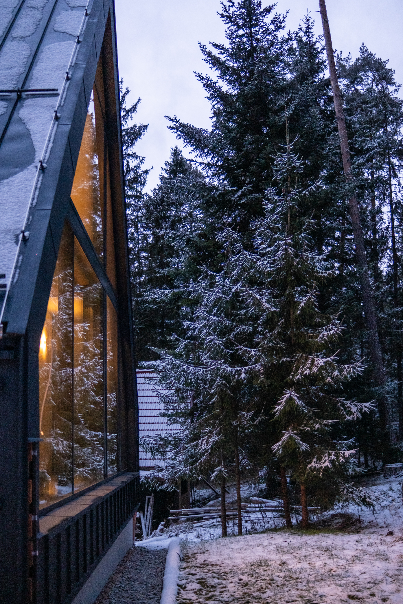 Rekreačná chata z dielne ateliéru LENarchitekti nahrádza pôvodný objekt na rovnakej parcele. Štvorcový pôdorys 10 × 10 m so sedlovou strechou ukrýva tri spálne, dennú halu s kuchyňou a wellness zónu; objekt je čiastočne zapustený do svahu a doplnený opornými múrmi. Murovaná konštrukcia s plechovou krytinou a celopresklenými štítmi spája osvedčené technológie s moderným výrazom.