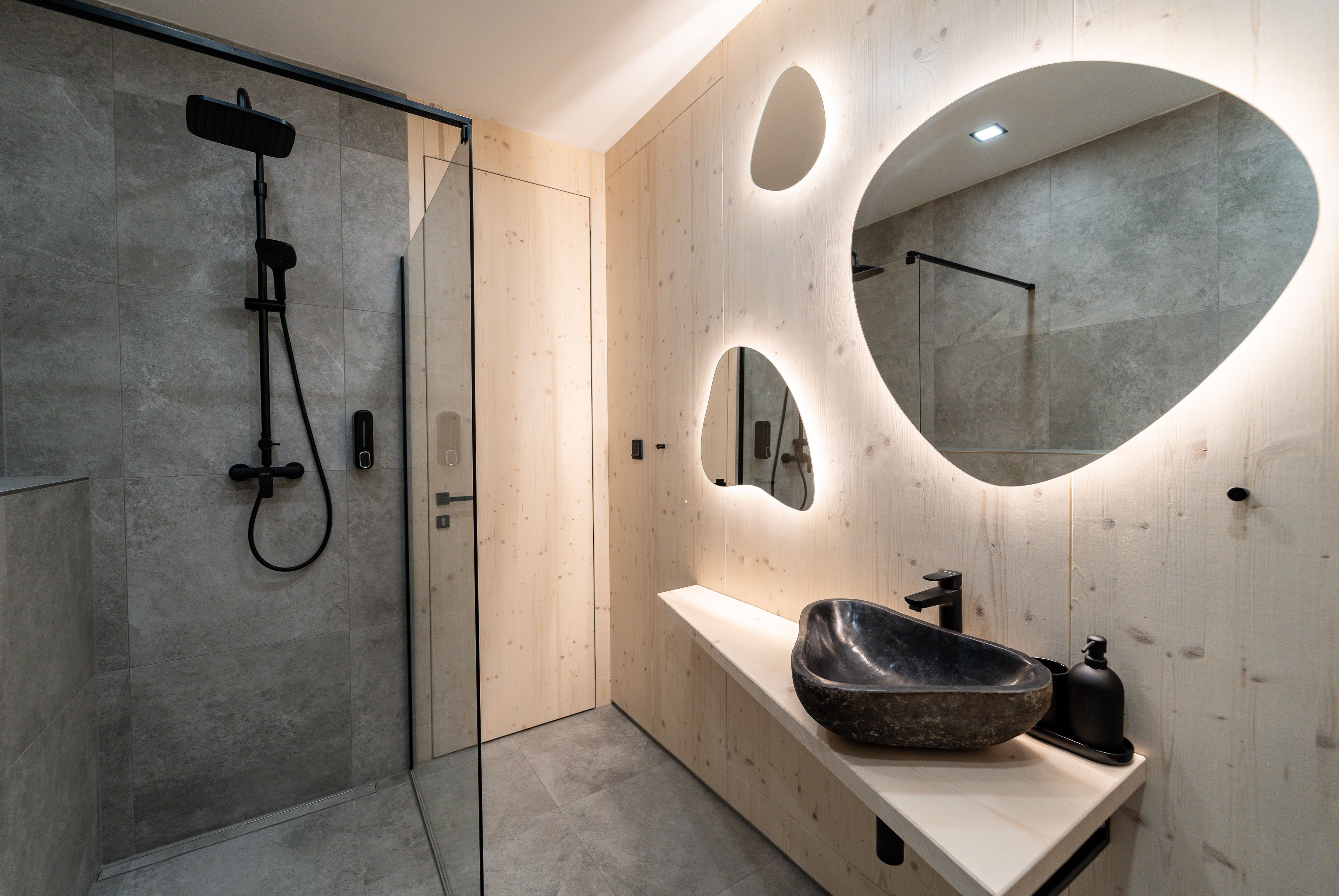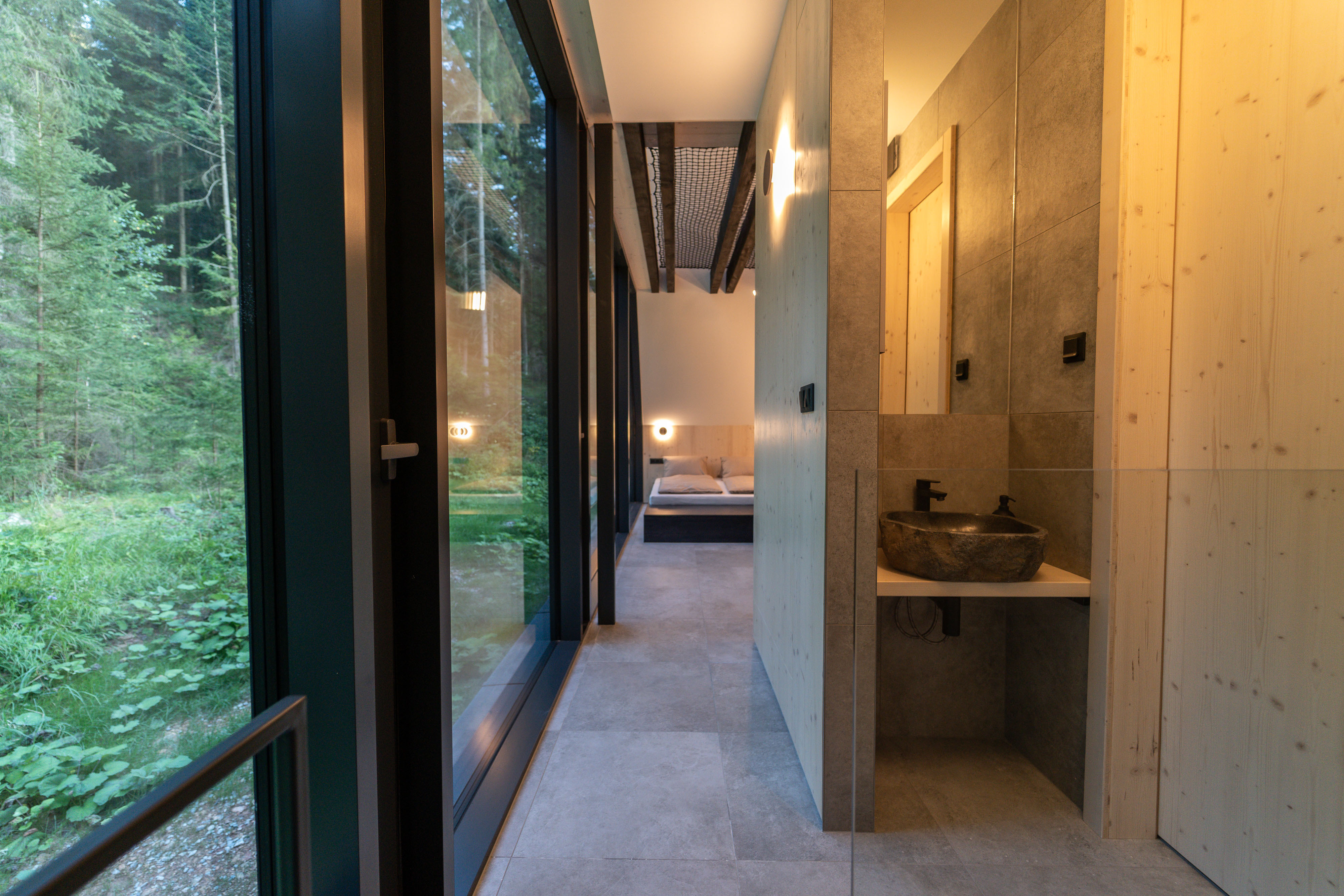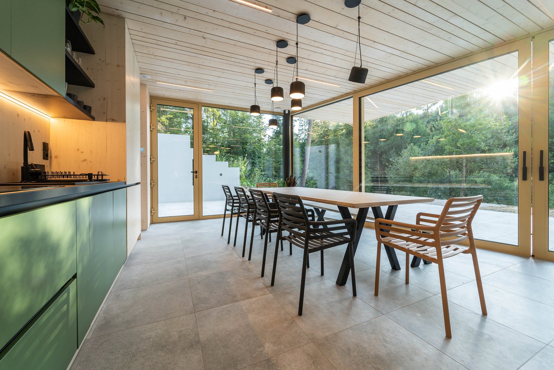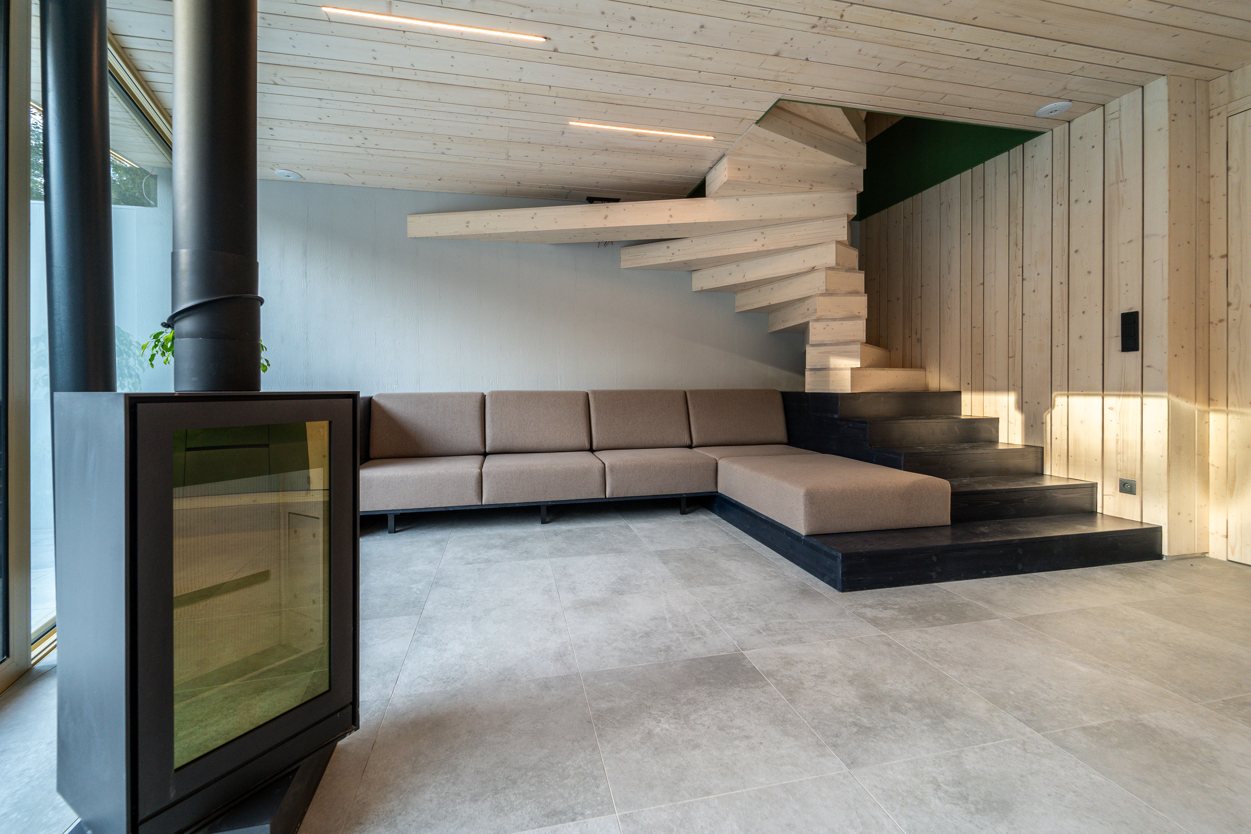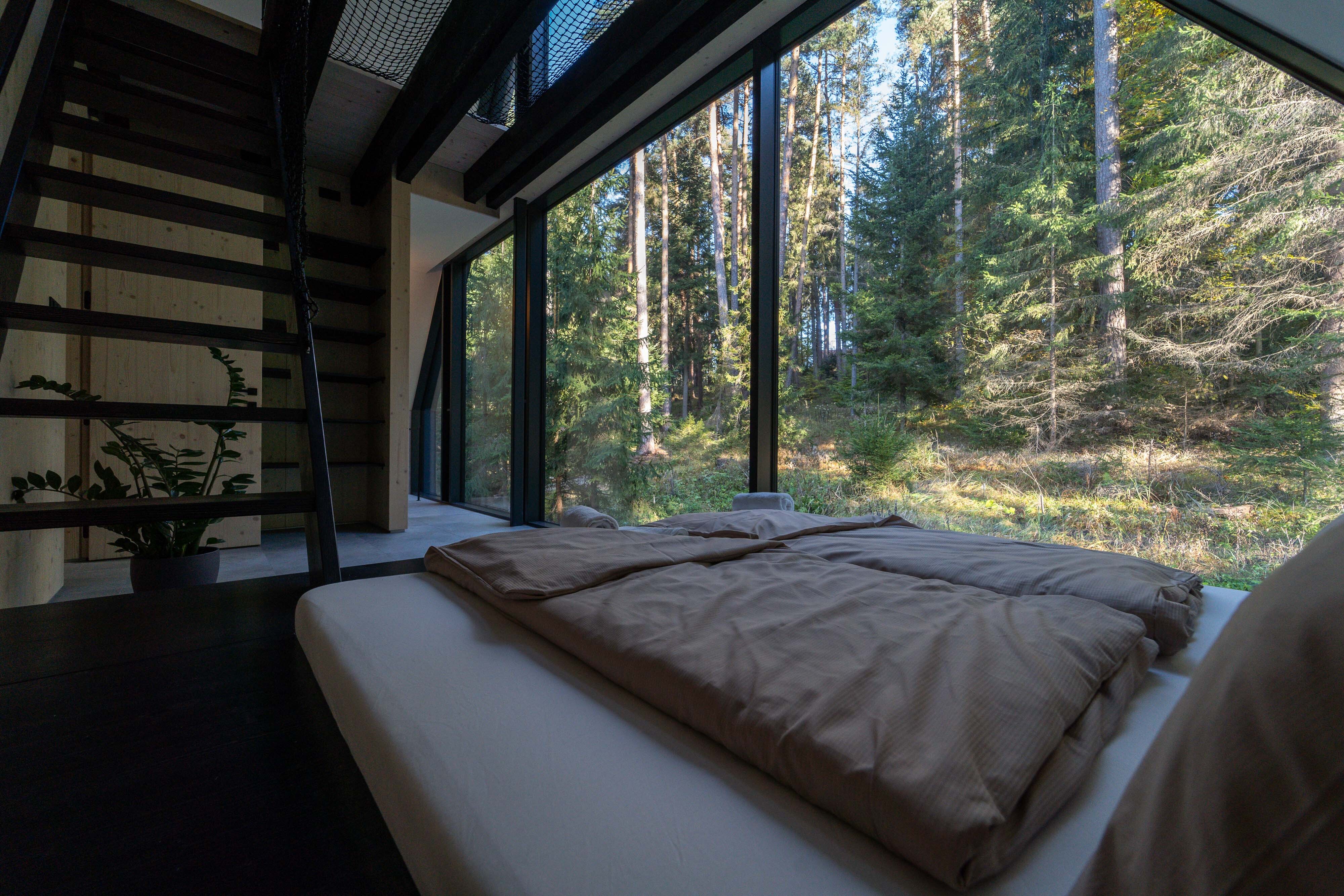 Rekreačná chata z dielne ateliéru LENarchitekti nahrádza pôvodný objekt na rovnakej parcele. Štvorcový pôdorys 10 × 10 m so sedlovou strechou ukrýva tri spálne, dennú halu s kuchyňou a wellness zónu; objekt je čiastočne zapustený do svahu a doplnený opornými múrmi. Murovaná konštrukcia s plechovou krytinou a celopresklenými štítmi spája osvedčené technológie s moderným výrazom.
