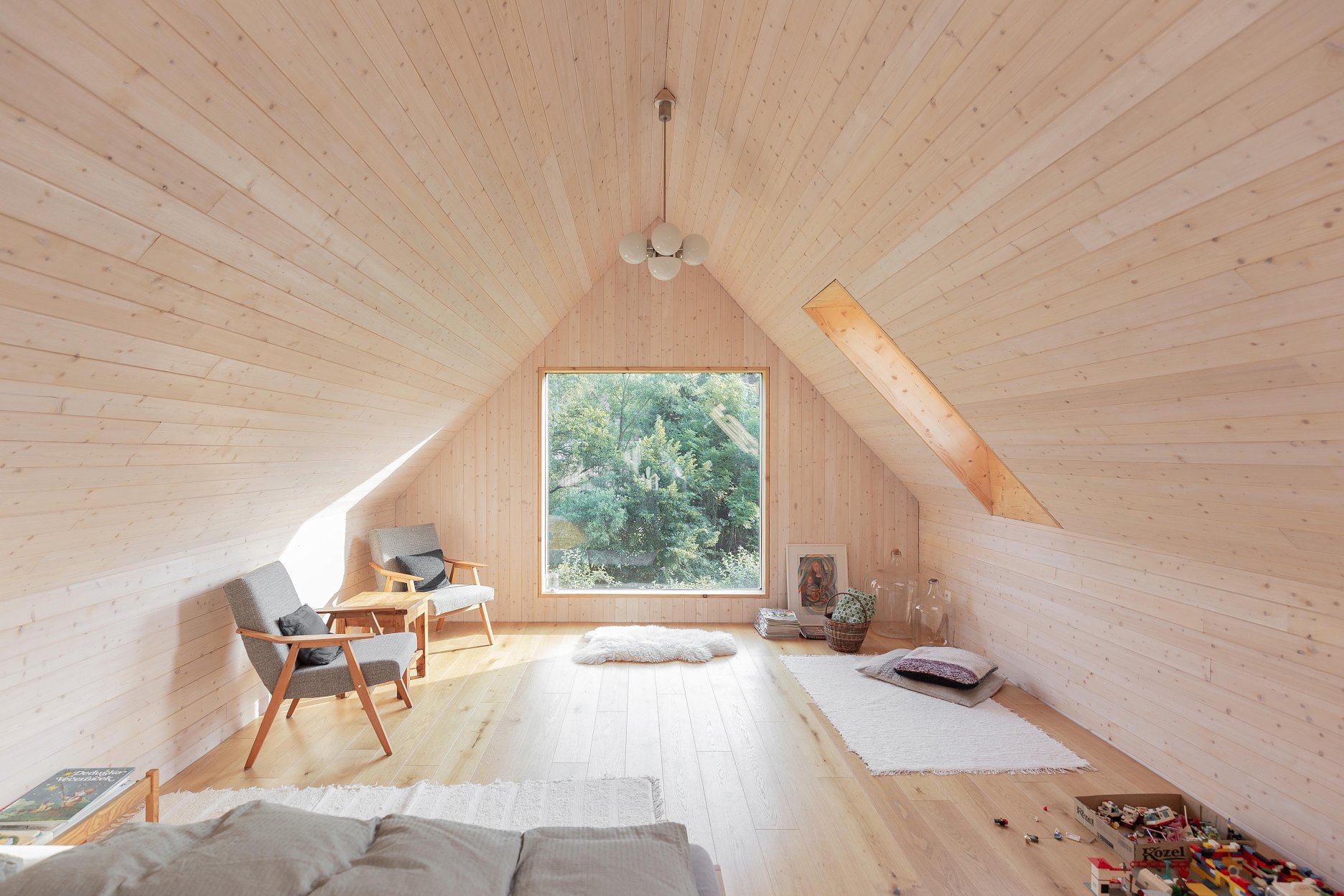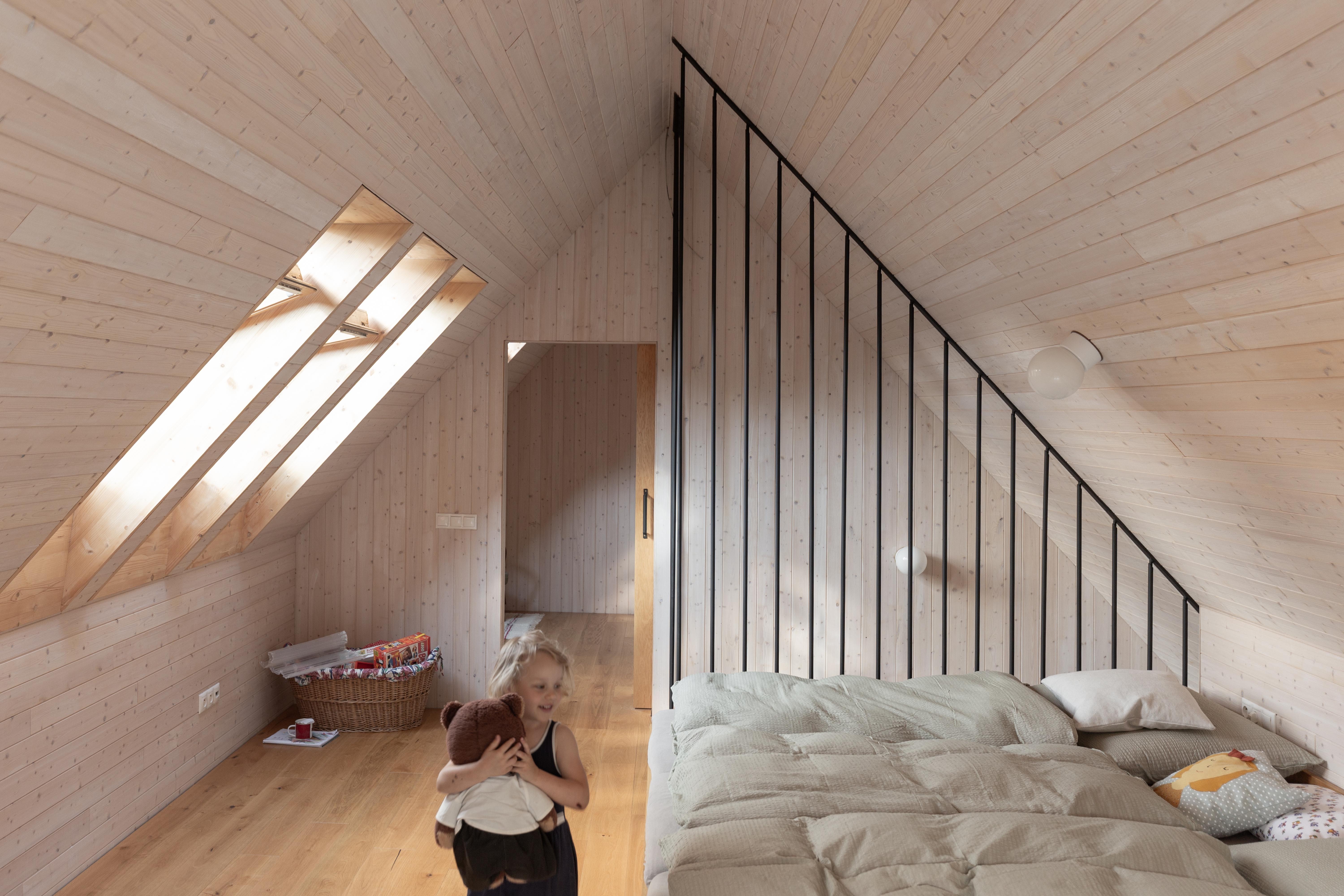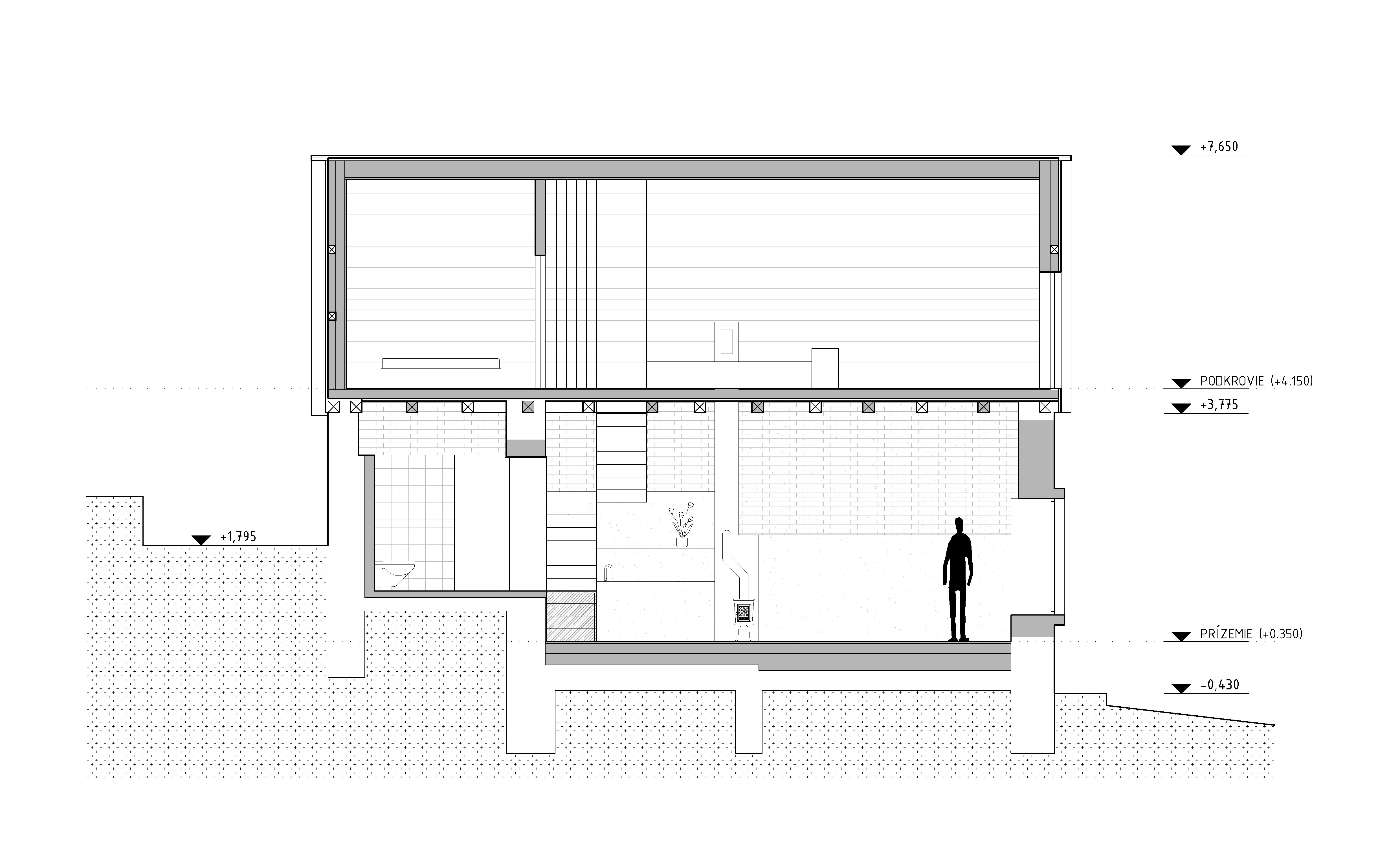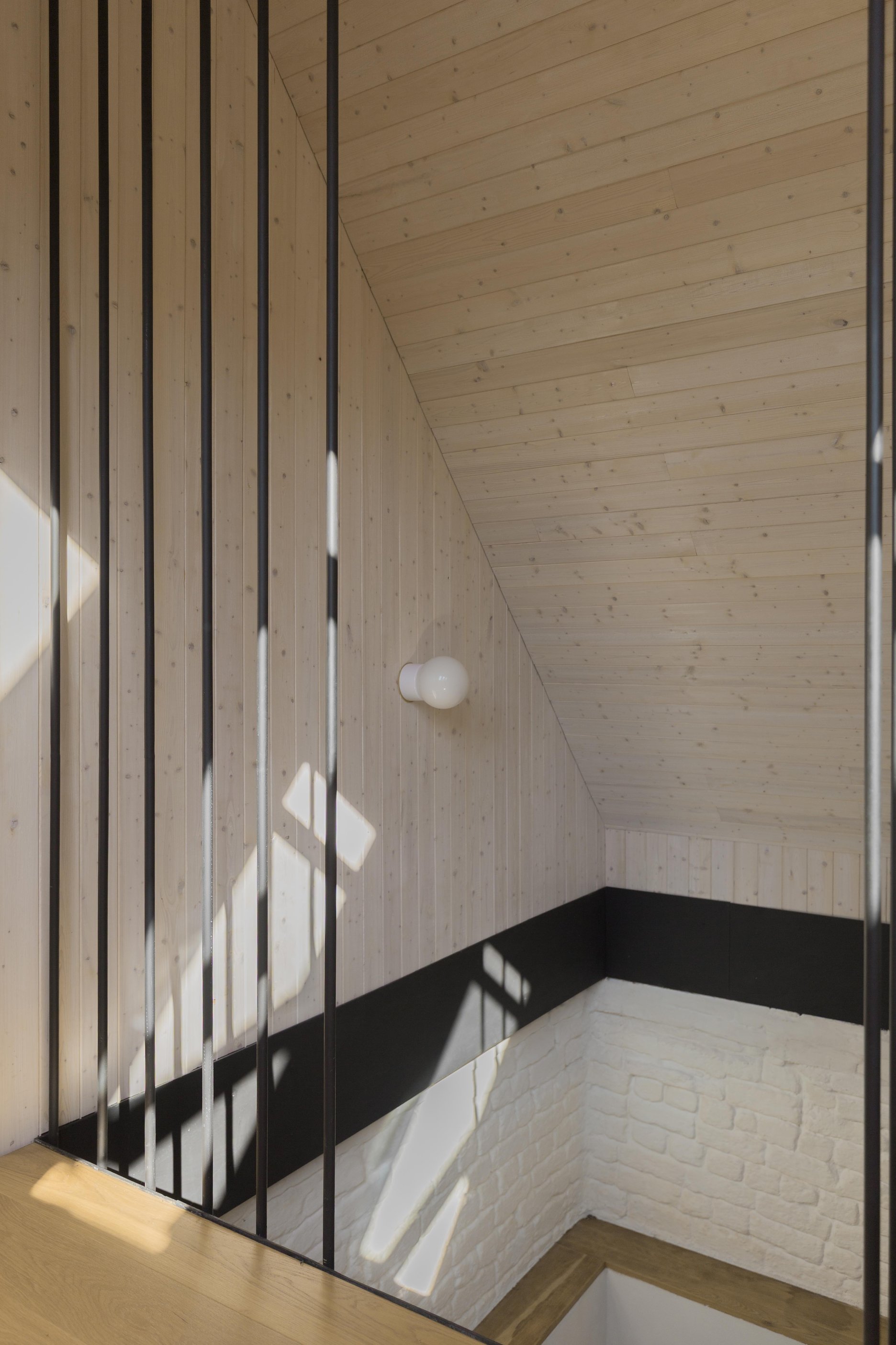 Hlavným východiskom bolo ponechať pôvodnú figúru stavby, pričom úpravy mali byť navrhnuté tak, aby reflektovali potreby súčasného komfortného bývania. Výzvou bolo prepojenie jednotlivých interiérových priestorov s rôznou úrovňou podlahy. Navrhnuté bolo schodisko s medzipodestou pre vstup do kúpelne a následne oceľovým zavesených ramenom prechádzajúcim do nového podkrovia.