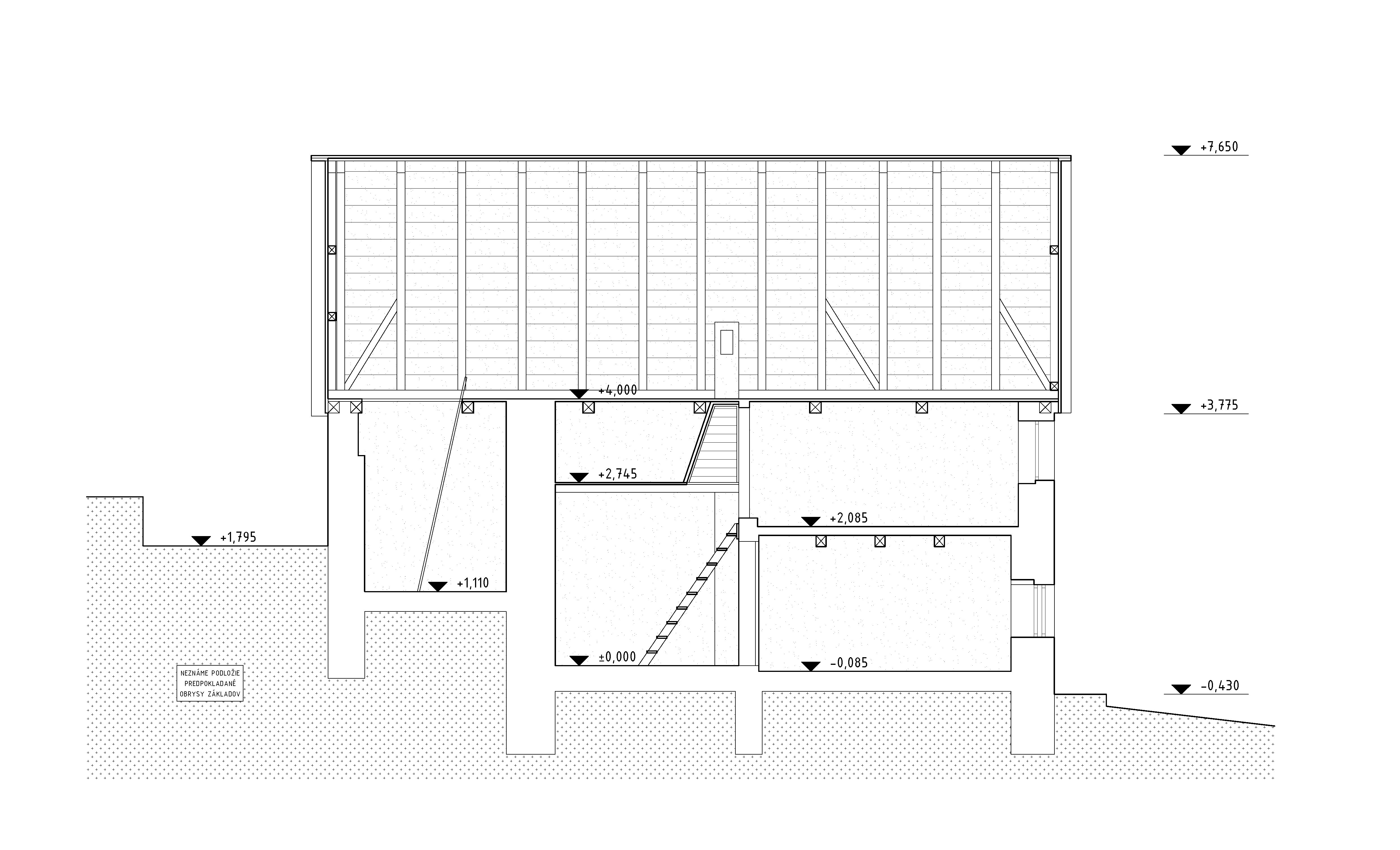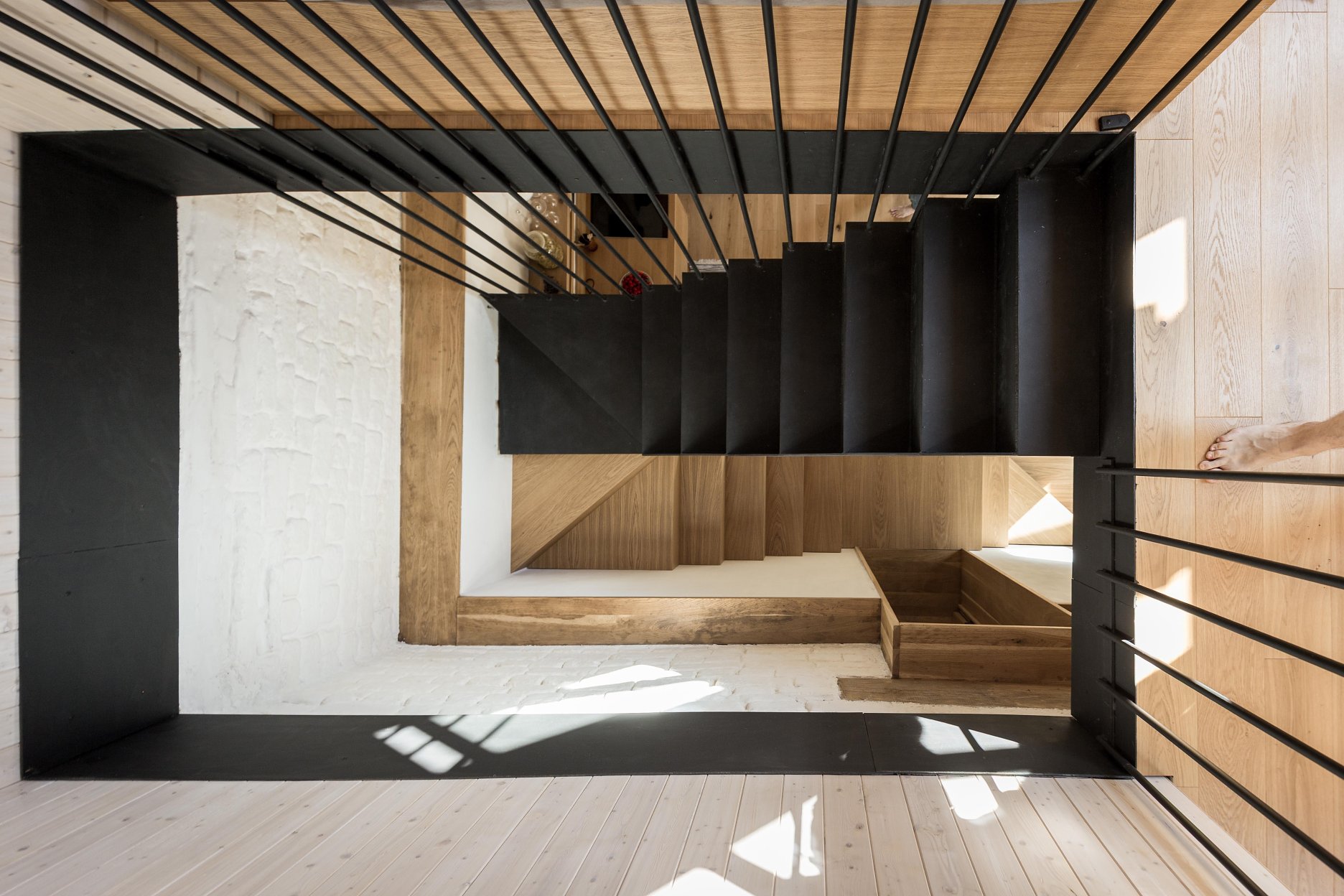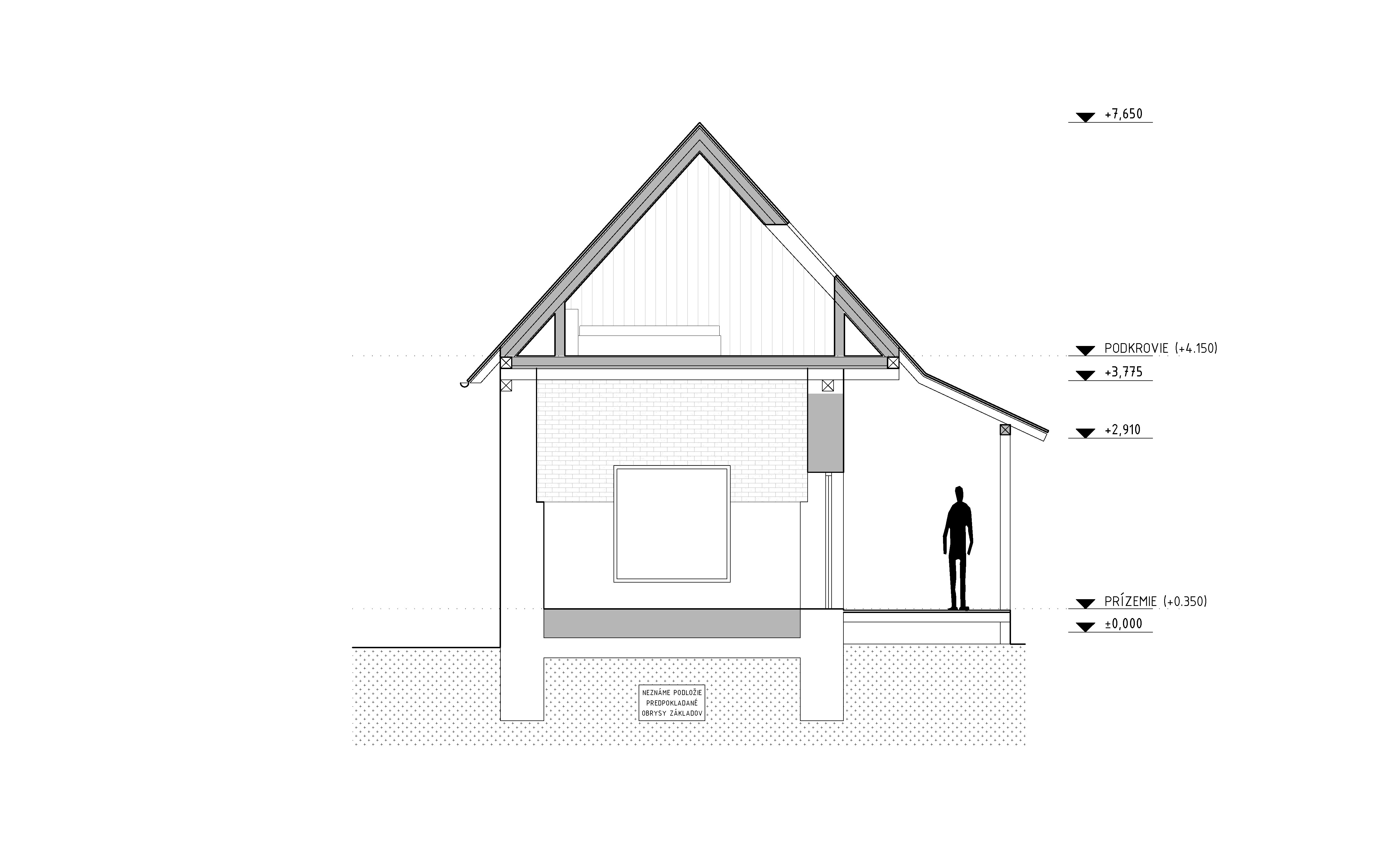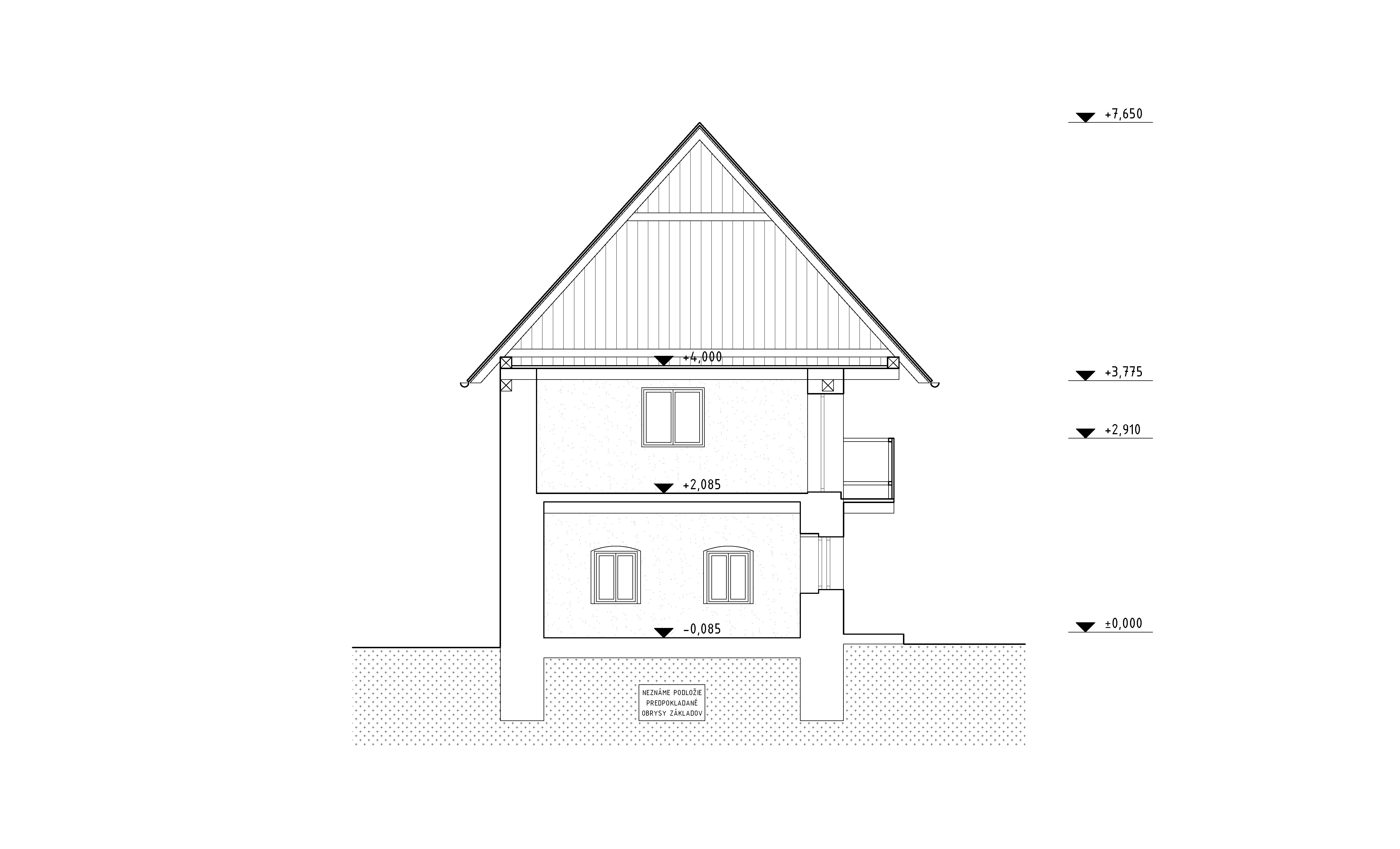 Hlavným východiskom bolo ponechať pôvodnú figúru stavby, pričom úpravy mali byť navrhnuté tak, aby reflektovali potreby súčasného komfortného bývania. Výzvou bolo prepojenie jednotlivých interiérových priestorov s rôznou úrovňou podlahy. Navrhnuté bolo schodisko s medzipodestou pre vstup do kúpelne a následne oceľovým zavesených ramenom prechádzajúcim do nového podkrovia.