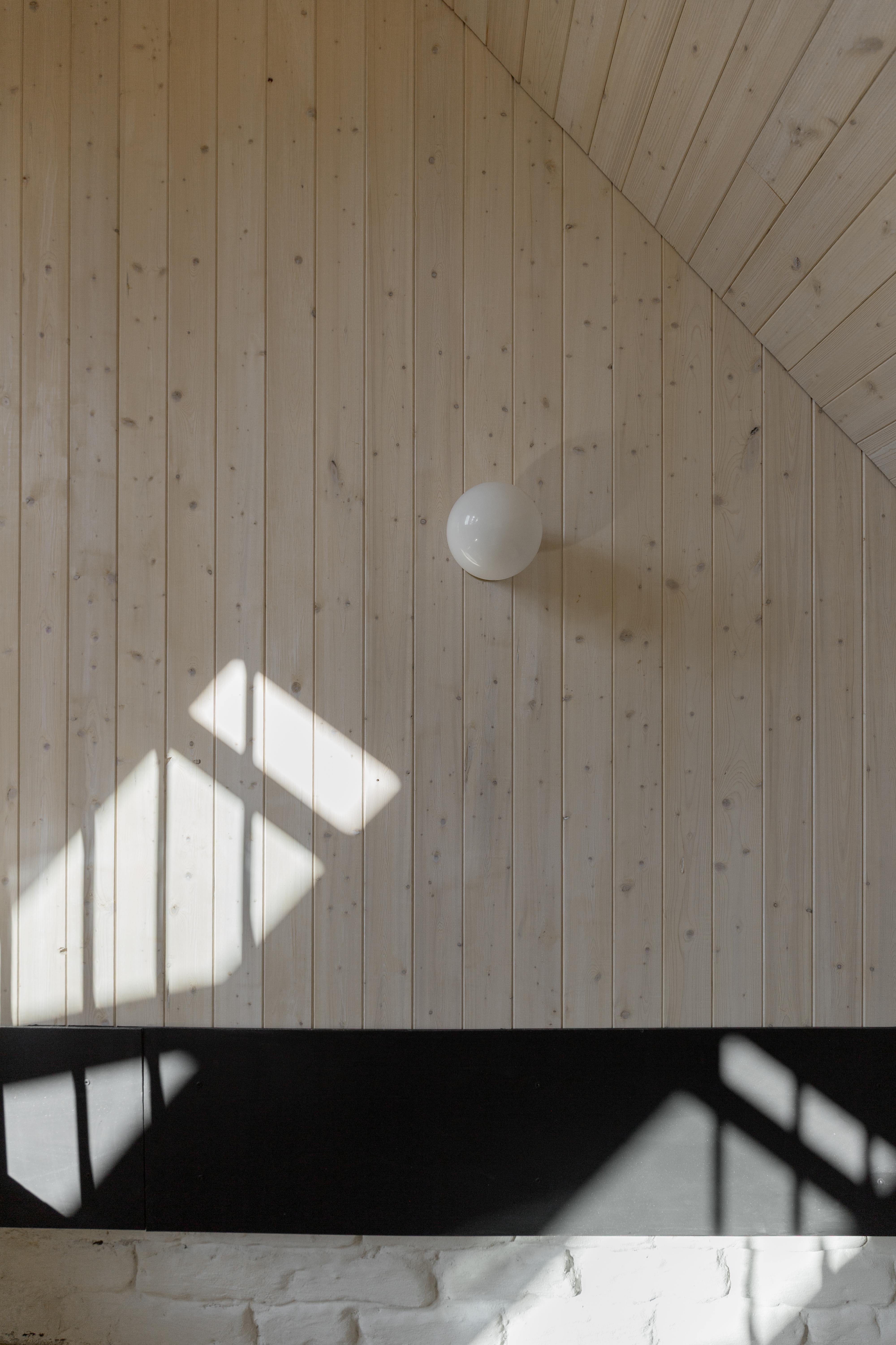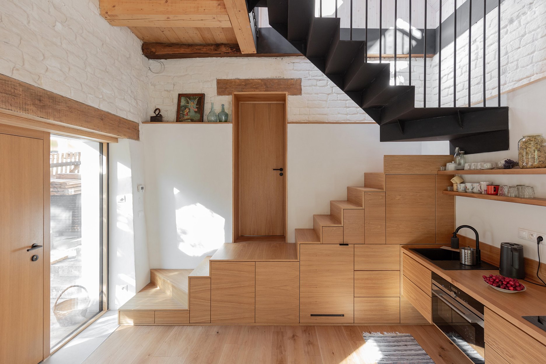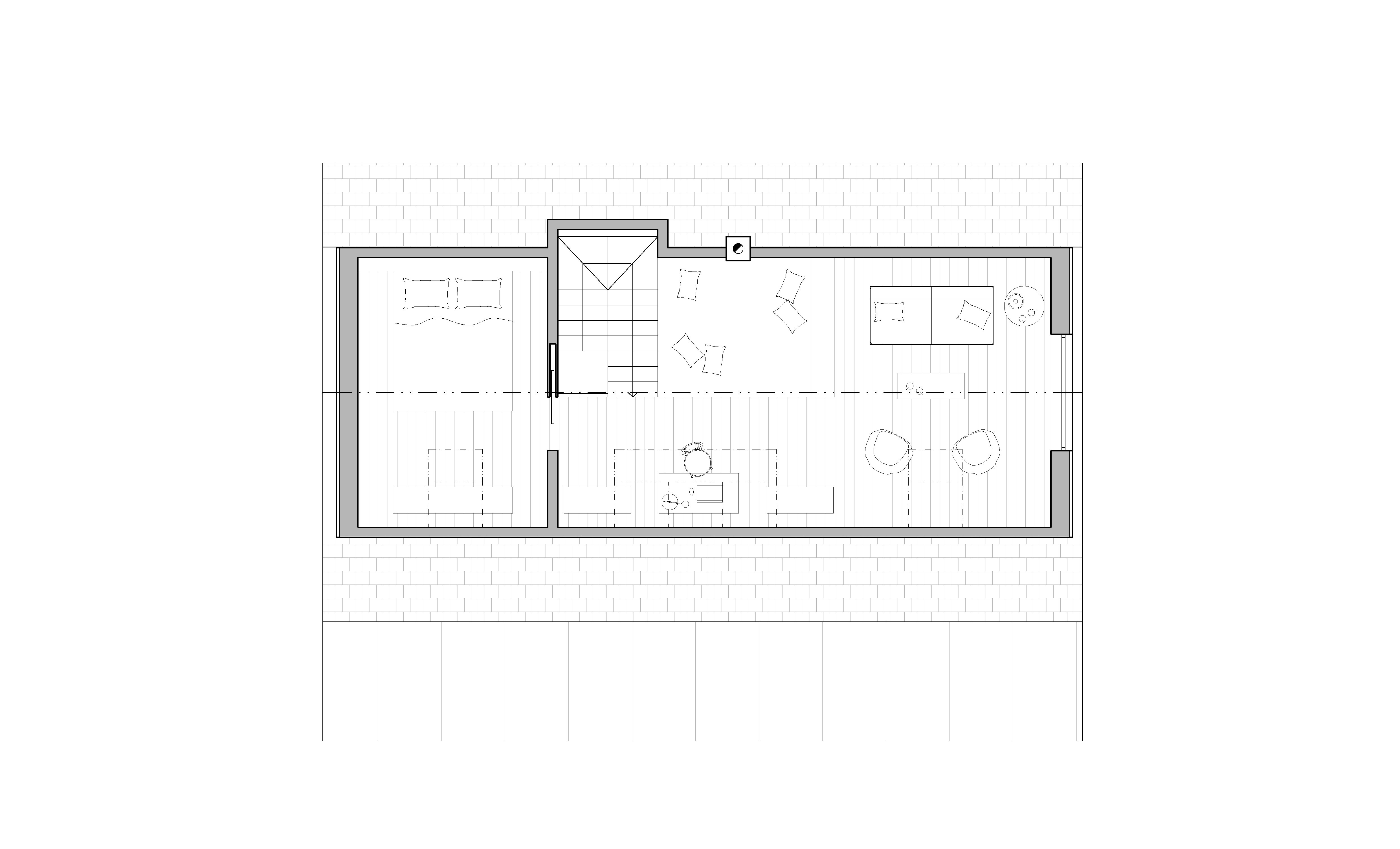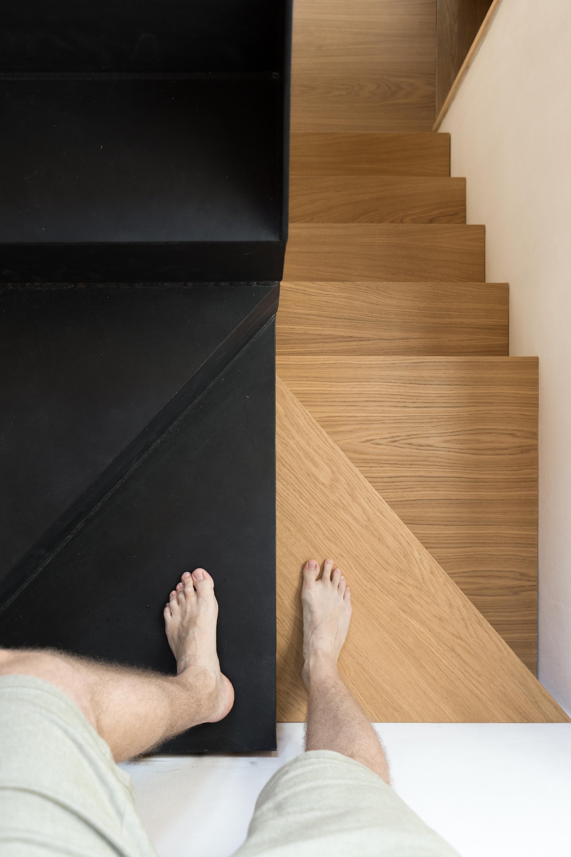 Hlavným východiskom bolo ponechať pôvodnú figúru stavby, pričom úpravy mali byť navrhnuté tak, aby reflektovali potreby súčasného komfortného bývania. Výzvou bolo prepojenie jednotlivých interiérových priestorov s rôznou úrovňou podlahy. Navrhnuté bolo schodisko s medzipodestou pre vstup do kúpelne a následne oceľovým zavesených ramenom prechádzajúcim do nového podkrovia.
