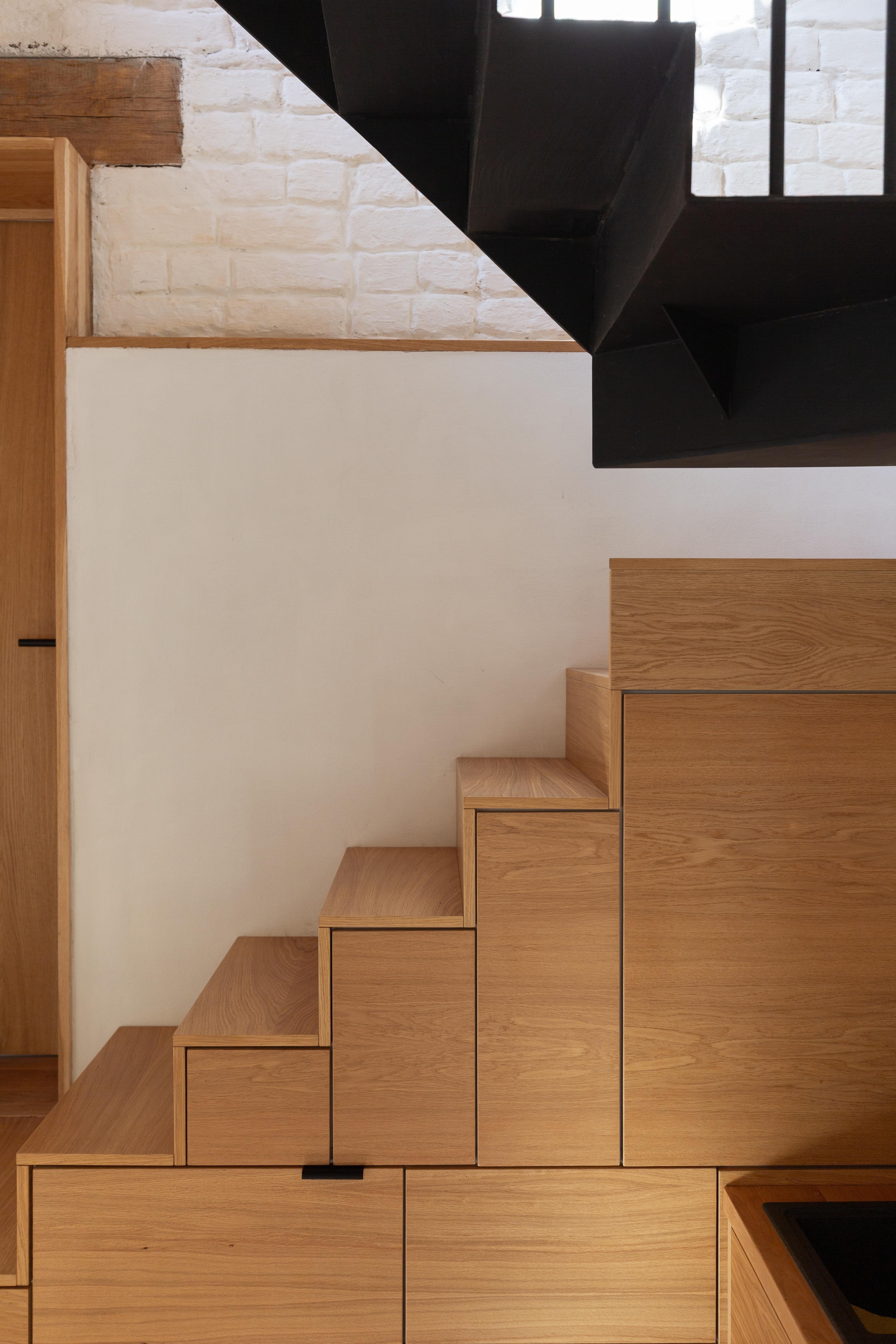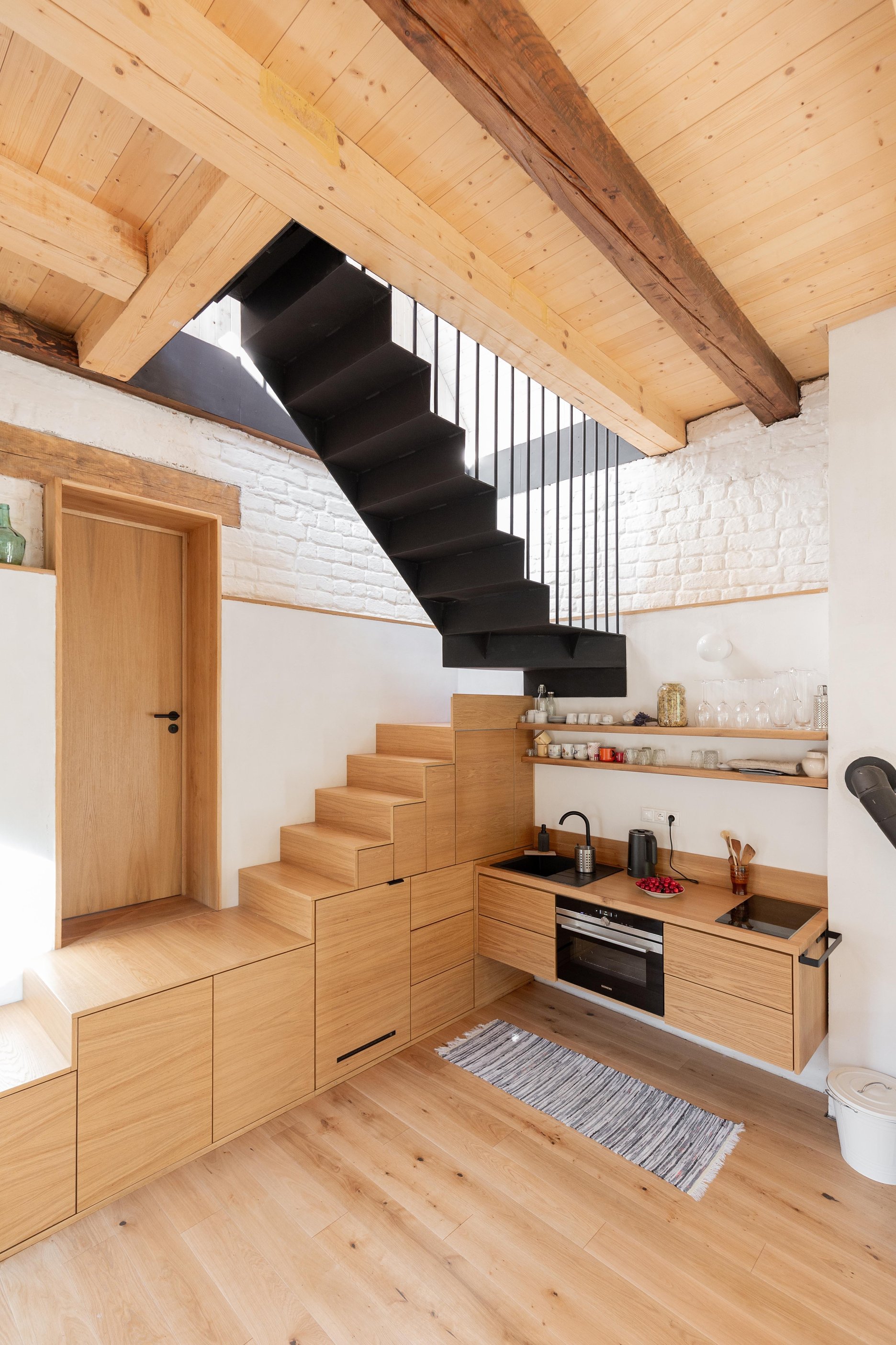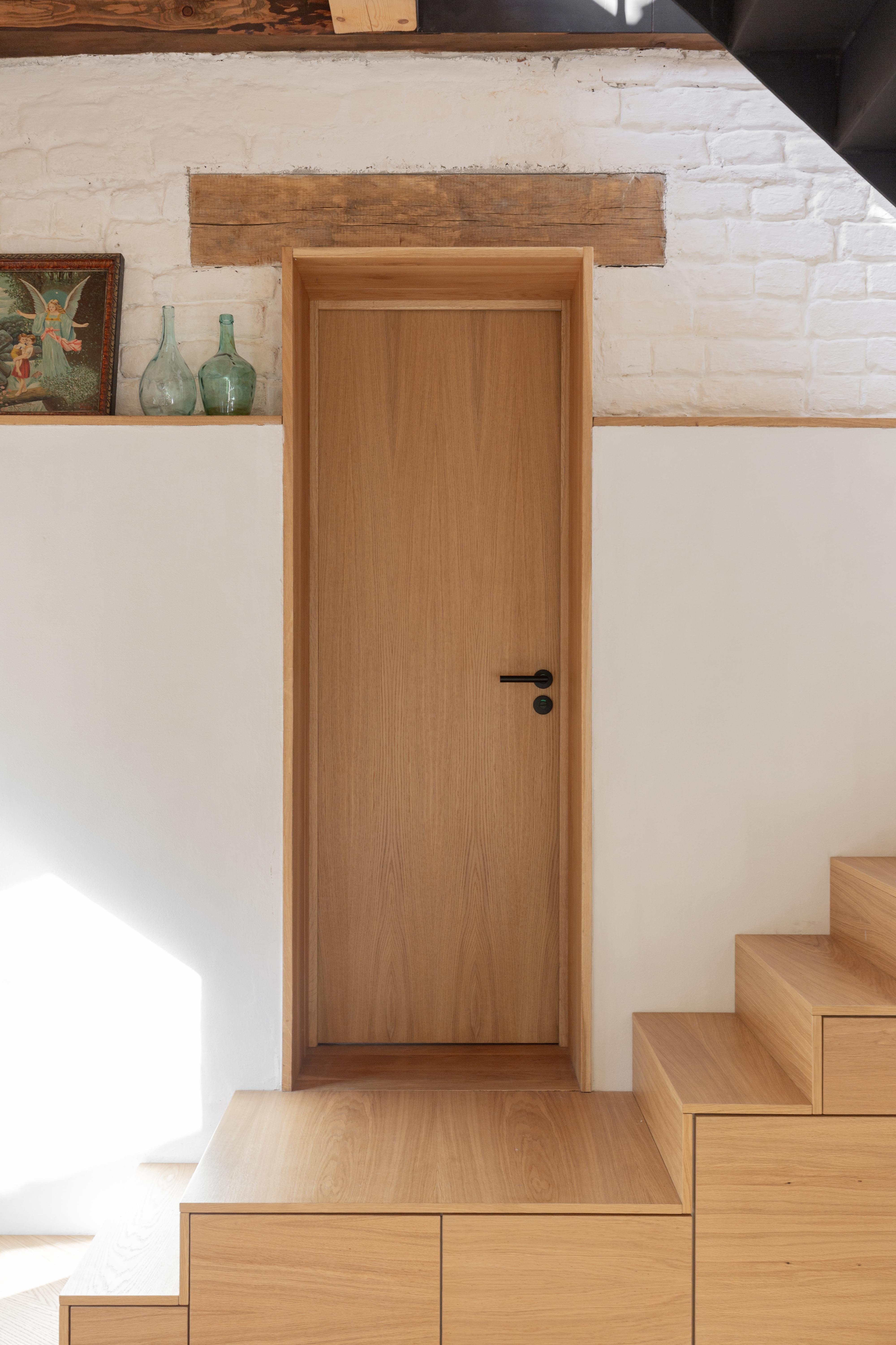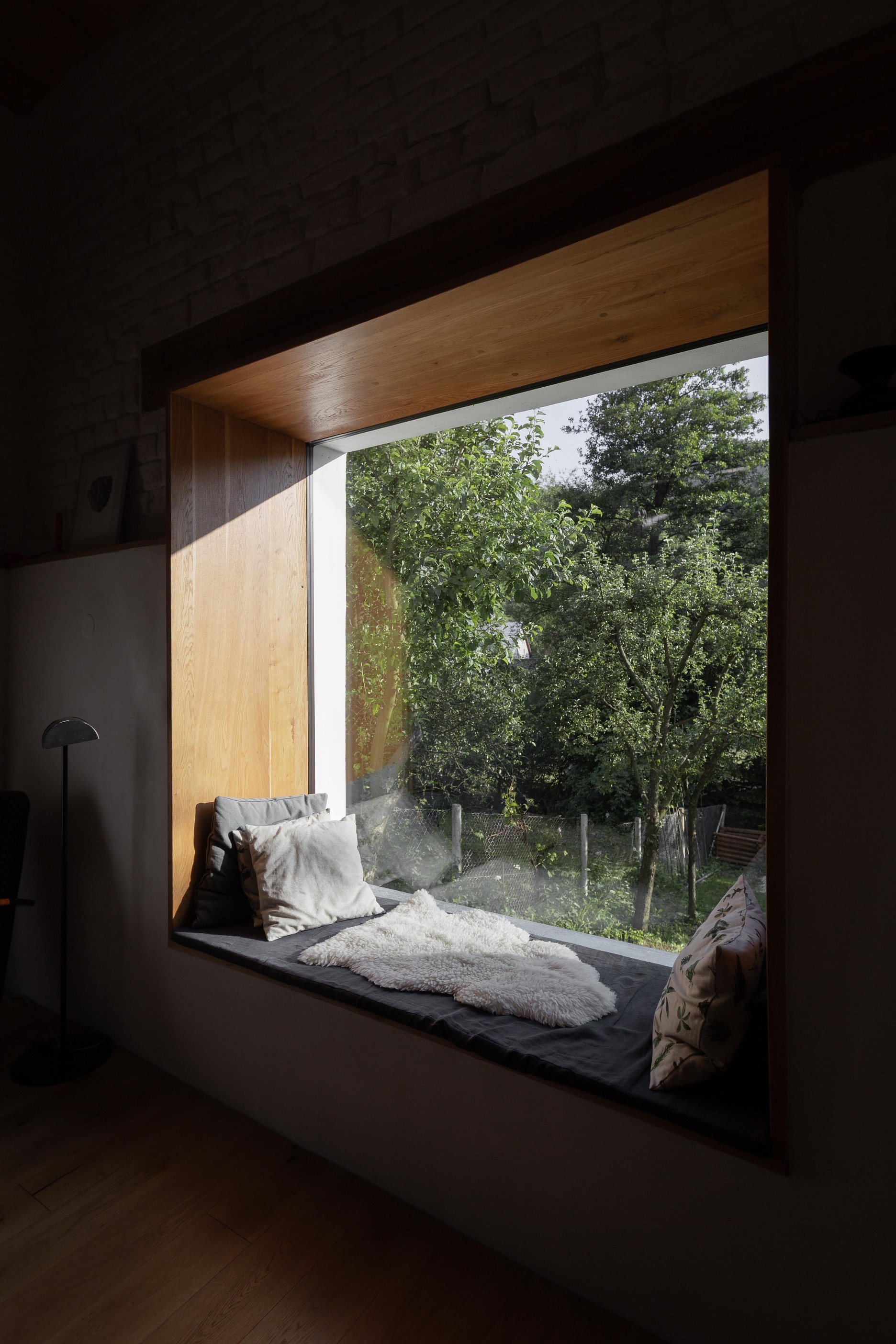 Hlavným východiskom bolo ponechať pôvodnú figúru stavby, pričom úpravy mali byť navrhnuté tak, aby reflektovali potreby súčasného komfortného bývania. Výzvou bolo prepojenie jednotlivých interiérových priestorov s rôznou úrovňou podlahy. Navrhnuté bolo schodisko s medzipodestou pre vstup do kúpelne a následne oceľovým zavesených ramenom prechádzajúcim do nového podkrovia.