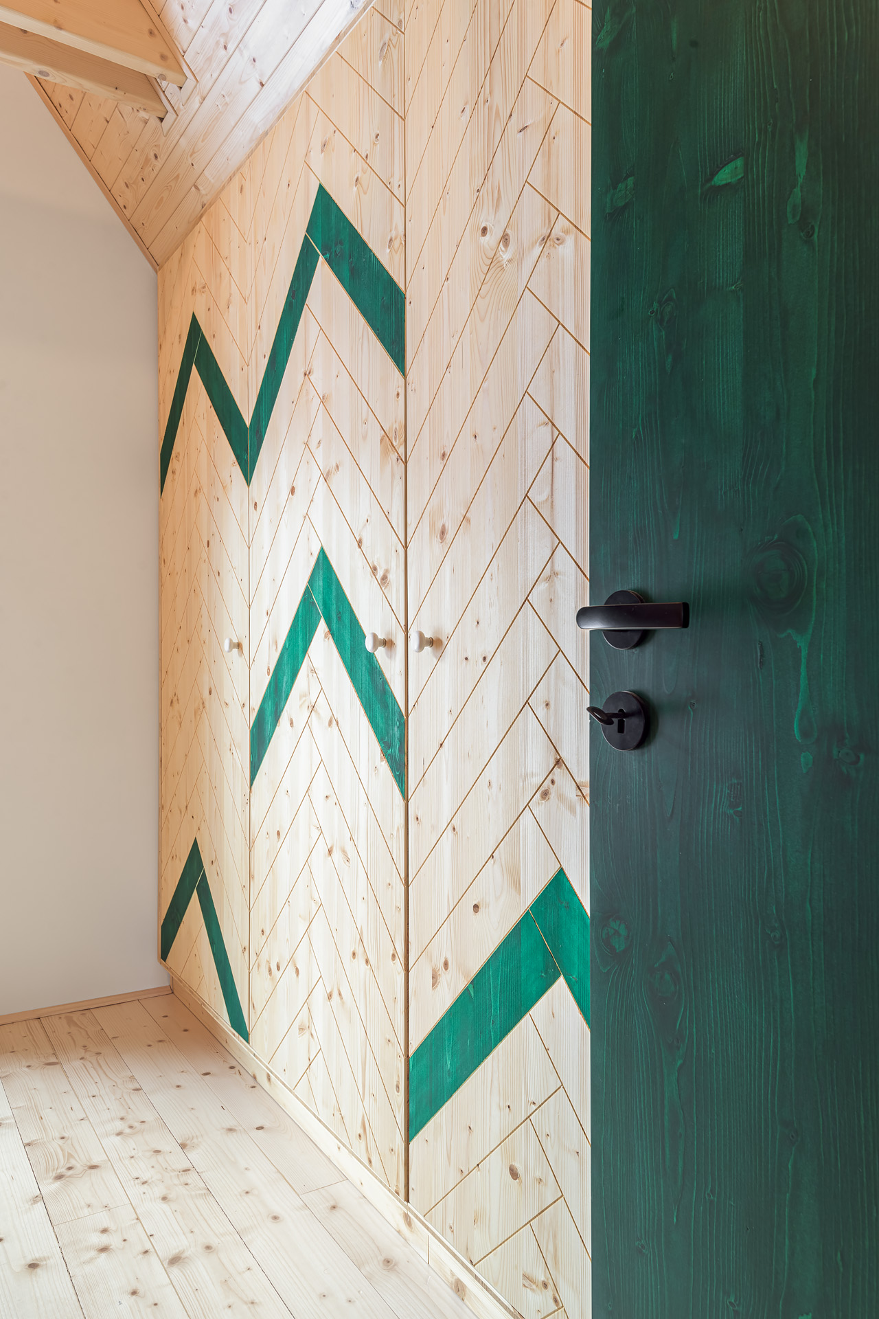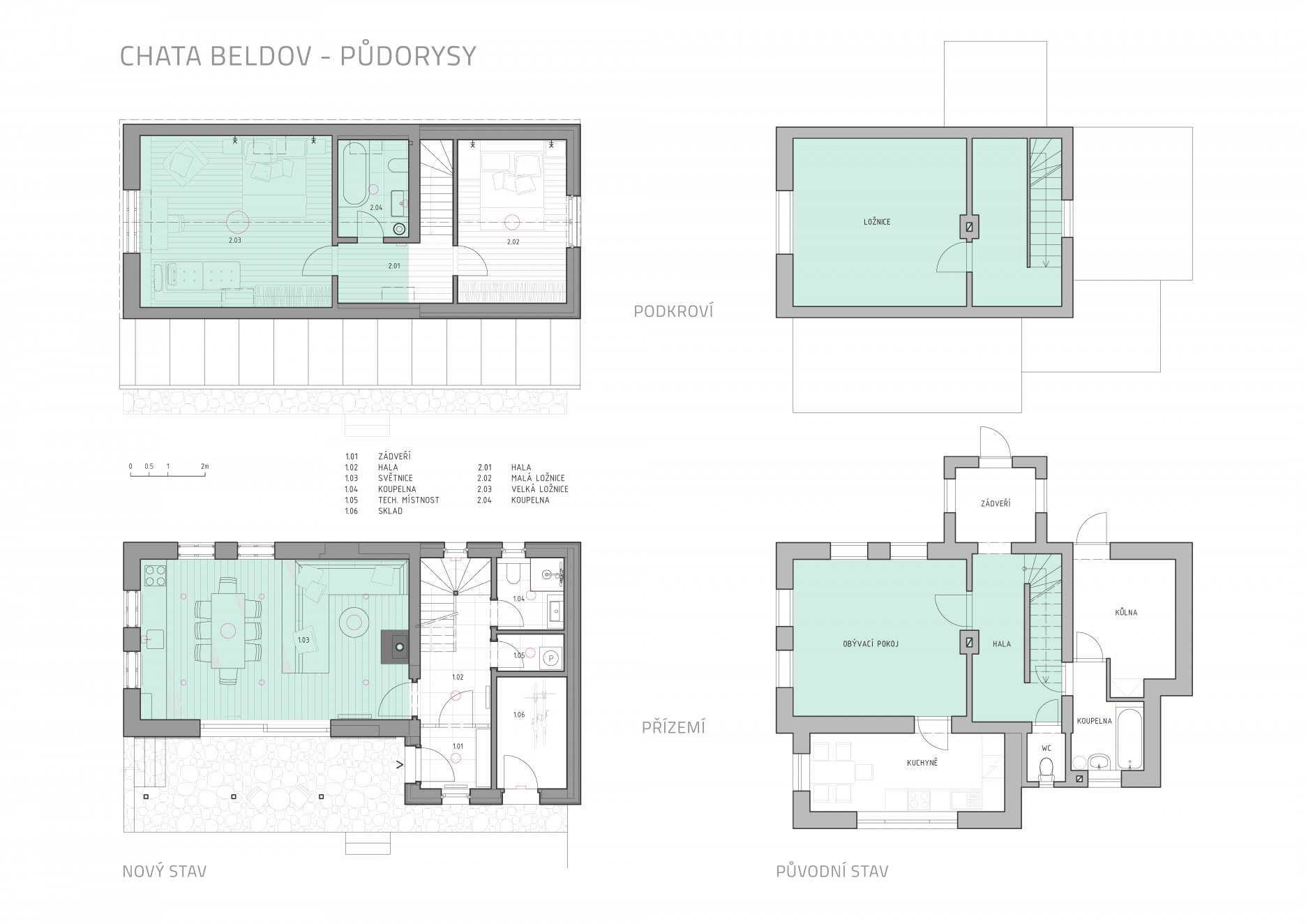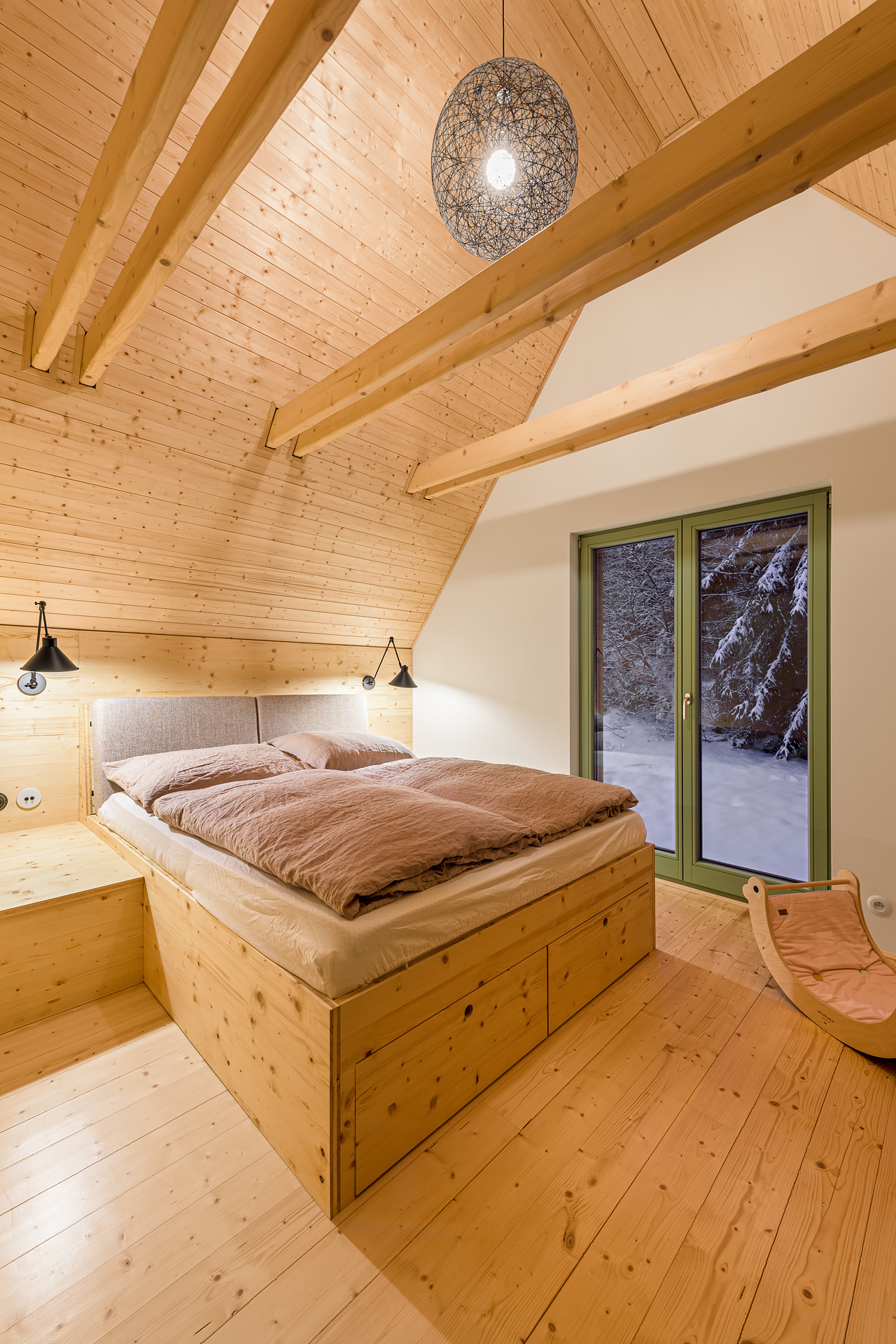Nová časť na prízemí integruje všetky obslužné miestnosti a schodisko. Celý pôdorys pôvodnej chaty je uvoľnený pre obytný priestor s kuchyňou a presvetlený z troch svetových strán. Podkrovie využívajú dve spálne a kúpeľňa.