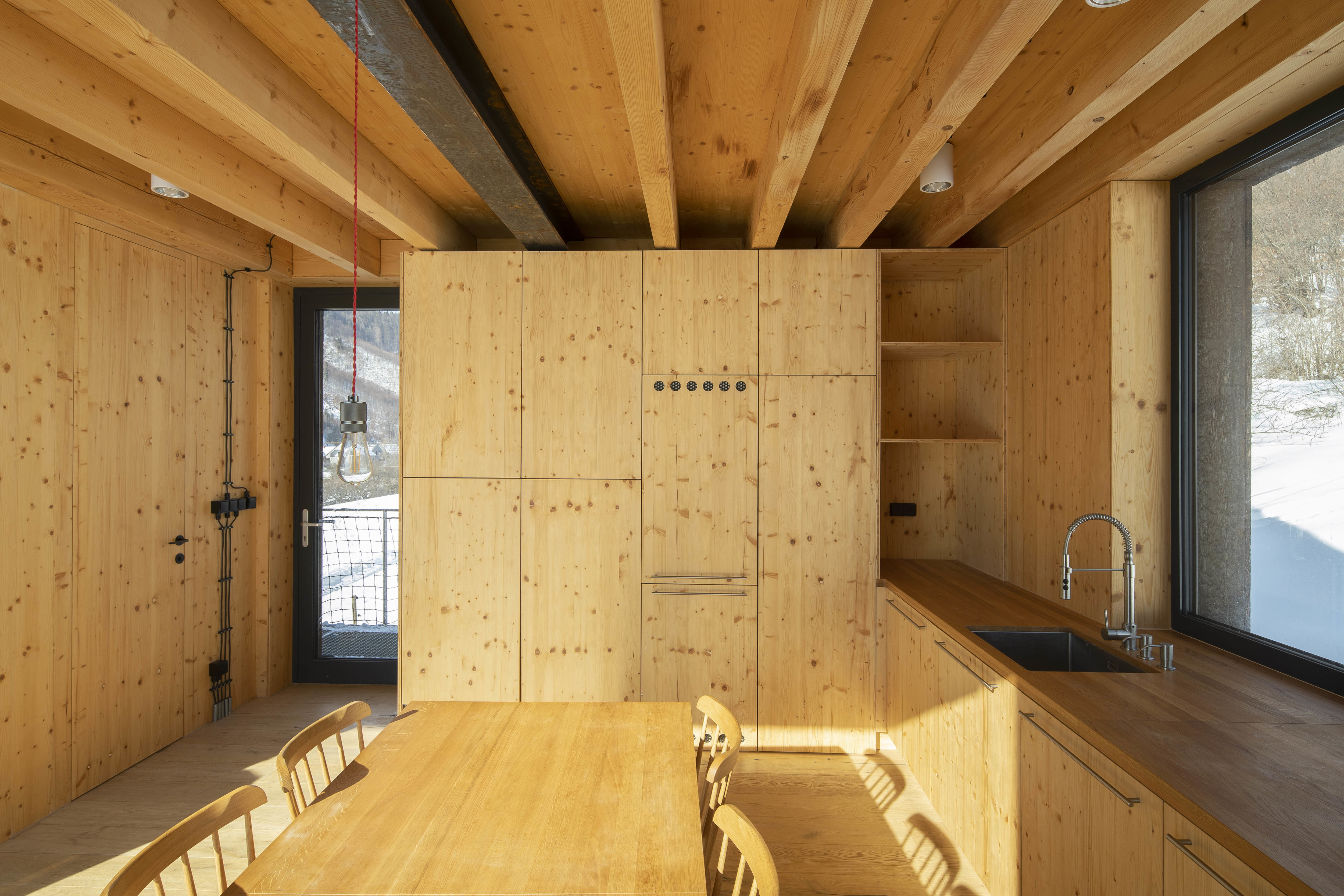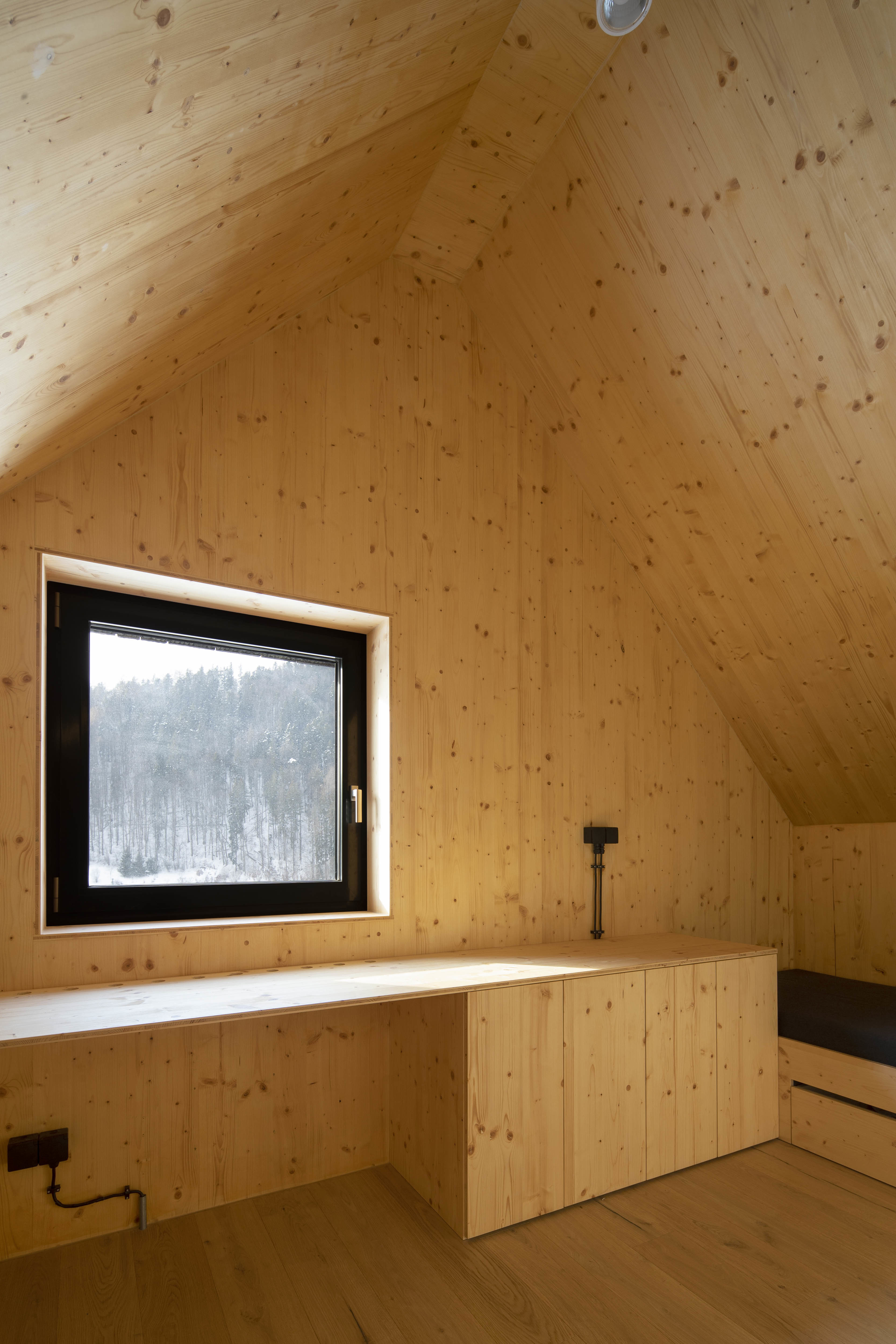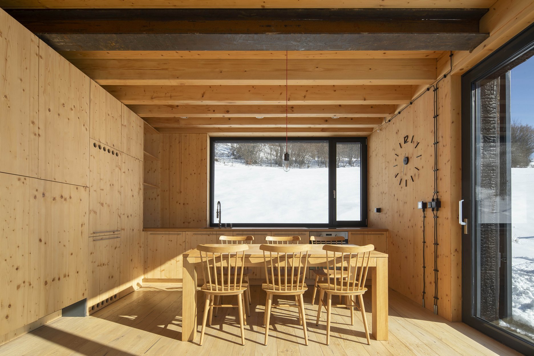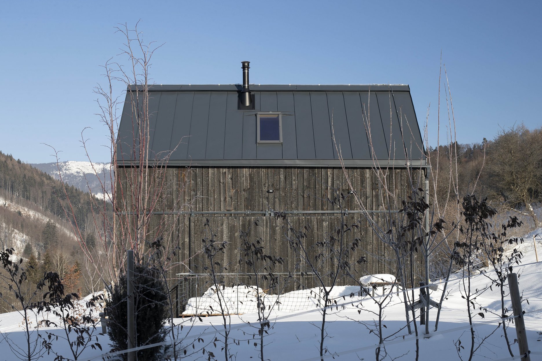 Ako dominantný pohľadový materiál v interiéri zvolili architekti svetlý povrch olejovaných smrekových biodosiek, ktorý kontrastuje s tmavými fasádami objektu. Pohľadovú vrstvu odvetrávanej fasády zo strany exteriéru tvoria borovicové dosky, ktorých povrch je upravený japonskou technikou shou sugi ban. Opálenie povrchu dreva účinne chráni fasádu pred nepriazňou počasia.