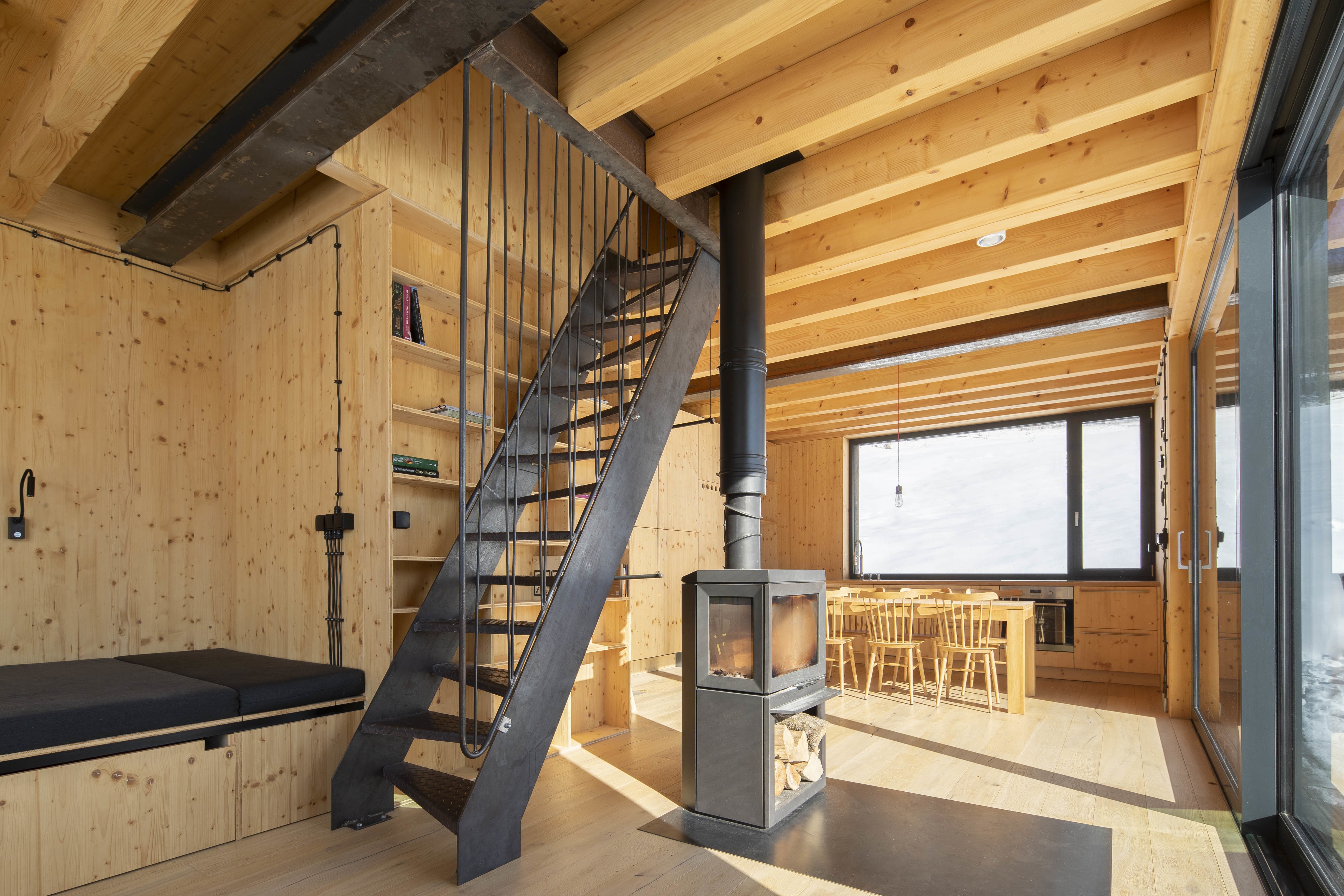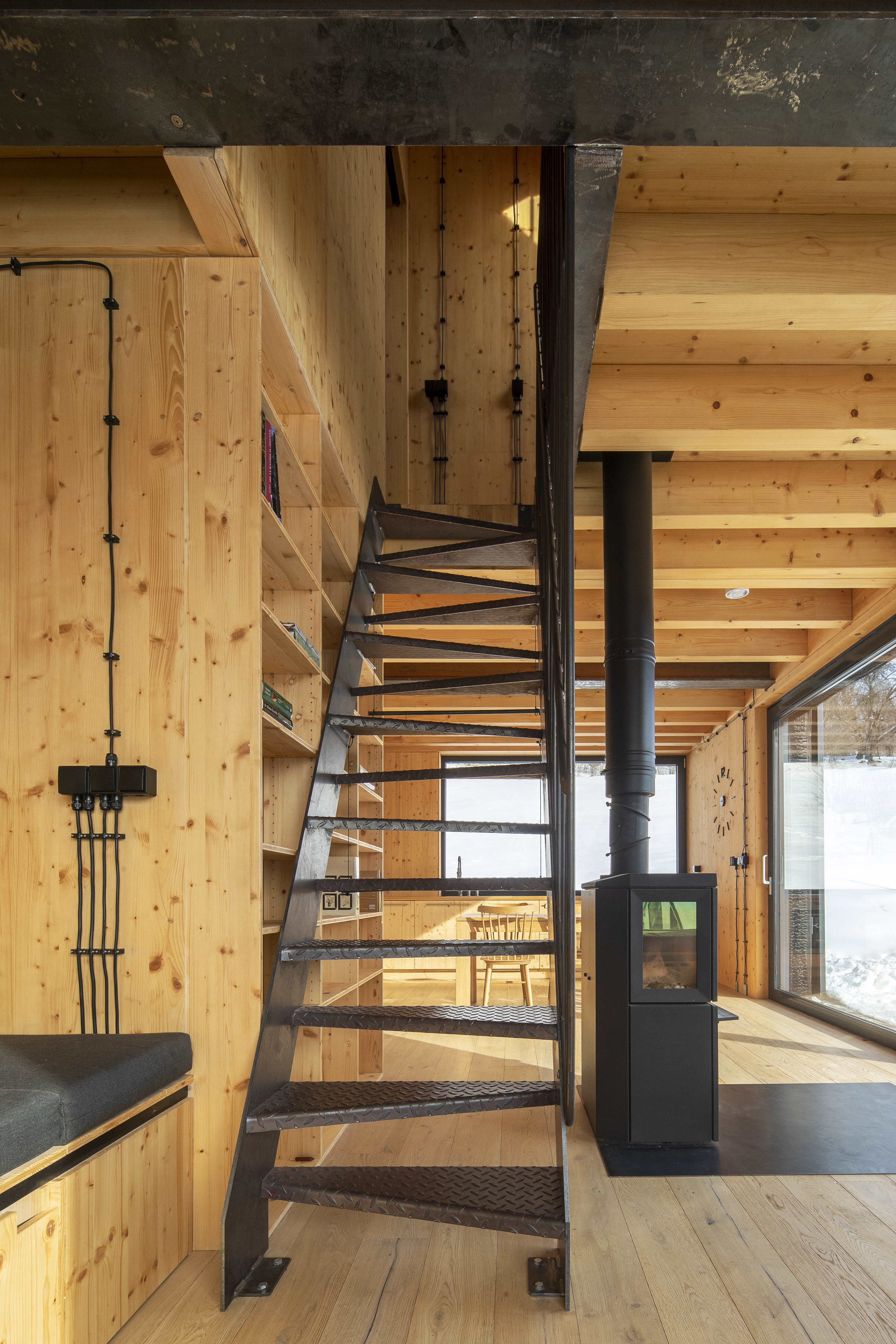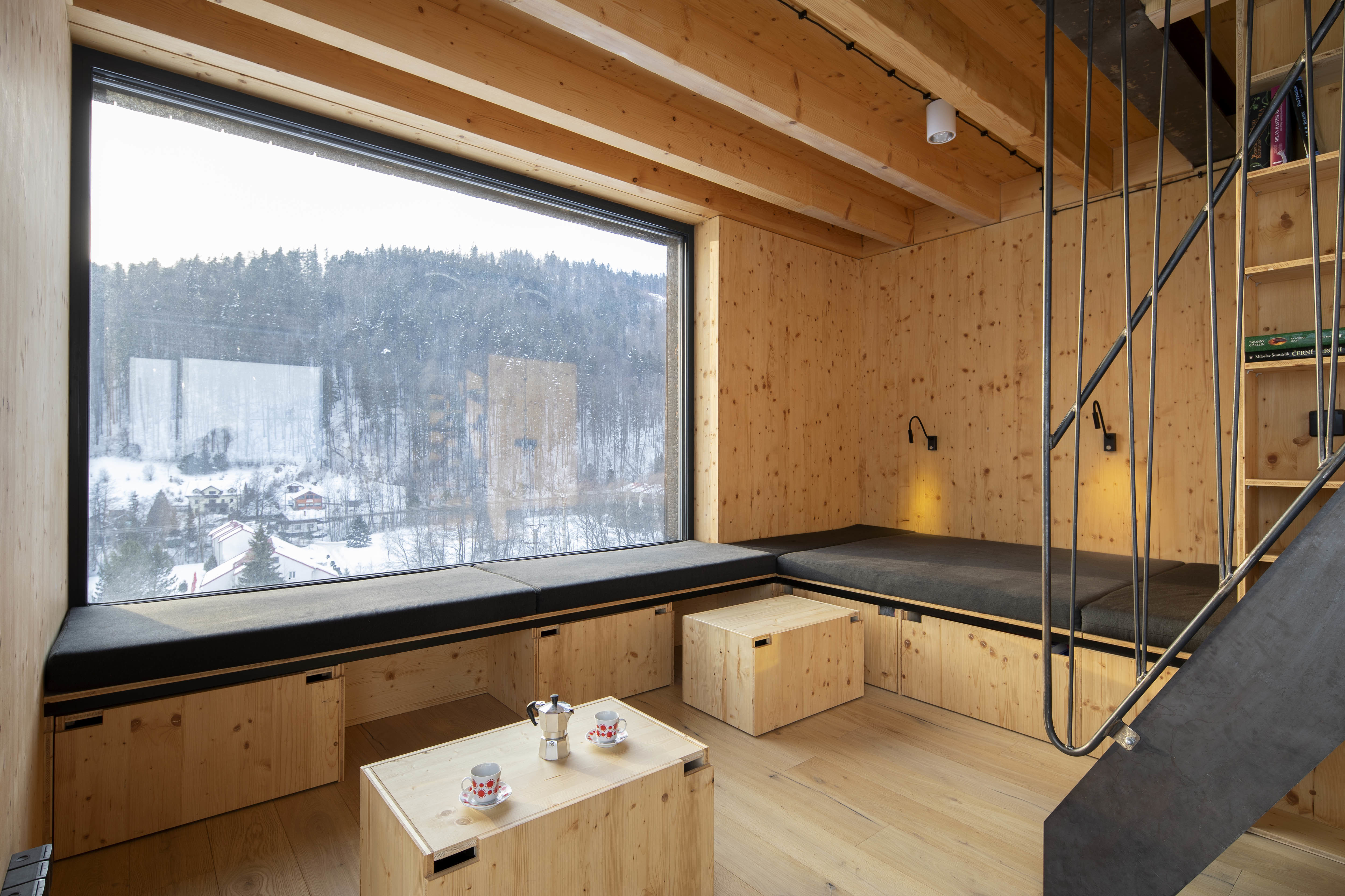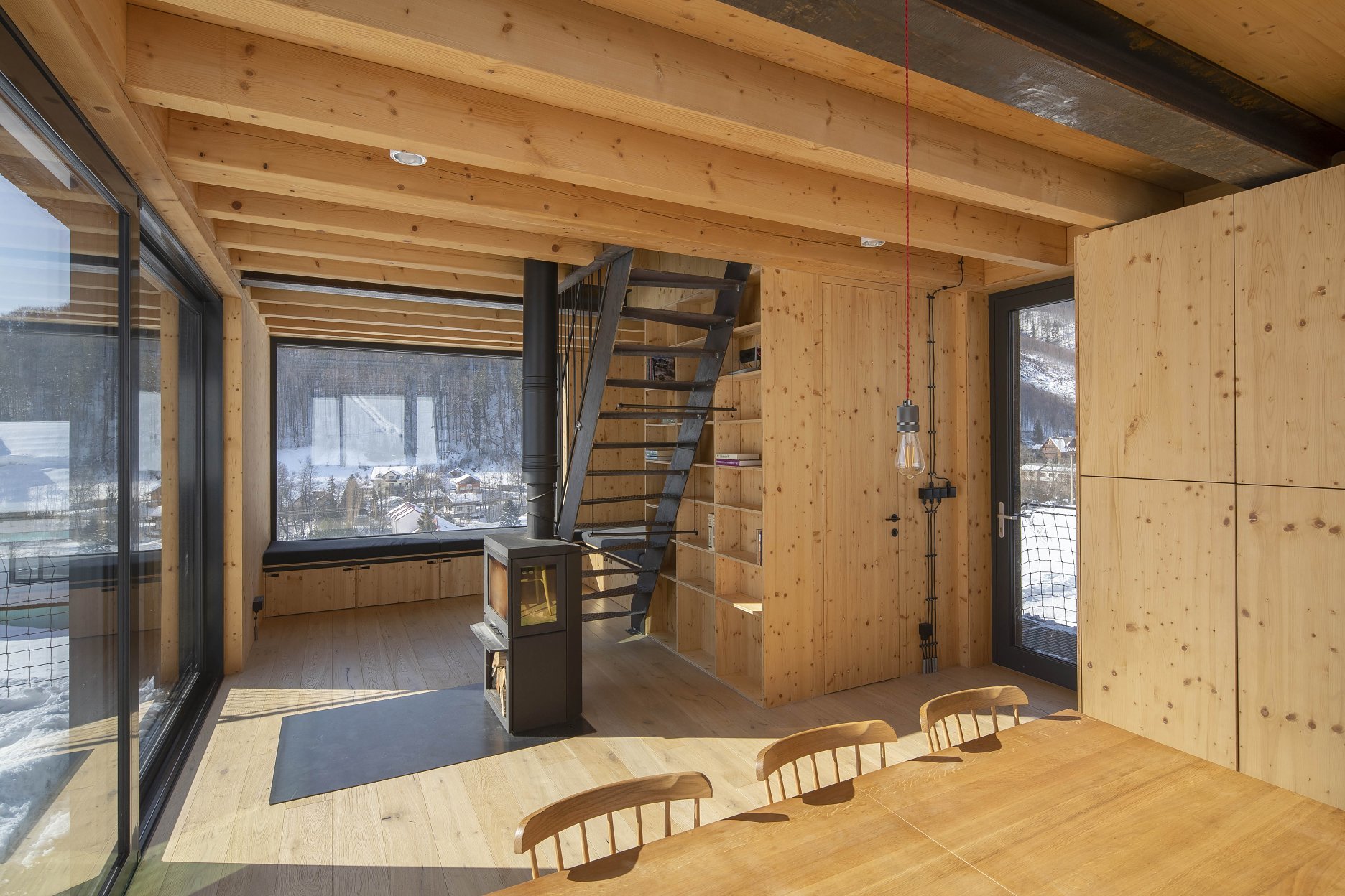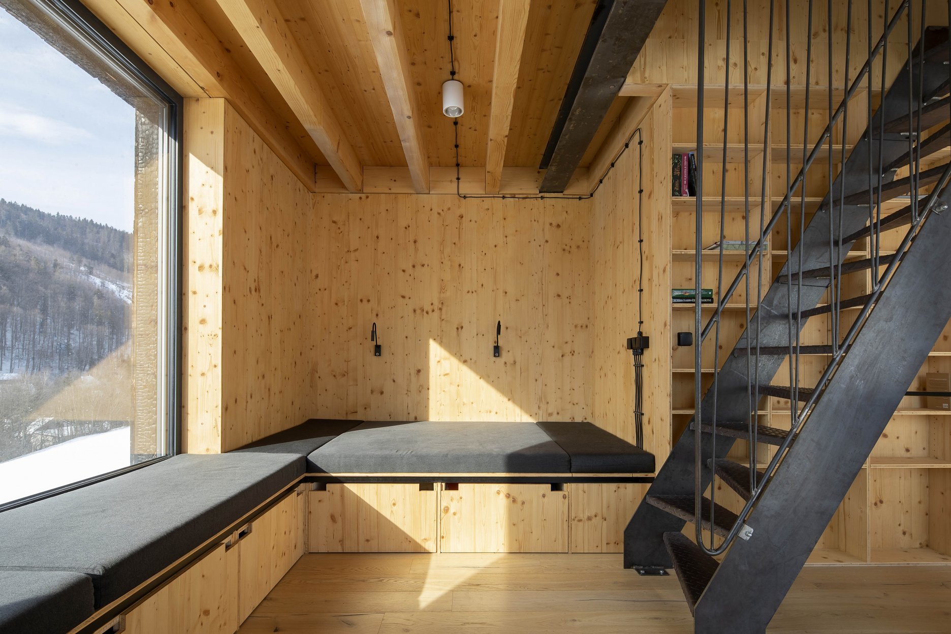 Na prízemie, prístupné prostredníctvom exteriérového schodiska, situovali architekti dennú zónu s ležoviskom na príležitostné spanie a viacúčelovým mobilným nábytkom. Interiér prepájajú s okolitou prírodou okná, orientované na všetky svetové strany. Prízemie je zároveň so záhradou priamo prepojené cez drevenu terasu.