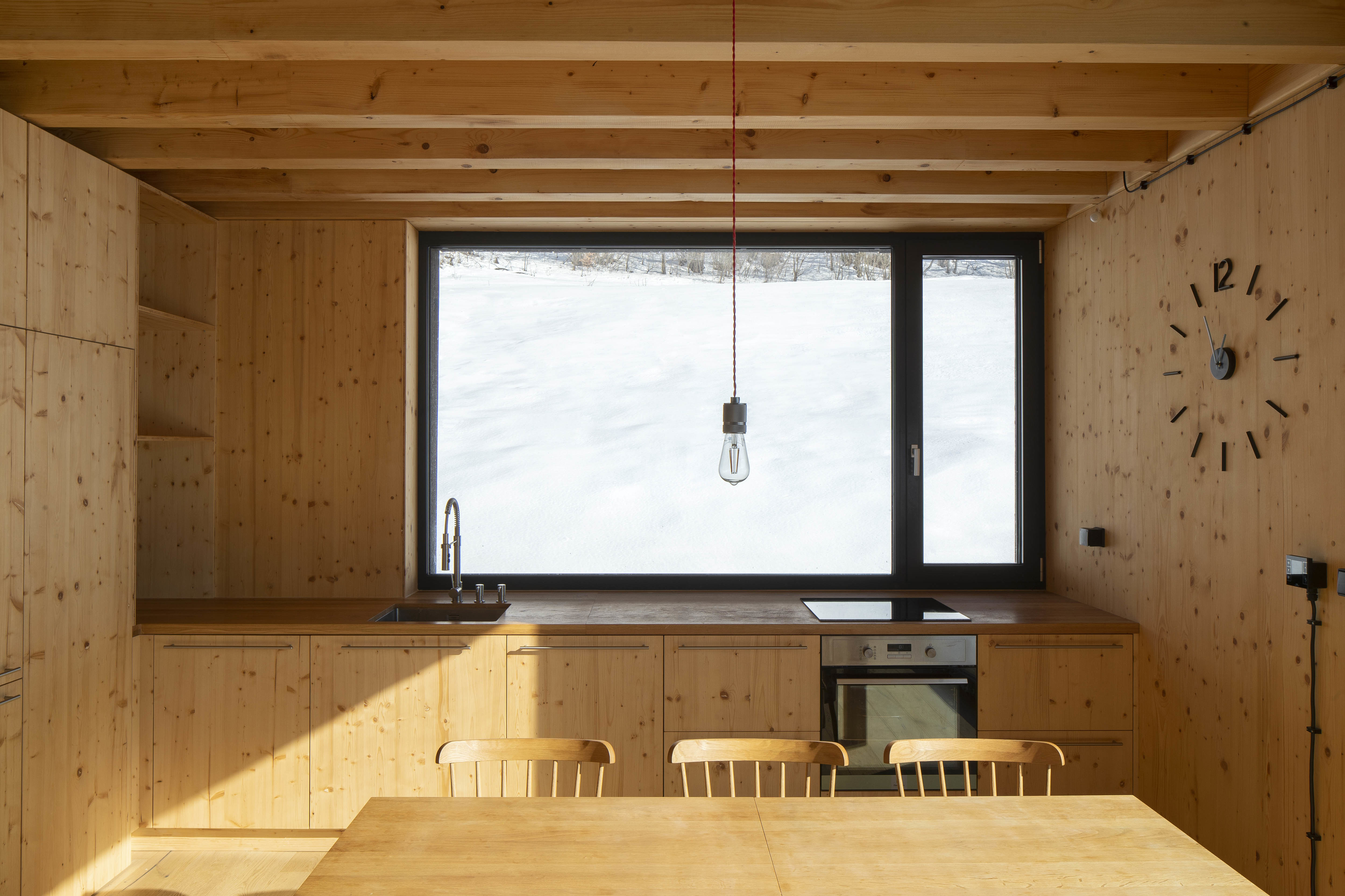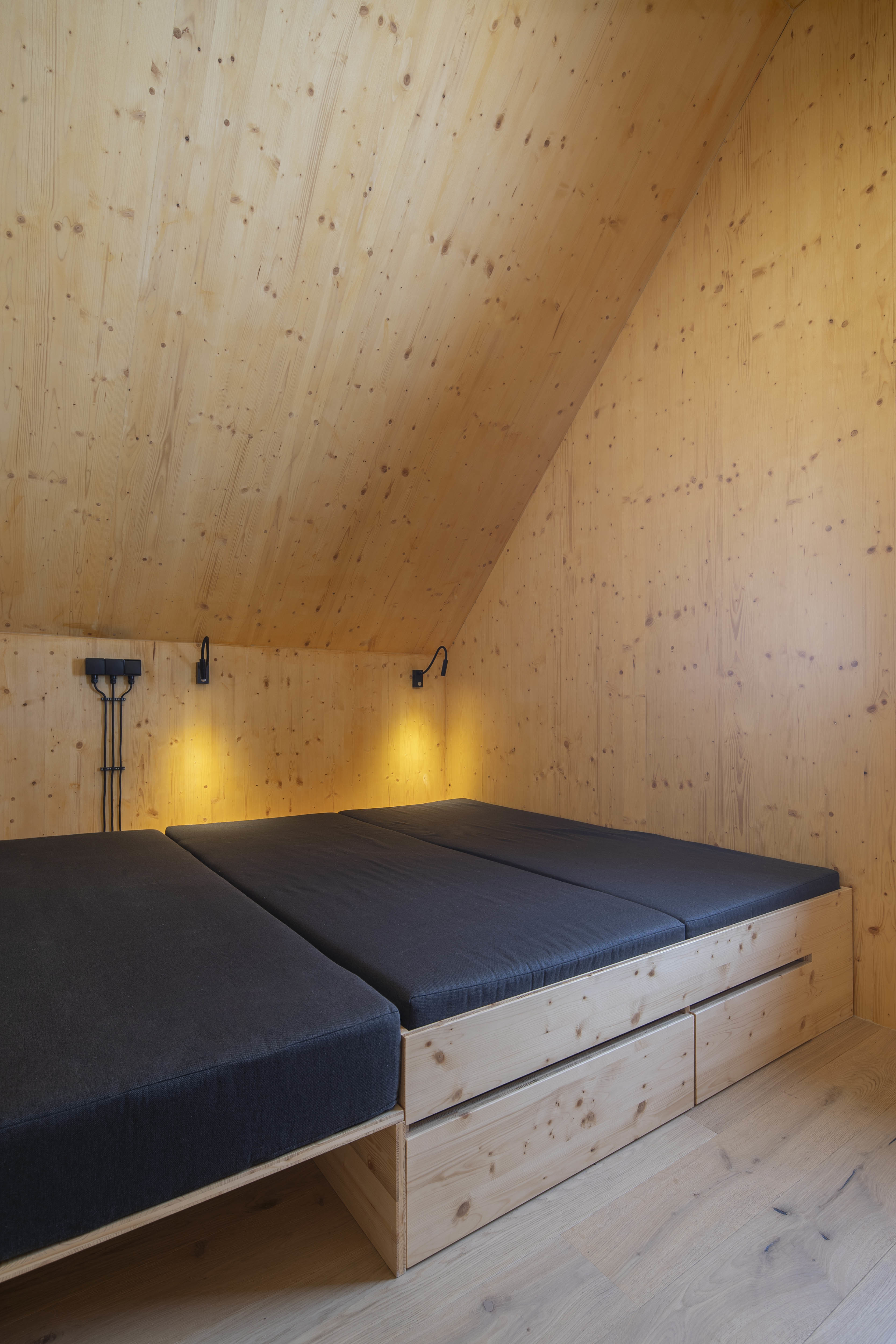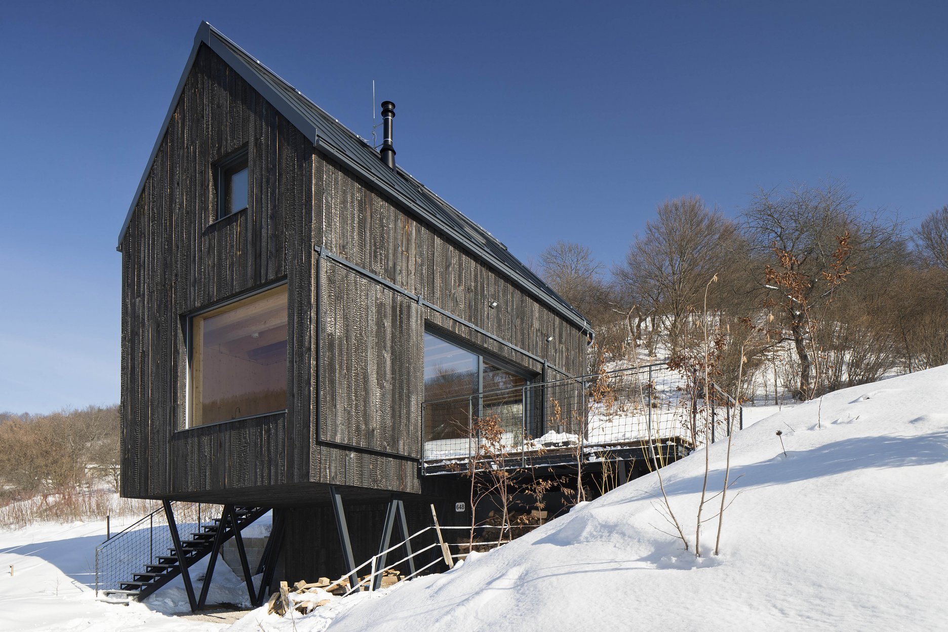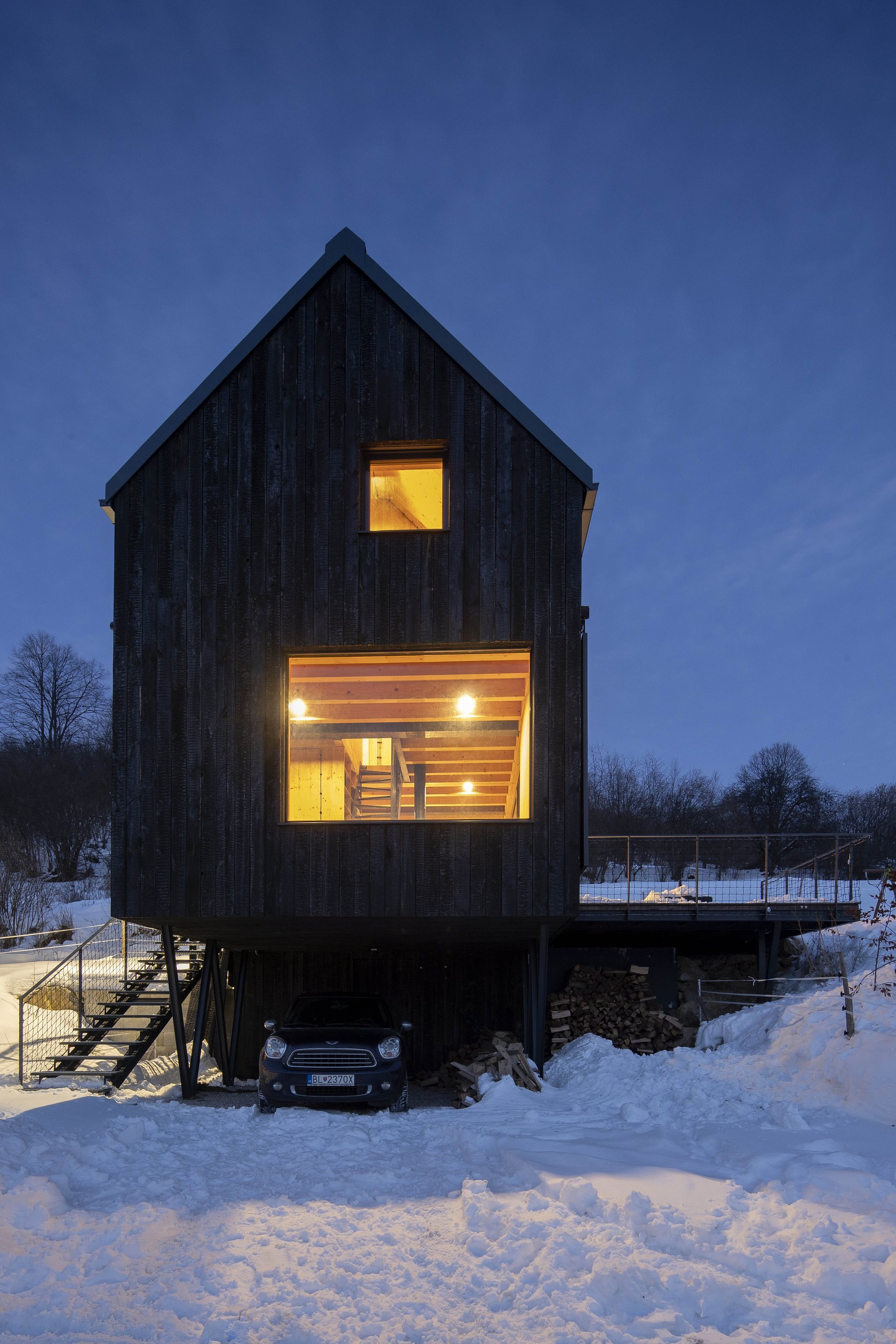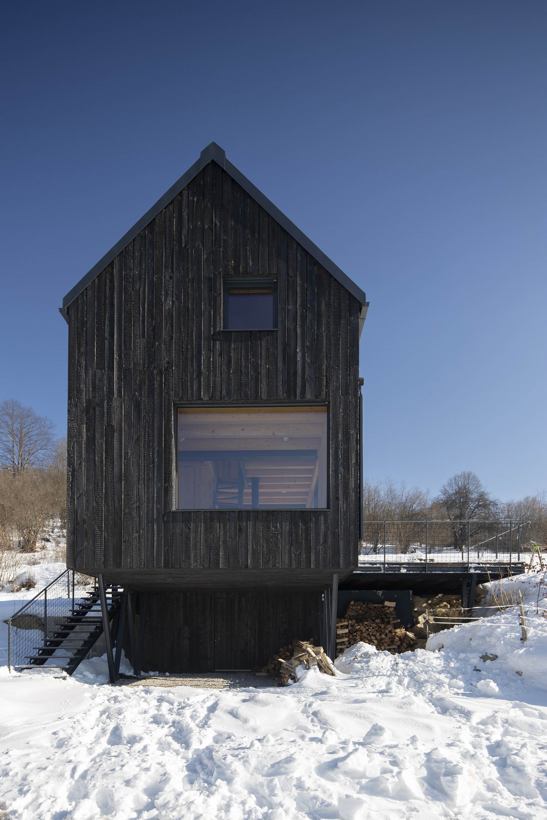Na prízemie, prístupné prostredníctvom exteriérového schodiska, situovali architekti dennú zónu s ležoviskom na príležitostné spanie a viacúčelovým mobilným nábytkom. Interiér prepájajú s okolitou prírodou okná, orientované na všetky svetové strany. Prízemie je zároveň so záhradou priamo prepojené cez drevenu terasu.