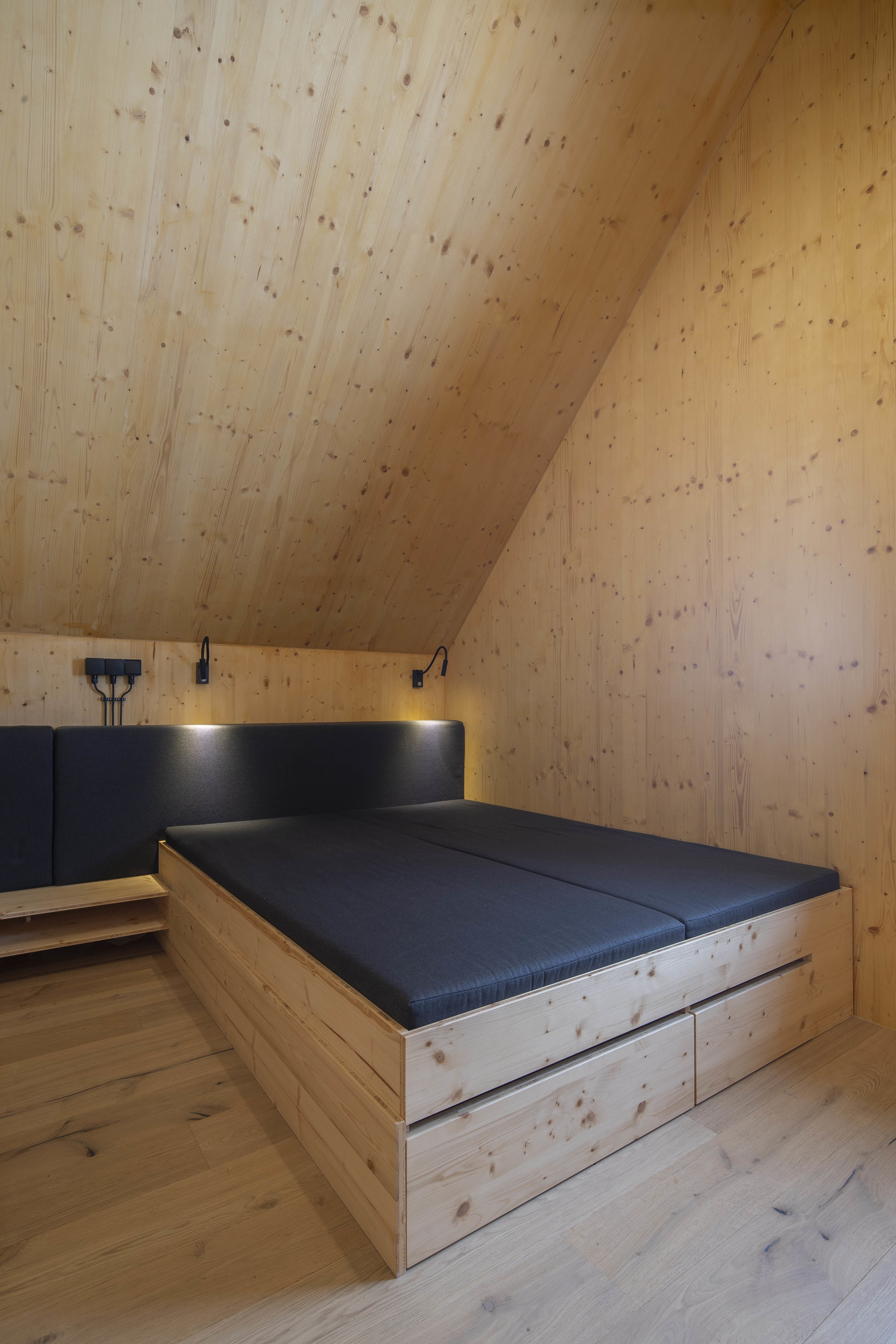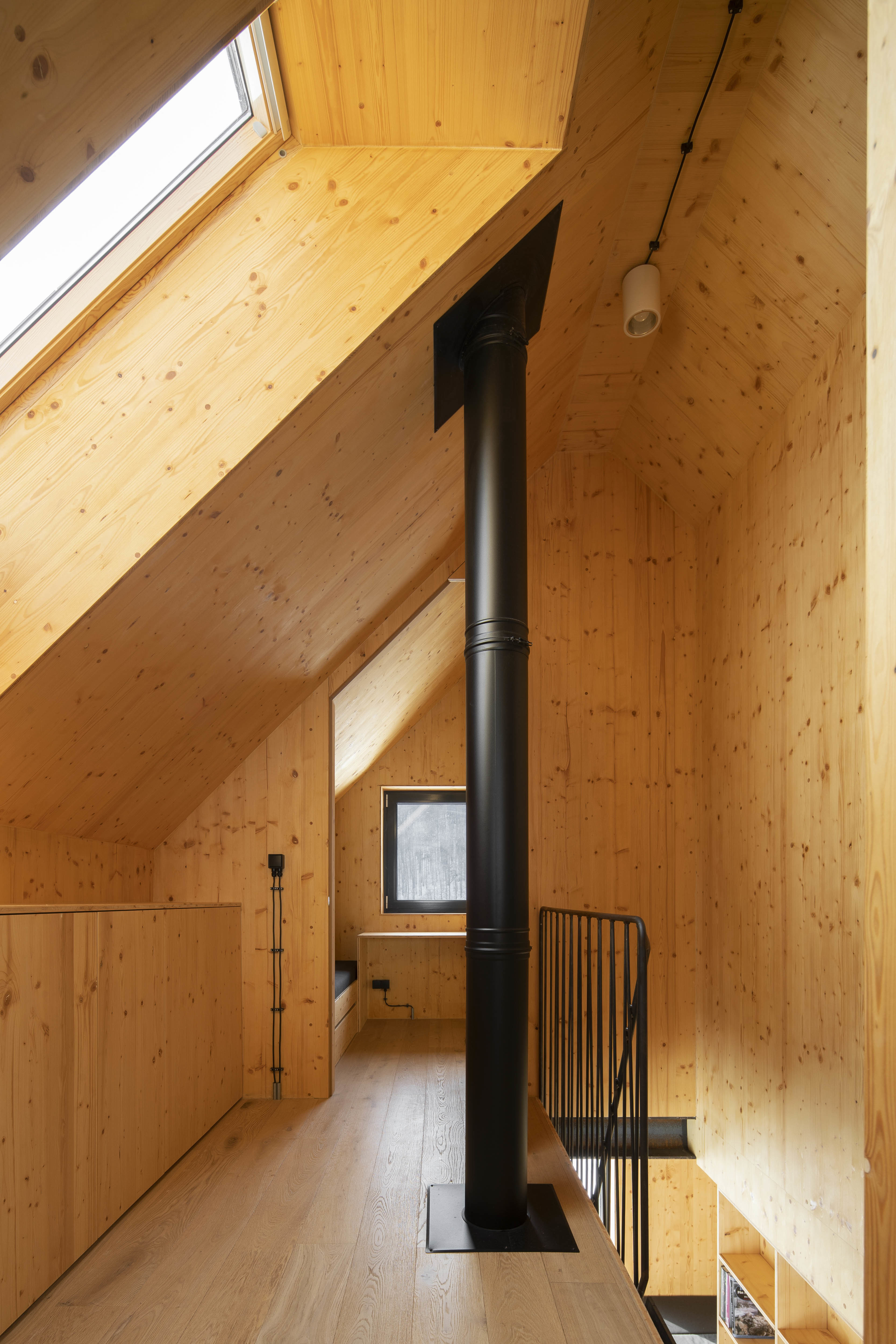 Do nočnej zóny v podkroví vedie oceľové schodisko, s priznanou surovou materialitou. V priestoroch pod šikmou strechou nájdeme spálňu rodičov, detskú izbu a kúpeľňu.