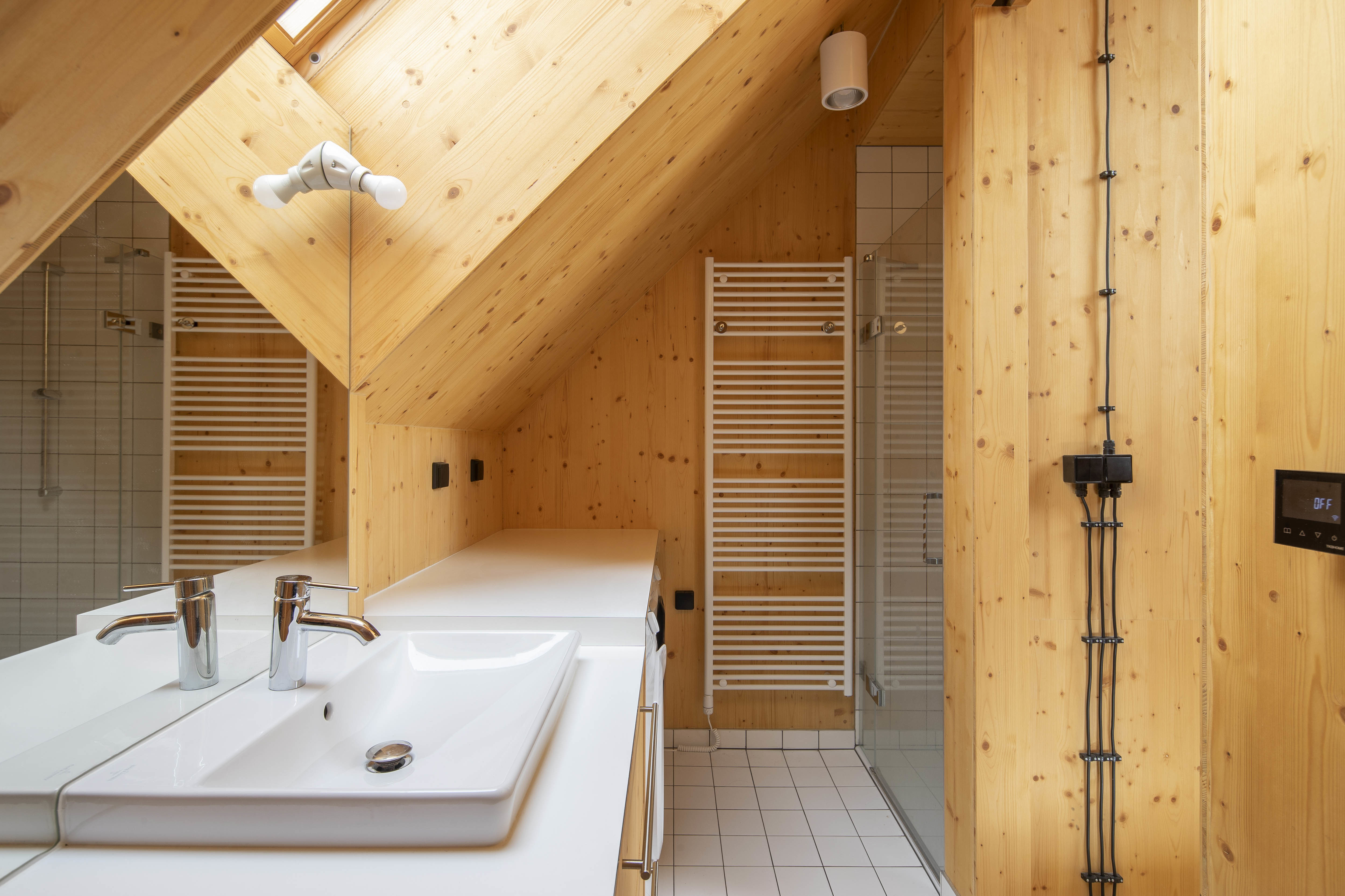 Tepelný komfort zabezpečuje kombinácia elektrického podlahového vykurovania a pece na drevo. O ohrev TÚV sa stará elektrický zásobník ukrytý pod lavicou v kúpeľni. Podkrovie je vyhrievané iba dymovodom z pece.