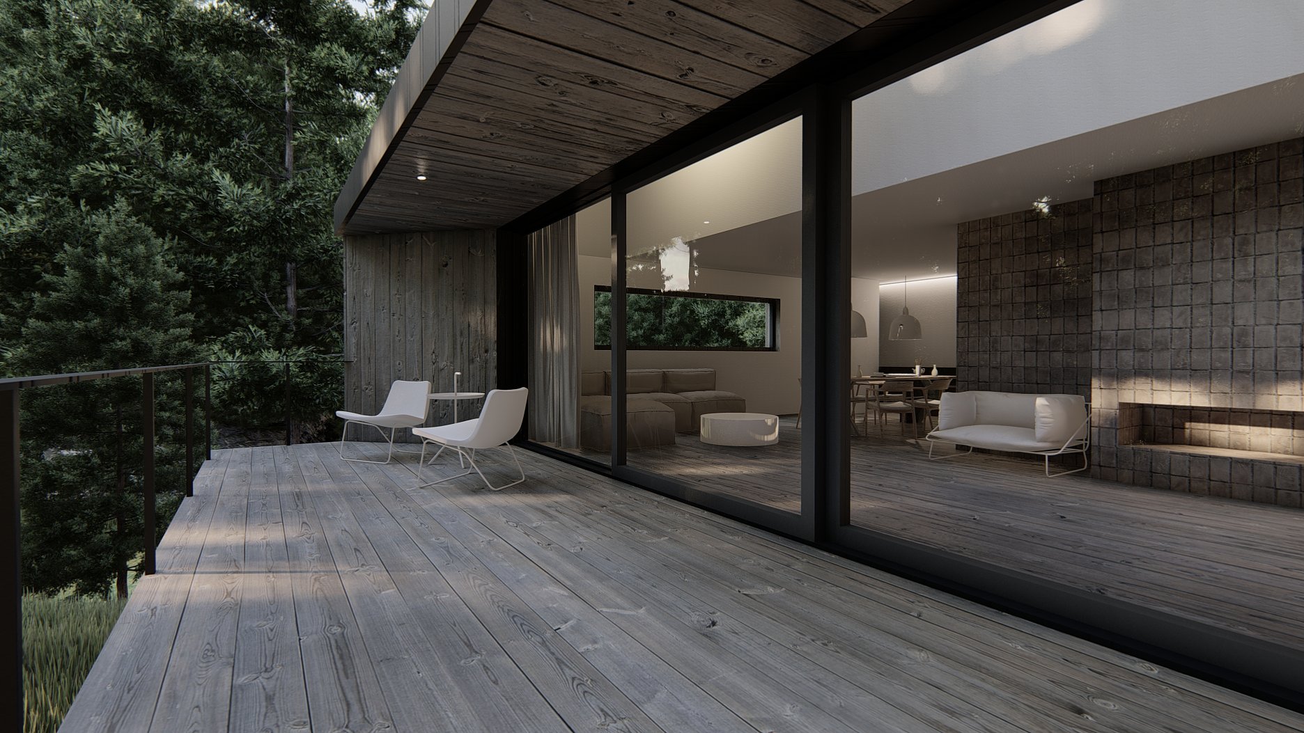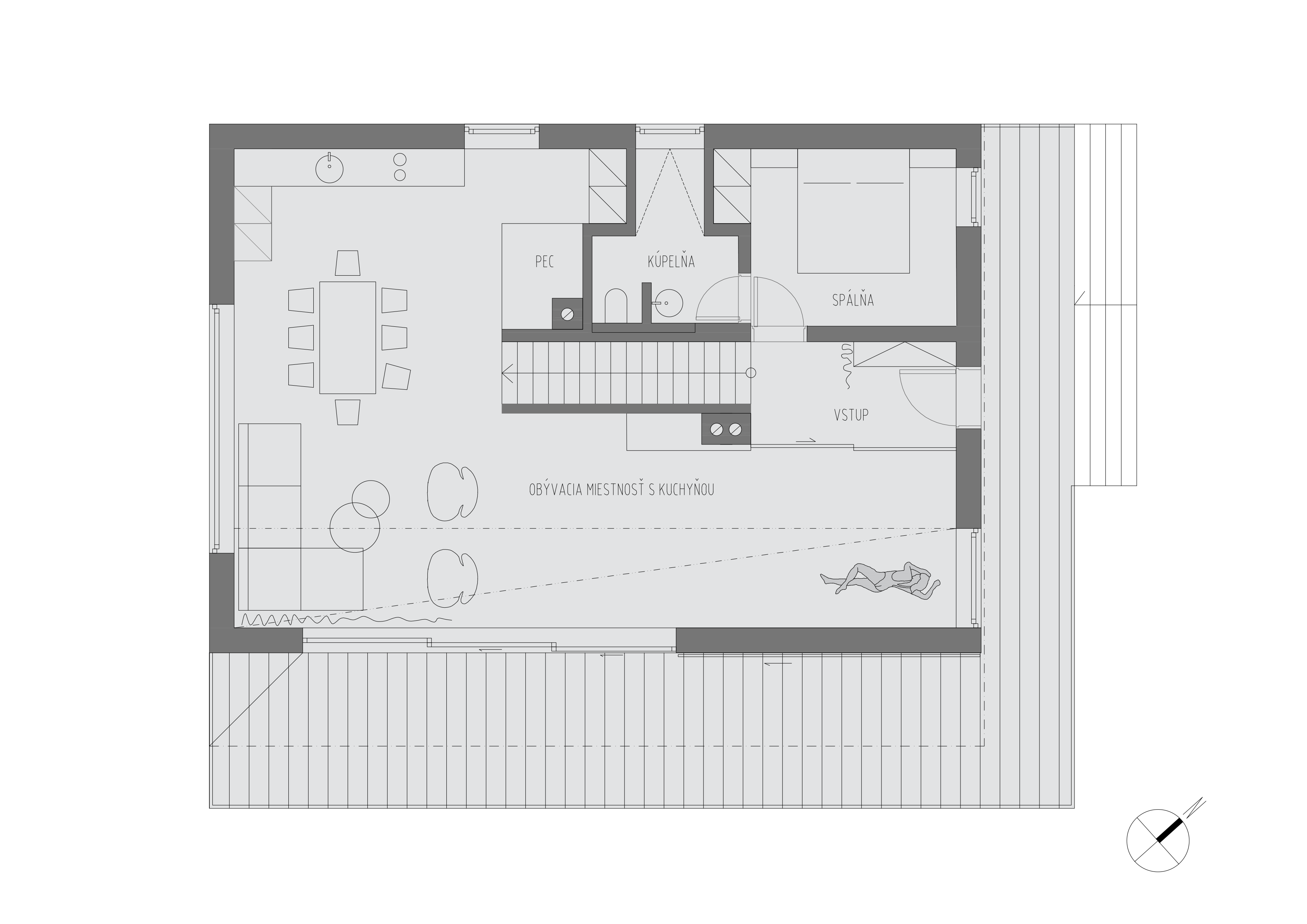 Pôvodný objekt drevostavby typu Javorina nezodpovedal priestorovým nárokom majiteľa. Prioritou zadania sa stal veľký obytný priestor vhodný na spoločné cvičenia. V podzemí sa nachádza sauna s prístupom k potoku, ktorý tečie po západnej strane chaty. Bezpečnosť veľkých okenných otvorov je riešená posuvnými okenicami.