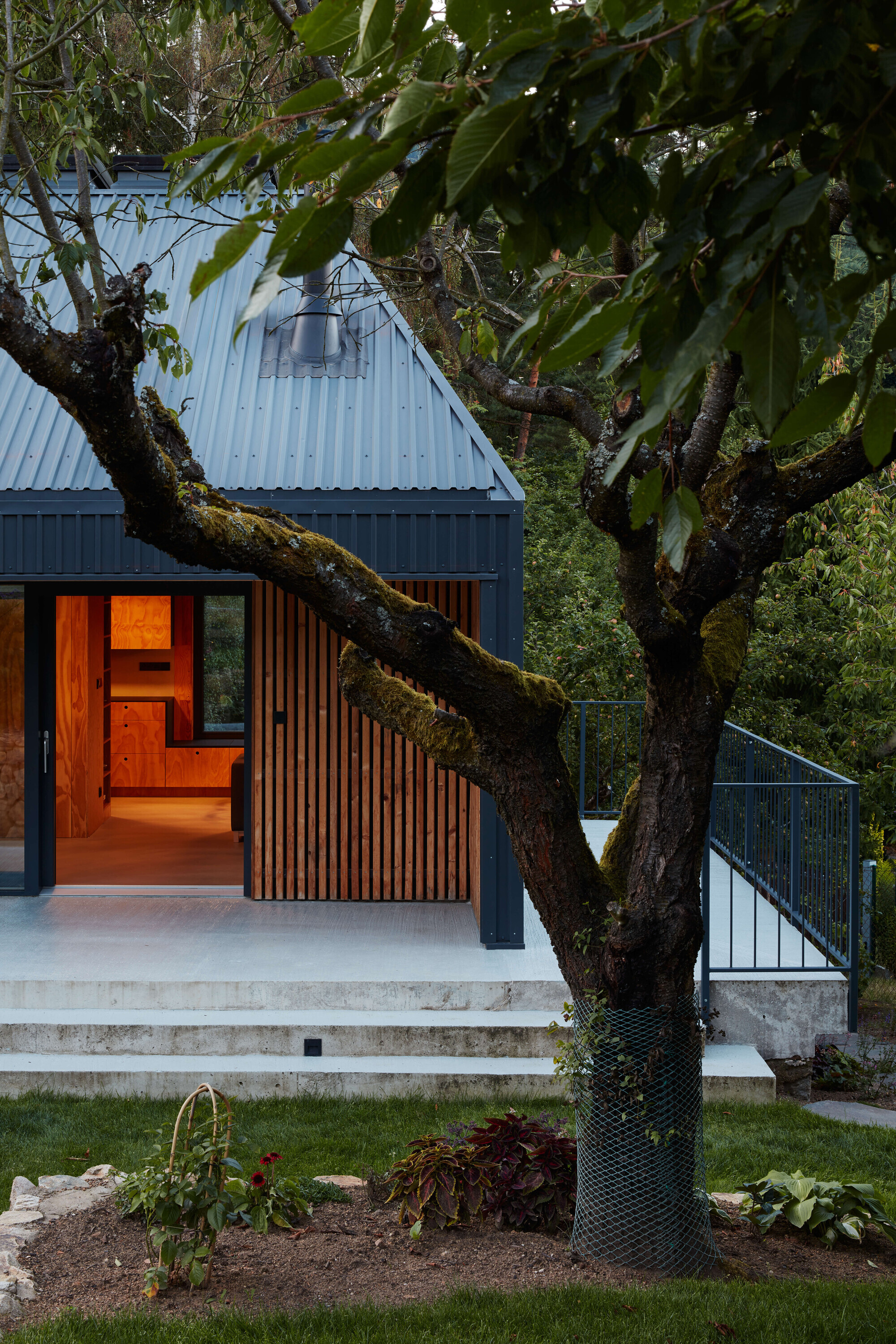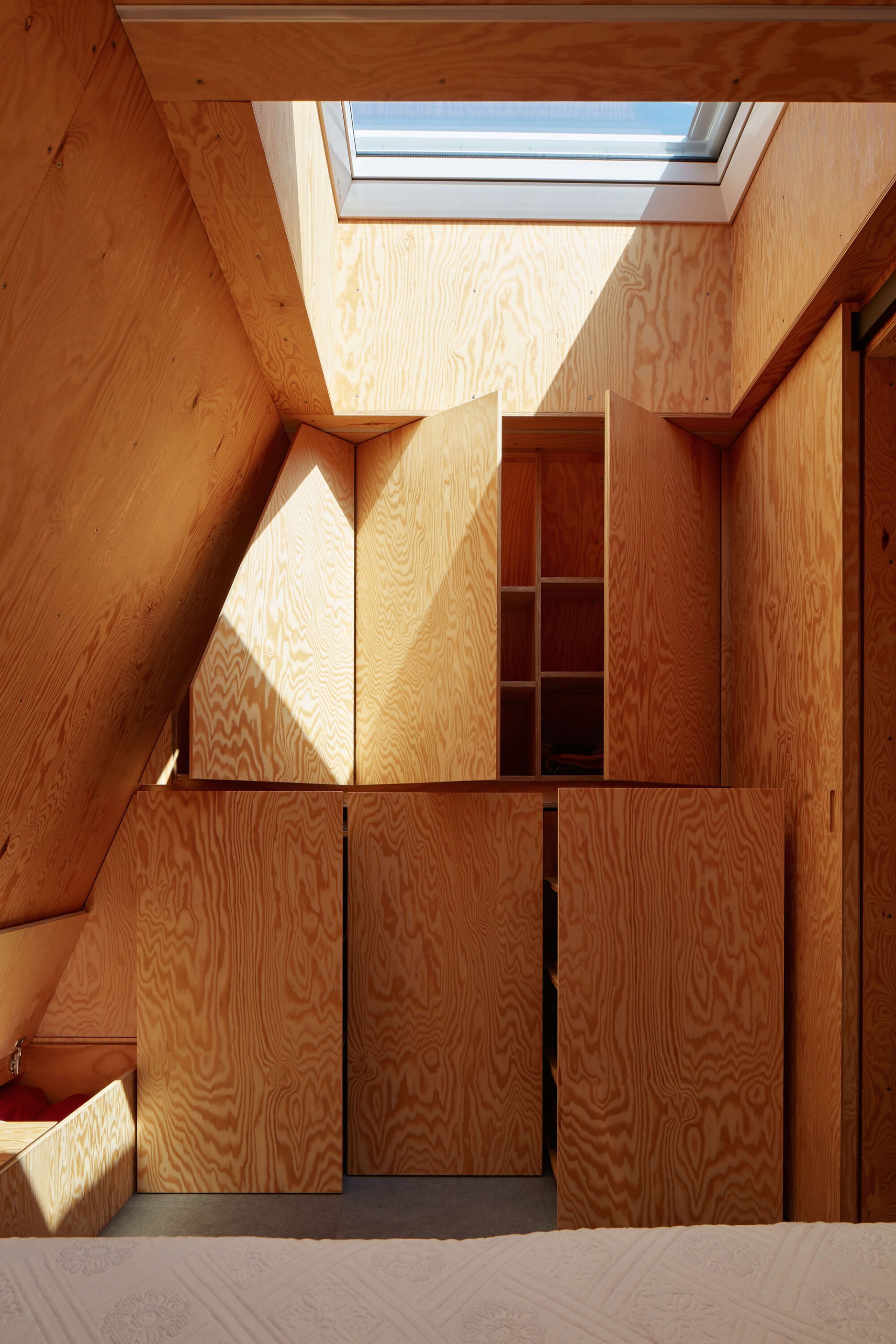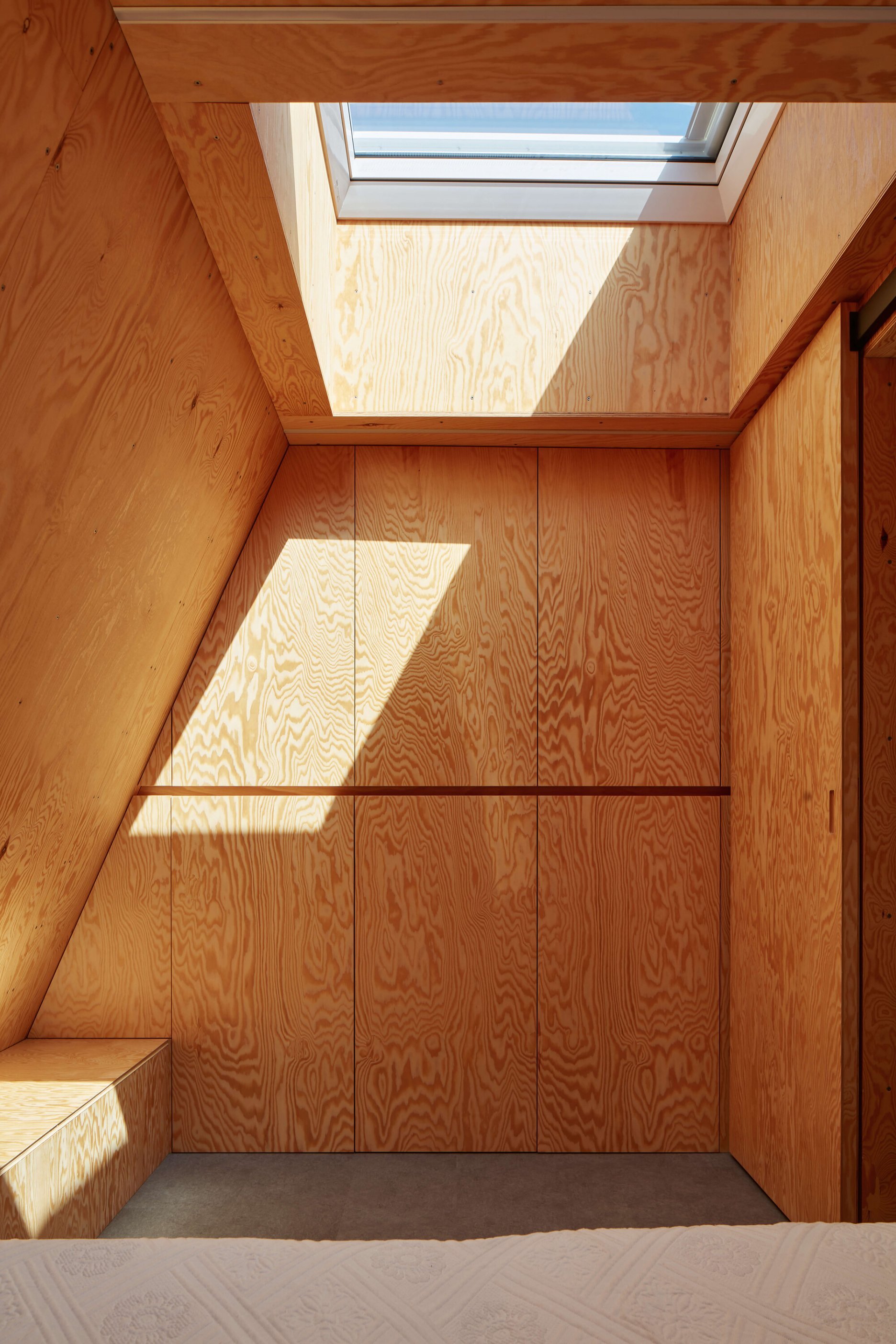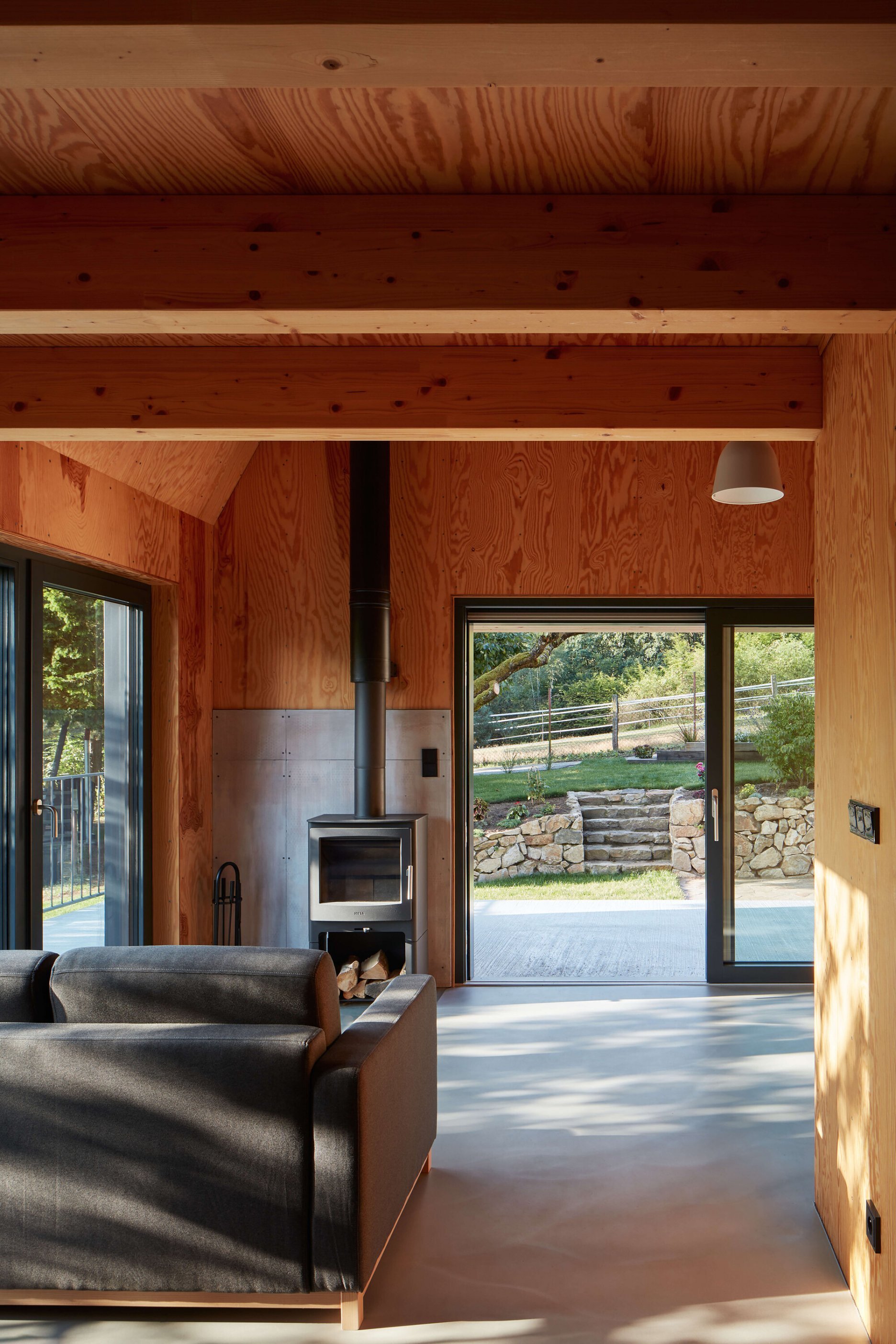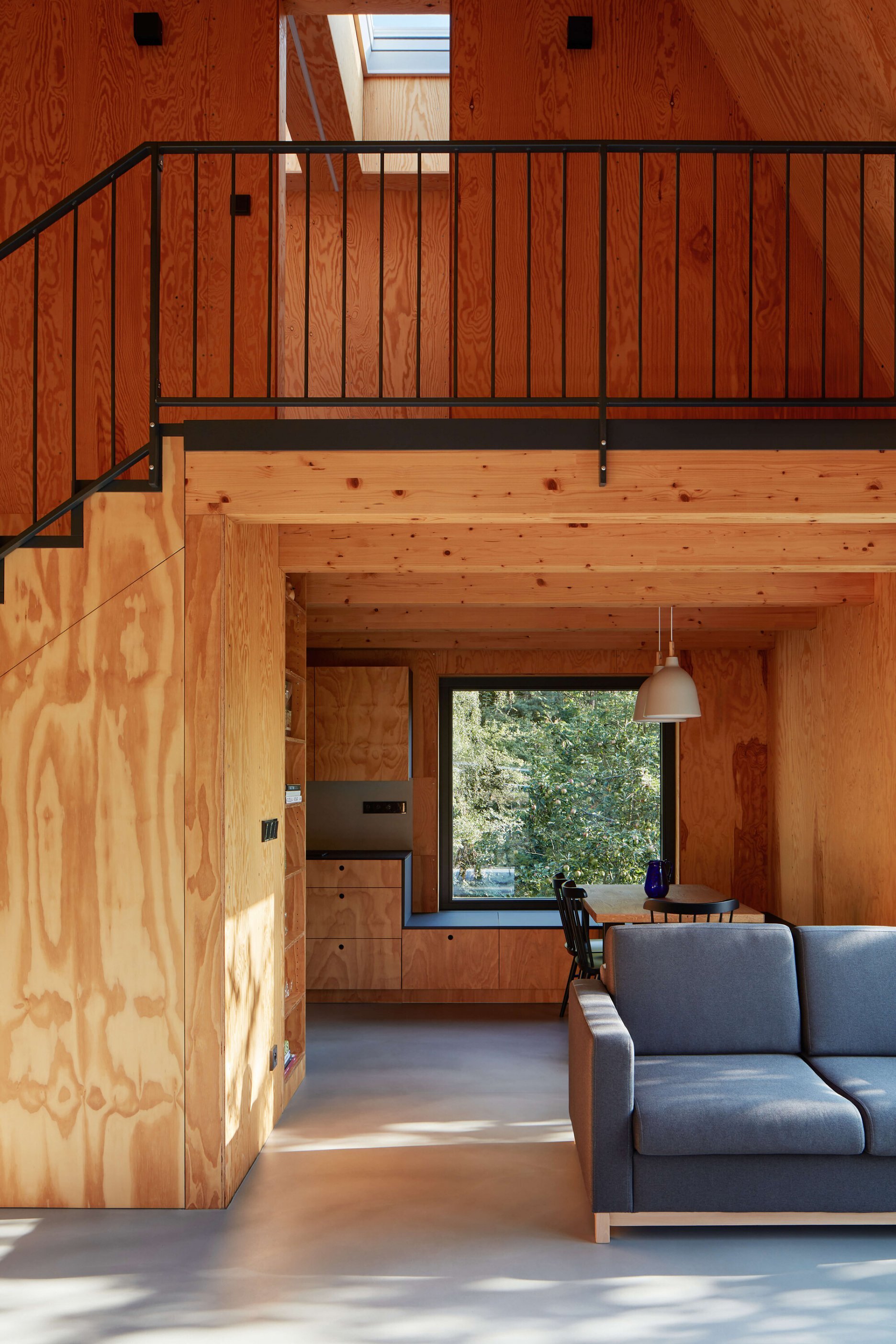 Kompaktná tmavá fasáda prispieva k splynutiu stavby s okolím. Kresba borovicovej preglejky v interiéri kontrastuje s jednoliatym vonkajškom. Obklad prechádza zo stien aj na stropy a nábytok a evokuje klasickú chatovú estetiku. Prevládajúce drevo dopĺňa nenápadná sivá stierka na podlahe a stenách kúpeľne.