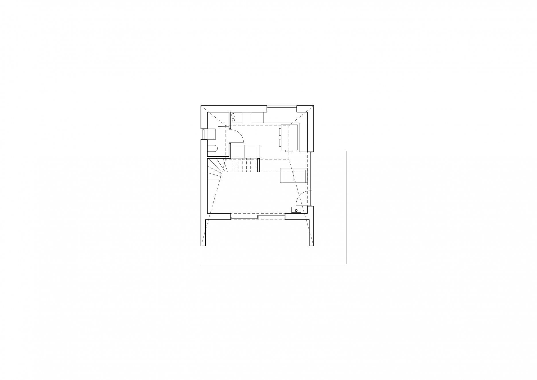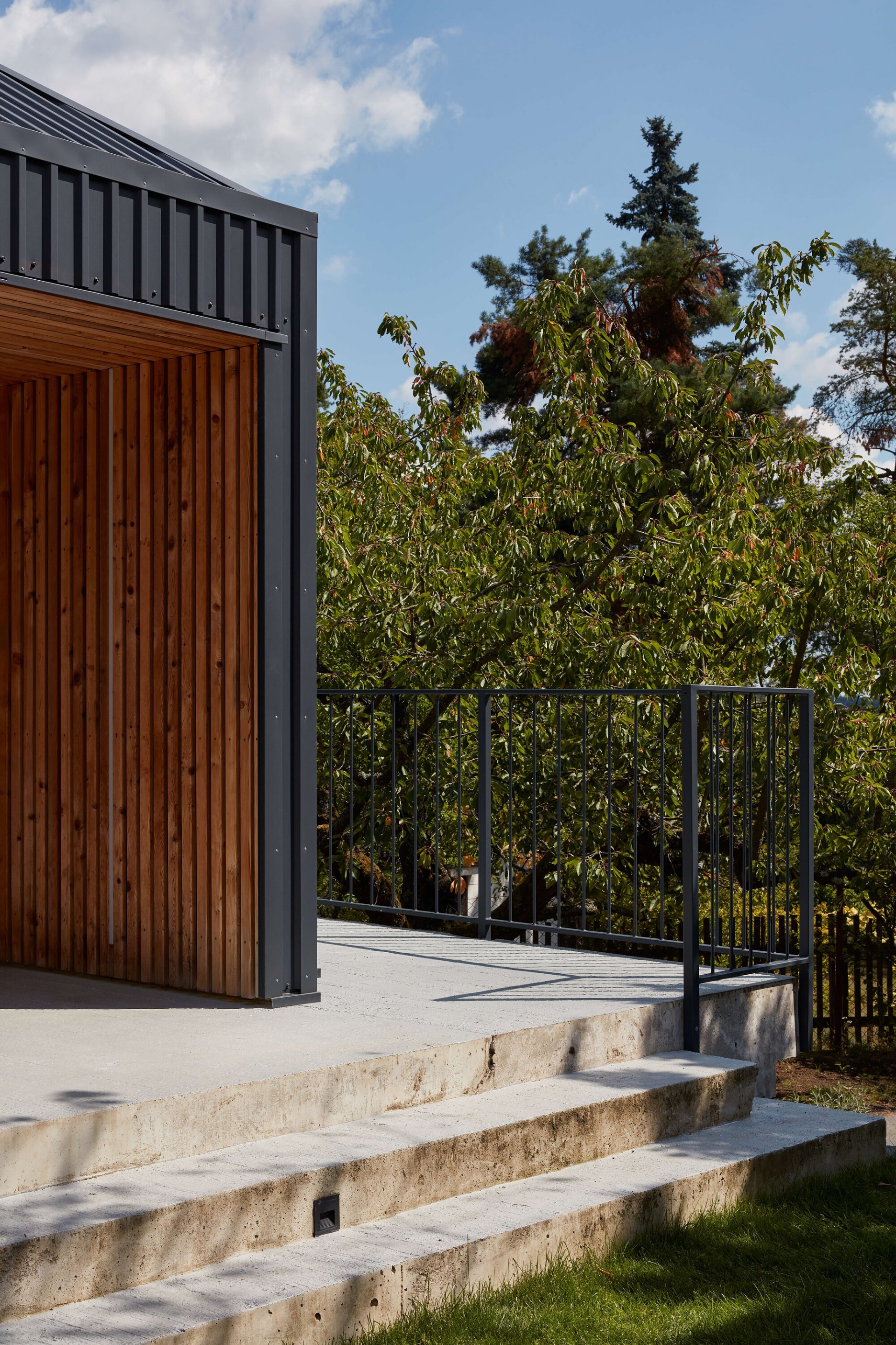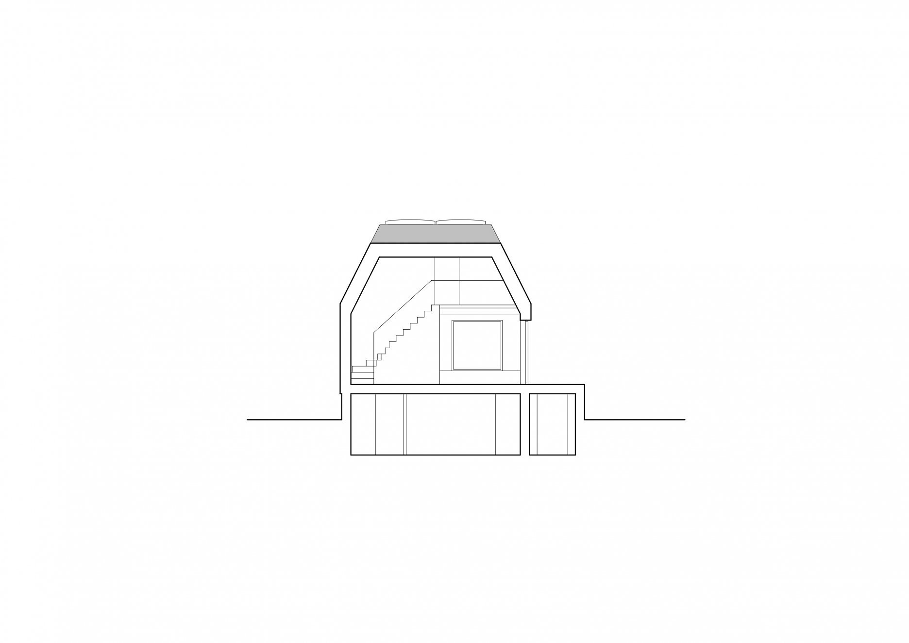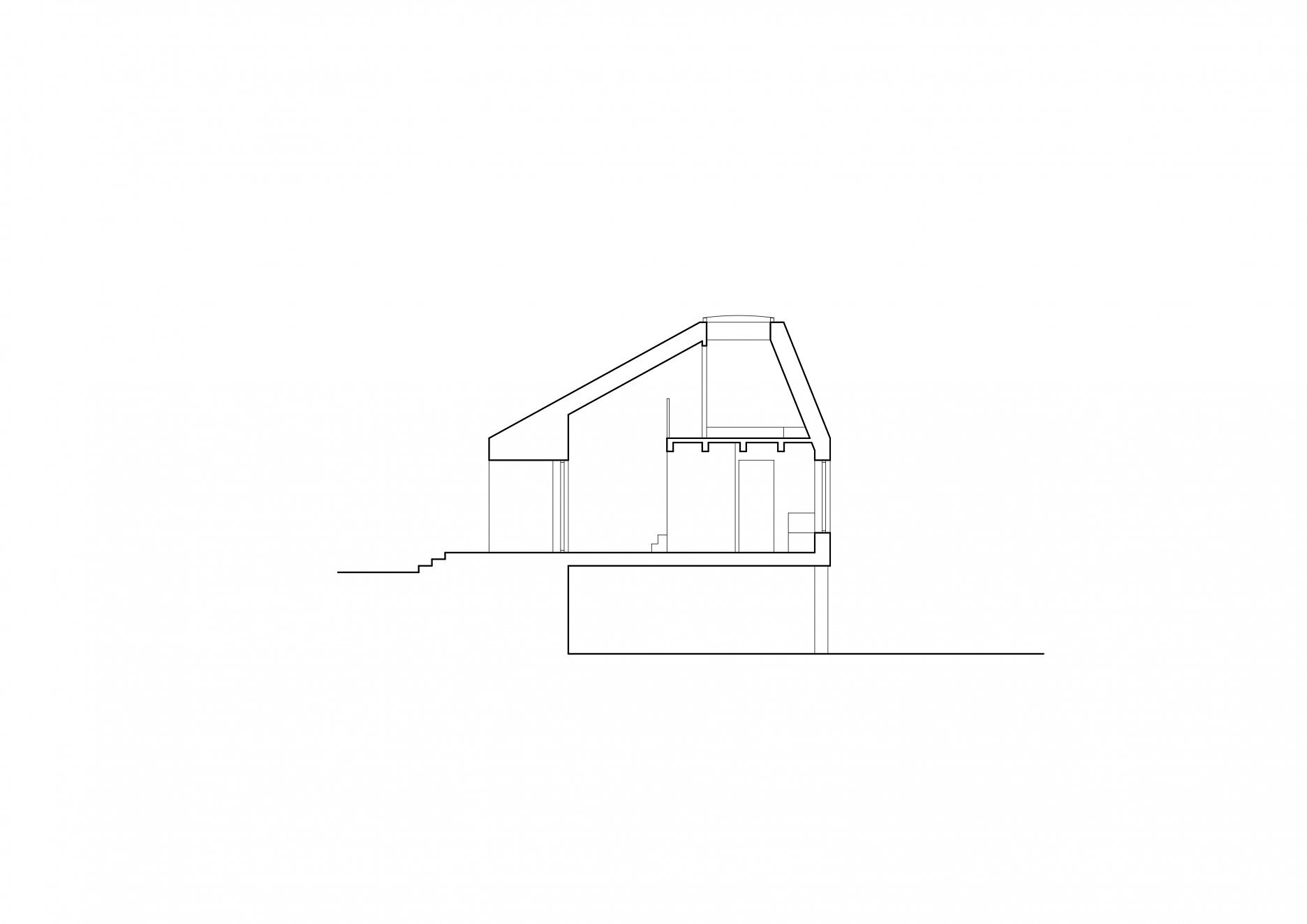 Výsledkom je kompaktný objem so "zrezanou" strechou, ktorá obmedzuje pôsobenie stavby ako bariéry voči výhľadom z okolitých pozemkov. Z pôvodnej chatky zachovali architekti len kamennú podmurovku, na ktorej stojí nová drevostavba. Stĺpiková konštrukcia je osadená na železobetónovej doske, ktorú nesú piliere ukryté za kamennými stenami. Pohľadovú vrstvu difúzne otvorenej konštrukcie zo strany exteriéru tvorí trapézový plech.