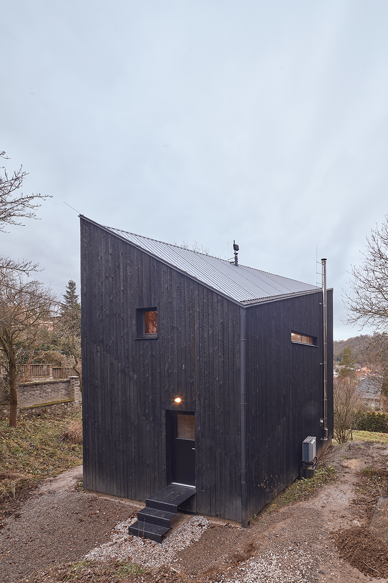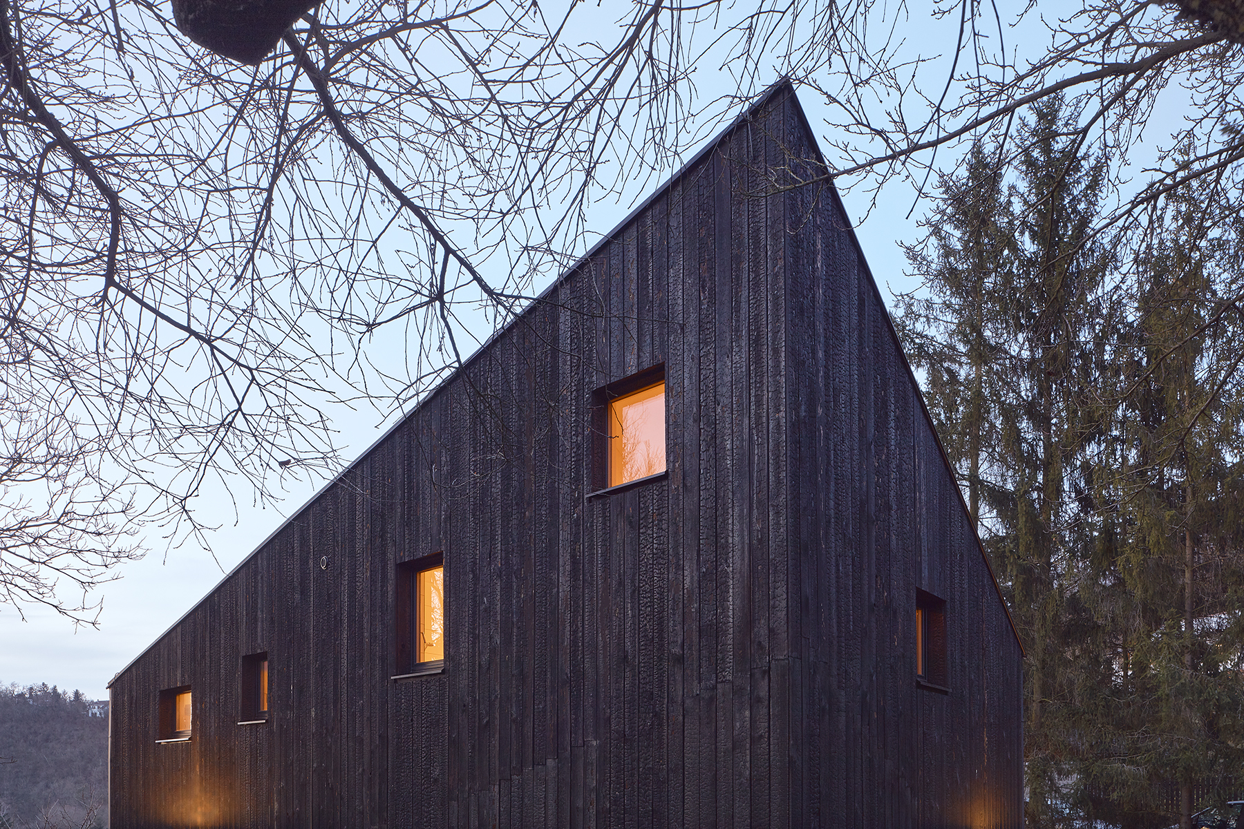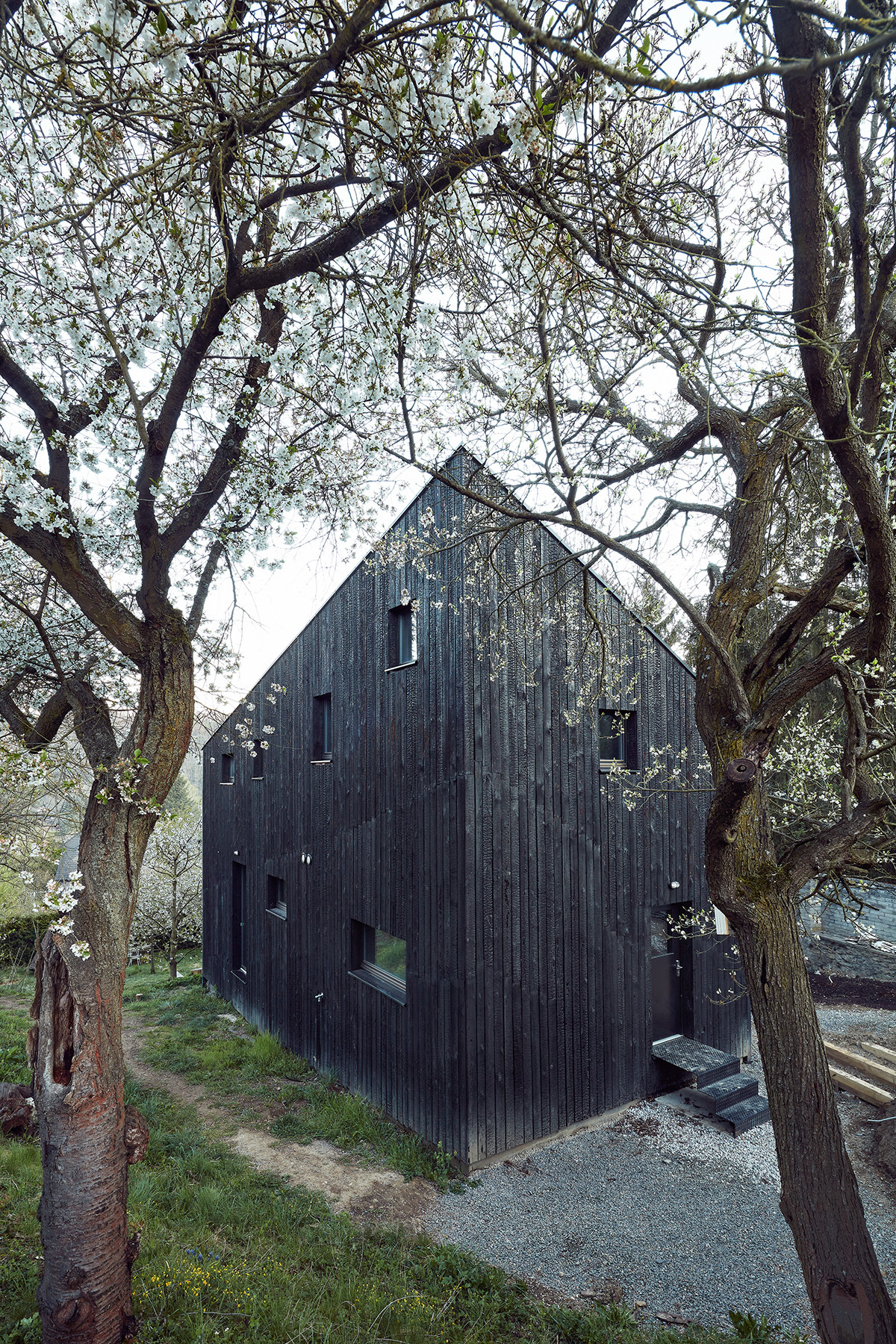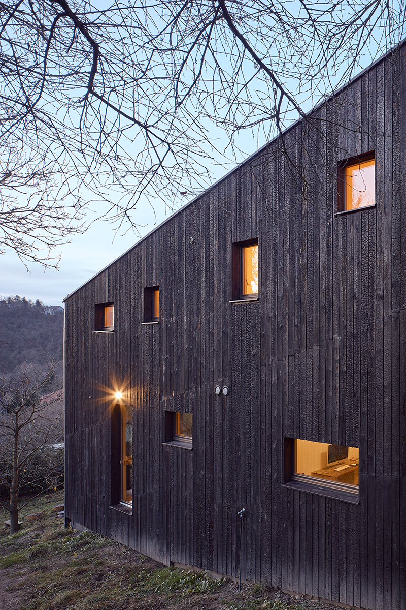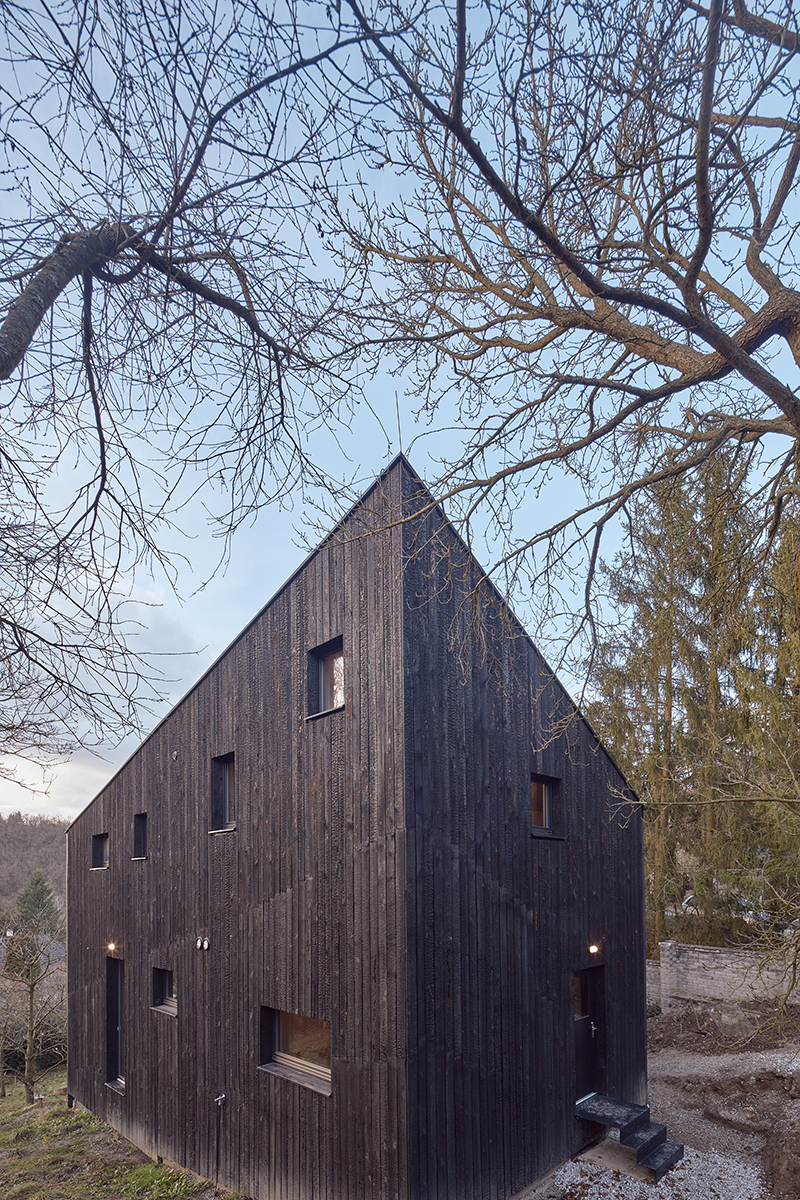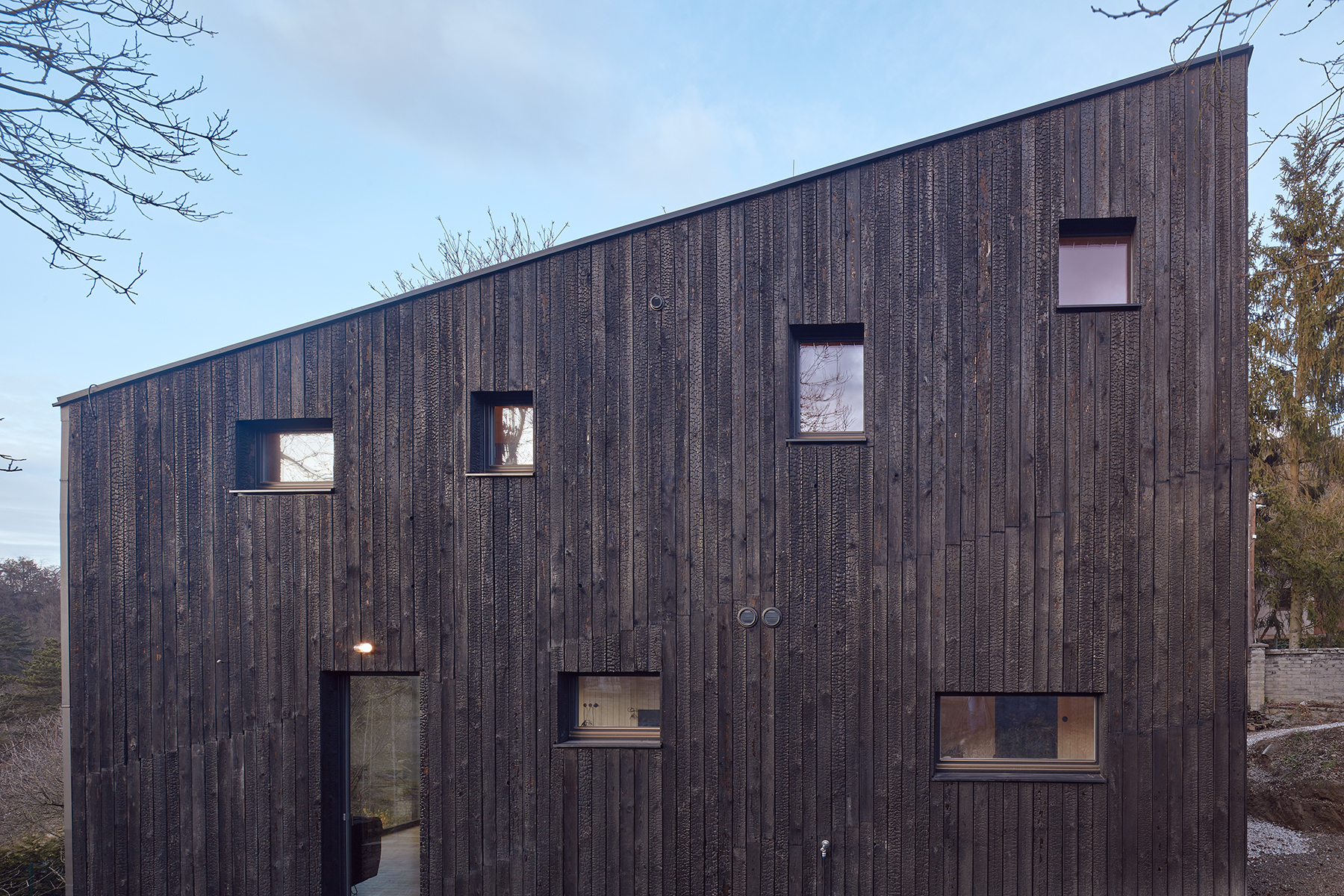 Dom s charakteristickou fasádou z opaľovaného dreva sa nachádza v stredočeskej obci Zadní Třebaň. Architekti sa pri navrhovaní museli riadiť reguláciou, ktorá predpisuje sedlovú strechu a dve obytné podlažia. Klesajúci štít strechy, spolu s voľnou kompozíciou okien vytvára kulisu pre netradičný Raumplan, využívajúci klesajúci terén.