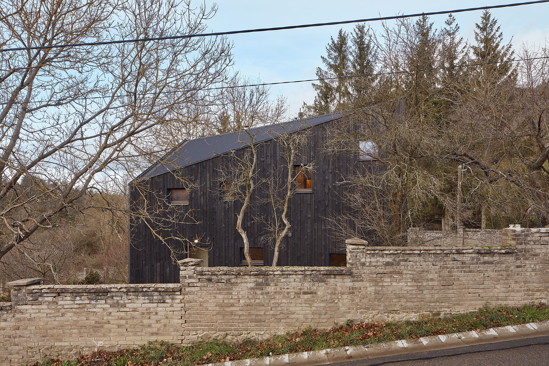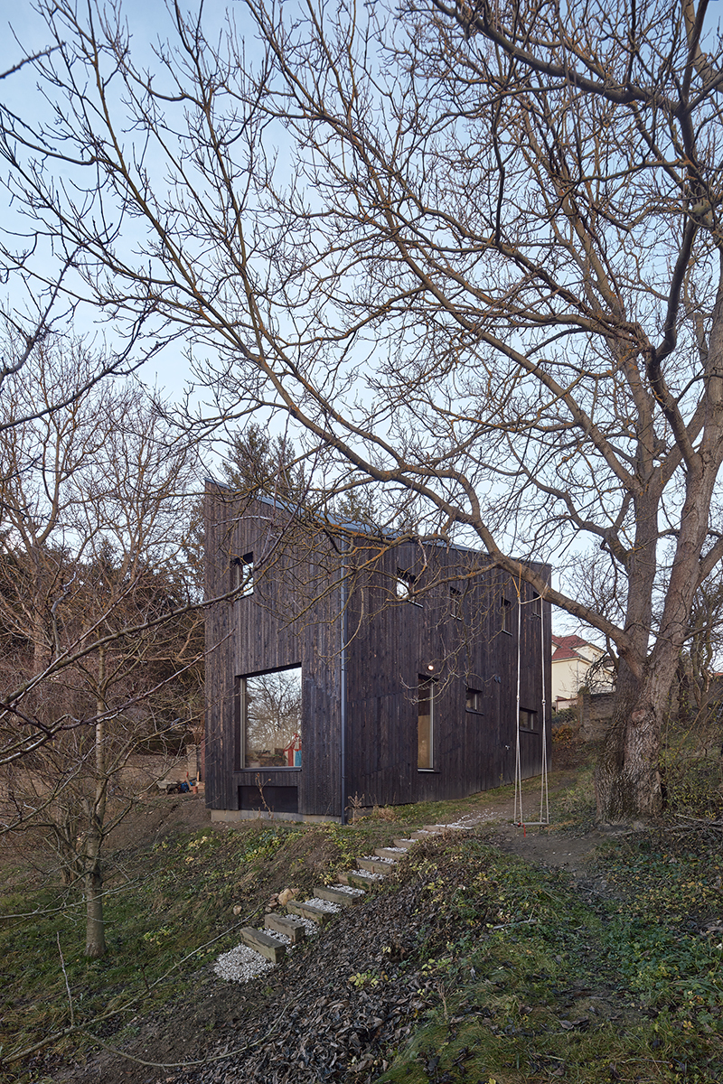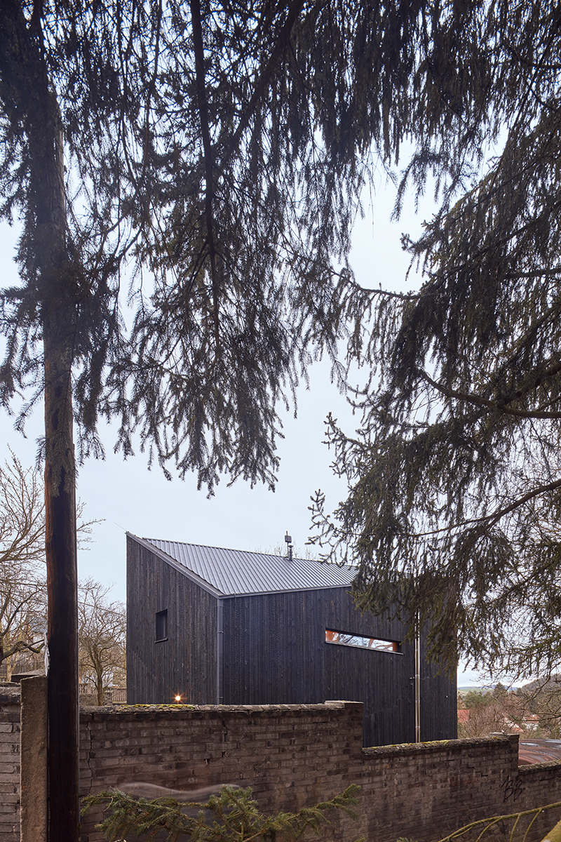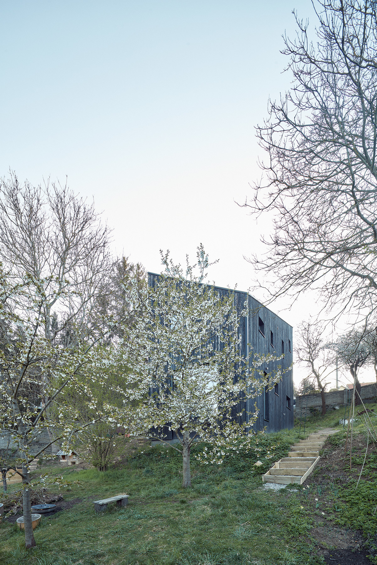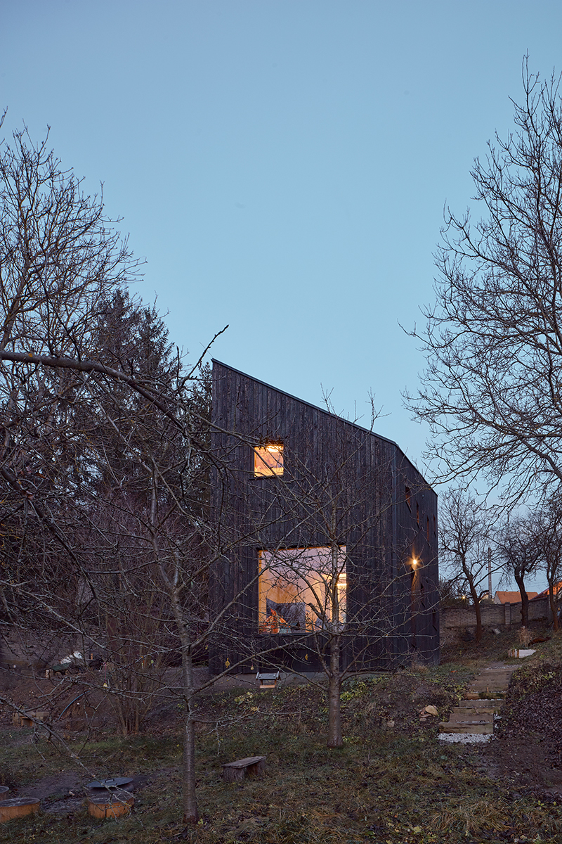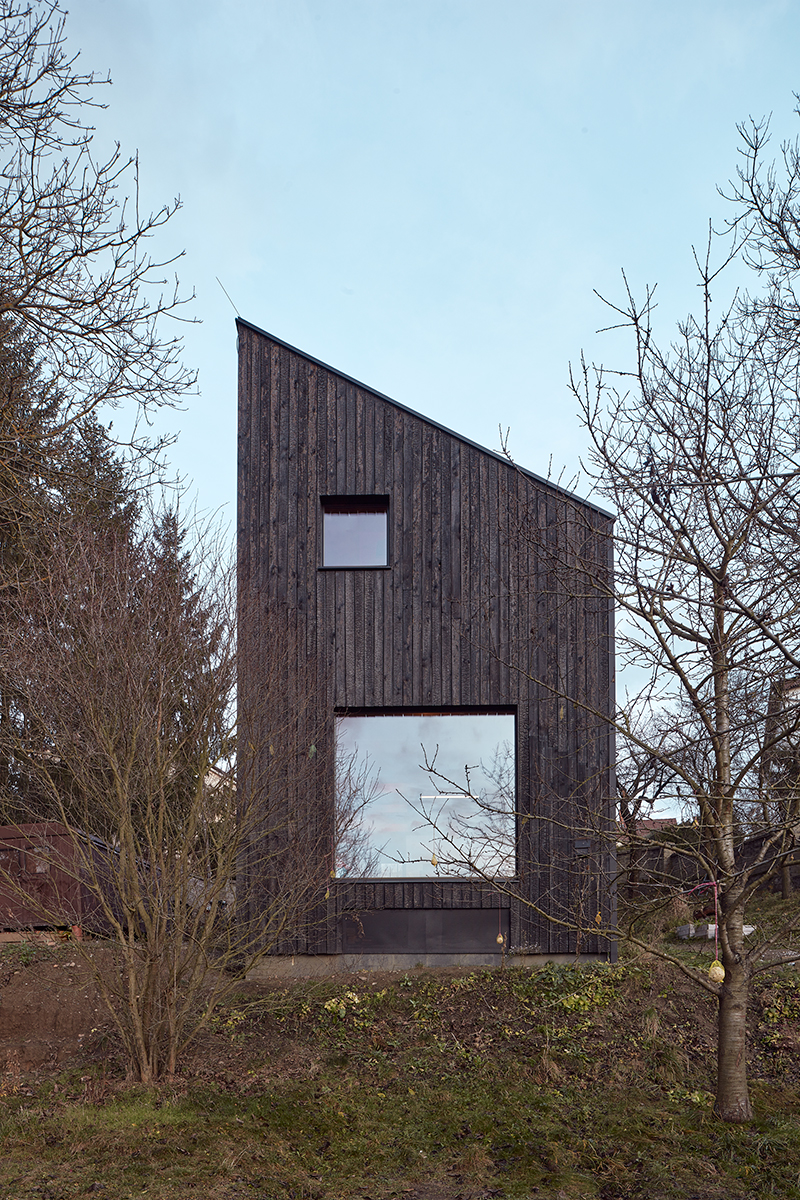Dom s charakteristickou fasádou z opaľovaného dreva sa nachádza v stredočeskej obci Zadní Třebaň. Architekti sa pri navrhovaní museli riadiť reguláciou, ktorá predpisuje sedlovú strechu a dve obytné podlažia. Klesajúci štít strechy, spolu s voľnou kompozíciou okien vytvára kulisu pre netradičný Raumplan, využívajúci klesajúci terén.