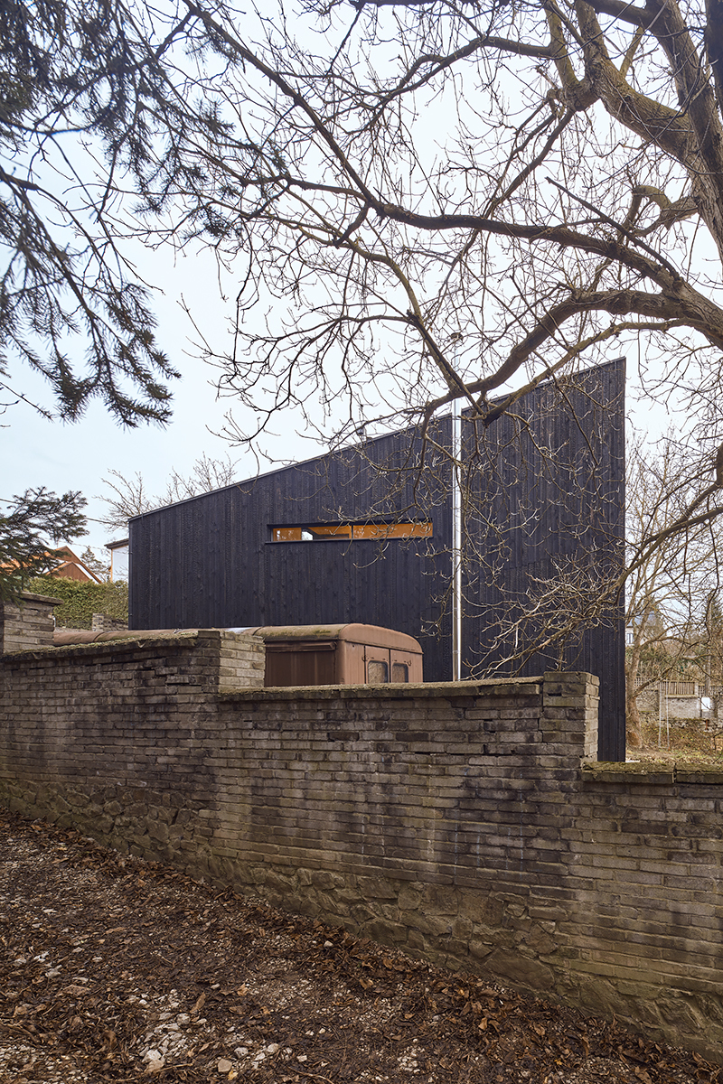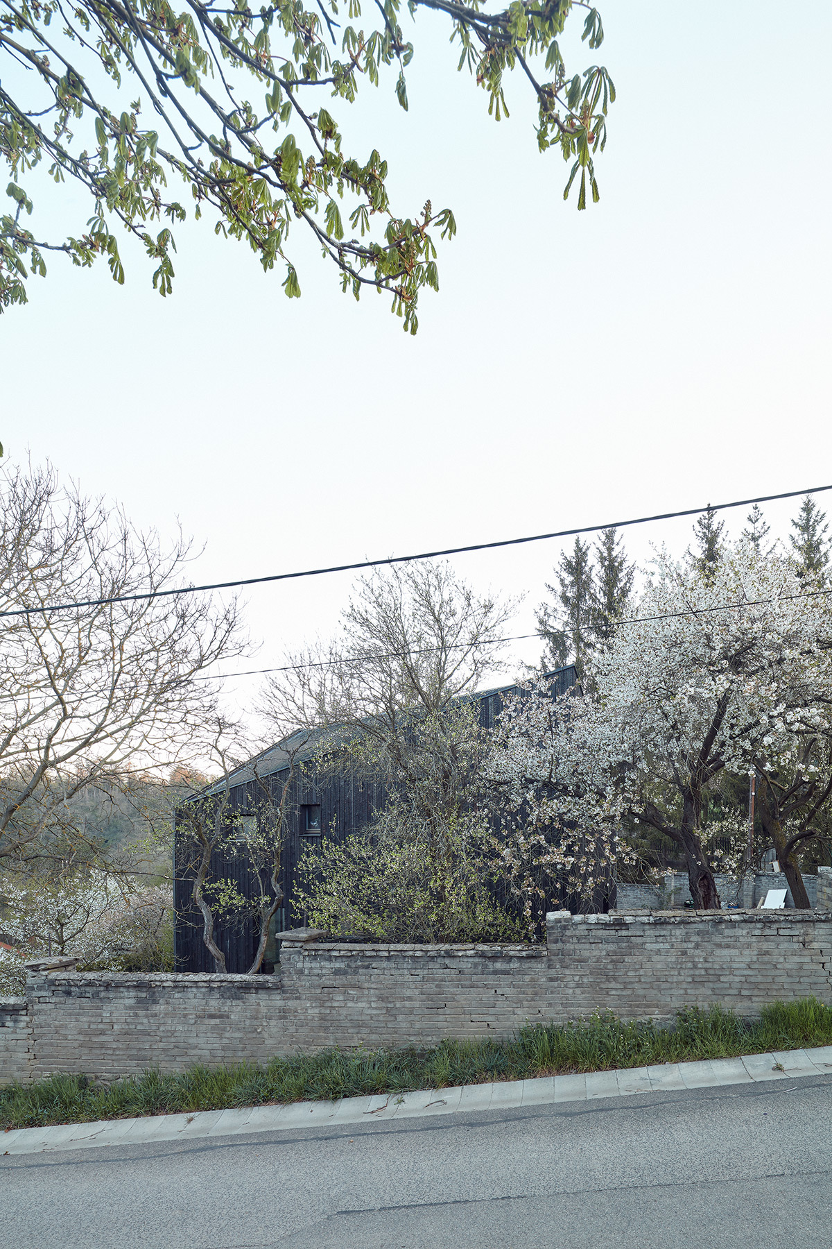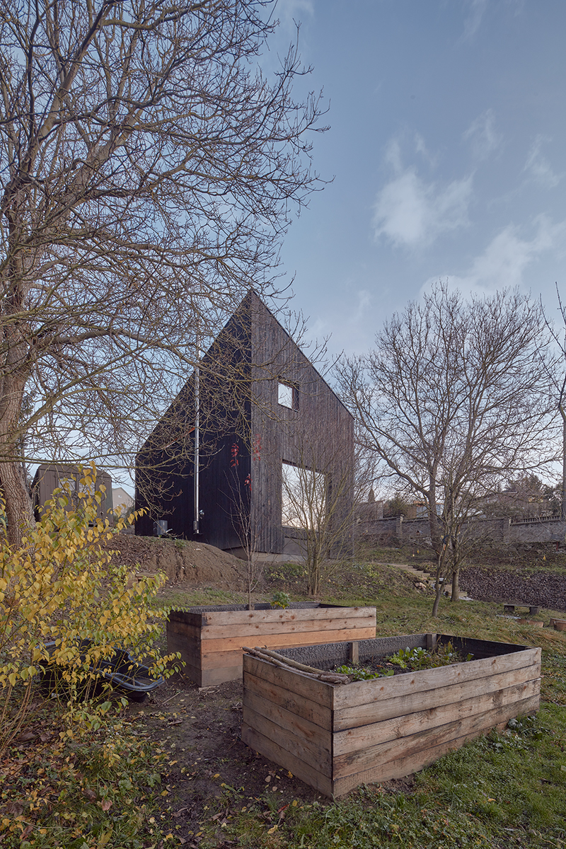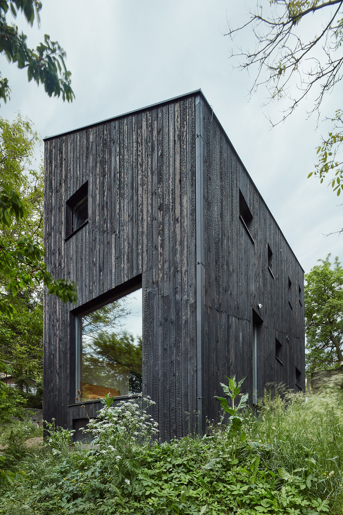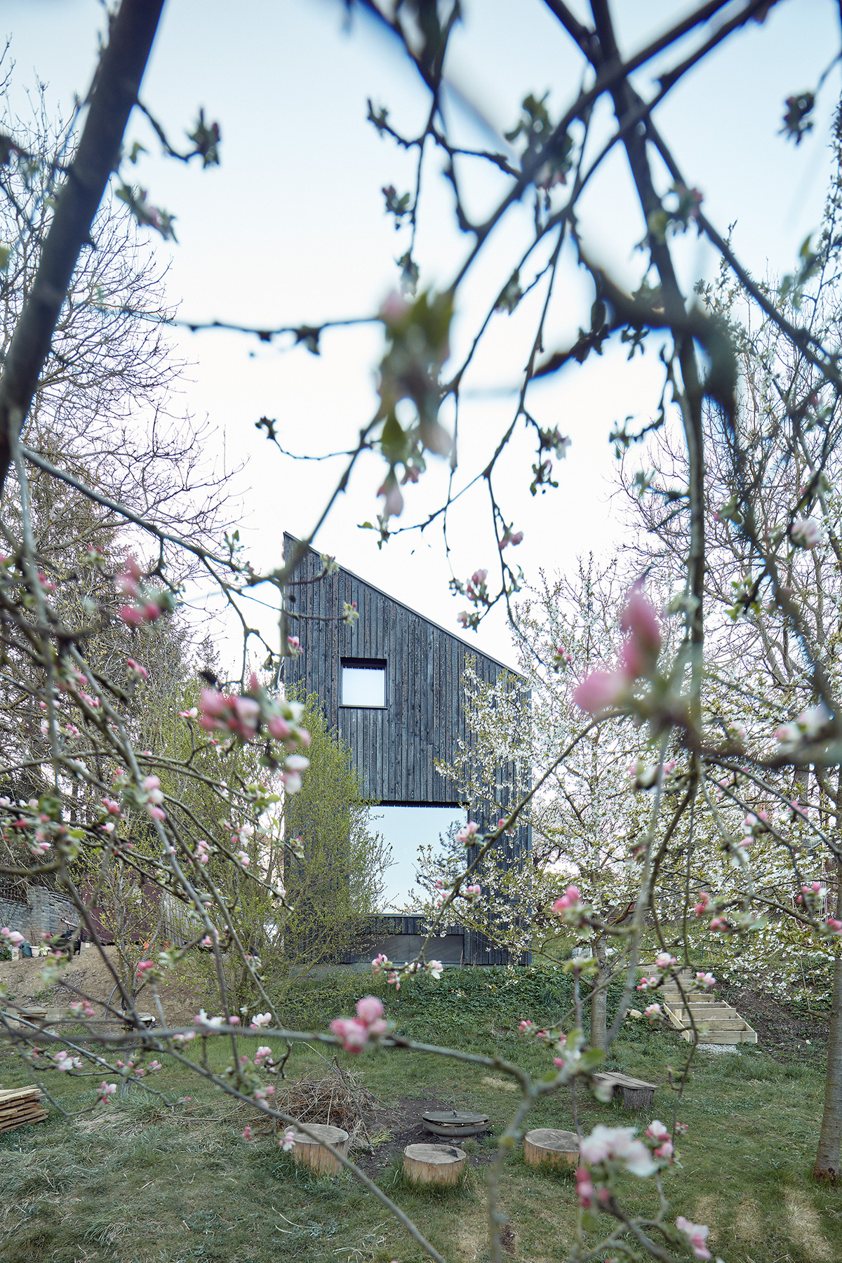 Dom s charakteristickou fasádou z opaľovaného dreva sa nachádza v stredočeskej obci Zadní Třebaň. Architekti sa pri navrhovaní museli riadiť reguláciou, ktorá predpisuje sedlovú strechu a dve obytné podlažia. Klesajúci štít strechy, spolu s voľnou kompozíciou okien vytvára kulisu pre netradičný Raumplan, využívajúci klesajúci terén.