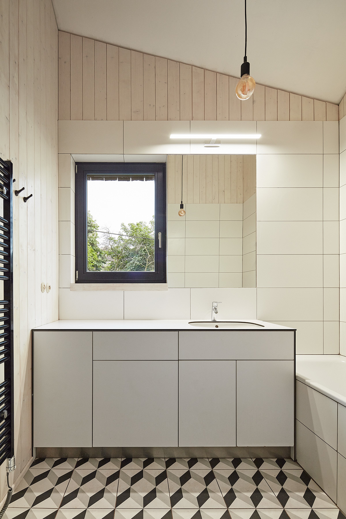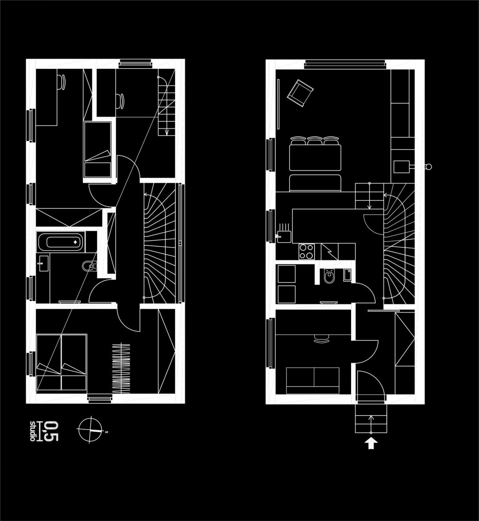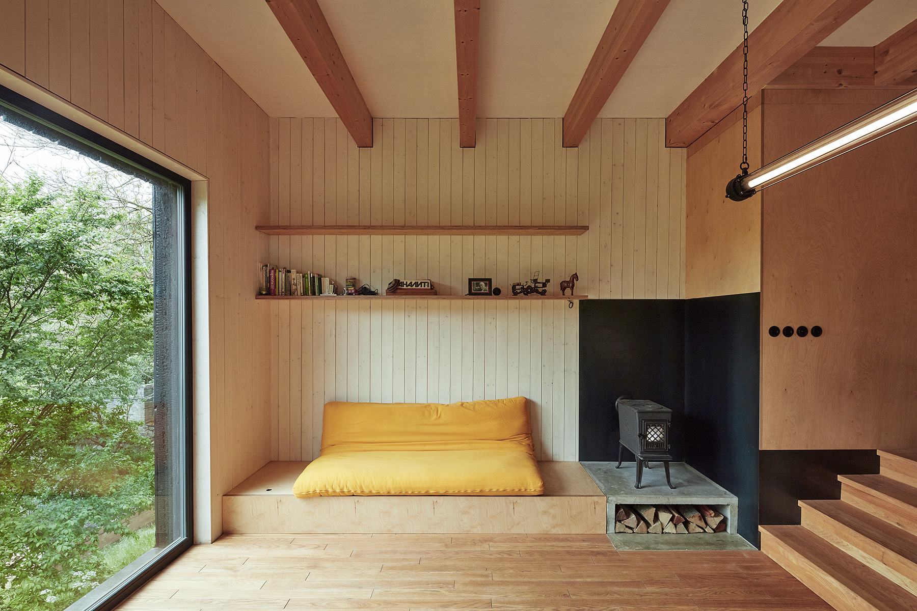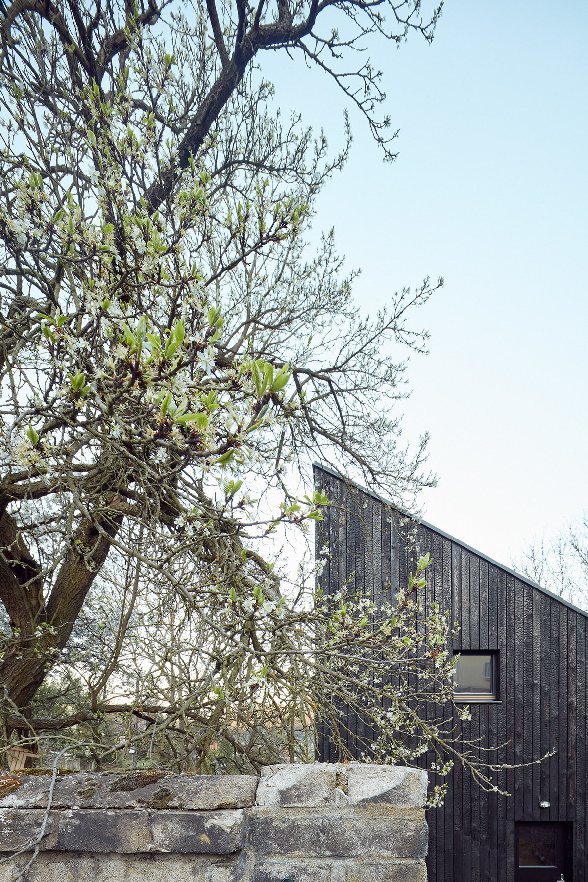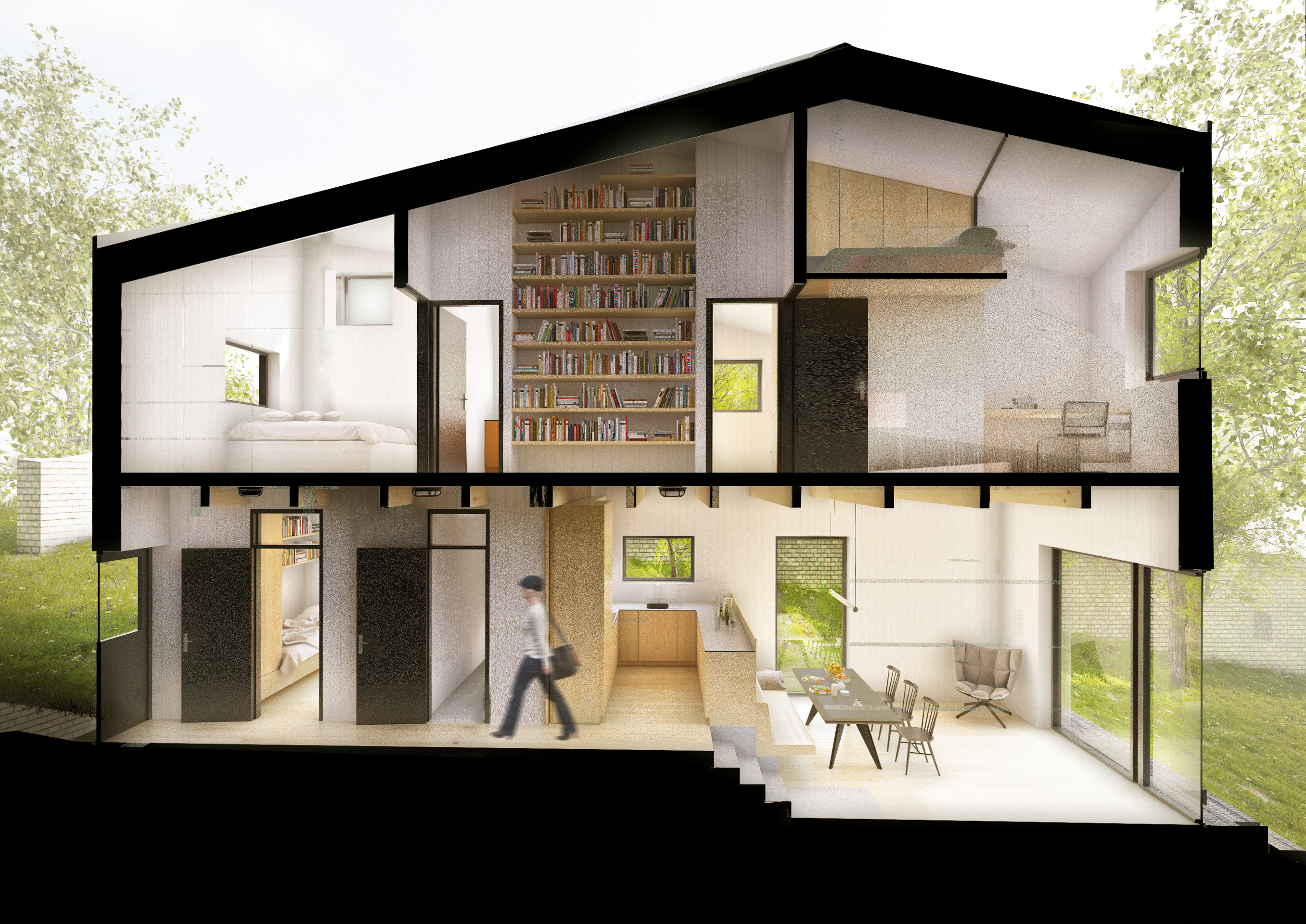 Dom s charakteristickou fasádou z opaľovaného dreva sa nachádza v stredočeskej obci Zadní Třebaň. Architekti sa pri navrhovaní museli riadiť reguláciou, ktorá predpisuje sedlovú strechu a dve obytné podlažia. Klesajúci štít strechy, spolu s voľnou kompozíciou okien vytvára kulisu pre netradičný Raumplan, využívajúci klesajúci terén.