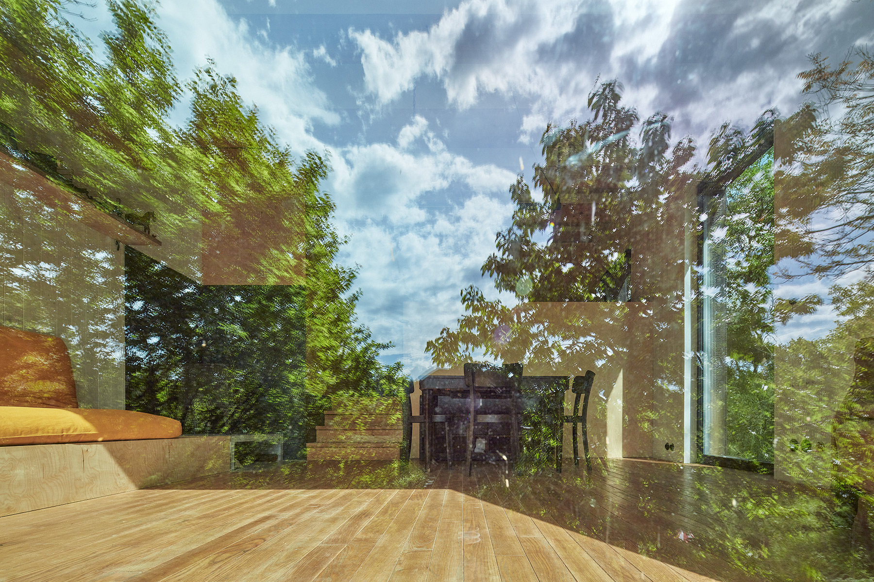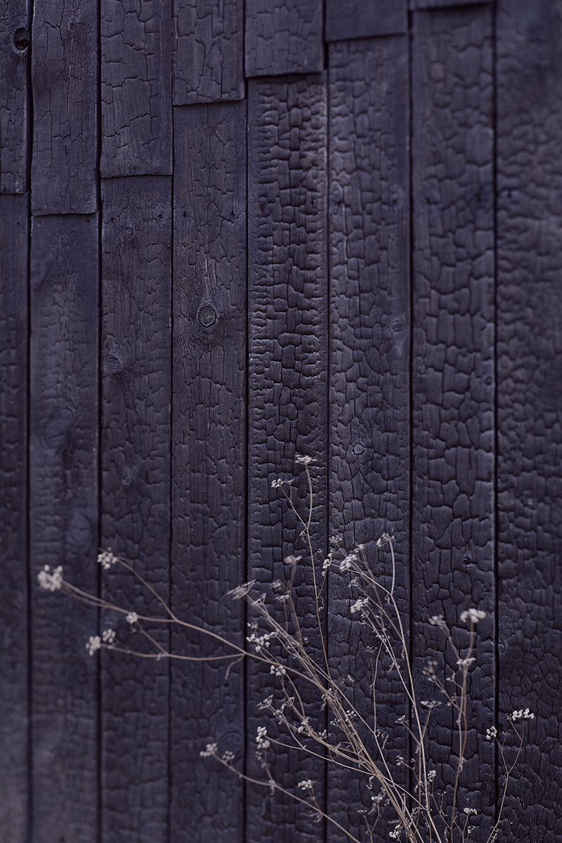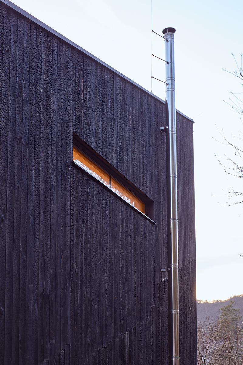 Drevo na fasáde je ošetrené tradičnou japonskou metódou Shou-sugi-ban. Trojica dosiek, zviazaných do komína, bola na niekoľko sekúnd vystavená plameňom, následne poliata vodou a napustená ľanovým olejom. Opaľovanie vykonával sám investor. S fasádou korešponduje čierna strešná krytina.