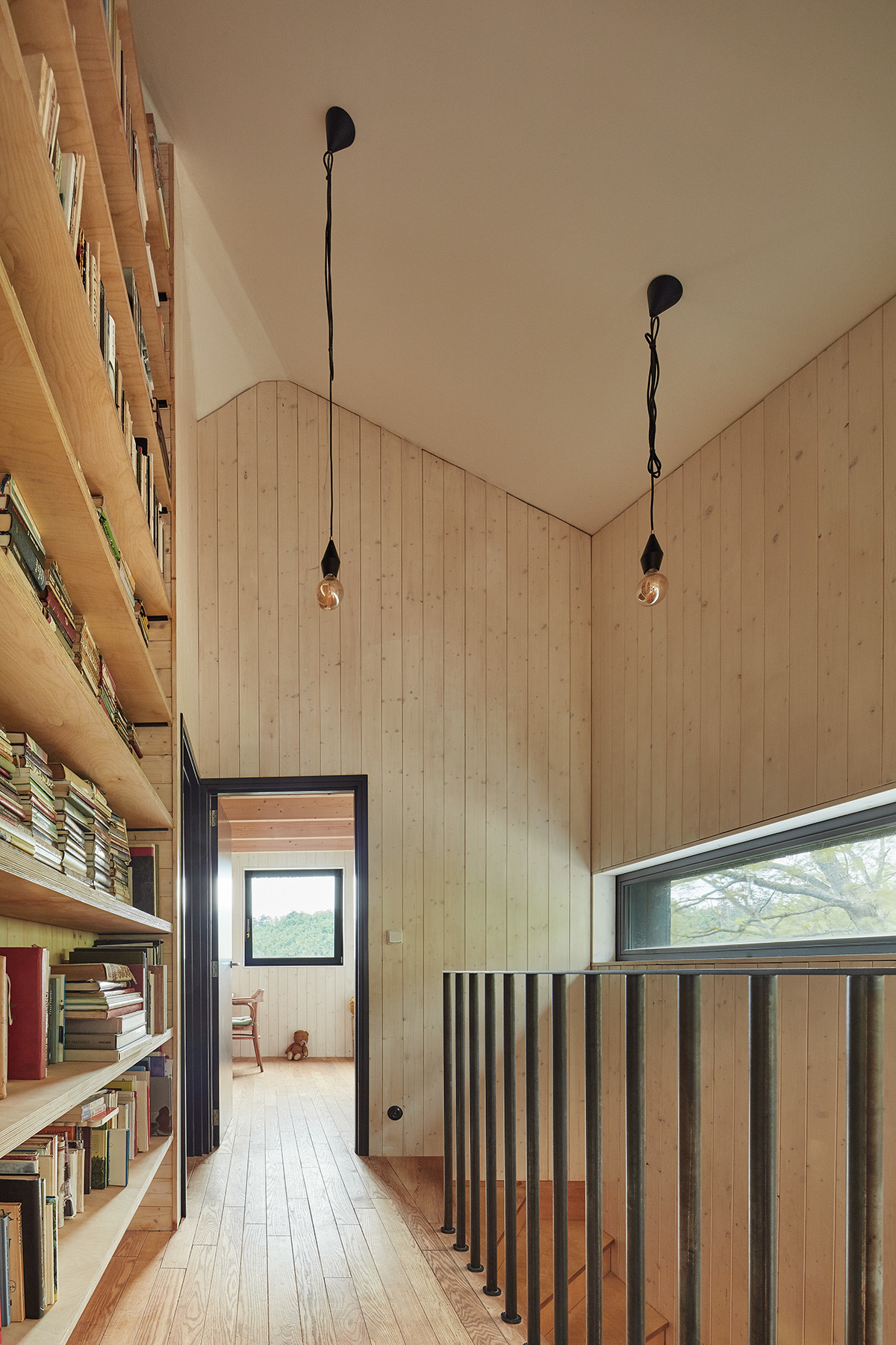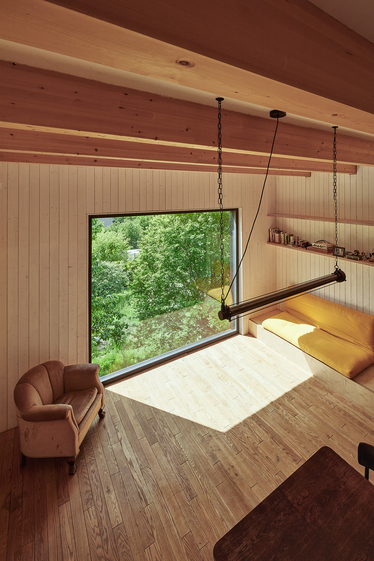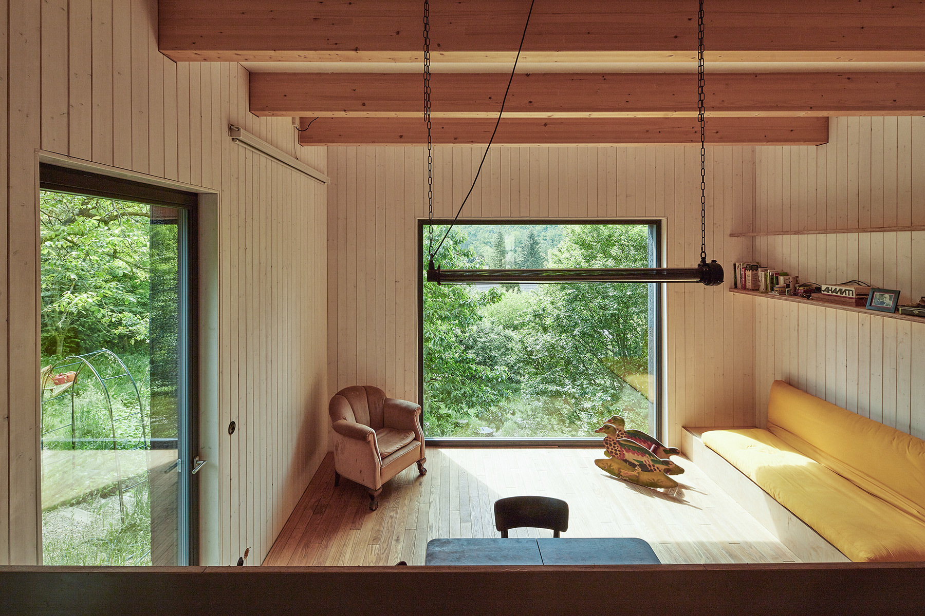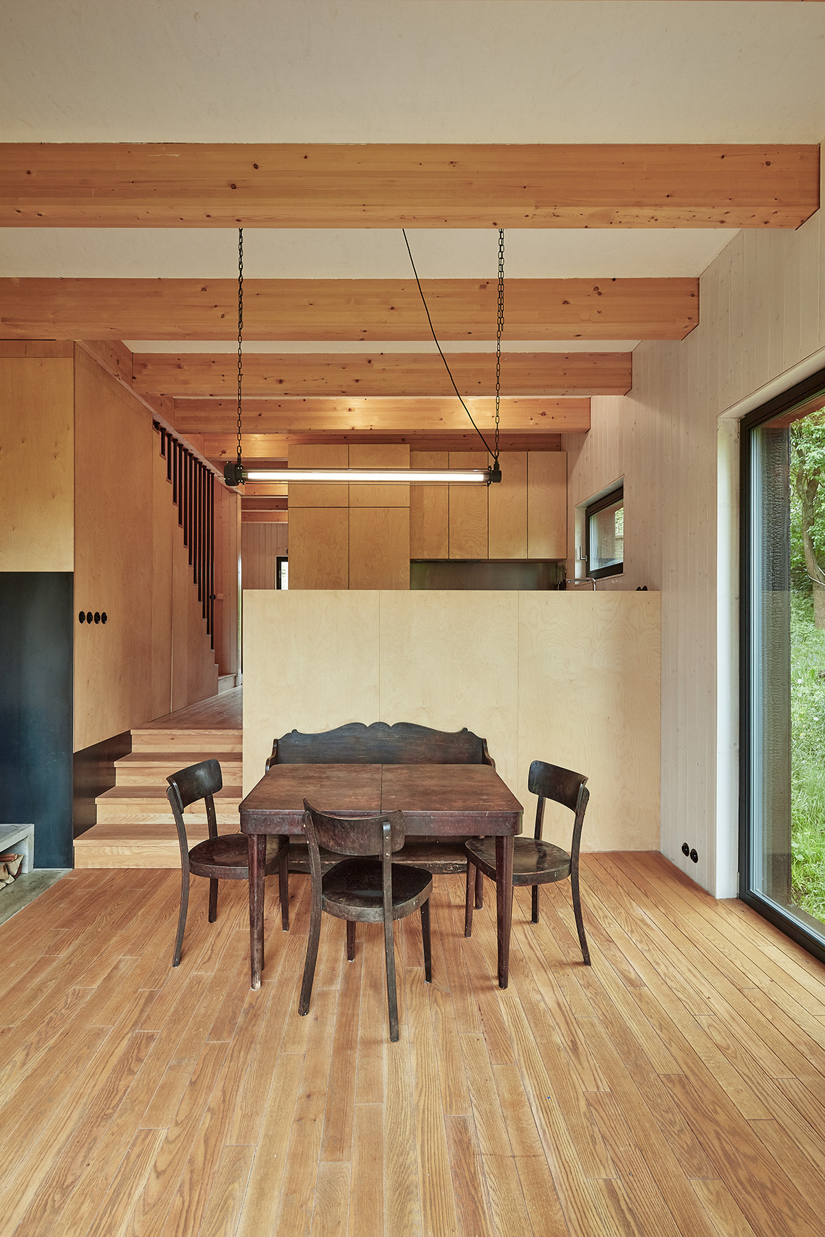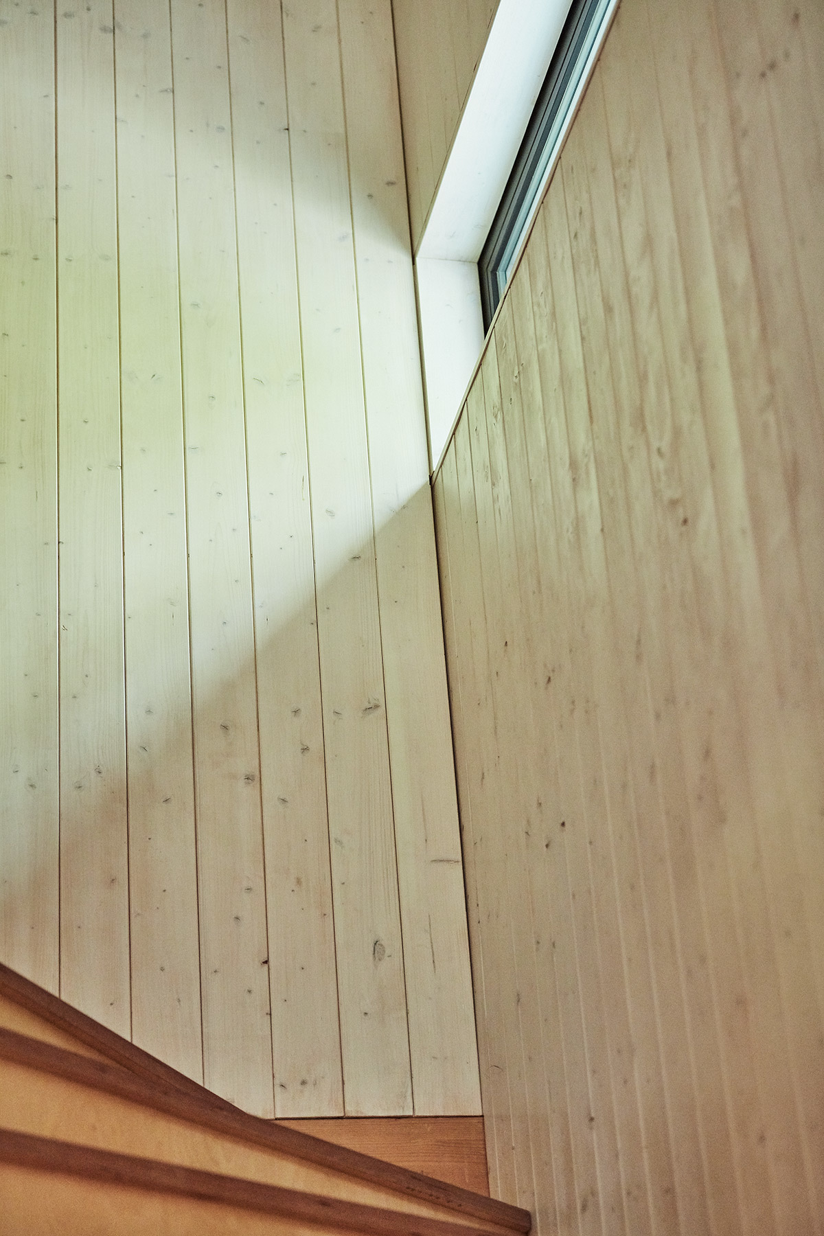 Drevená konštrukcia stavby sa materiálovo prepísala aj do stvárnenia interiéru. Dubové podlahy dopĺňajú povrchy stien zo smrekovej palubovky, ošetrené bielou lazúrou. Nábytok navrhli architekti z brezovej preglejky. Dvere, okná, svietidlá, vypínače, zábradlia a ďalšie prvky sú čierne. Dom vrátane interiéru sa podarilo zrealizovať podľa pôvodnej koncepcie.