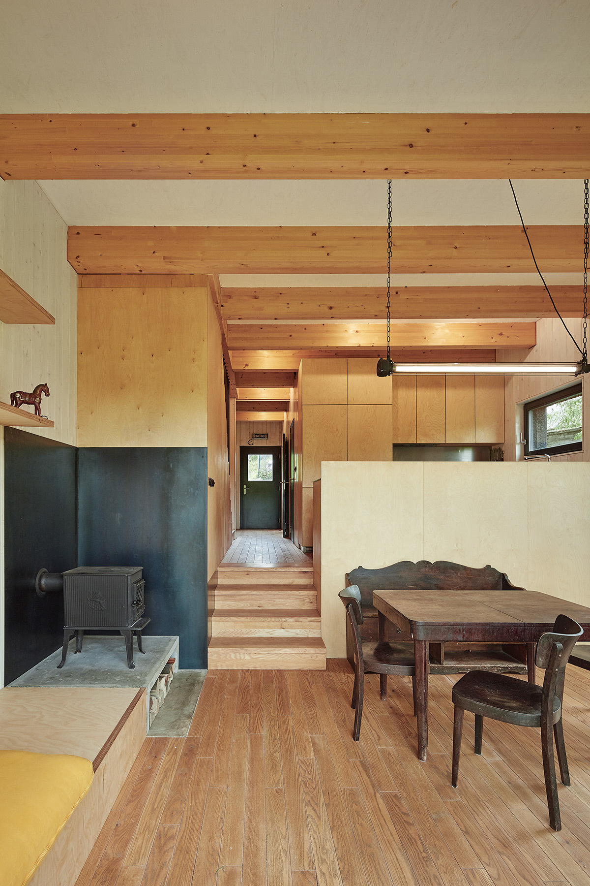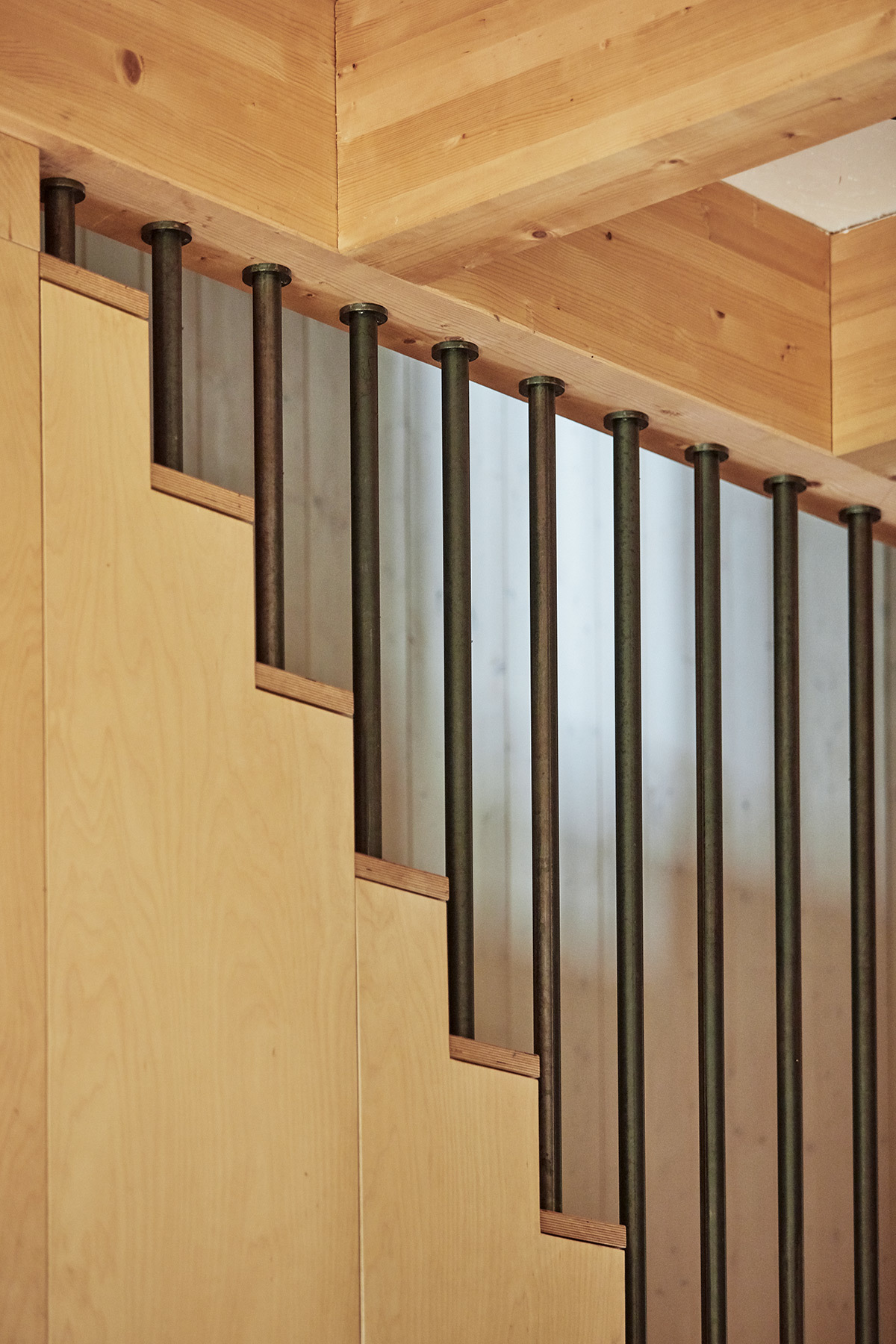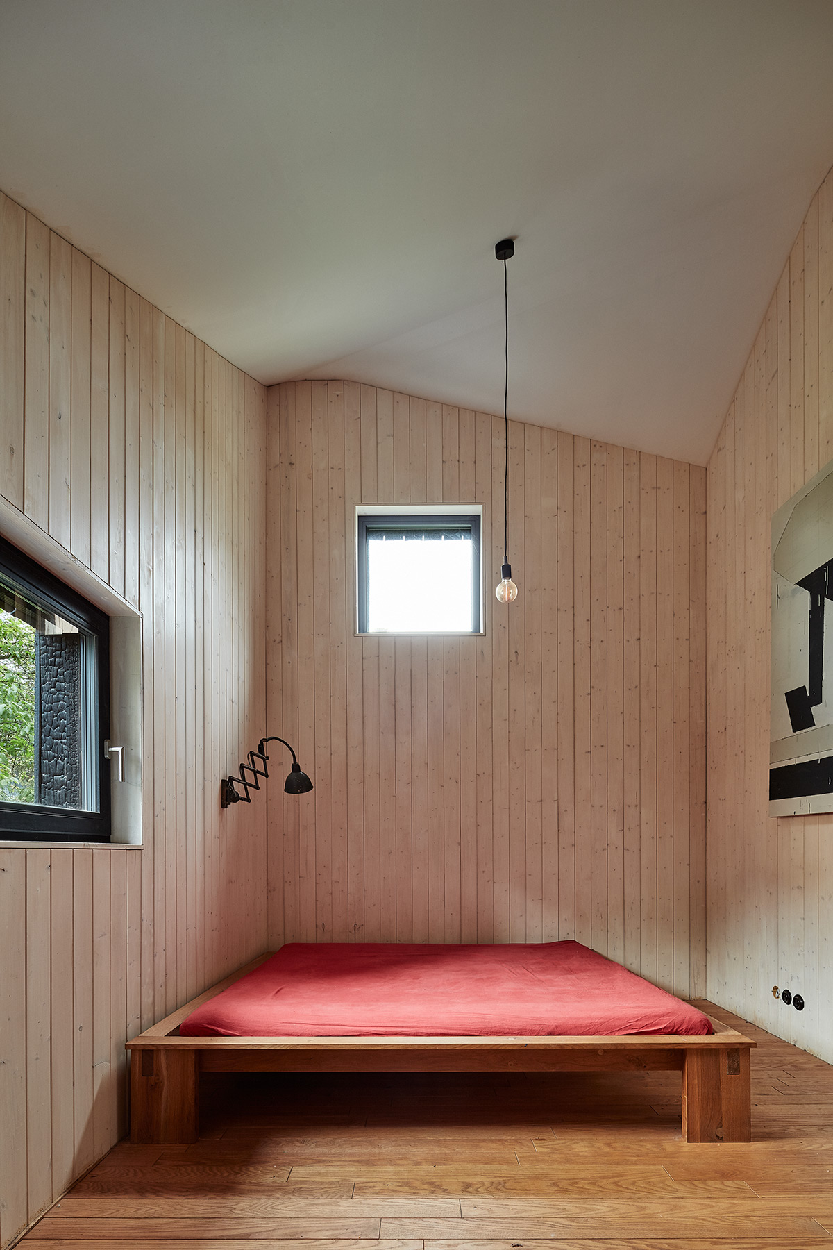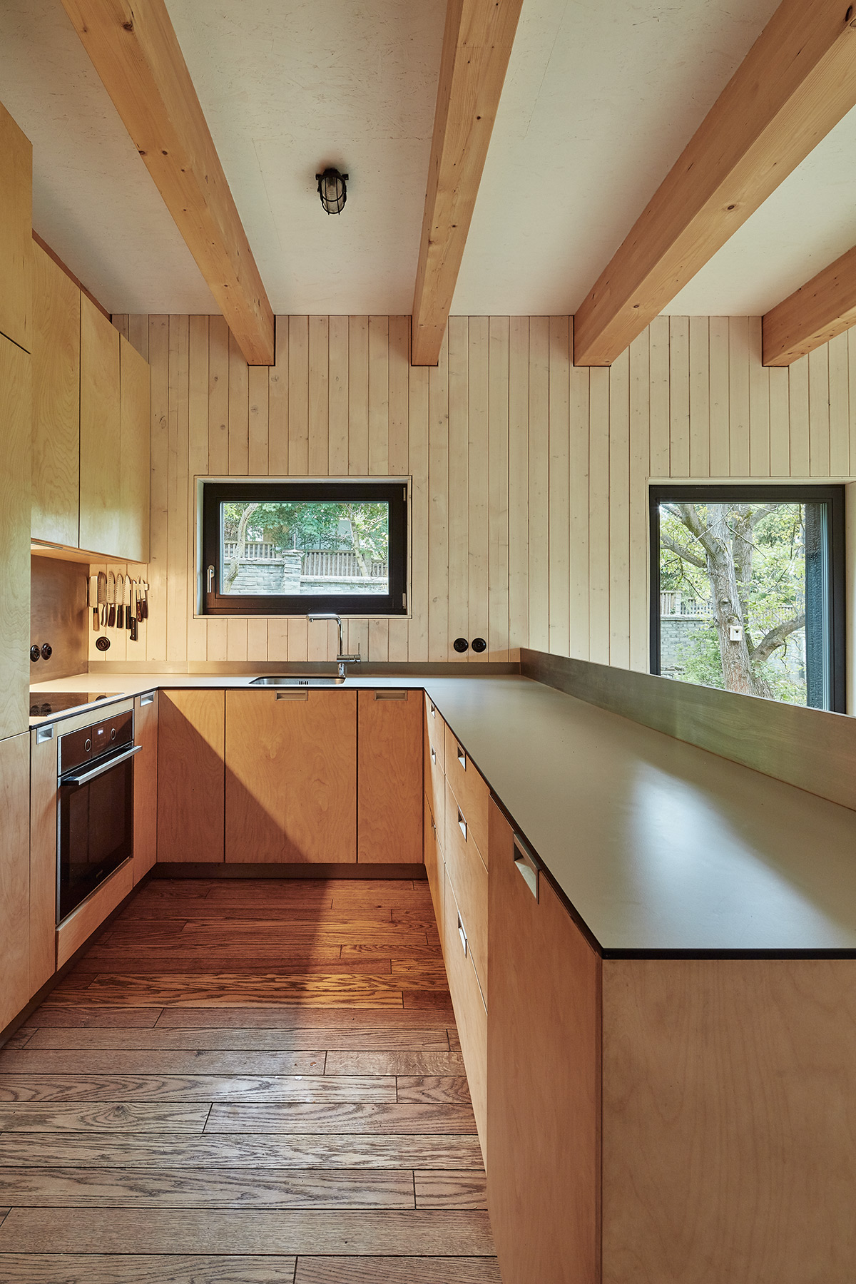 Drevená konštrukcia stavby sa materiálovo prepísala aj do stvárnenia interiéru. Dubové podlahy dopĺňajú povrchy stien zo smrekovej palubovky, ošetrené bielou lazúrou. Nábytok navrhli architekti z brezovej preglejky. Dvere, okná, svietidlá, vypínače, zábradlia a ďalšie prvky sú čierne. Dom vrátane interiéru sa podarilo zrealizovať podľa pôvodnej koncepcie.