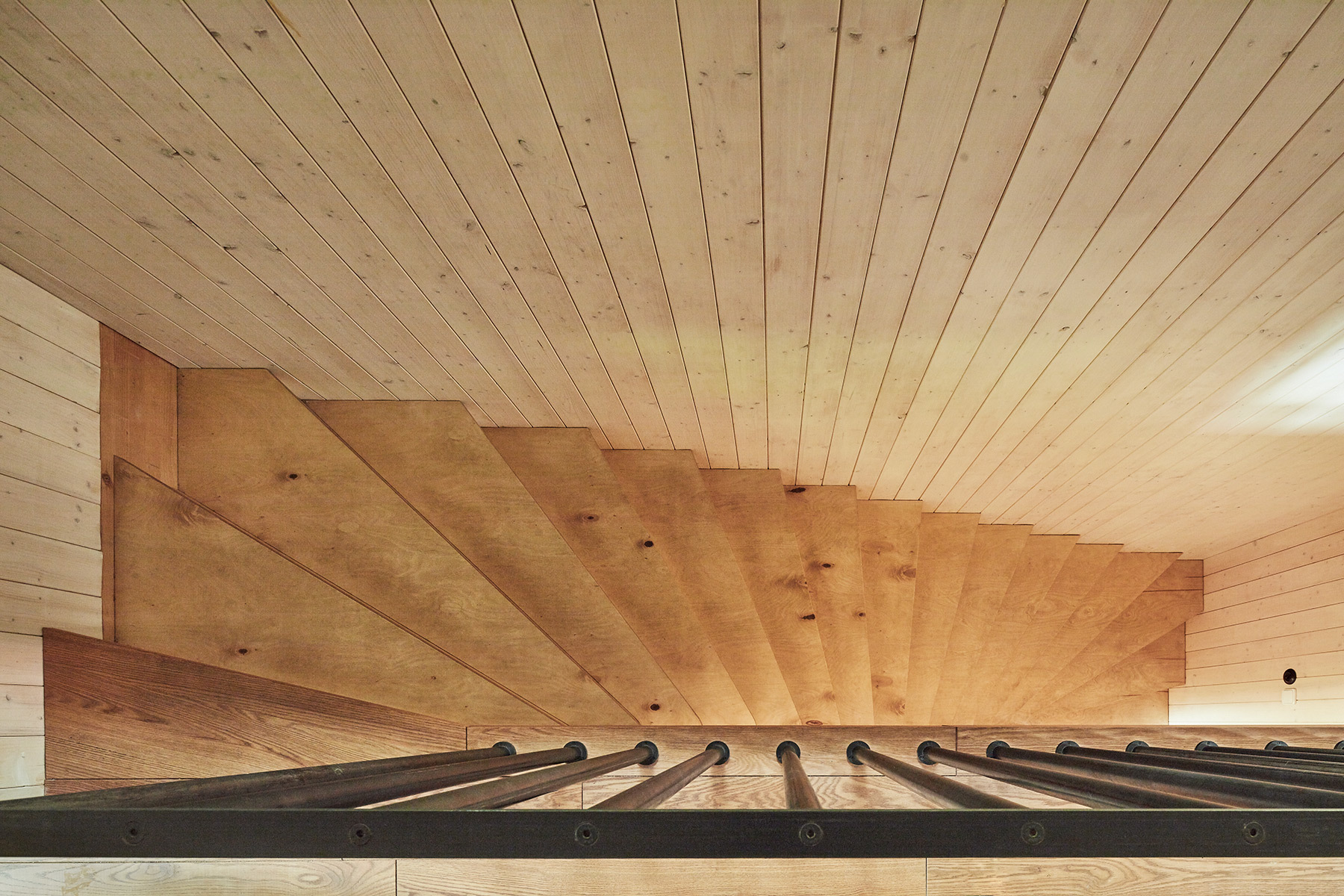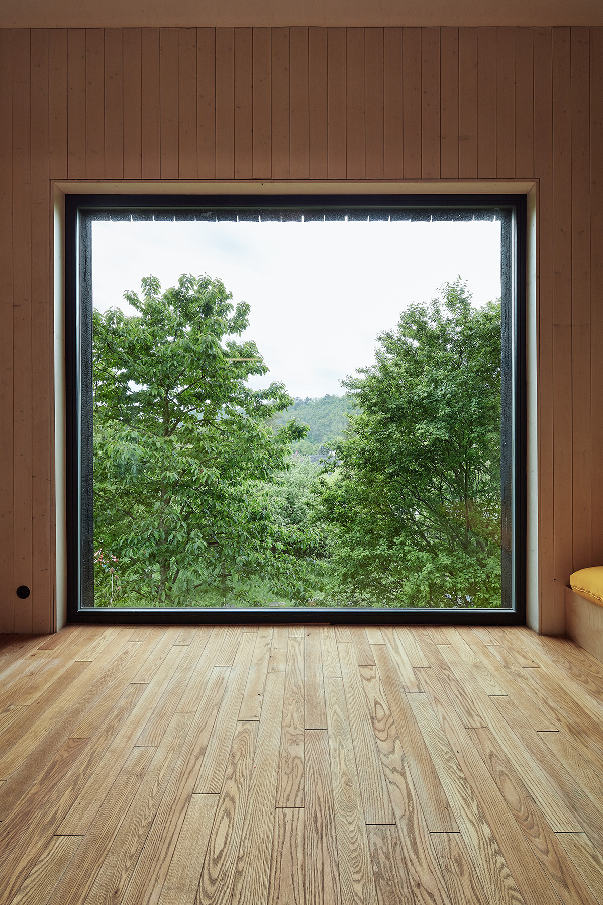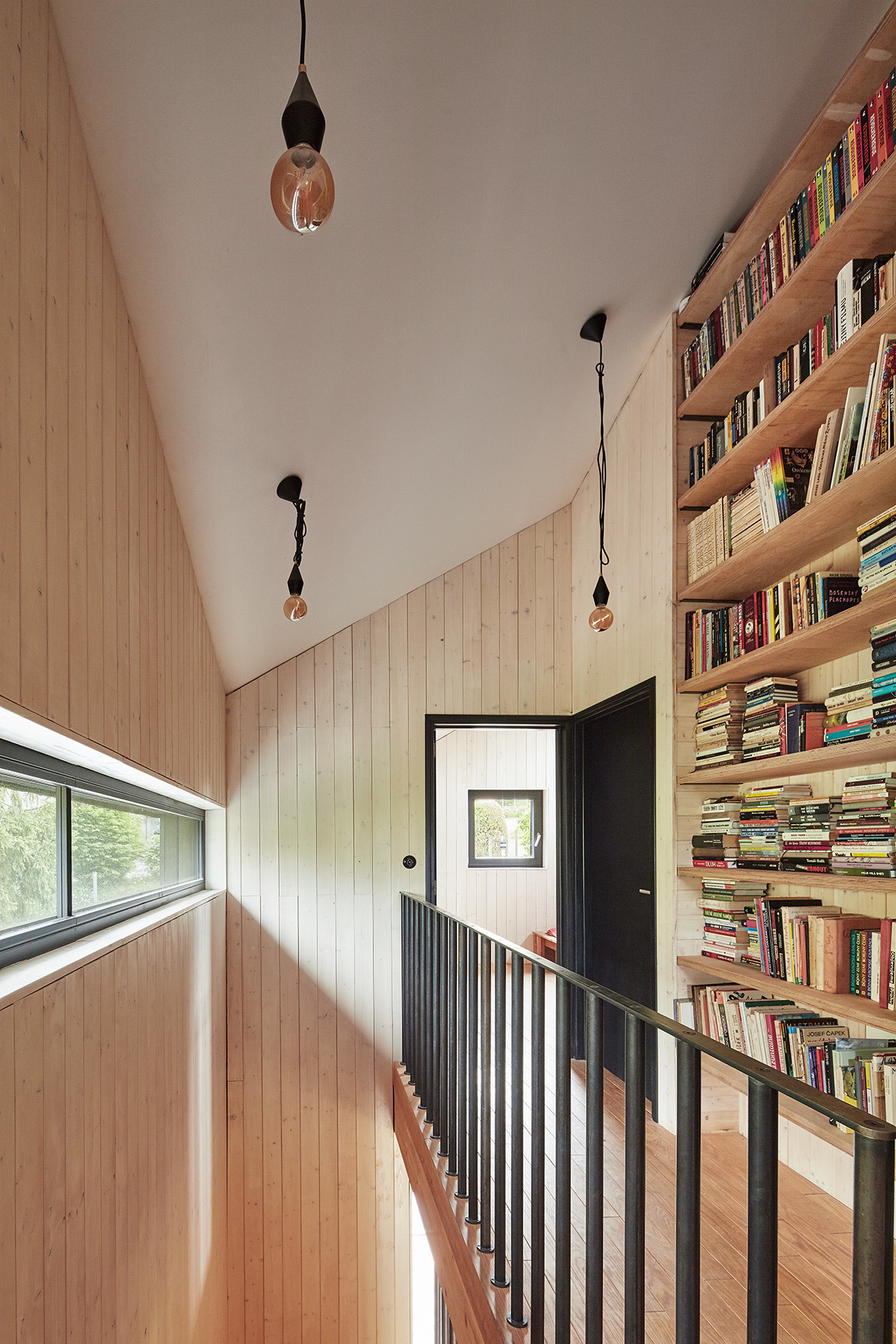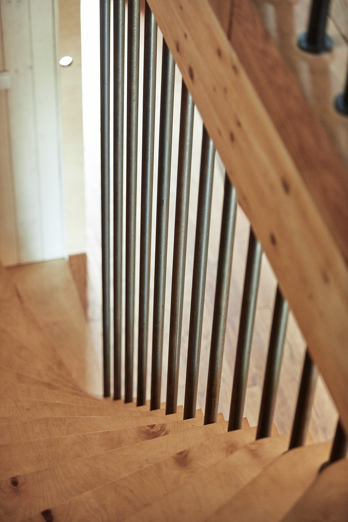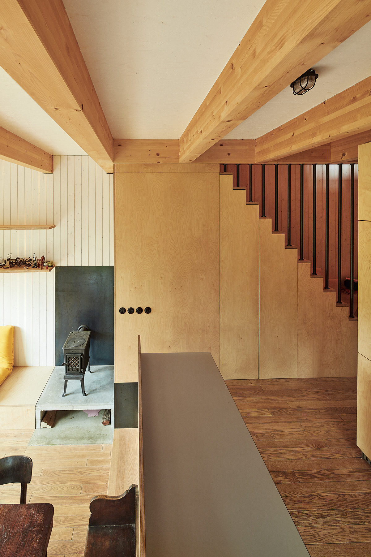 Drevená konštrukcia stavby sa materiálovo prepísala aj do stvárnenia interiéru. Dubové podlahy dopĺňajú povrchy stien zo smrekovej palubovky, ošetrené bielou lazúrou. Nábytok navrhli architekti z brezovej preglejky. Dvere, okná, svietidlá, vypínače, zábradlia a ďalšie prvky sú čierne. Dom vrátane interiéru sa podarilo zrealizovať podľa pôvodnej koncepcie.