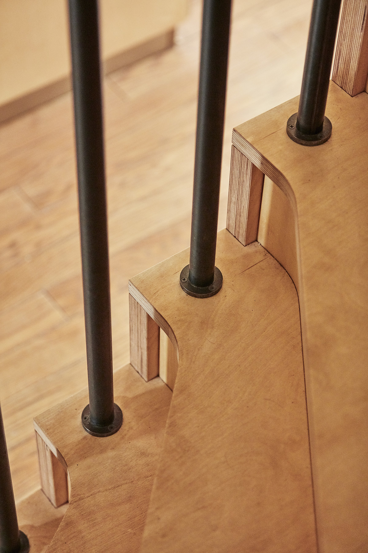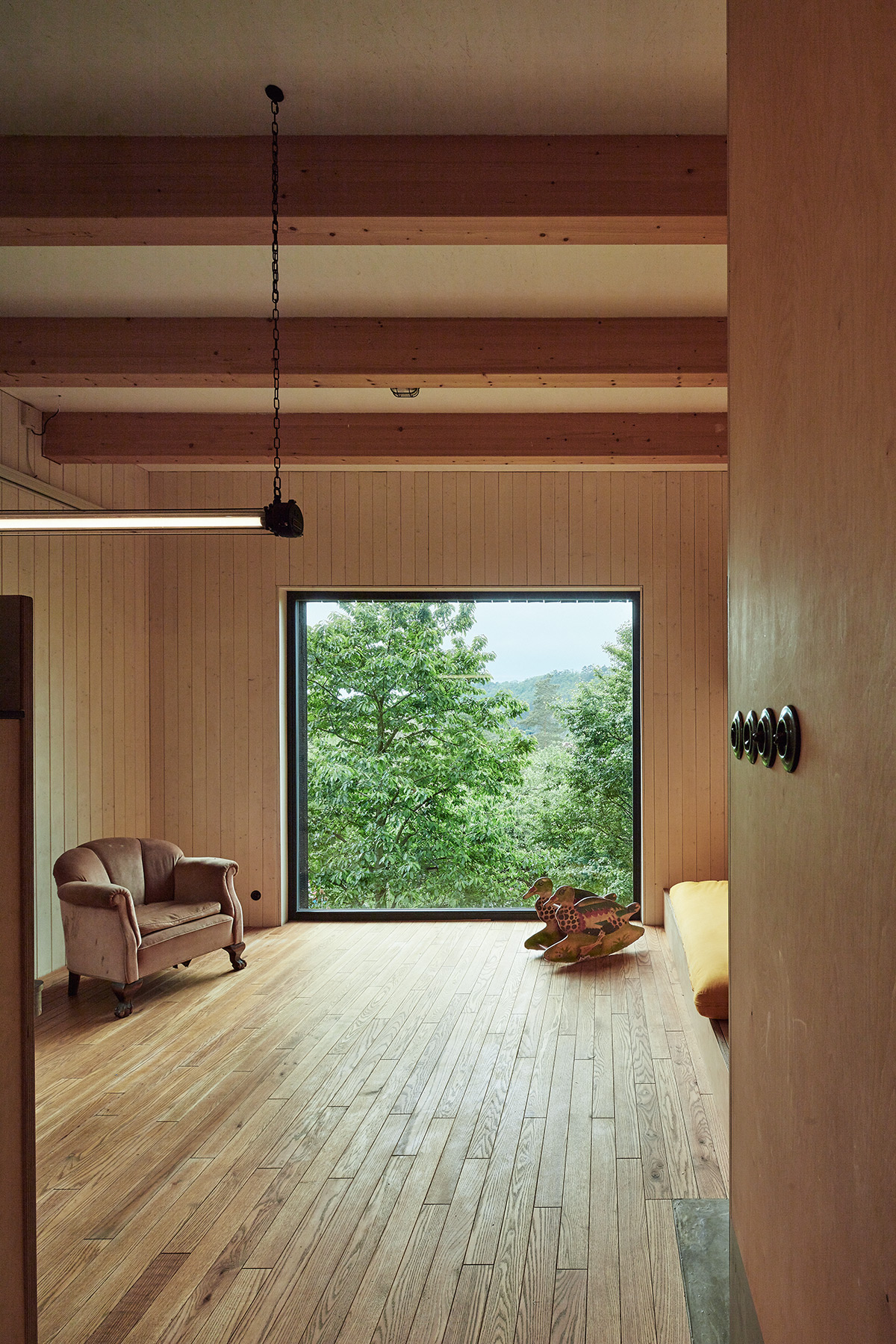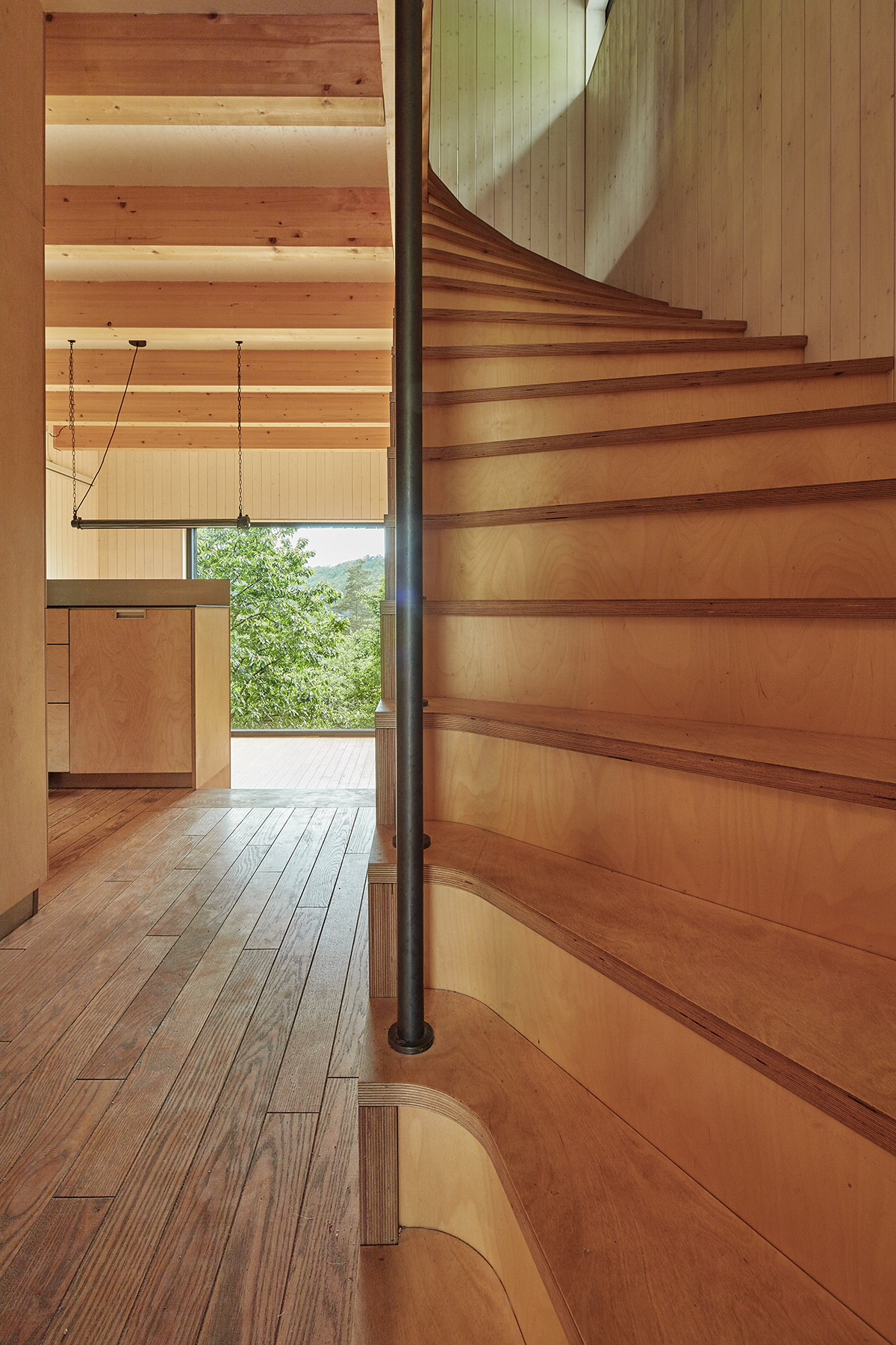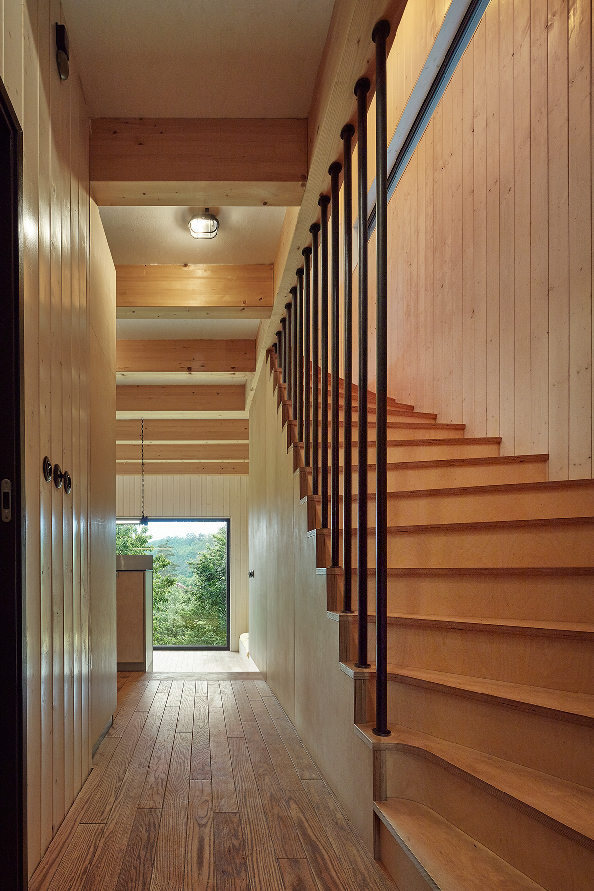 Drevená konštrukcia stavby sa materiálovo prepísala aj do stvárnenia interiéru. Dubové podlahy dopĺňajú povrchy stien zo smrekovej palubovky, ošetrené bielou lazúrou. Nábytok navrhli architekti z brezovej preglejky. Dvere, okná, svietidlá, vypínače, zábradlia a ďalšie prvky sú čierne. Dom vrátane interiéru sa podarilo zrealizovať podľa pôvodnej koncepcie.