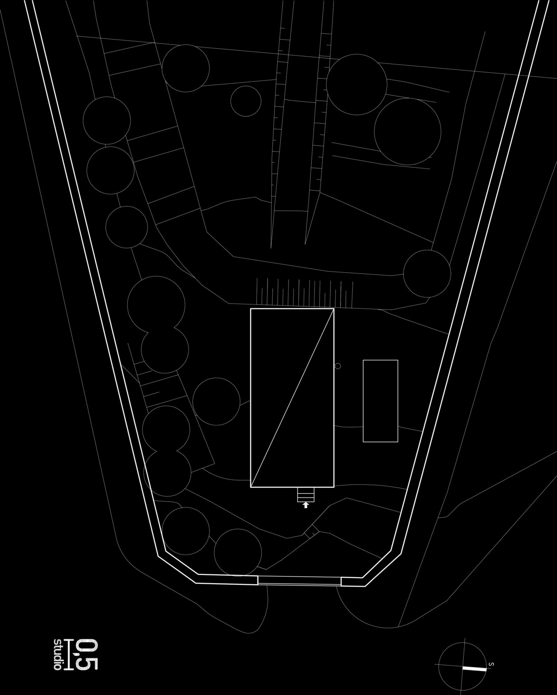 Dom s obdĺžnikovým pôdorysom je situovaný vo vrchnej časti svahovitého pozemku bývalého sadu, ukrytého za tehlovým múrom. Minimálne úpravy terénu a materiál fasády pomáhajú k začleneniu stavby do prírodného prostredia. Svahovitý pozemok formoval priestorovú a prevádzkovú schému domu.