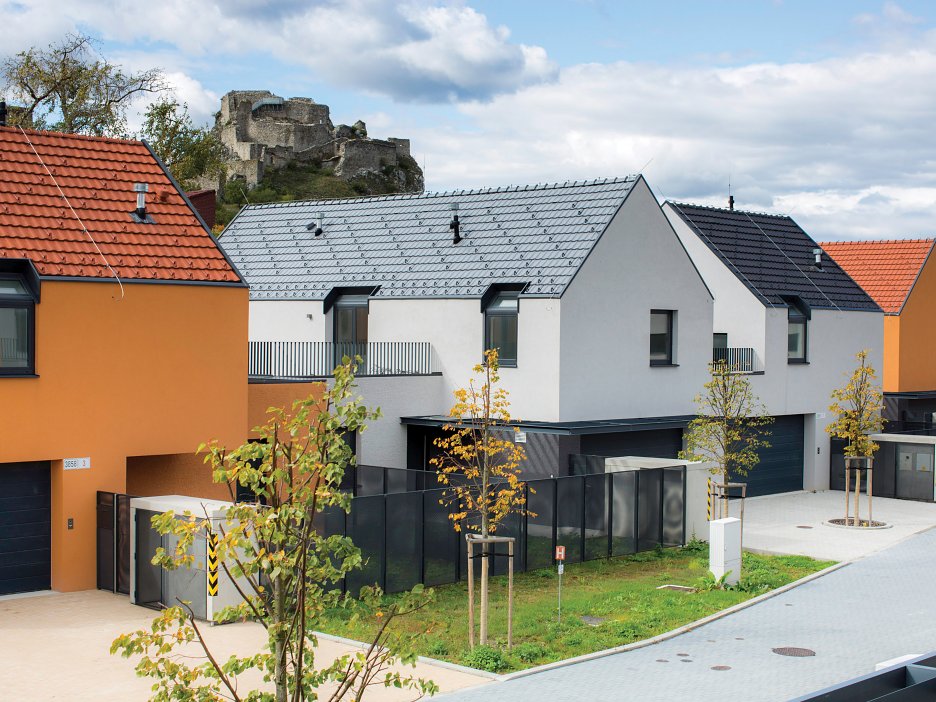 PM: Stavebná komisia aj pamiatkári neboli nastavení veľmi progresívne. Pôvodne sme chceli moderné domy s plochými strechami, veľkými preskleniami a prirodzenou materialitou fasád z betónu, kameňa a dreva, s kamennou dlažbou ulice. V spojení s investičnými nárokmi investora sme nakoniec radi, že sme uhrali viac farieb a štruktúr omietky, viac farieb strešnej krytiny - hoci iba povinnej škridly. Strešná krajina Devína zďaleka nie je farebne homogénna ako toskánske sídla, práve kakofónia farebnosti striech vytvára v konečnom dôsledku harmóniu celkovej veduty. Ale zo šikmých striech nie sme mrzutí, aj keď snaha zachovať archetyp domu so šikmou strechou v rovnakej materialite stien a strechy sa zredukovala len na uplatnenie detailu zaatikového žľabu bez prečnievajúcich krokiev.