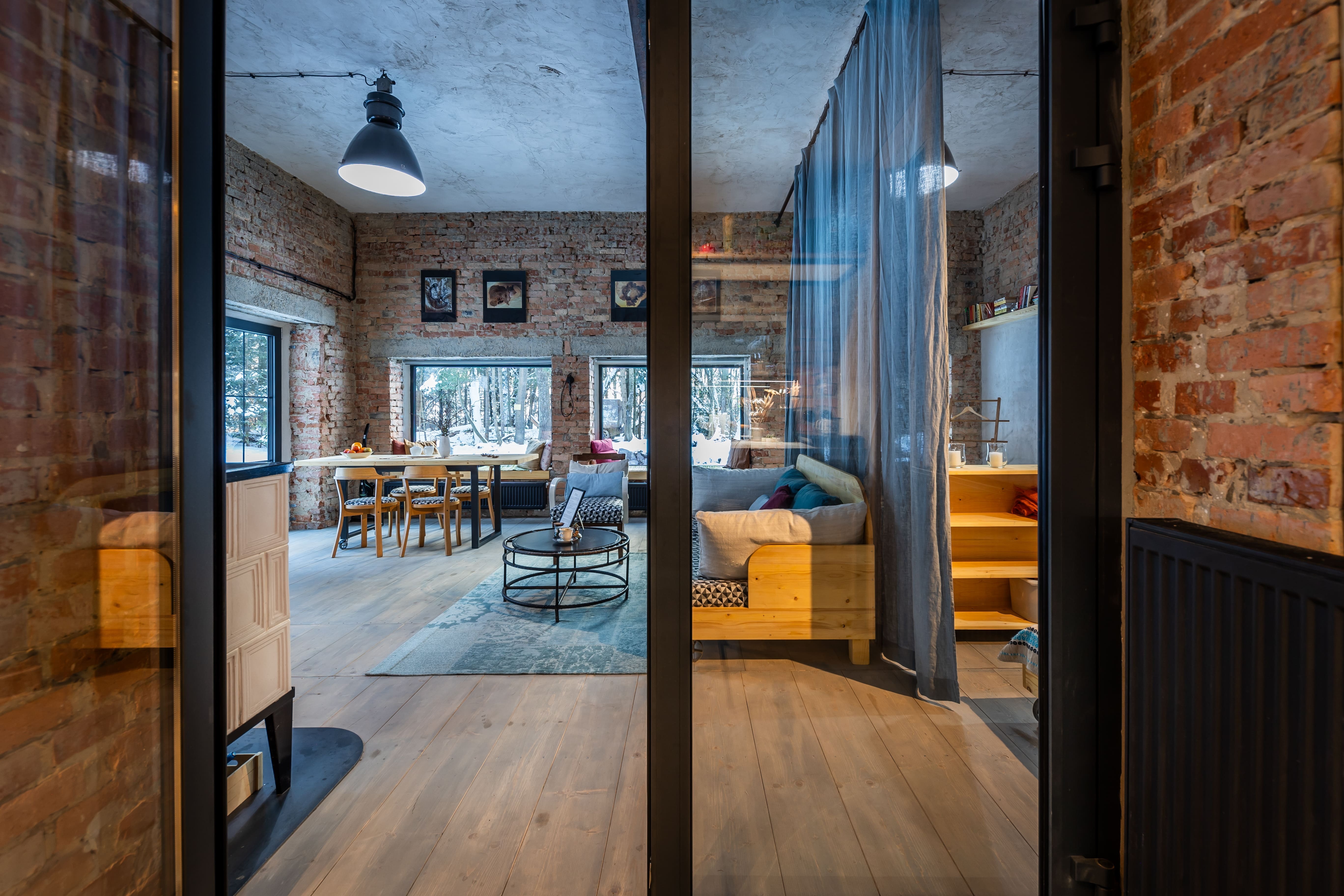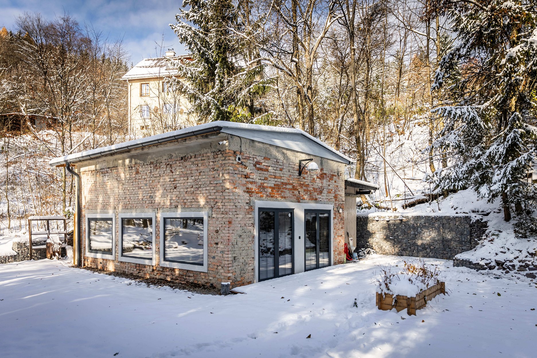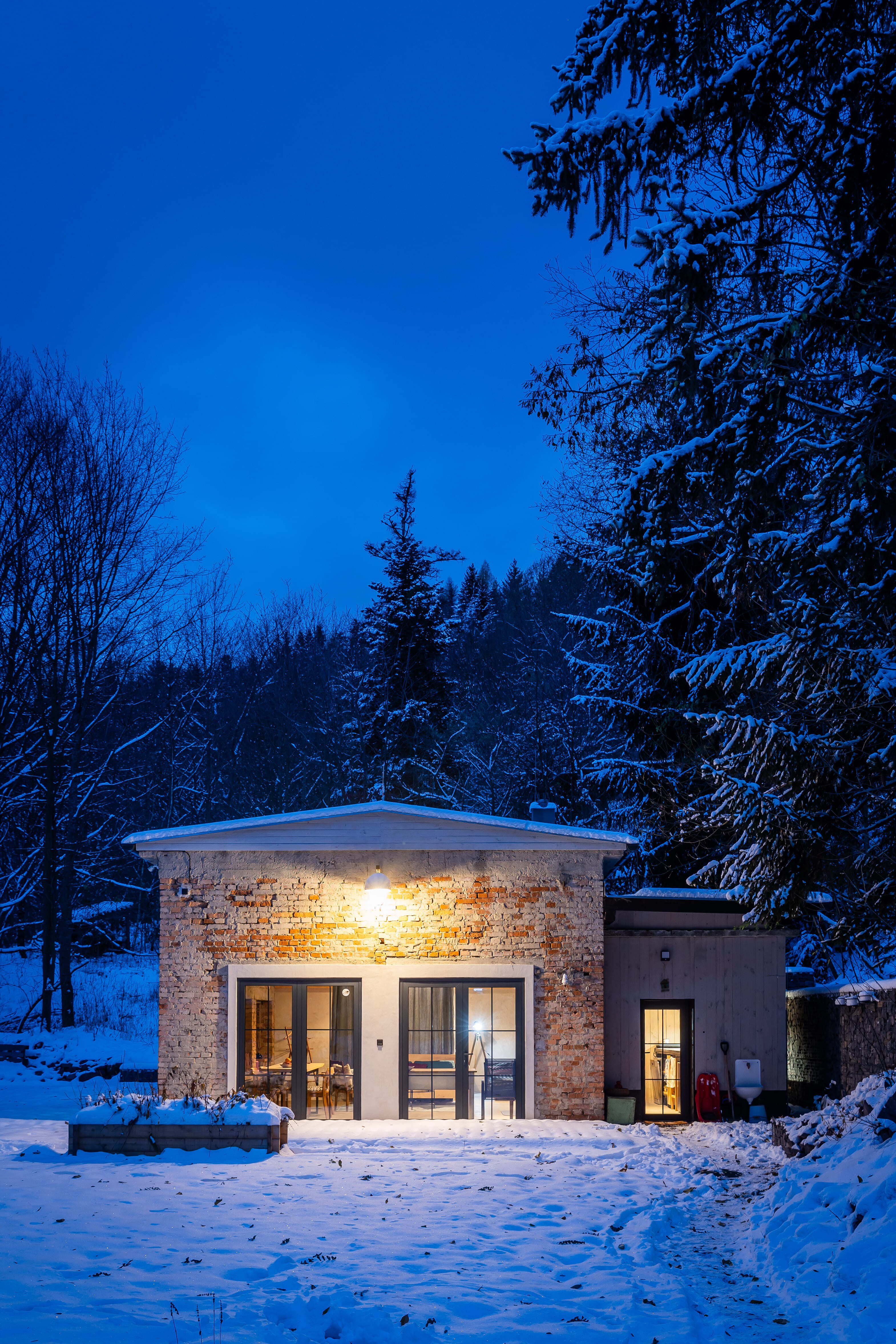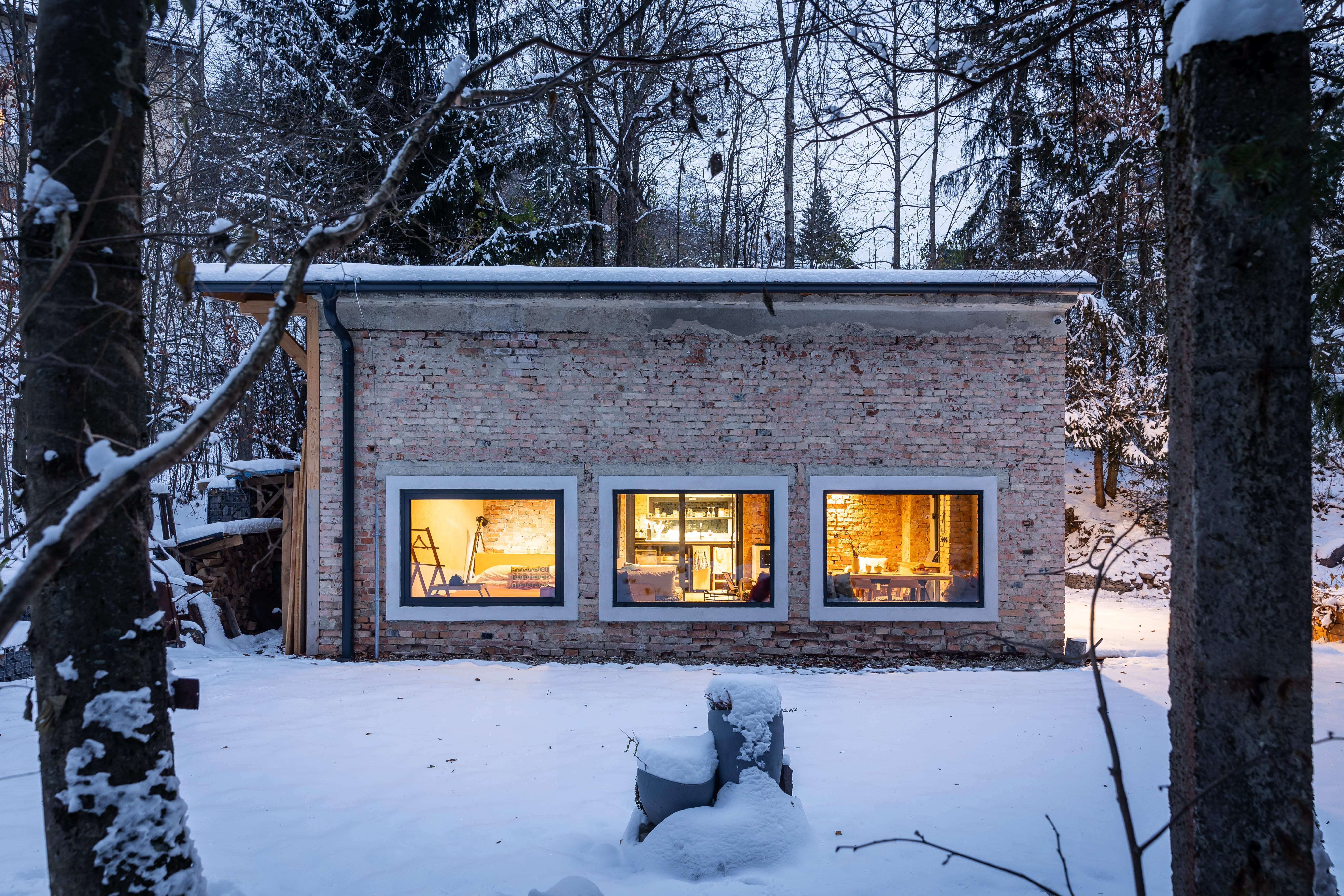 Prvé potrebné kroky viedli k záchrane objektu a predĺženiu jeho životnosti. Terén odsadili od stavby, spevnili gabiónmi, vytvorili drenáž a zaizolovali podlahu i strop. Degradovaná strecha si však vyžiadala nový, nízky krov, aby nemenili architektonický výraz budovy. Aby podporili industriálny ráz architektúry aj samotného interiéru, z oboch strán ponechali priznané tehlové murivo, len ho vyčistili a povrchovo ošetrili. Stavebné otvory pre okná a brány ponechali na svojom mieste. Doplnili kvalitné okná s izolačným trojsklom a aby nebolo zo strany exteriéru vidno zaizolované spoje s murivom, okolo okien boli vytvorené šambrány. Veľké okná s nižšími parapetmi sa stali ideálnym miestom na sedenie s výhľadom do prírody, kde neraz vidno pasúce sa srnky.